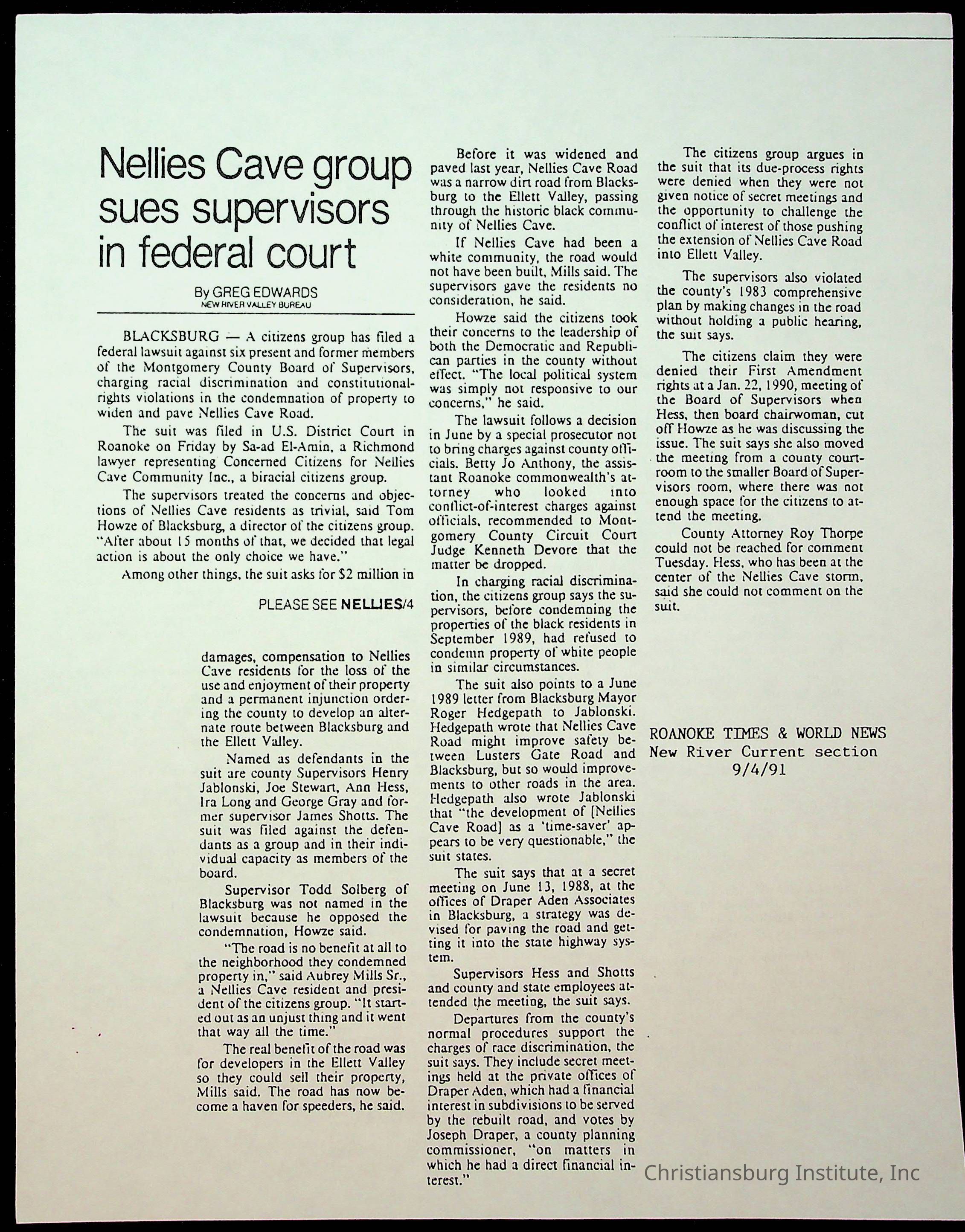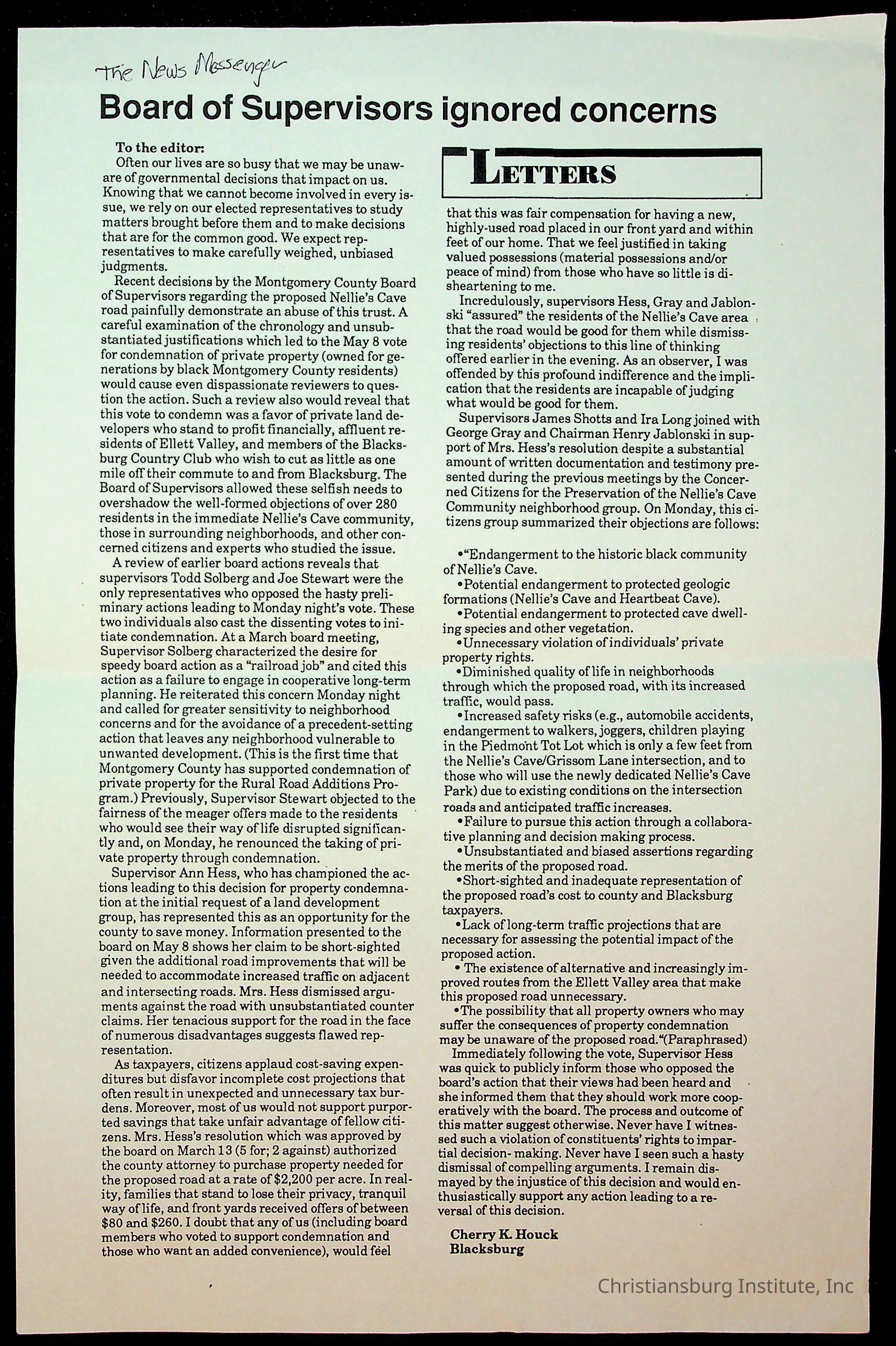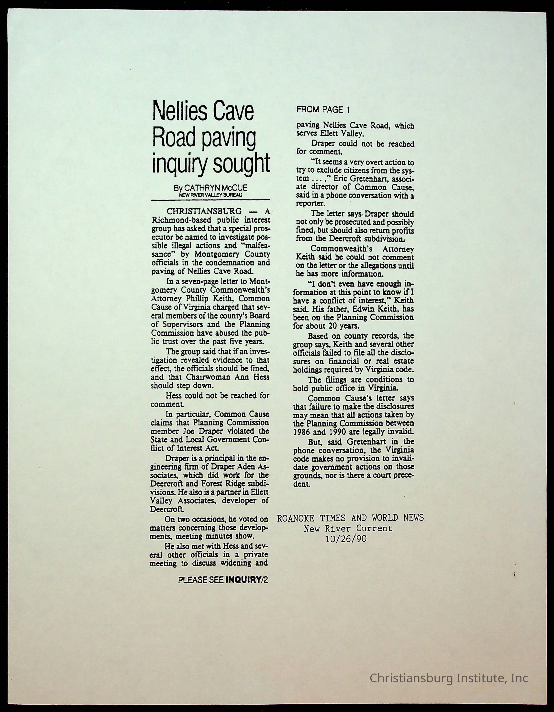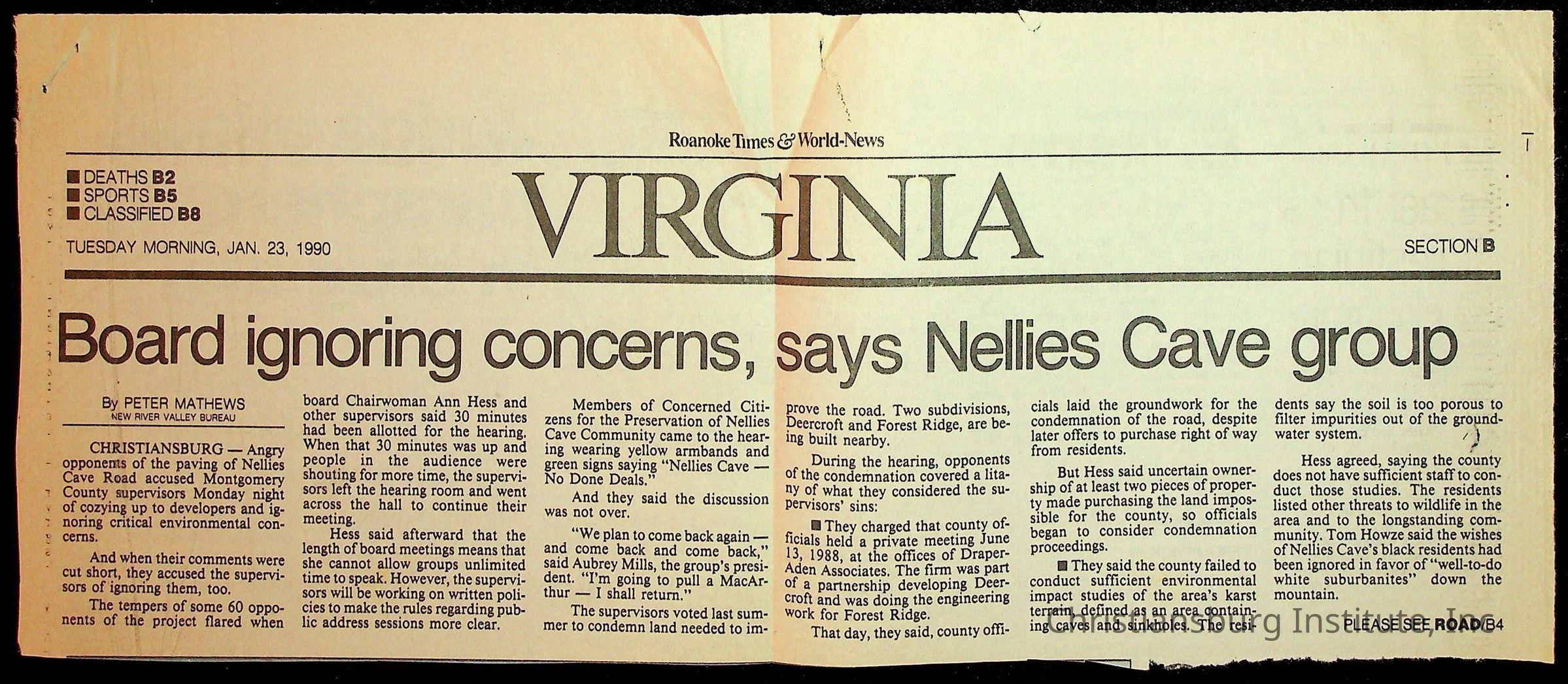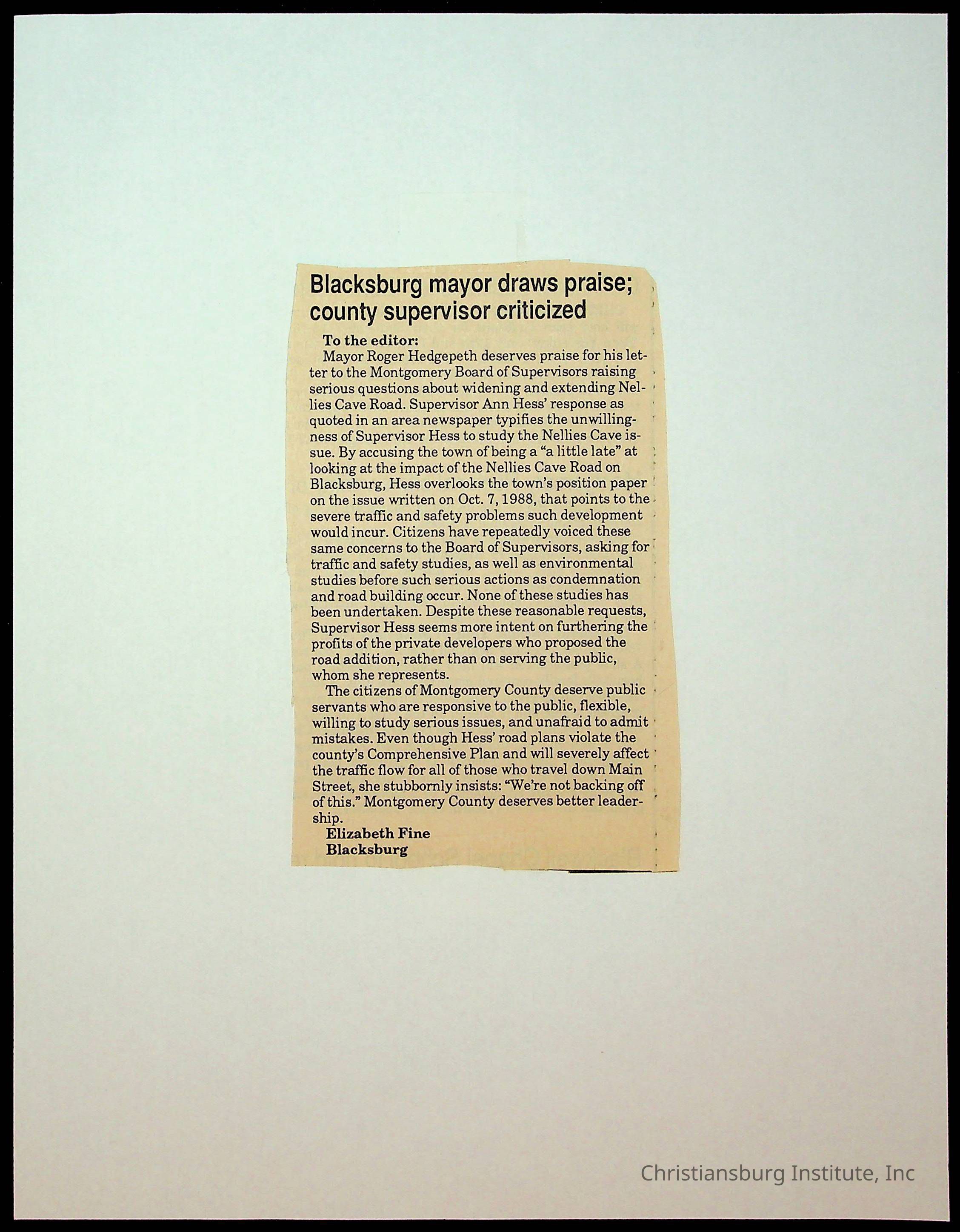 Fine, Elizabeth C., Concerned Citizens For Nellies Cave Community, Montgomery County, The Roanoke Times, The News Messenger, NRV Current