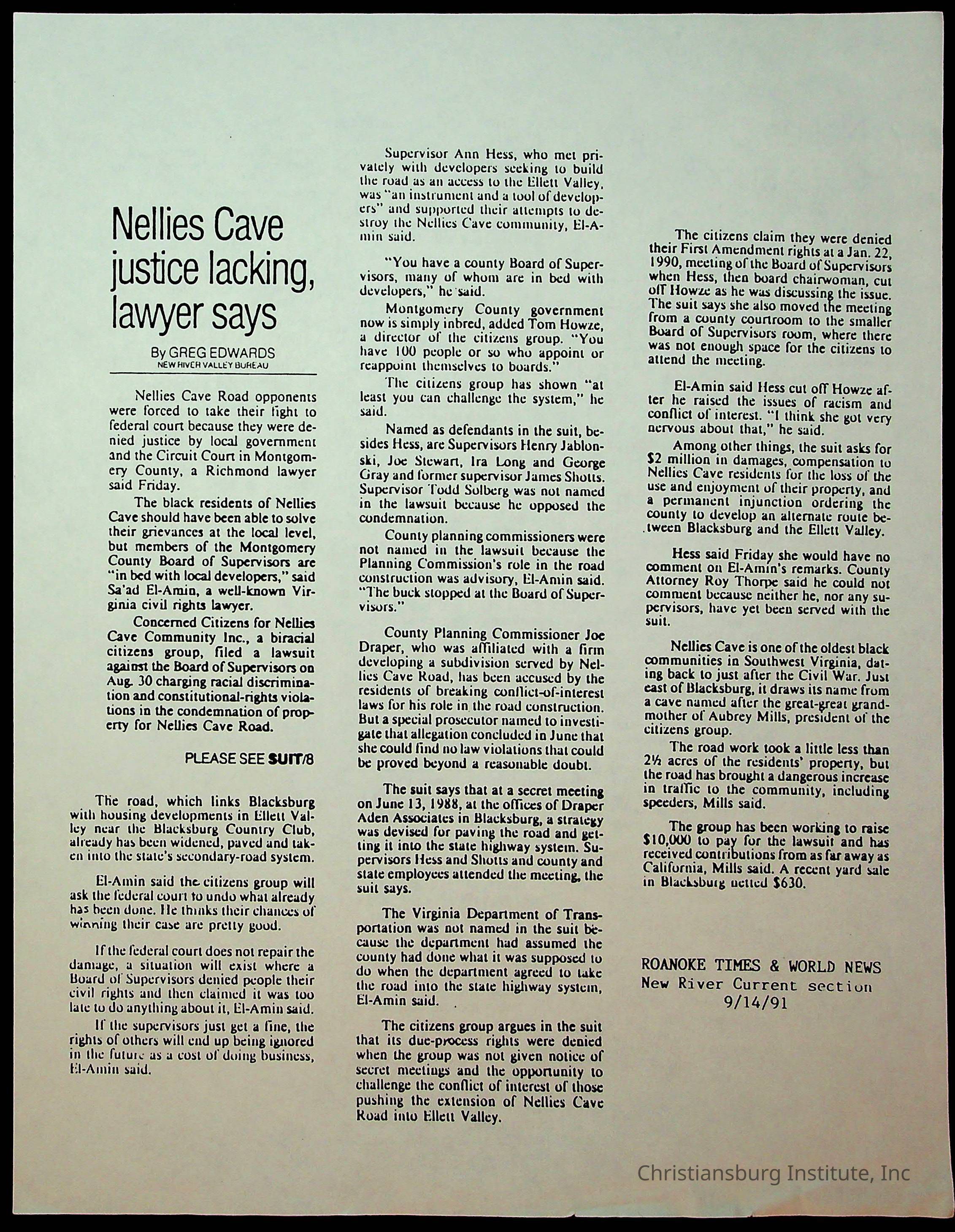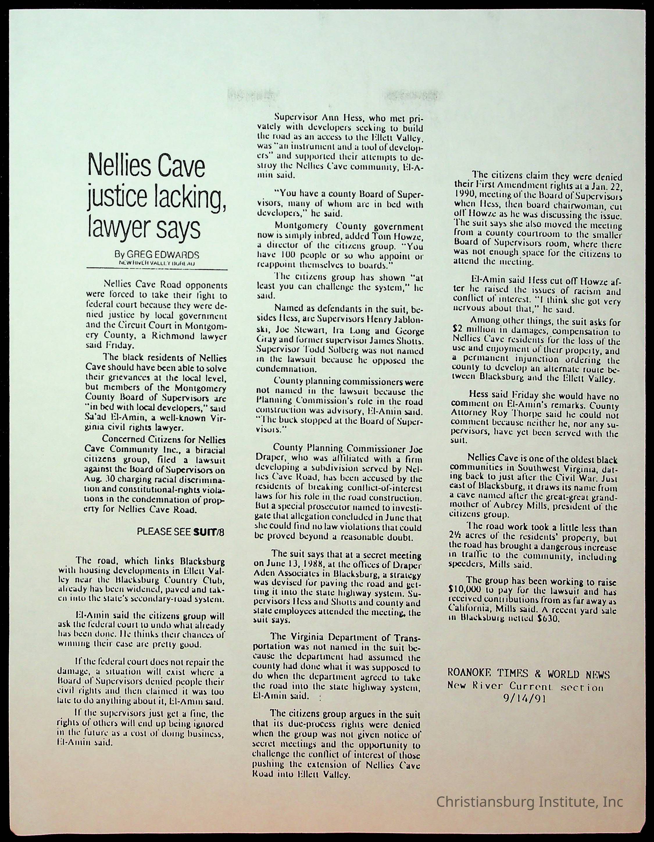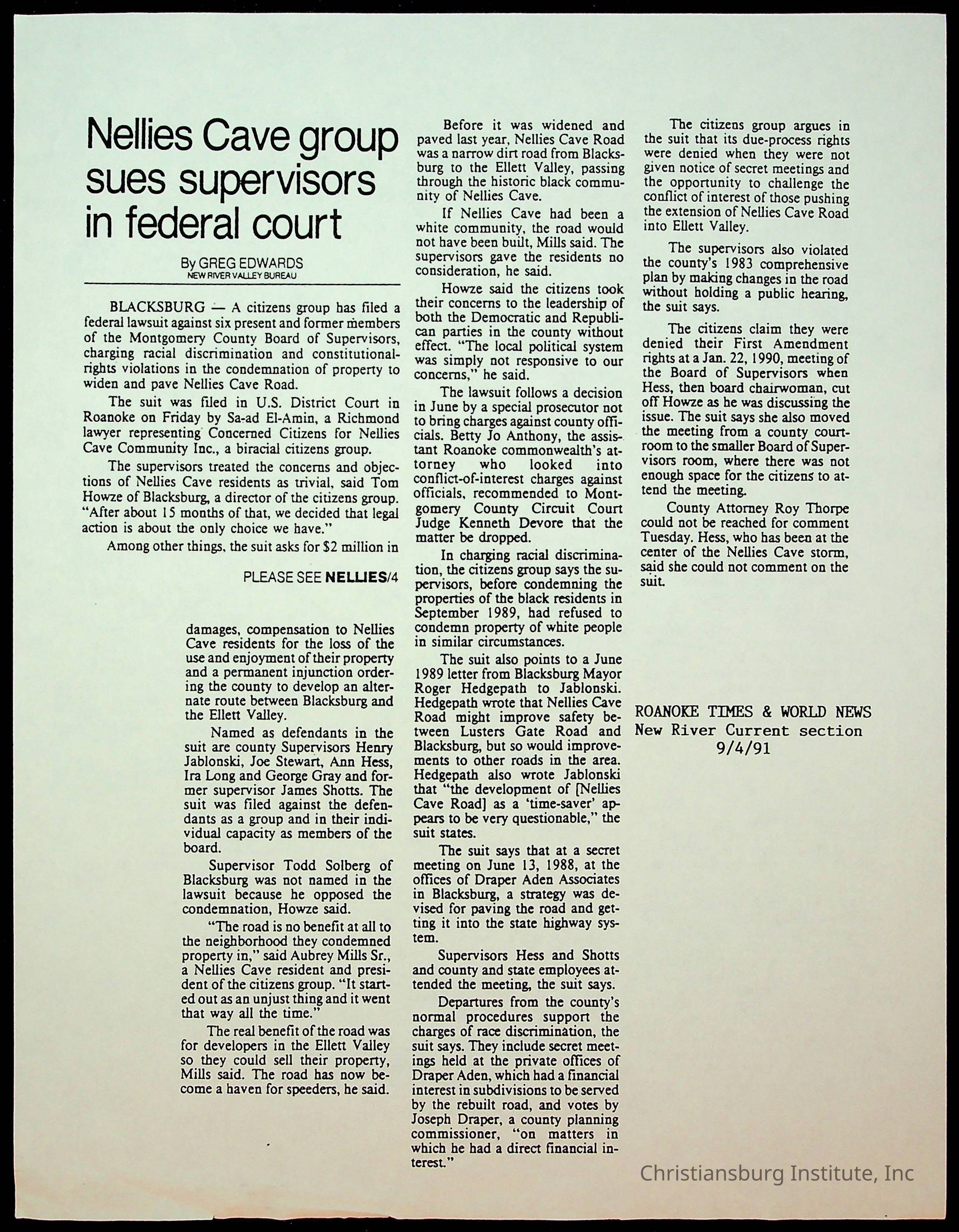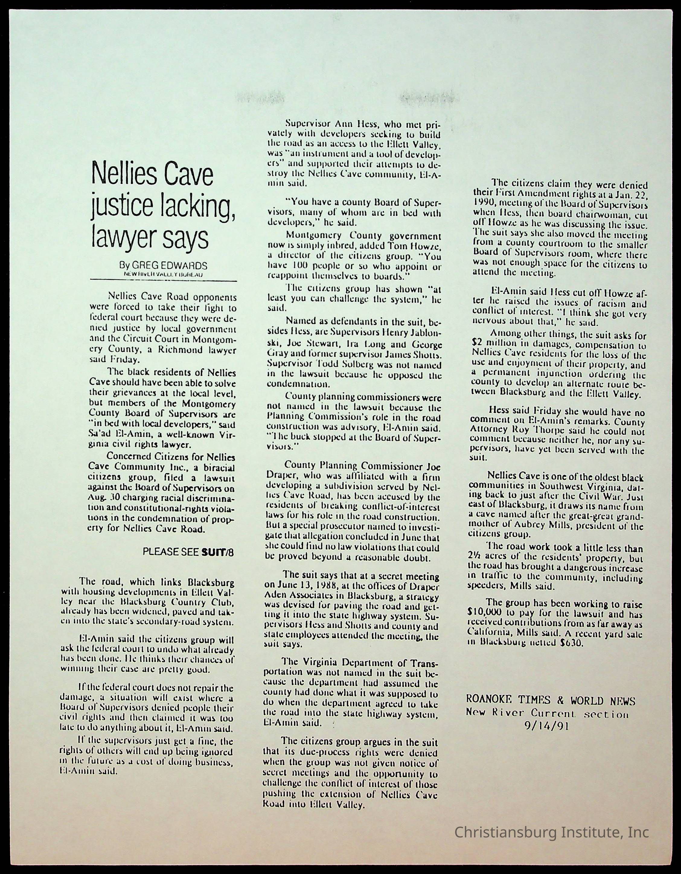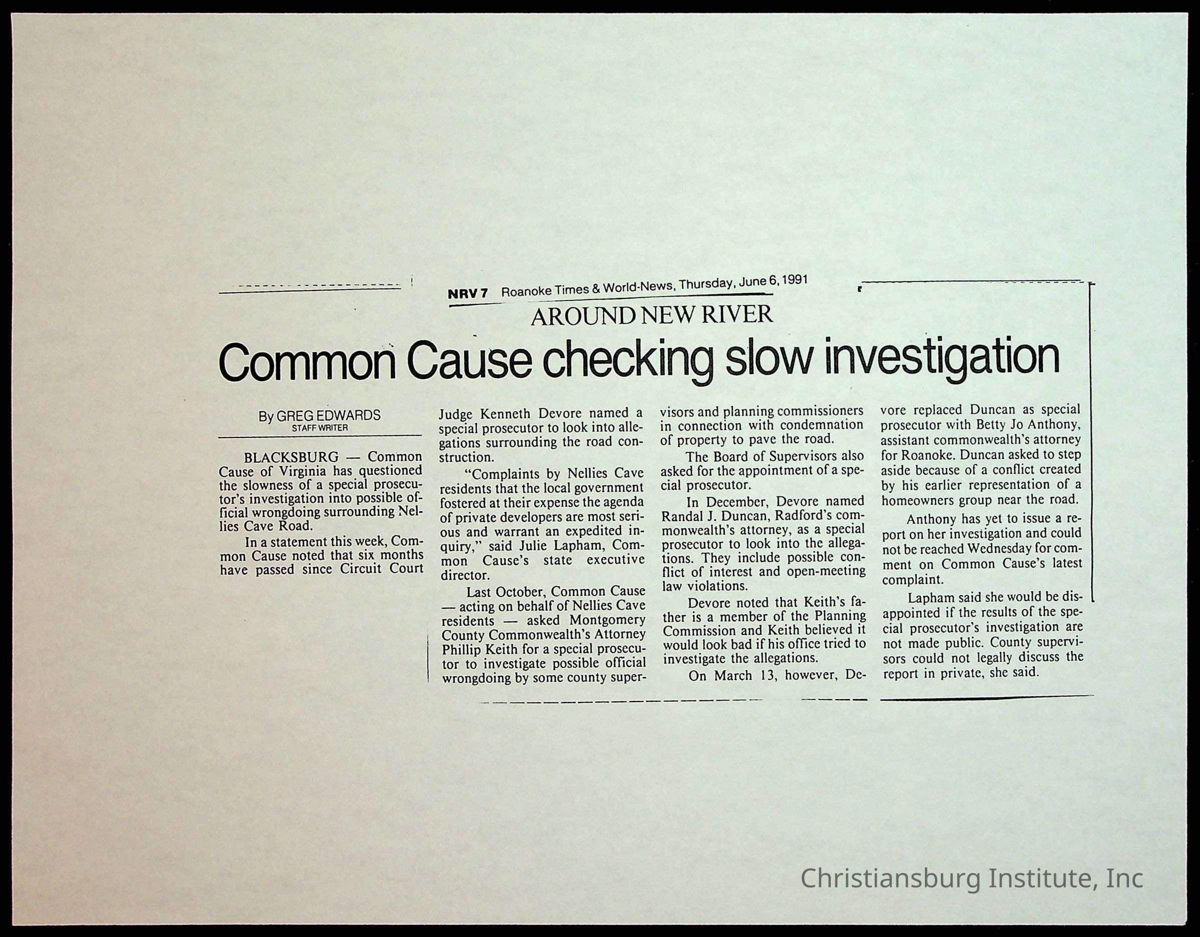 Fine, Elizabeth C., Concerned Citizens For Nellies Cave Community, Montgomery County, The Roanoke Times, The News Messenger, NRV Current