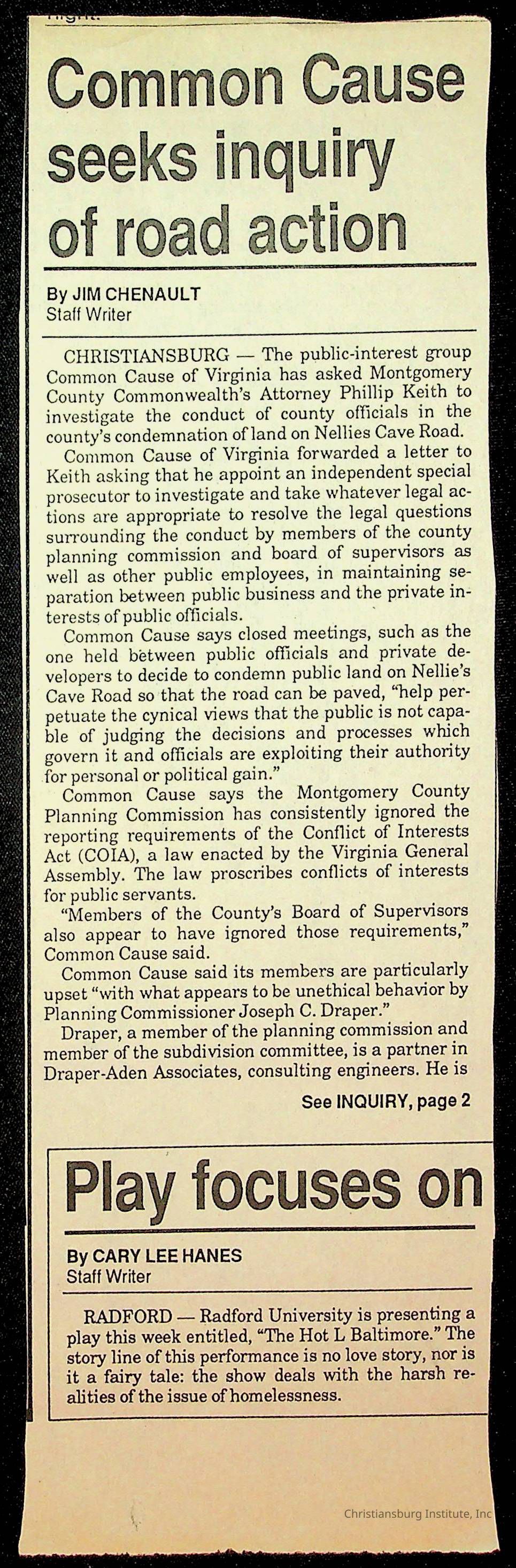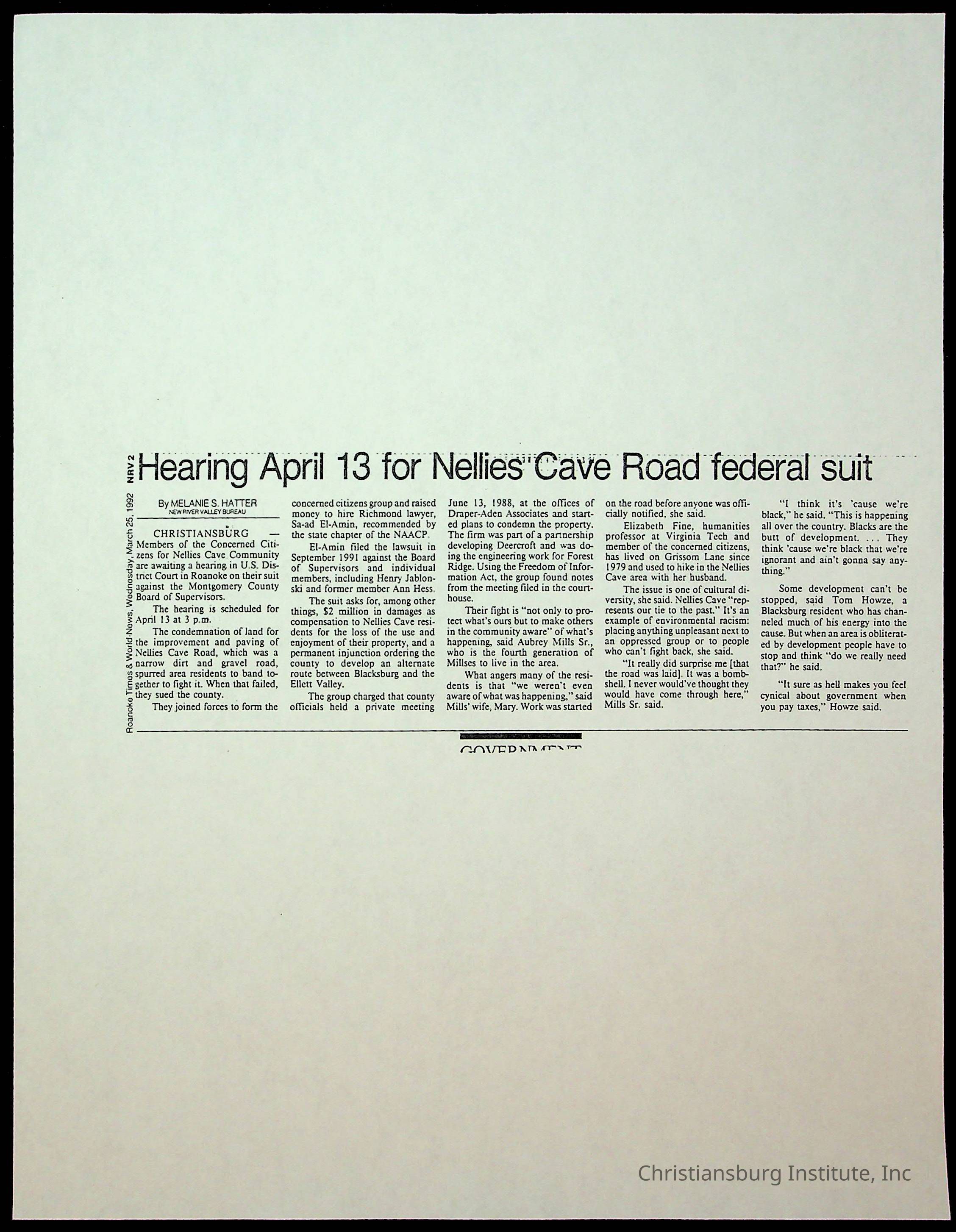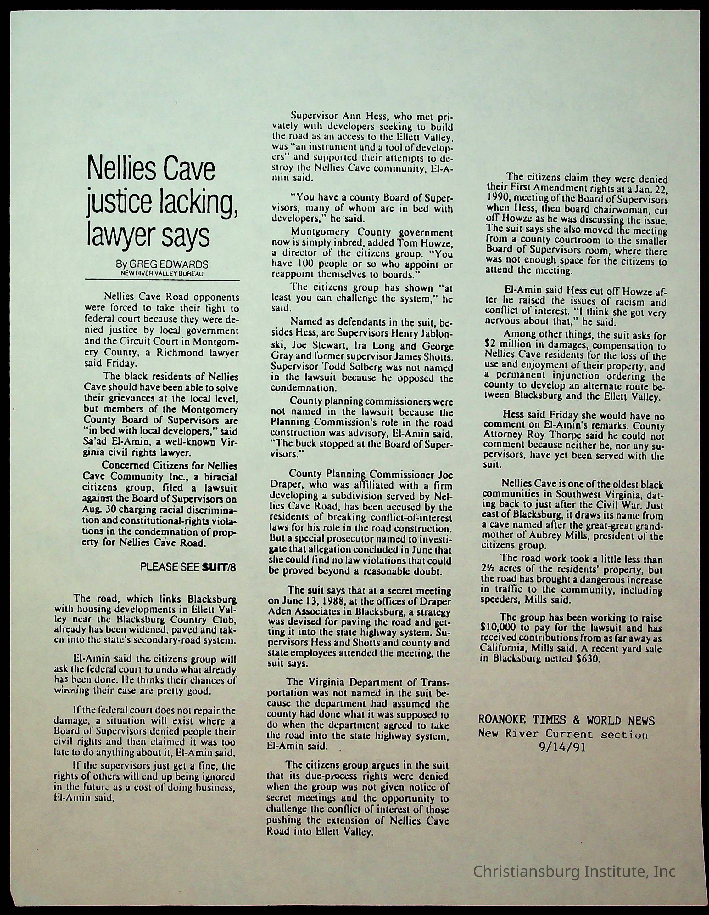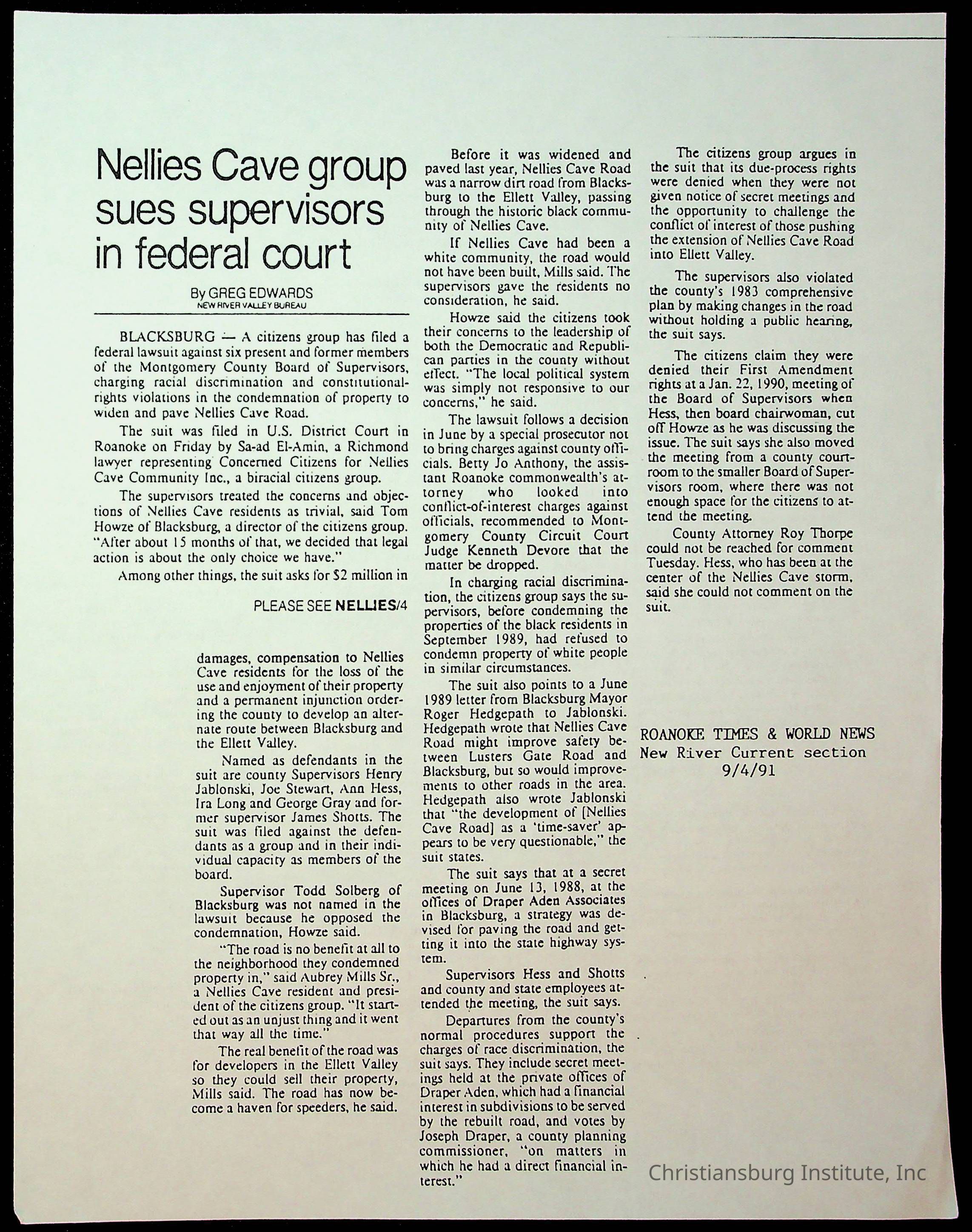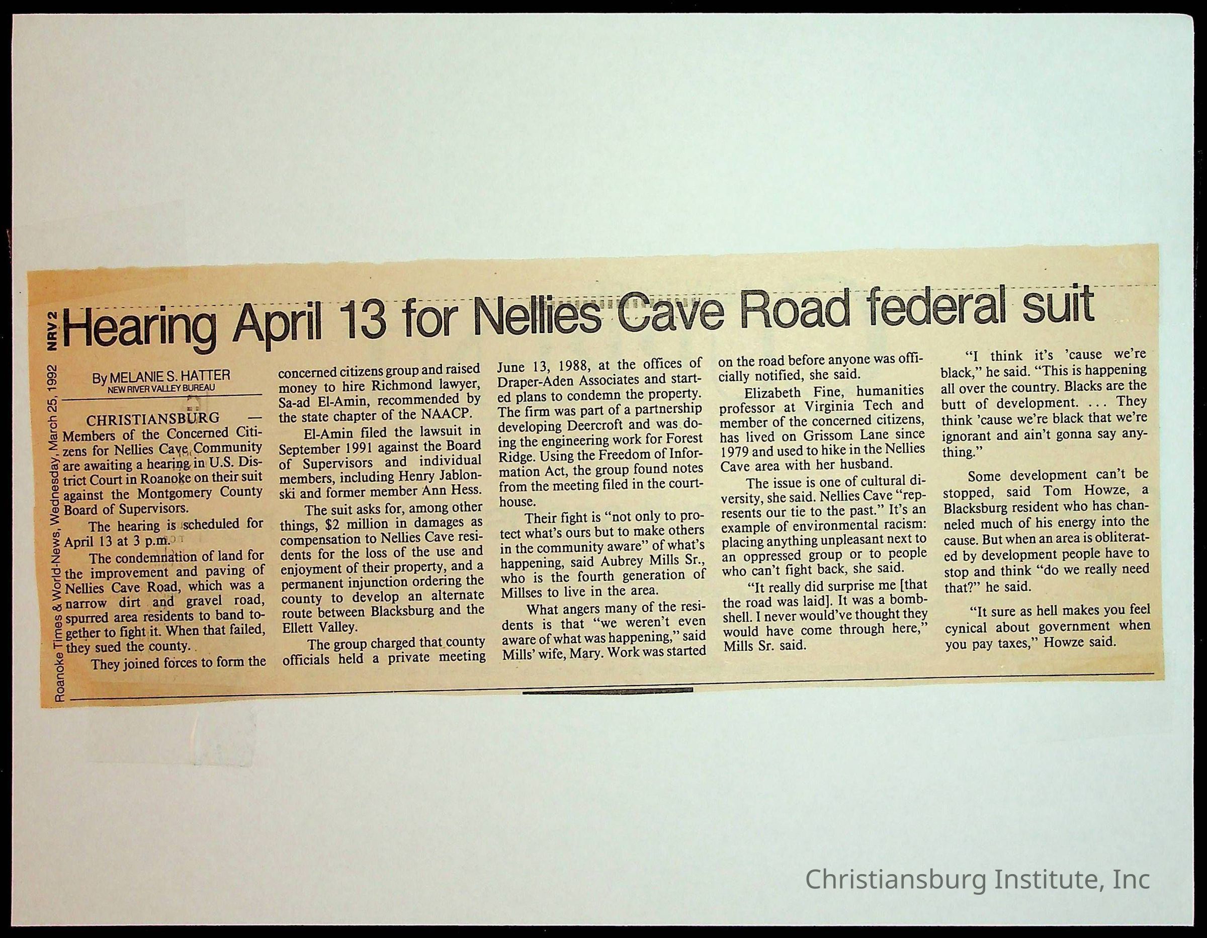 Fine, Elizabeth C., Concerned Citizens For Nellies Cave Community, Montgomery County, The Roanoke Times, The News Messenger, NRV Current