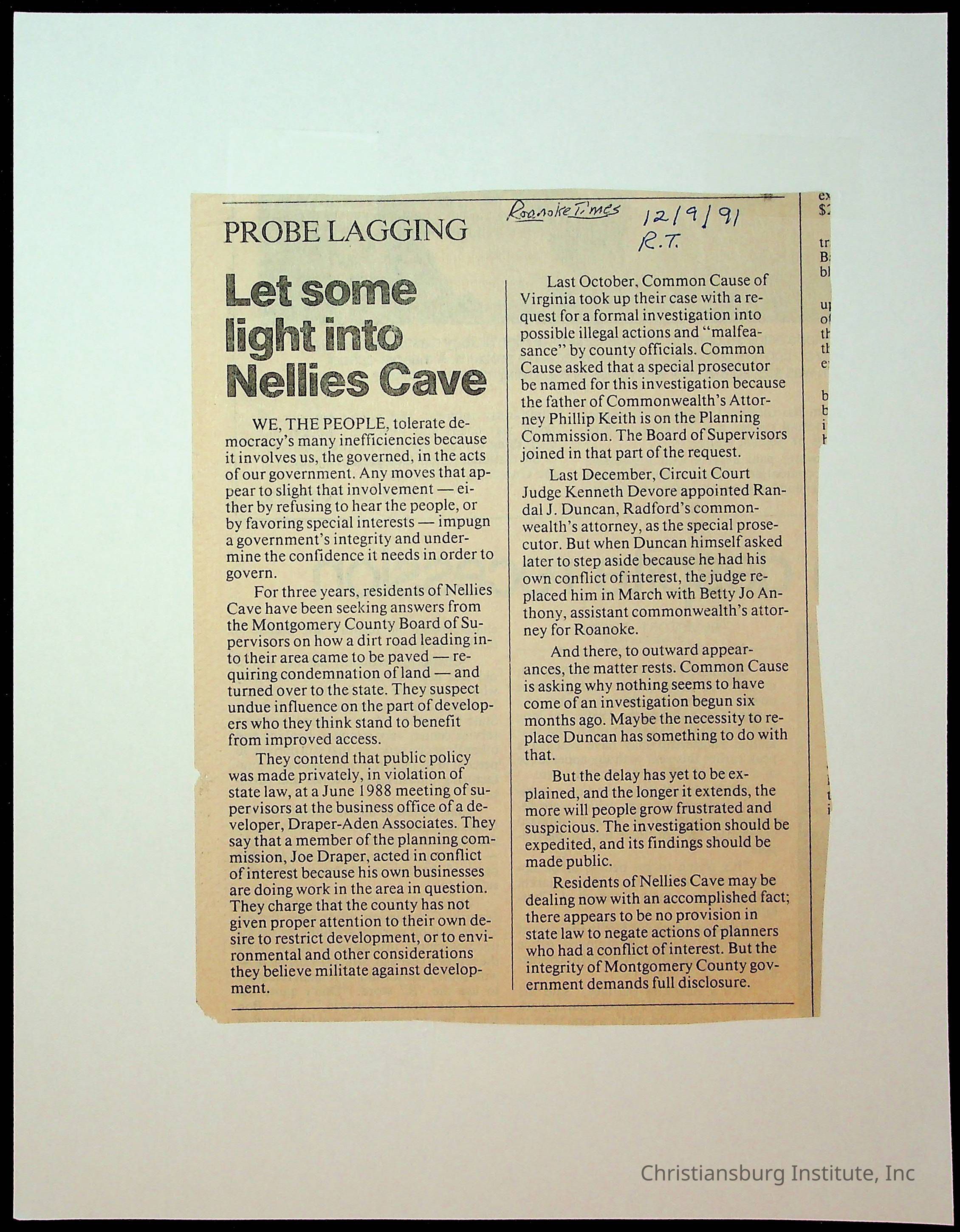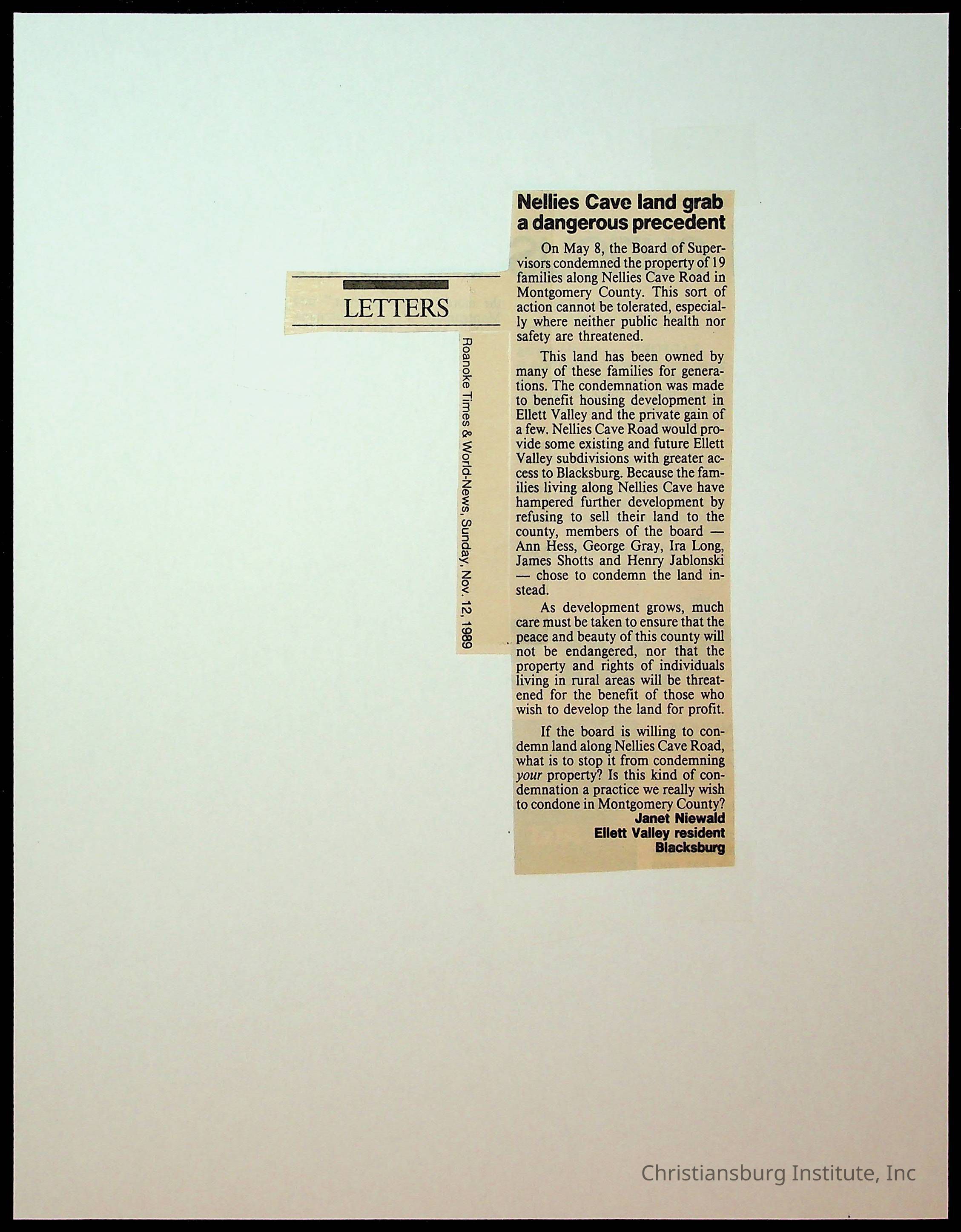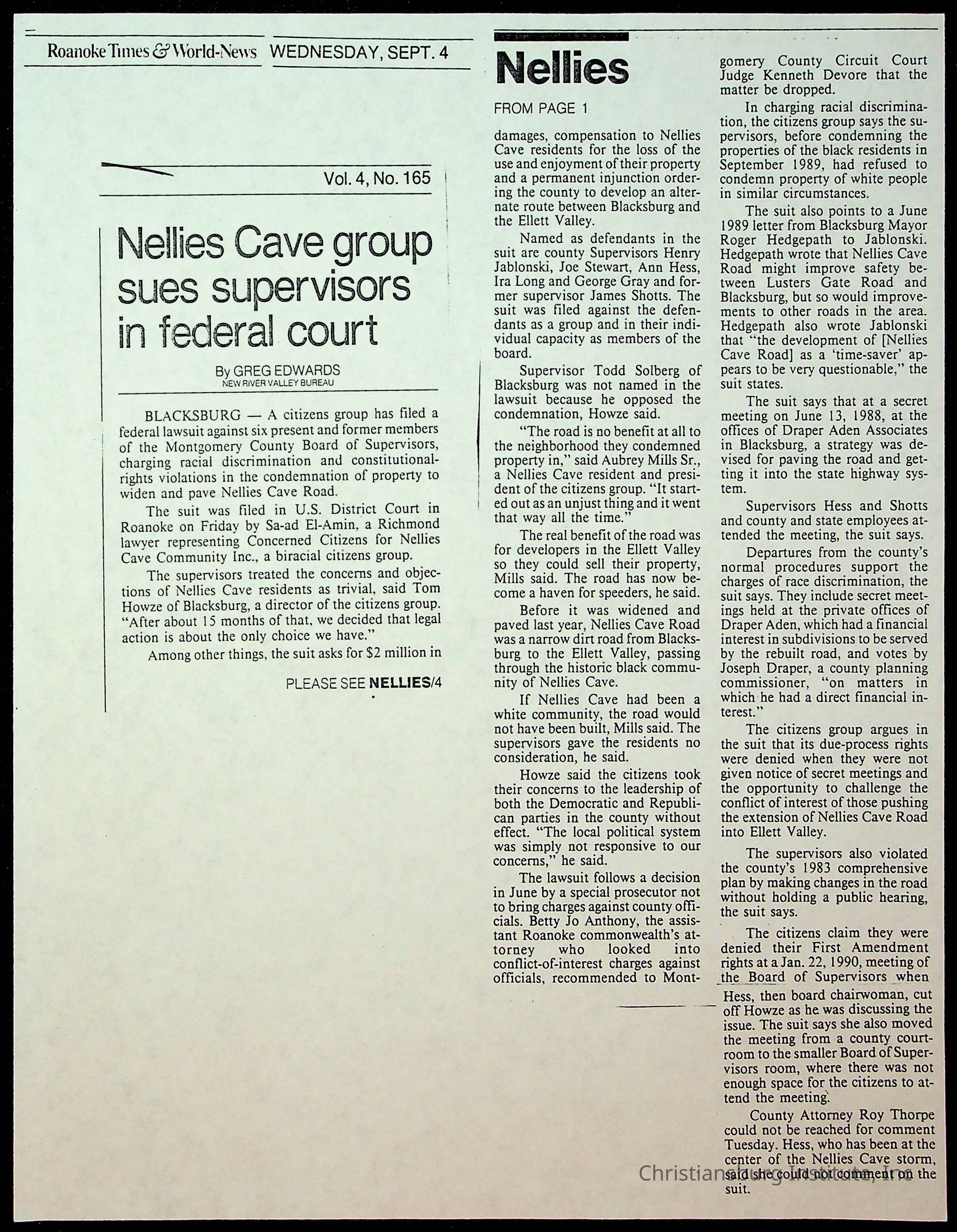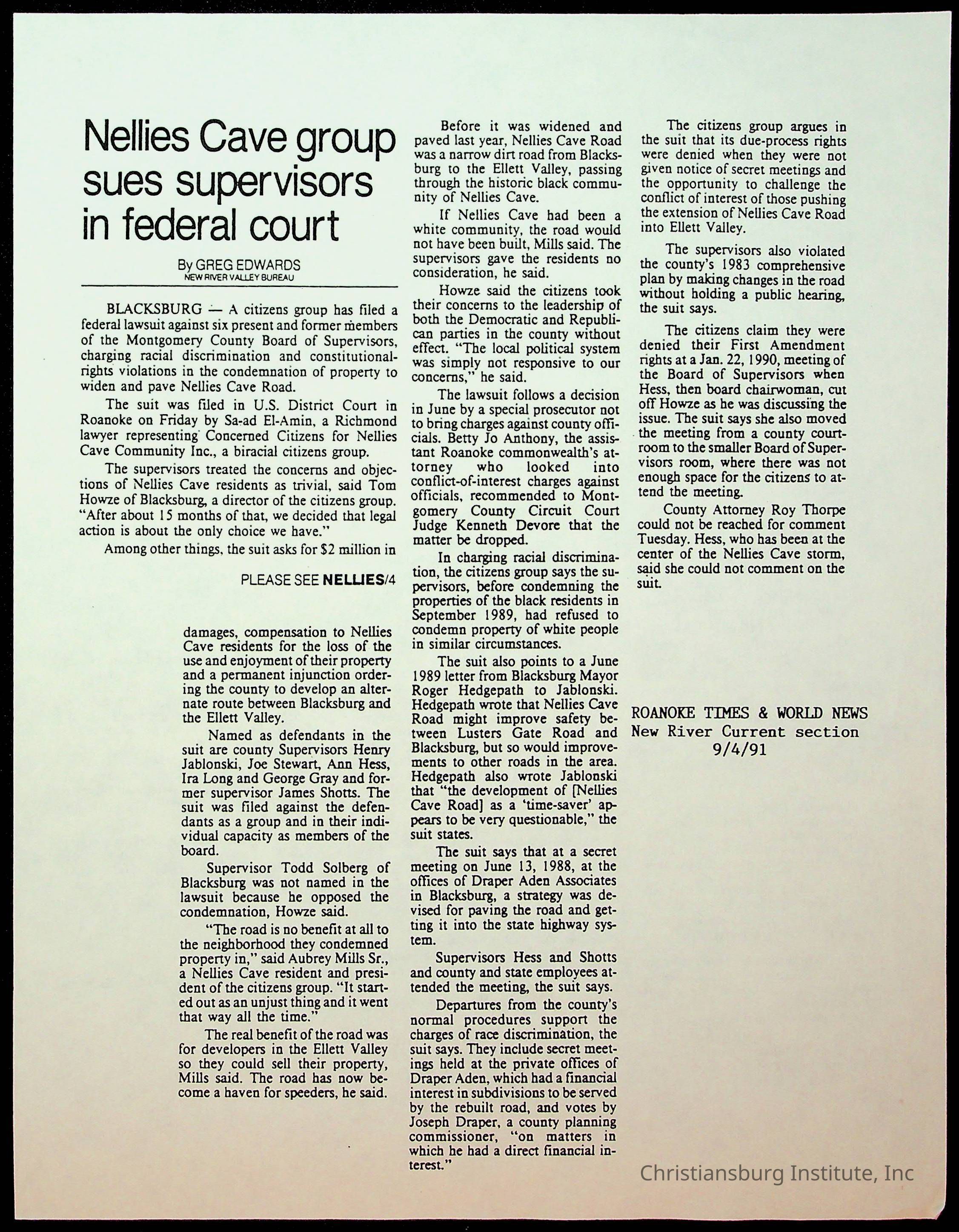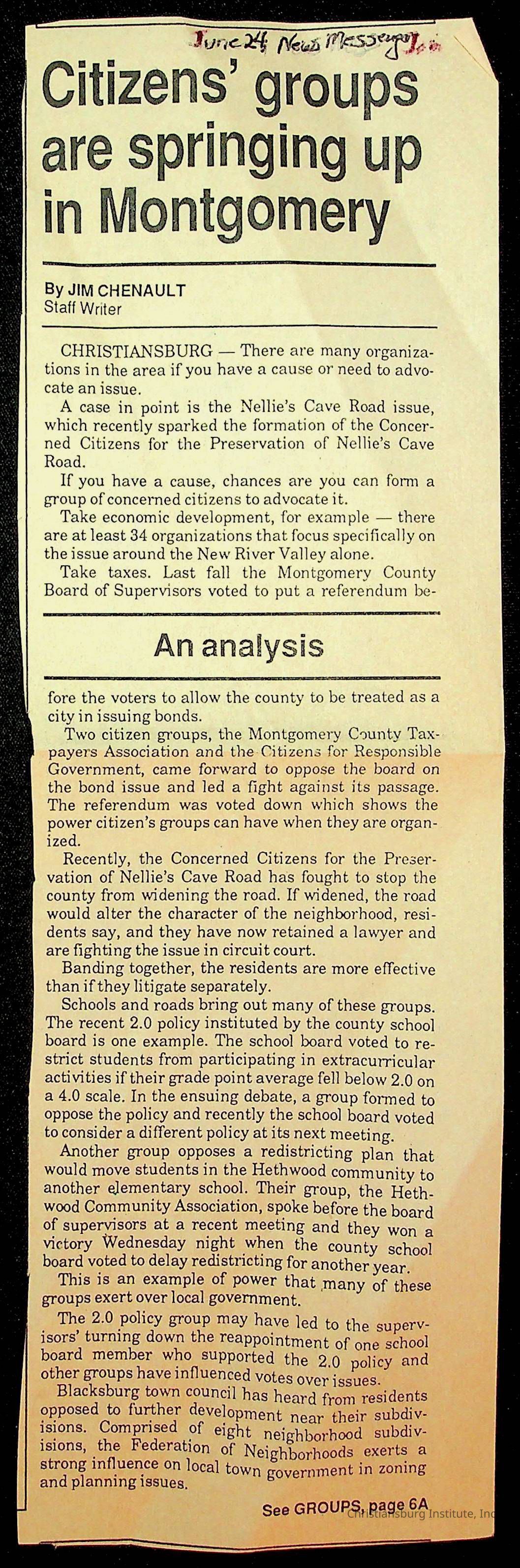 Fine, Elizabeth C., Concerned Citizens For Nellies Cave Community, Montgomery County, The Roanoke Times, The News Messenger, NRV Current
