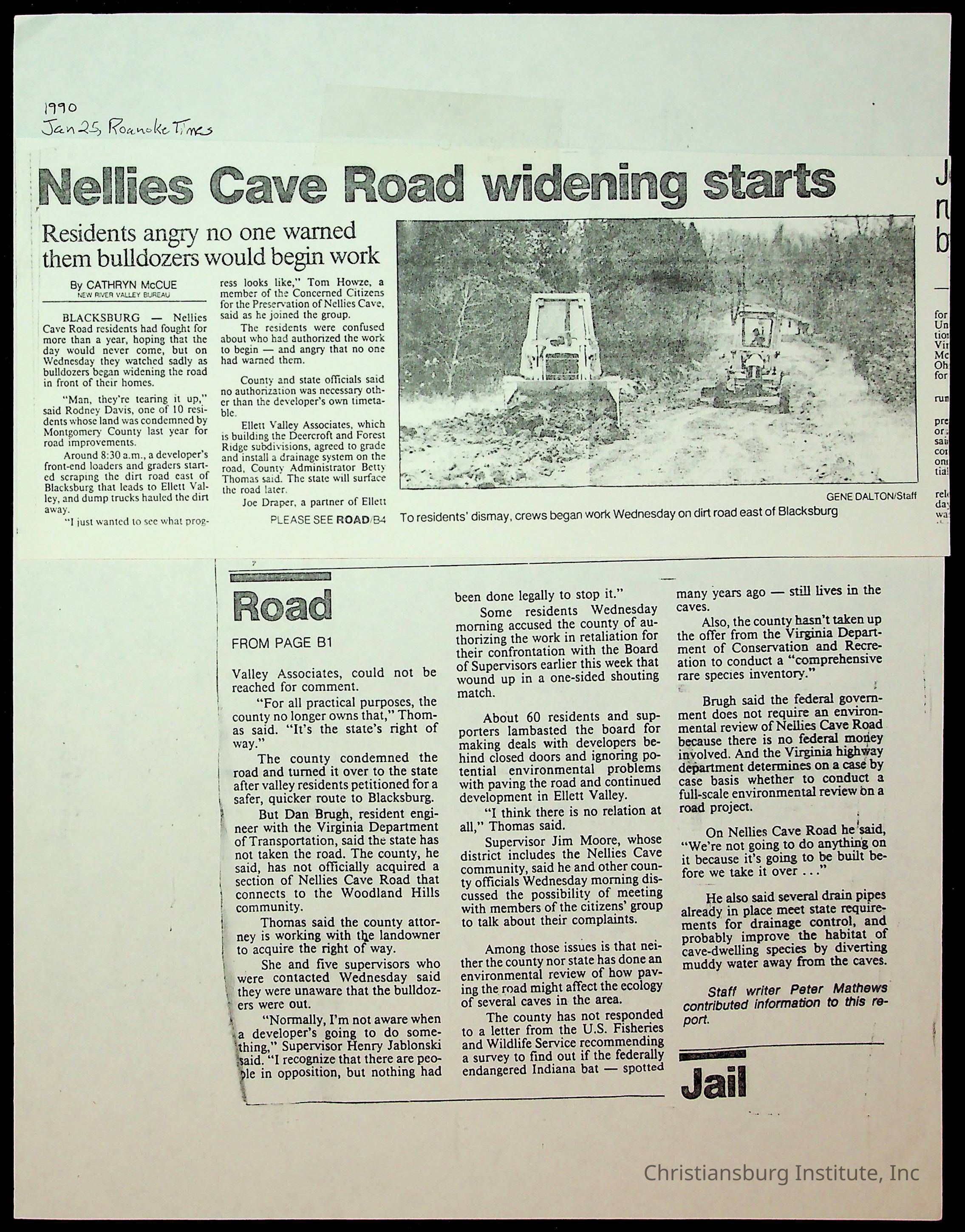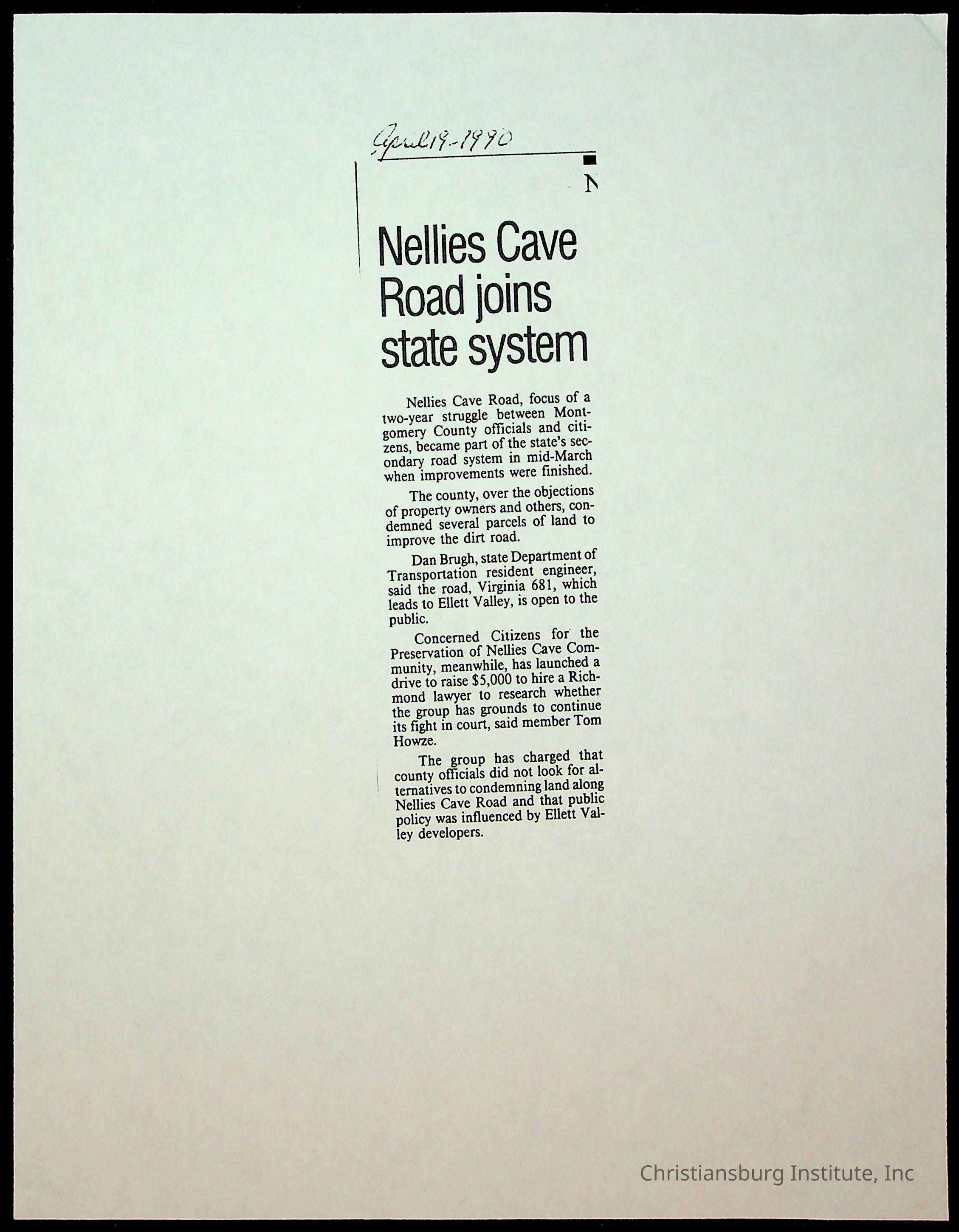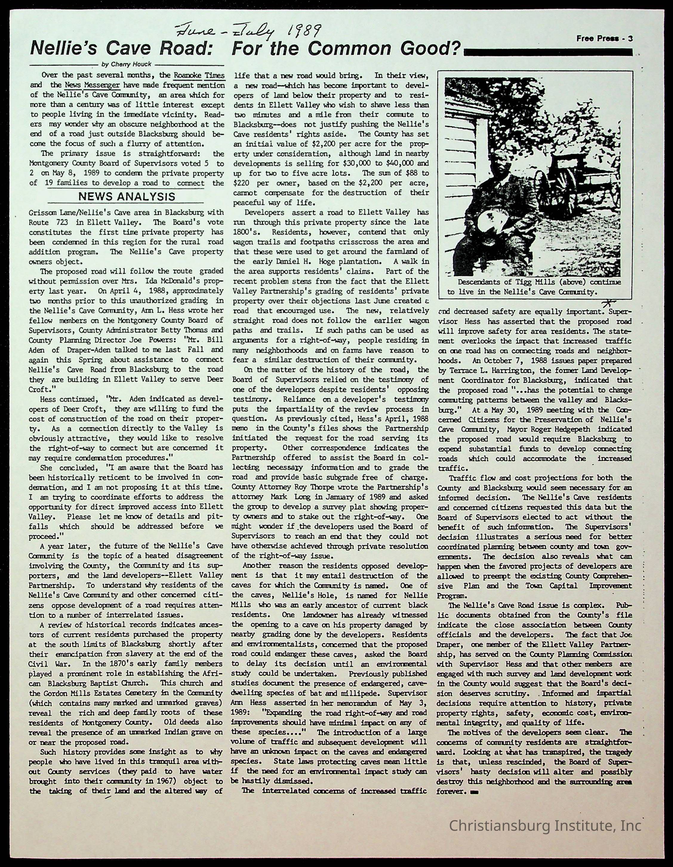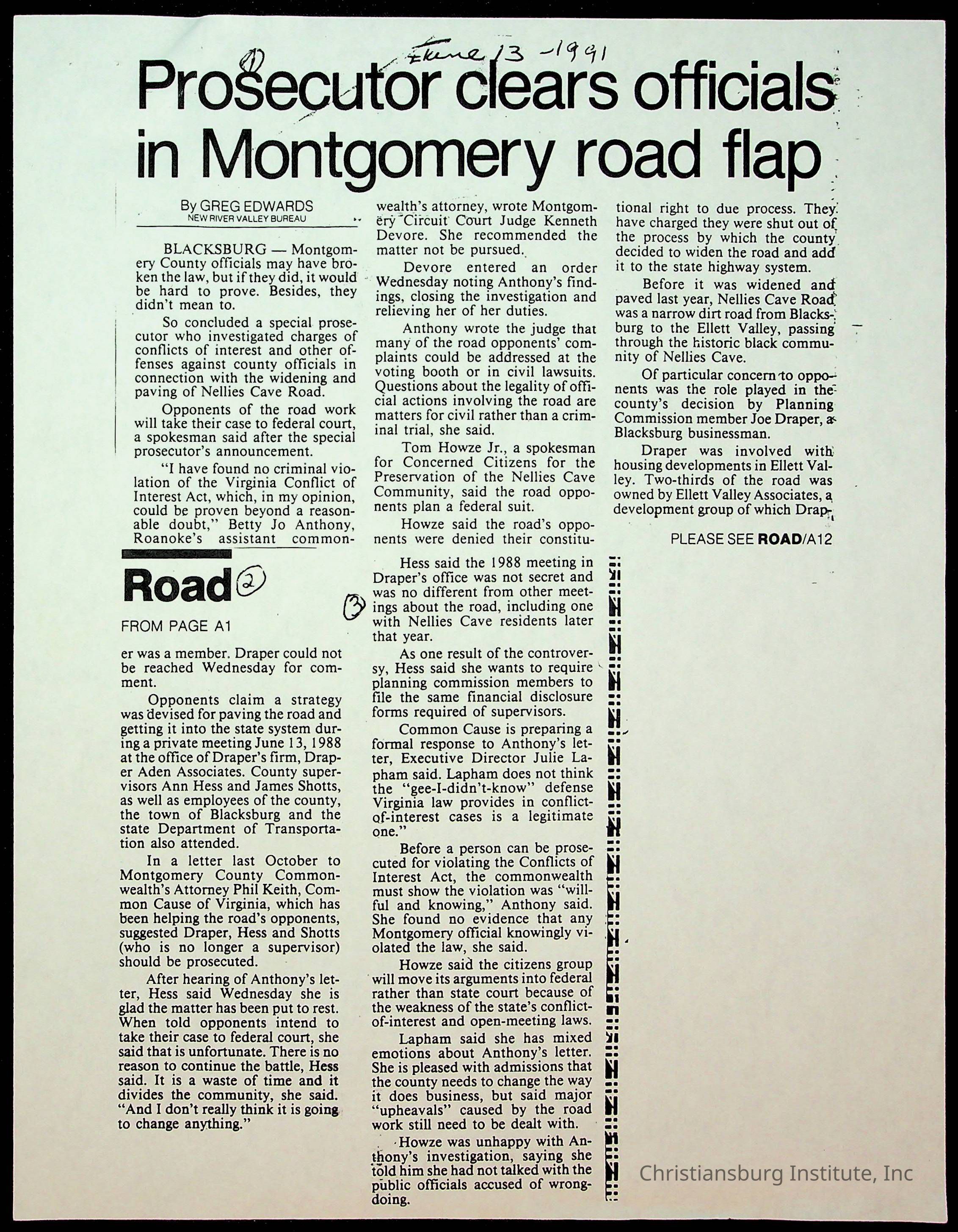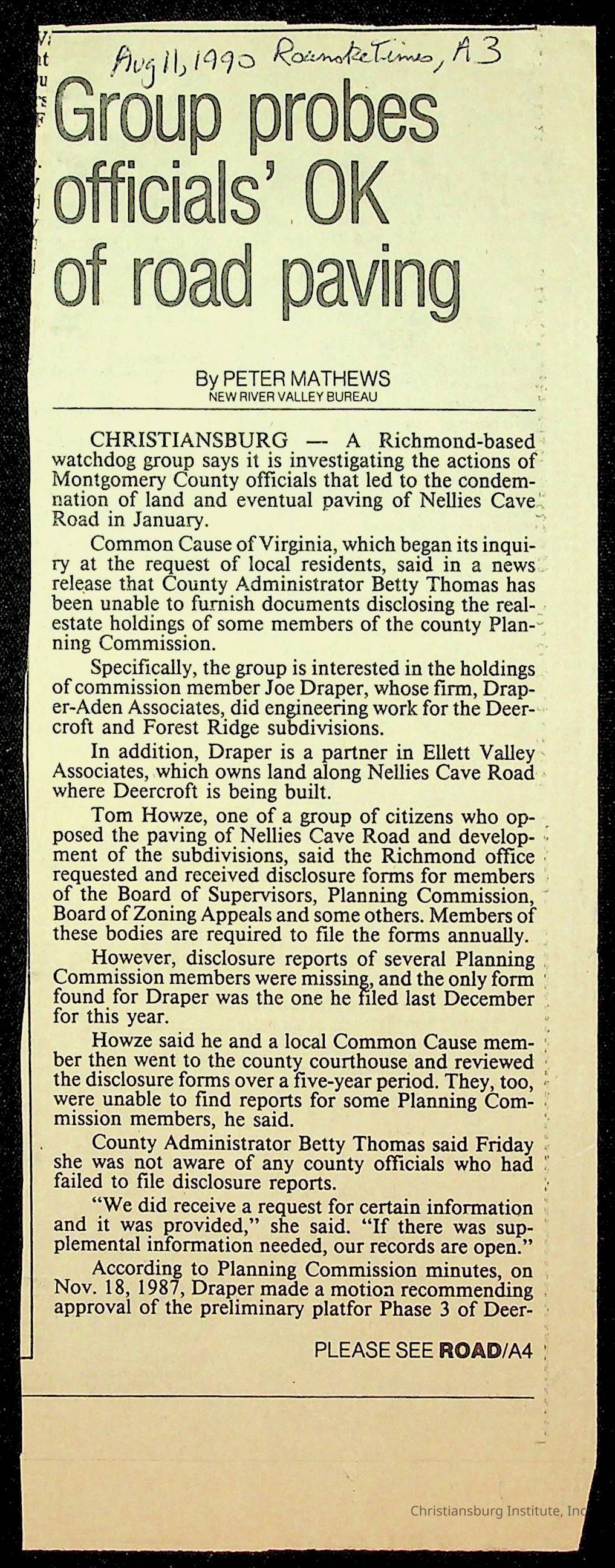 Fine, Elizabeth C., Concerned Citizens For Nellies Cave Community, Montgomery County, The Roanoke Times, The News Messenger, NRV Current