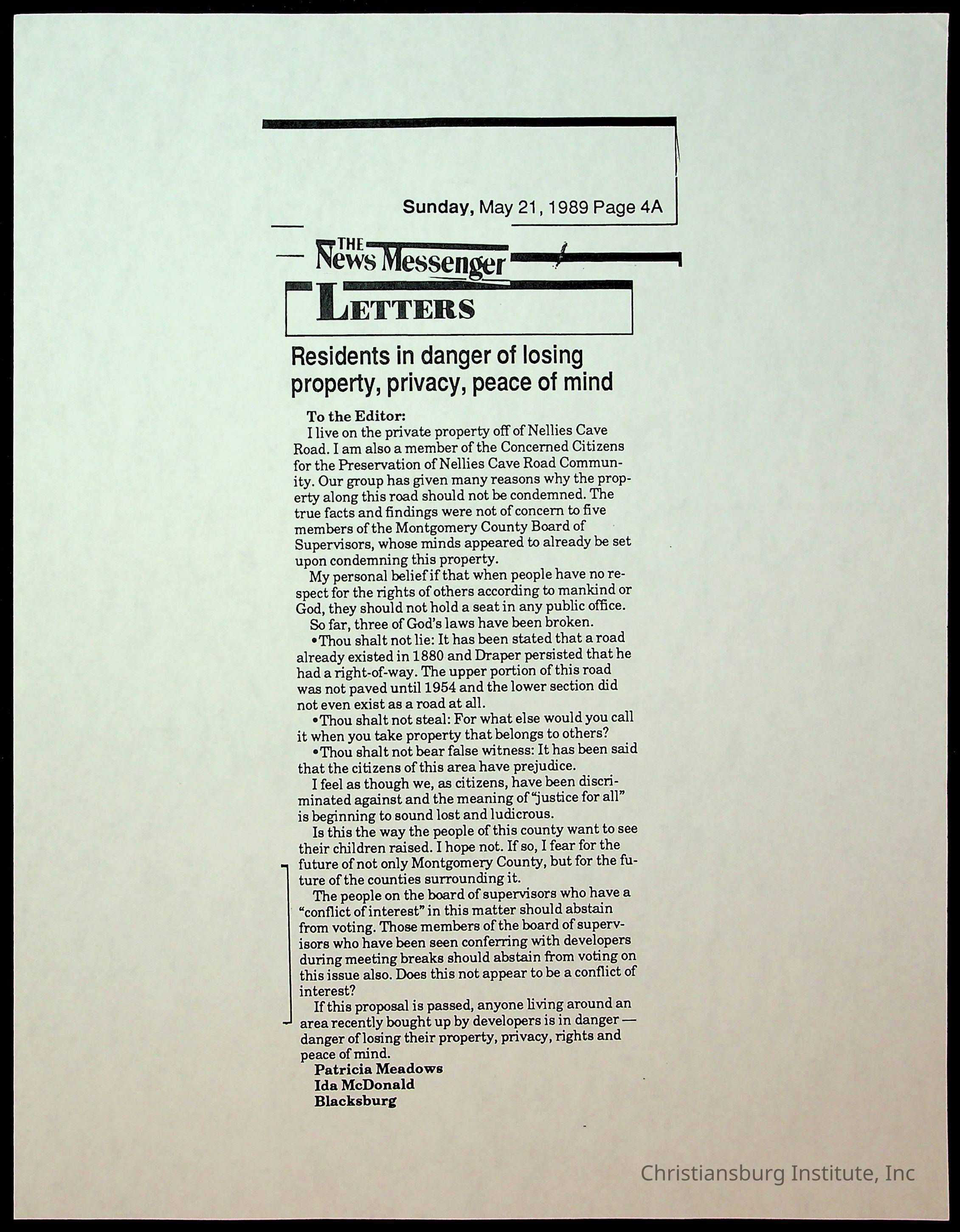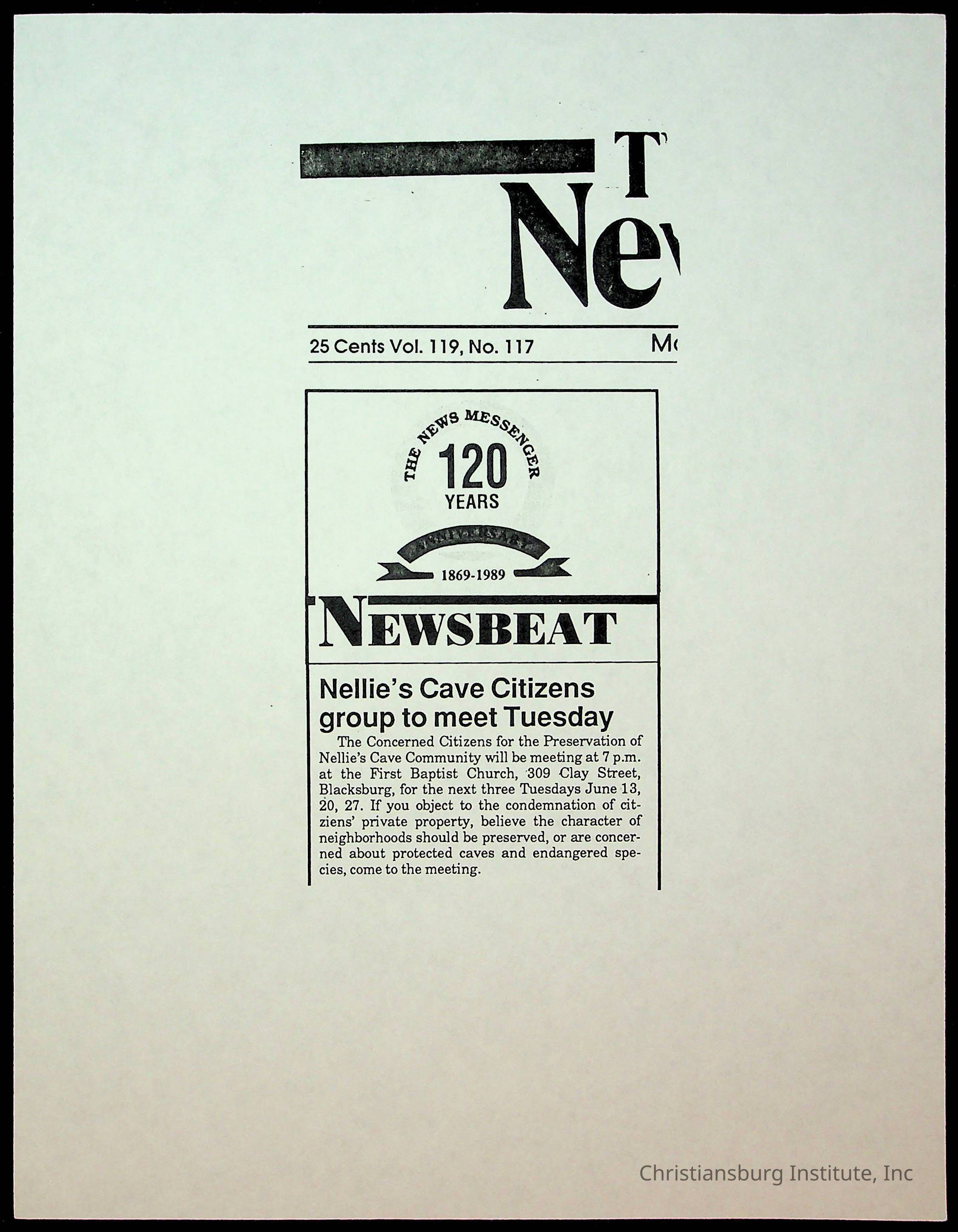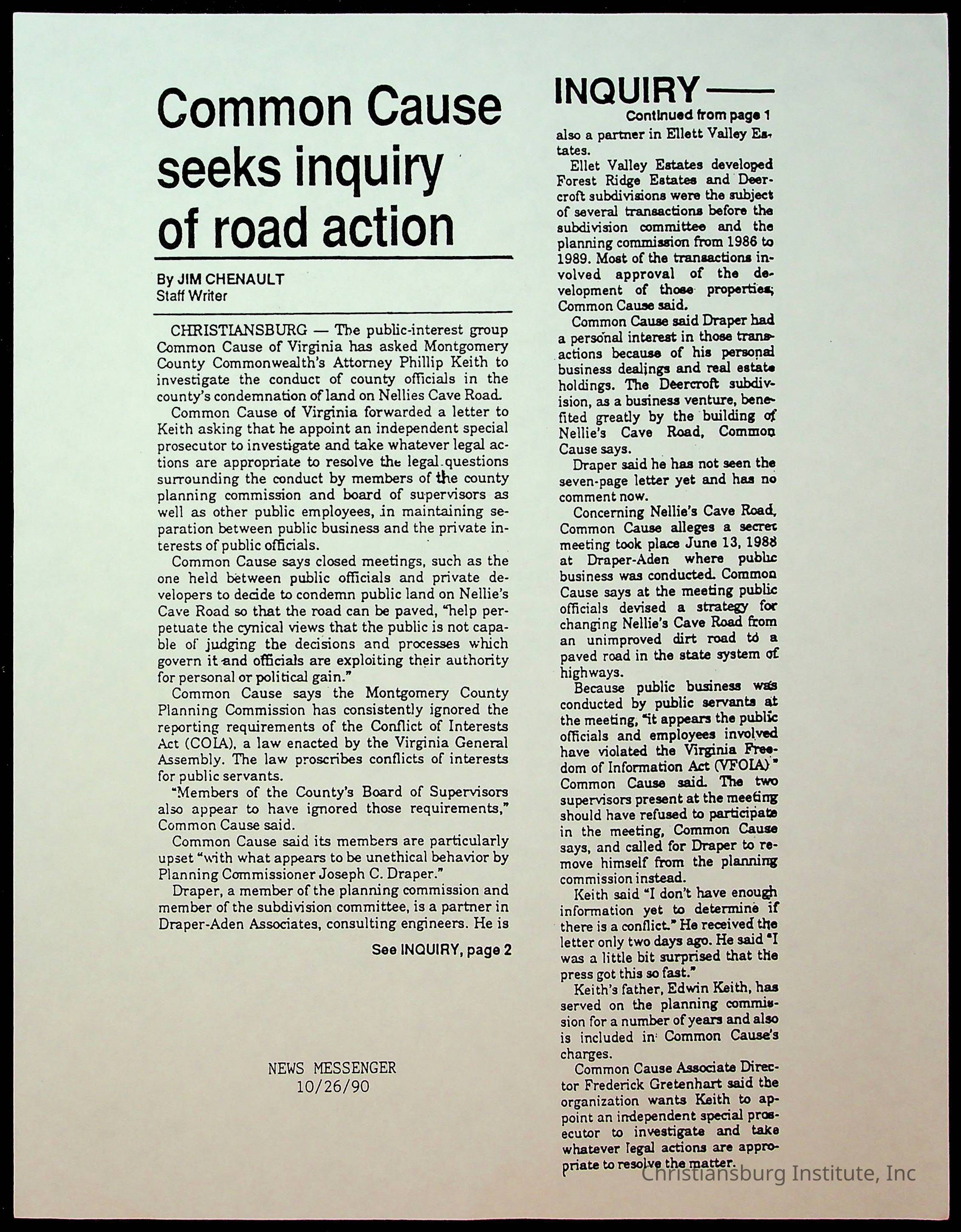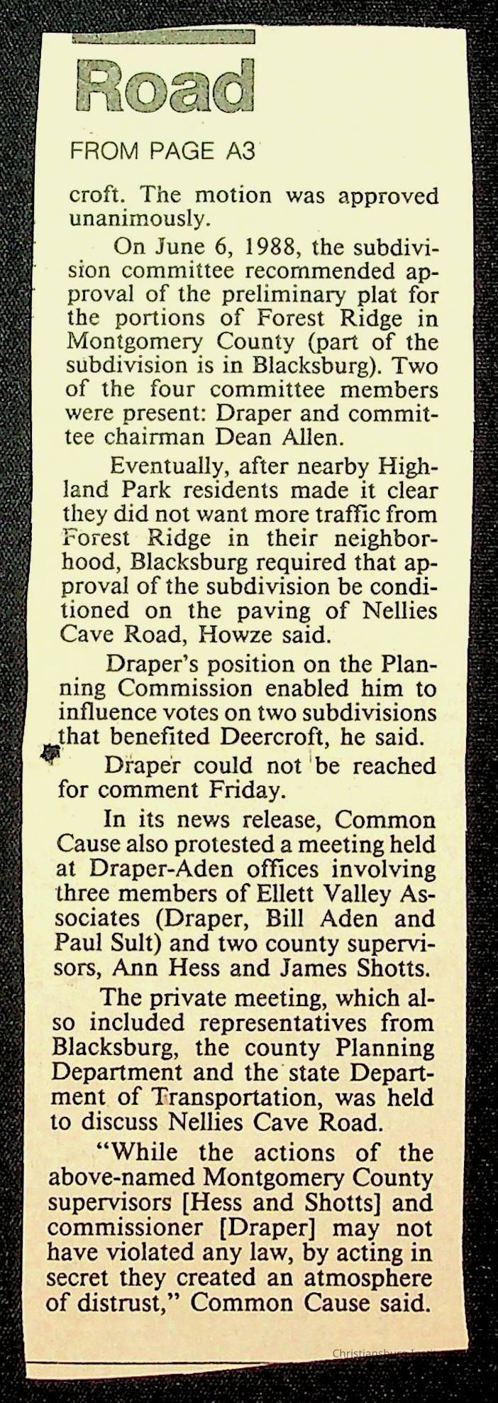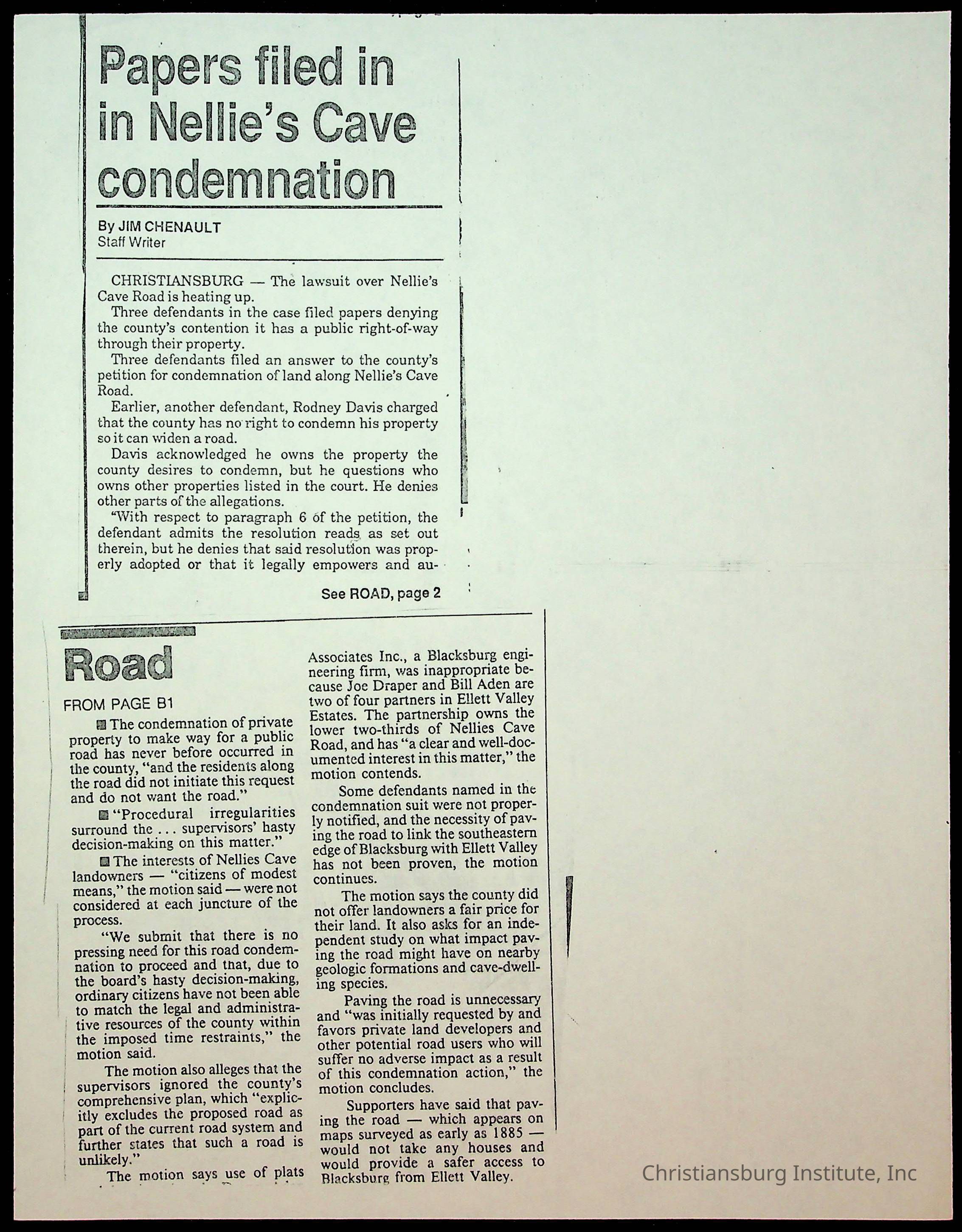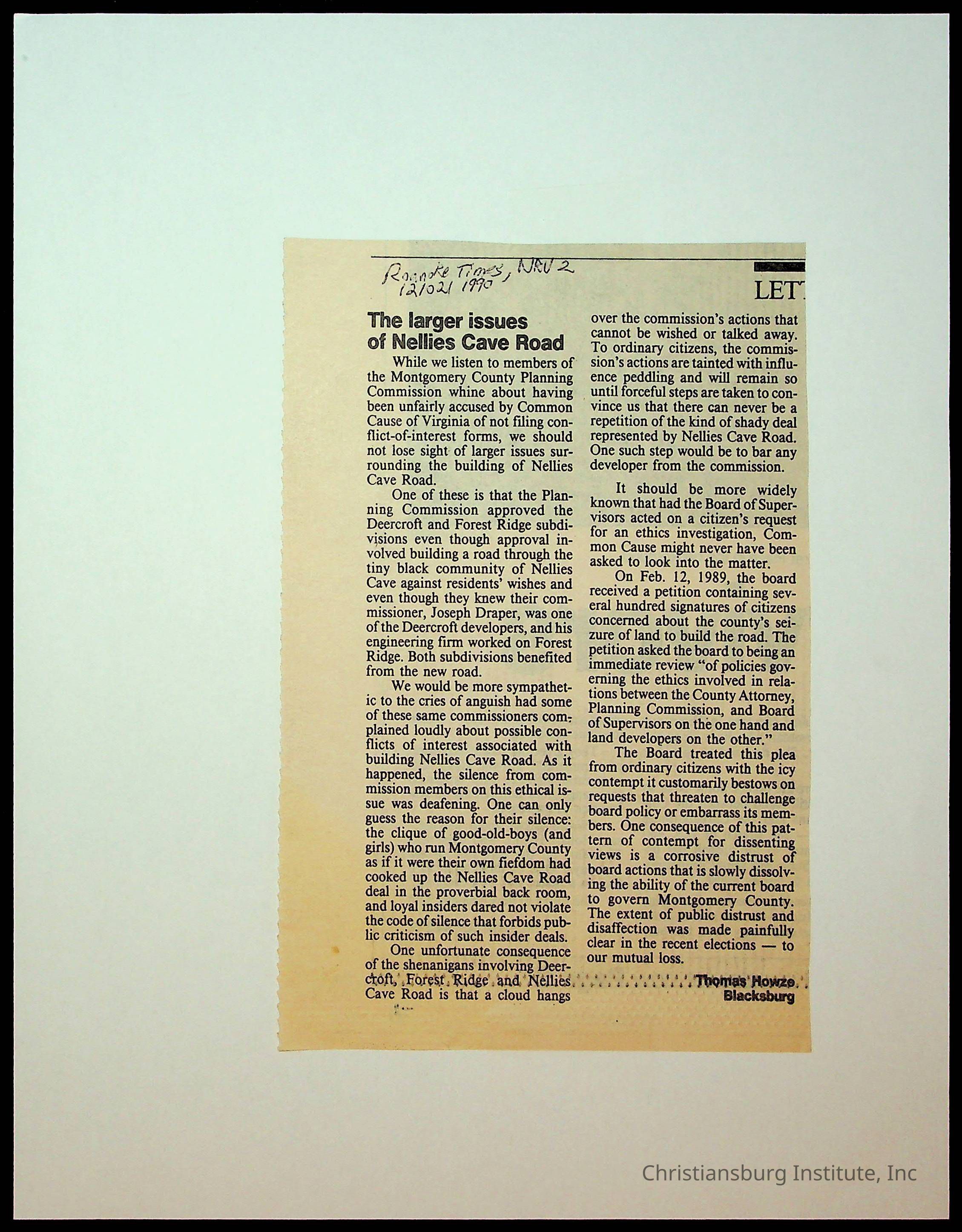 Fine, Elizabeth C., Concerned Citizens For Nellies Cave Community, Montgomery County, The Roanoke Times, The News Messenger, NRV Current