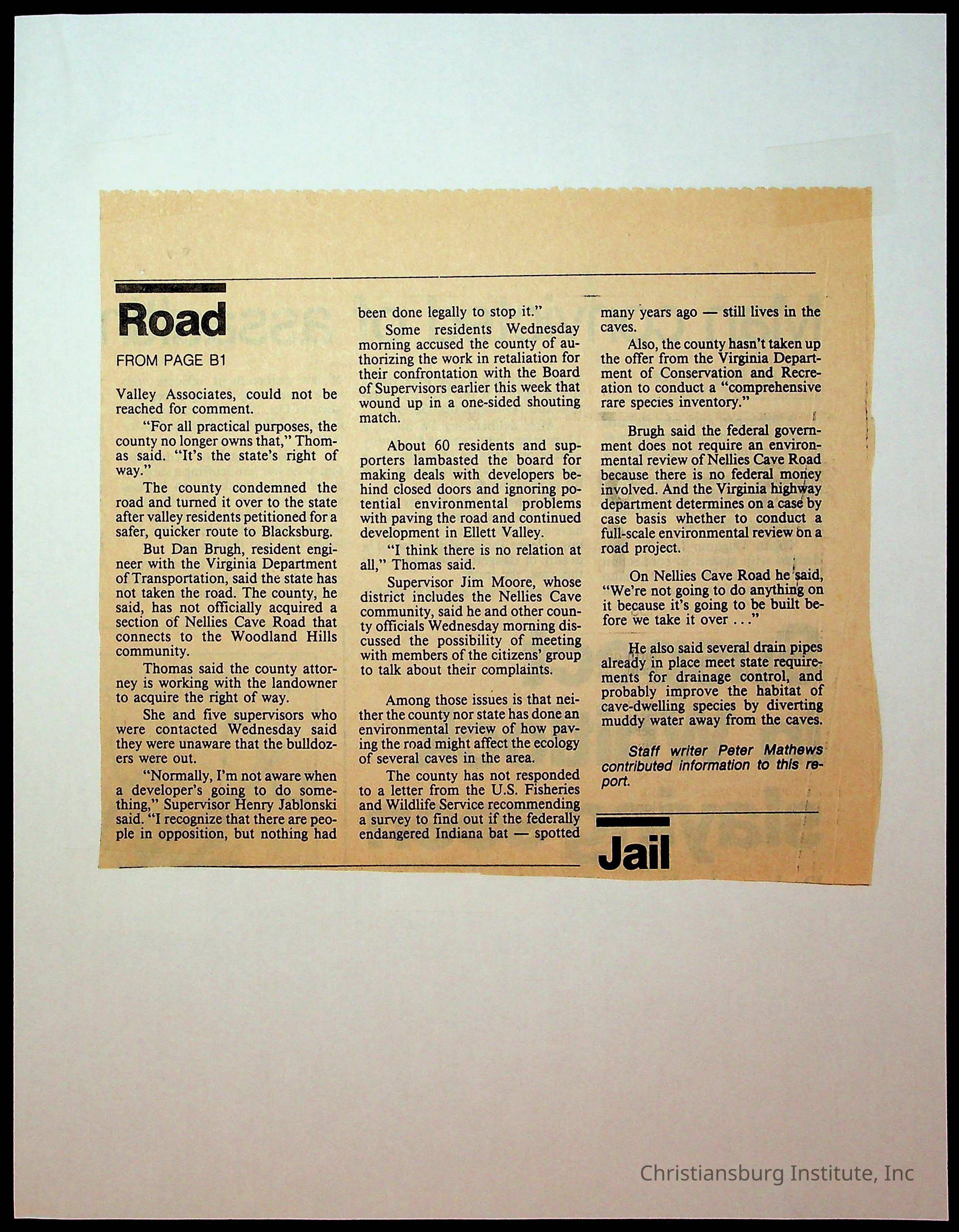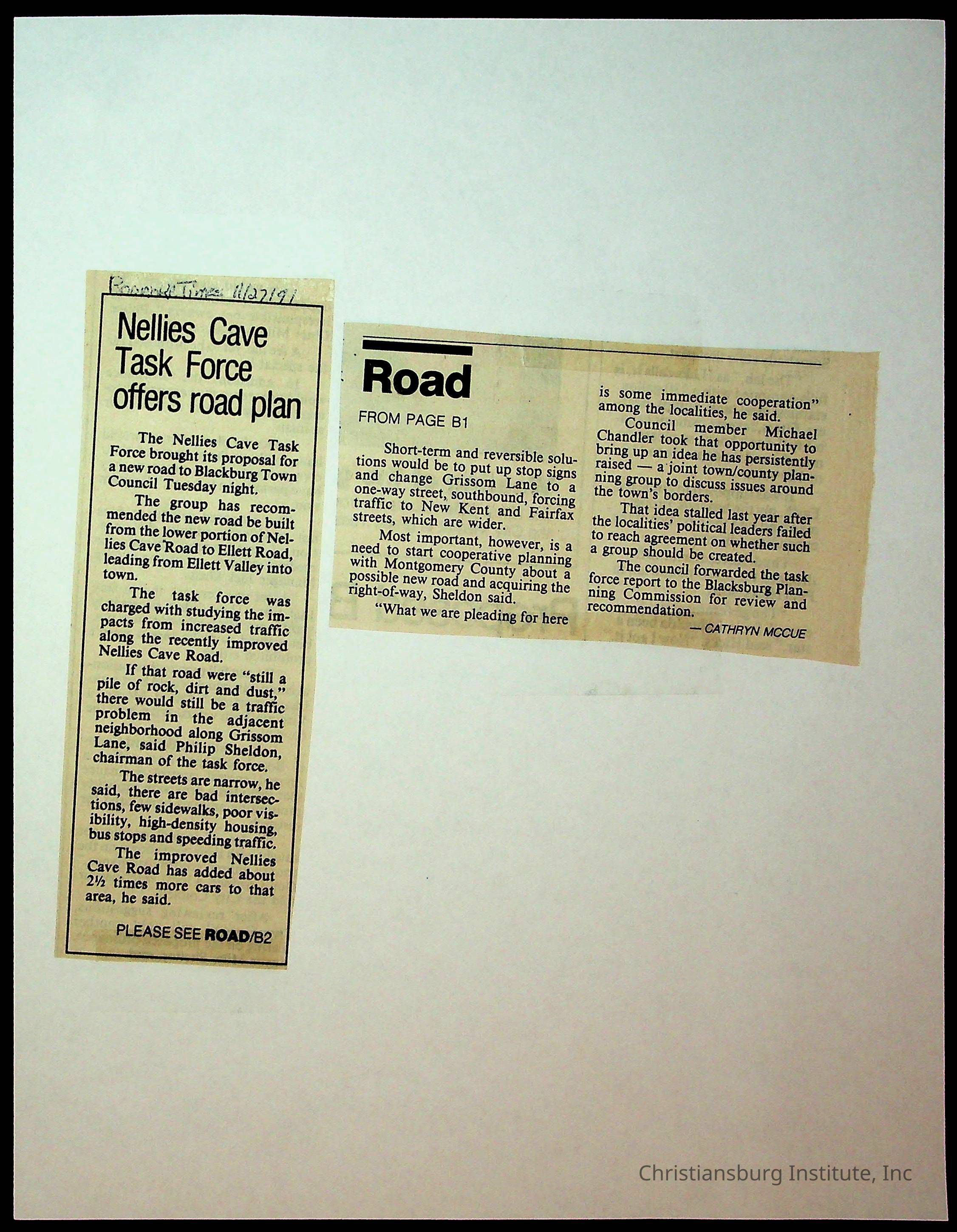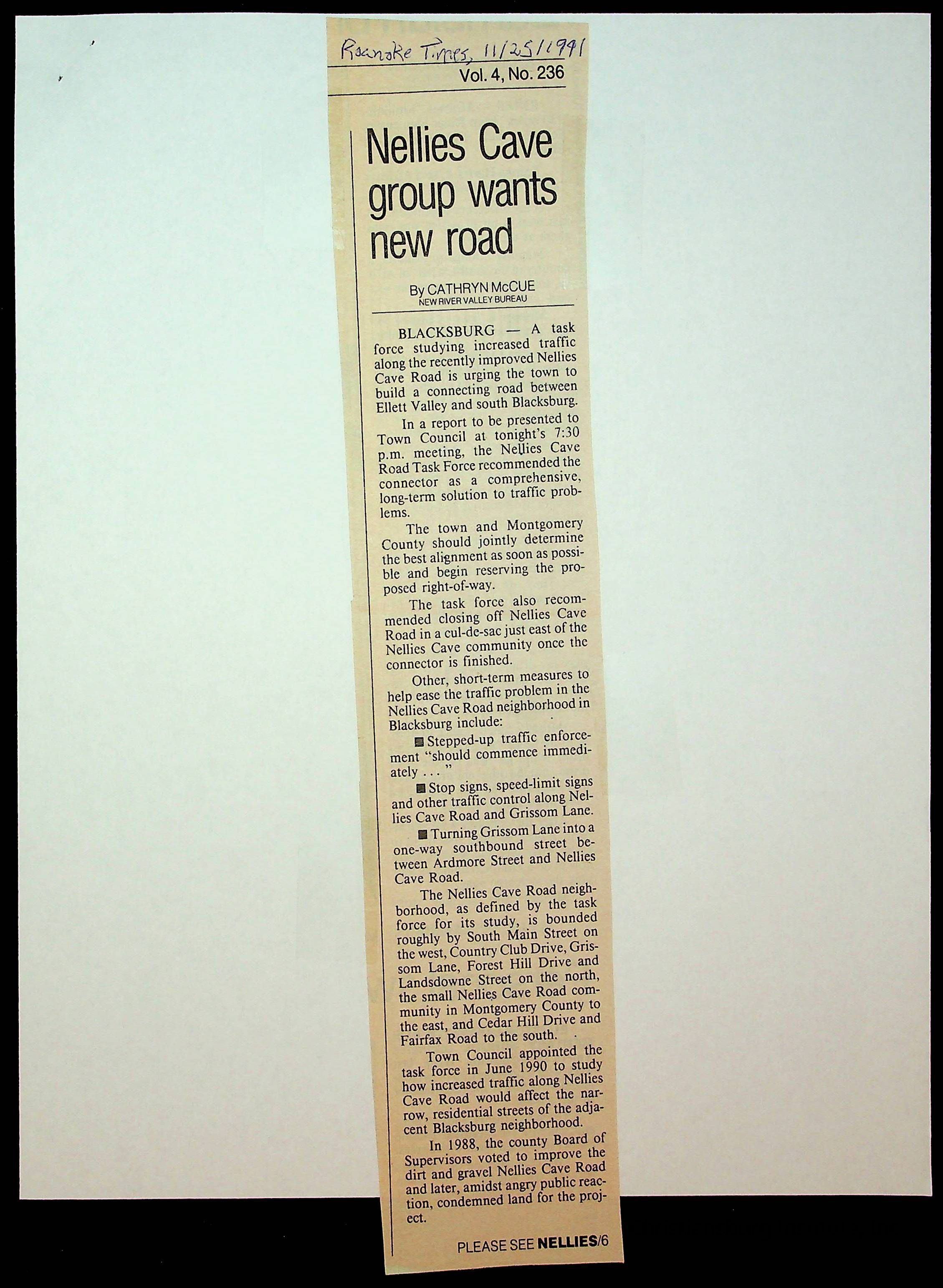 An archive of newspaper clippings about Nellies Cave and the repaving project, complied by Elizabeth Fine circa 1990s-2000s.