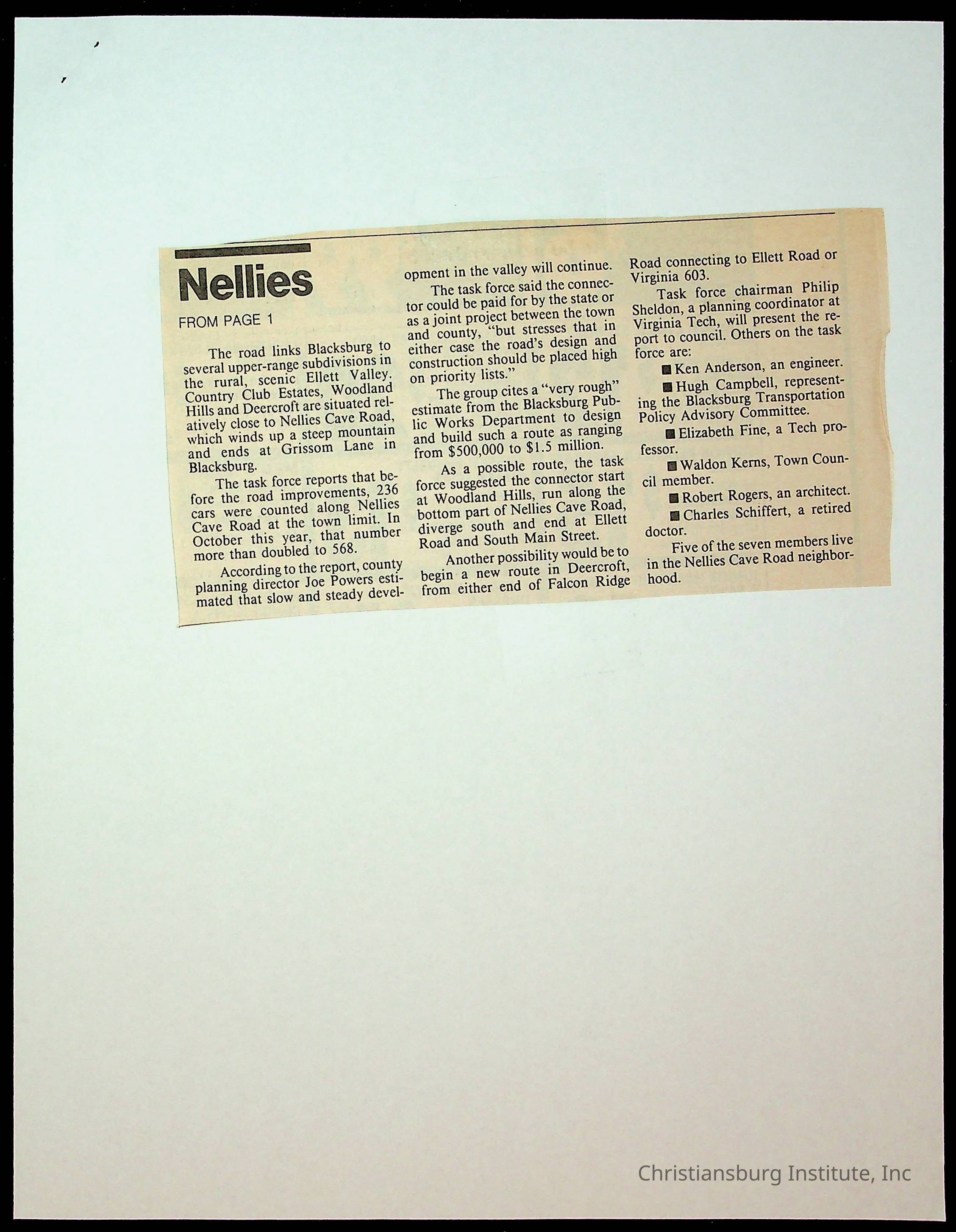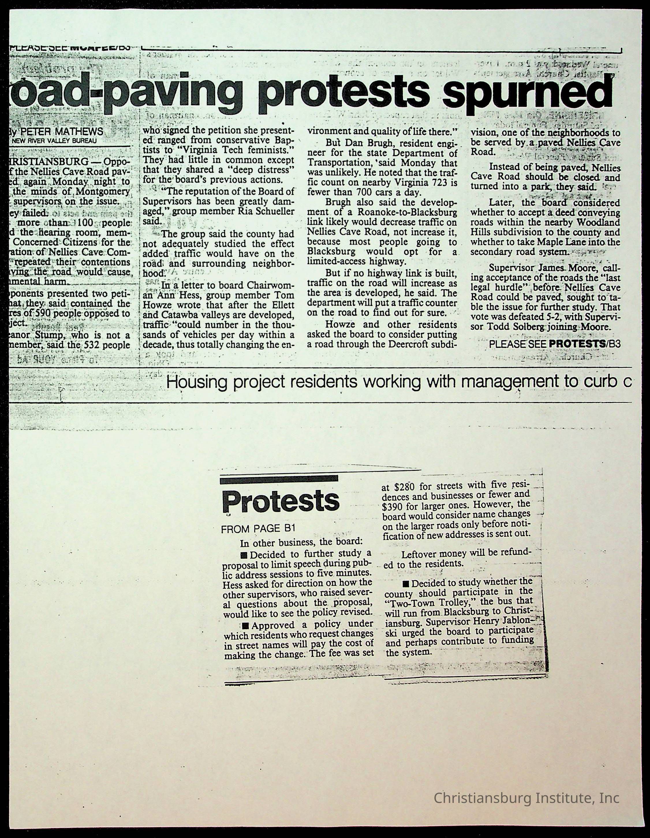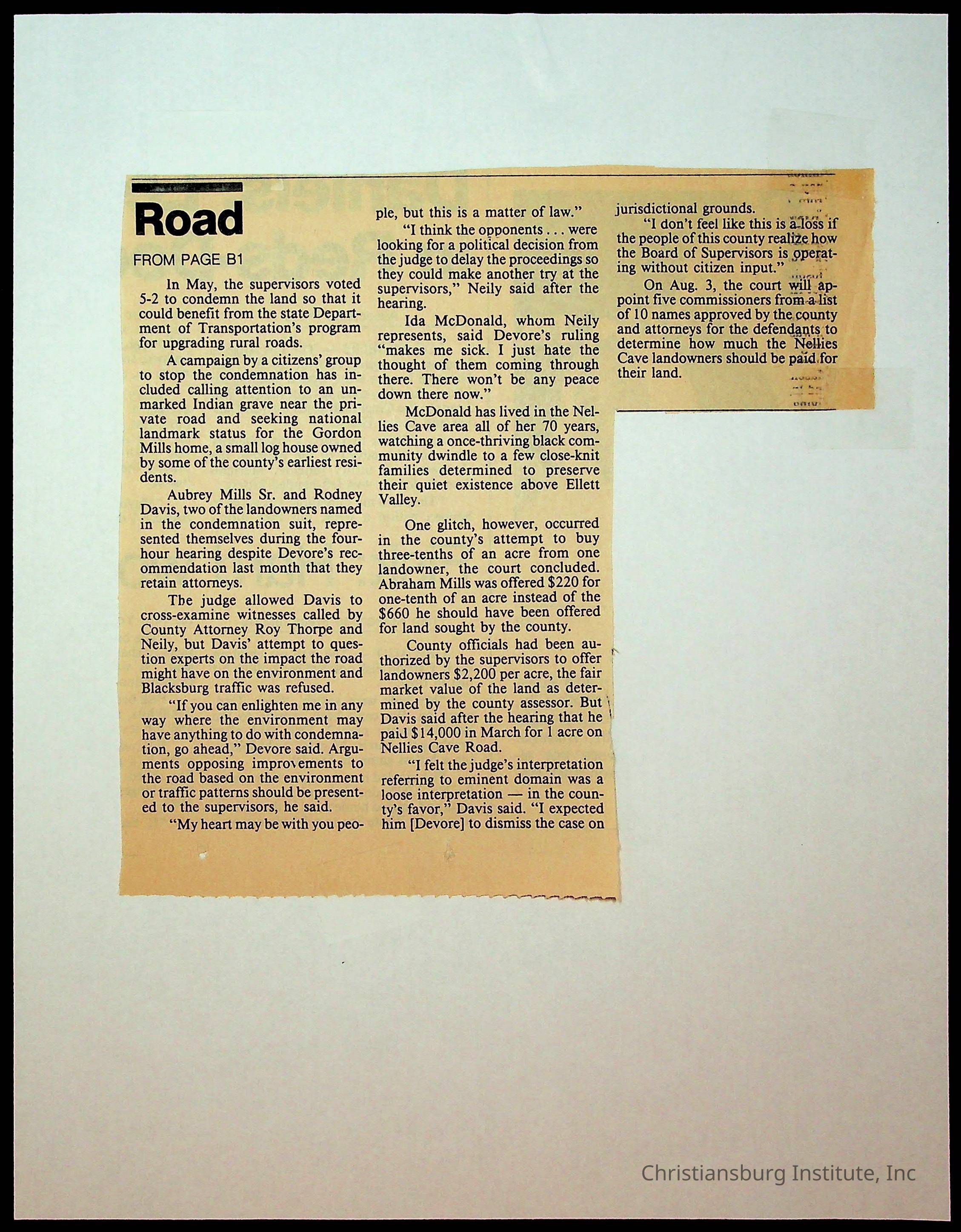 An archive of newspaper clippings about Nellies Cave and the repaving project, complied by Elizabeth Fine circa 1990s-2000s.