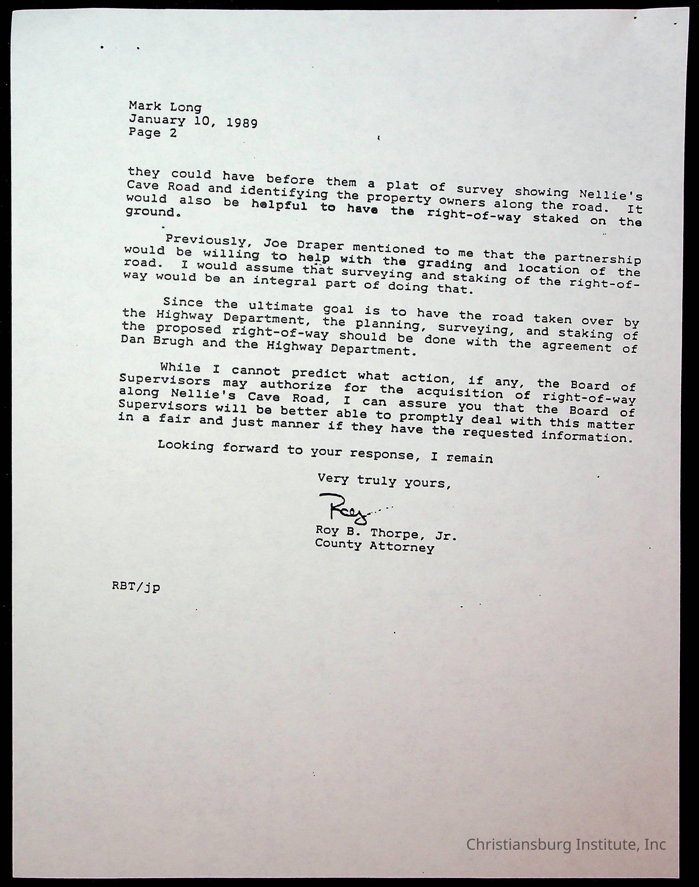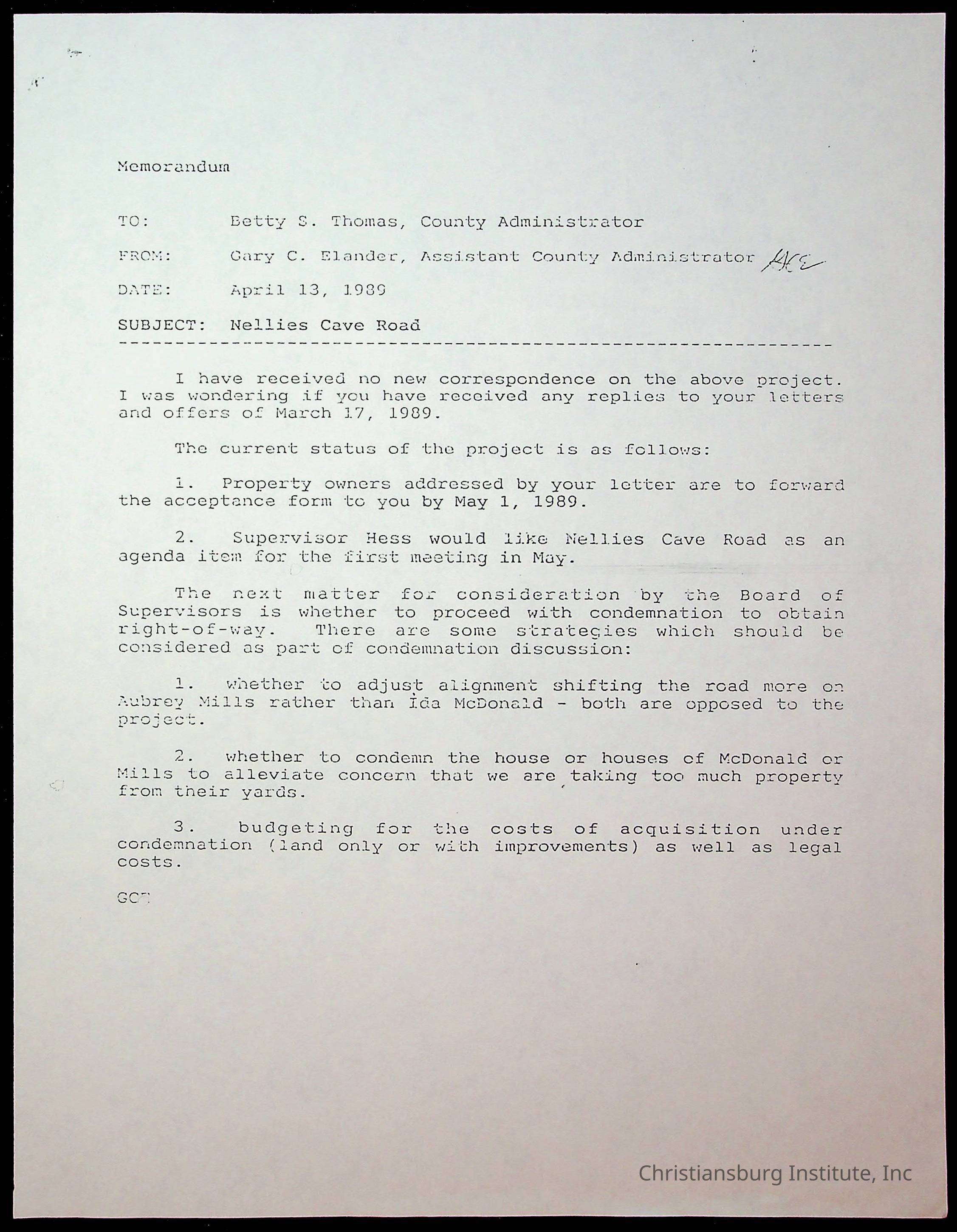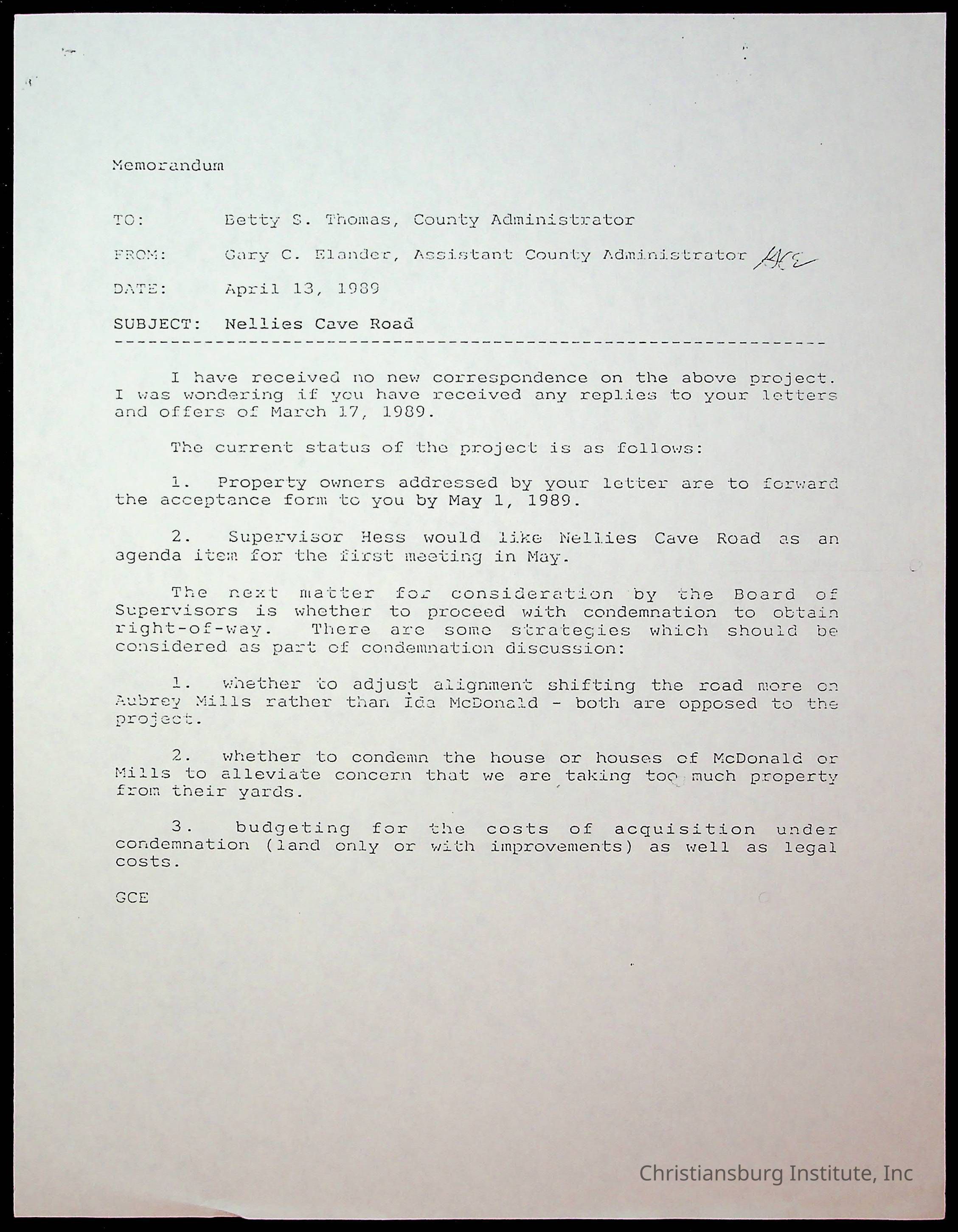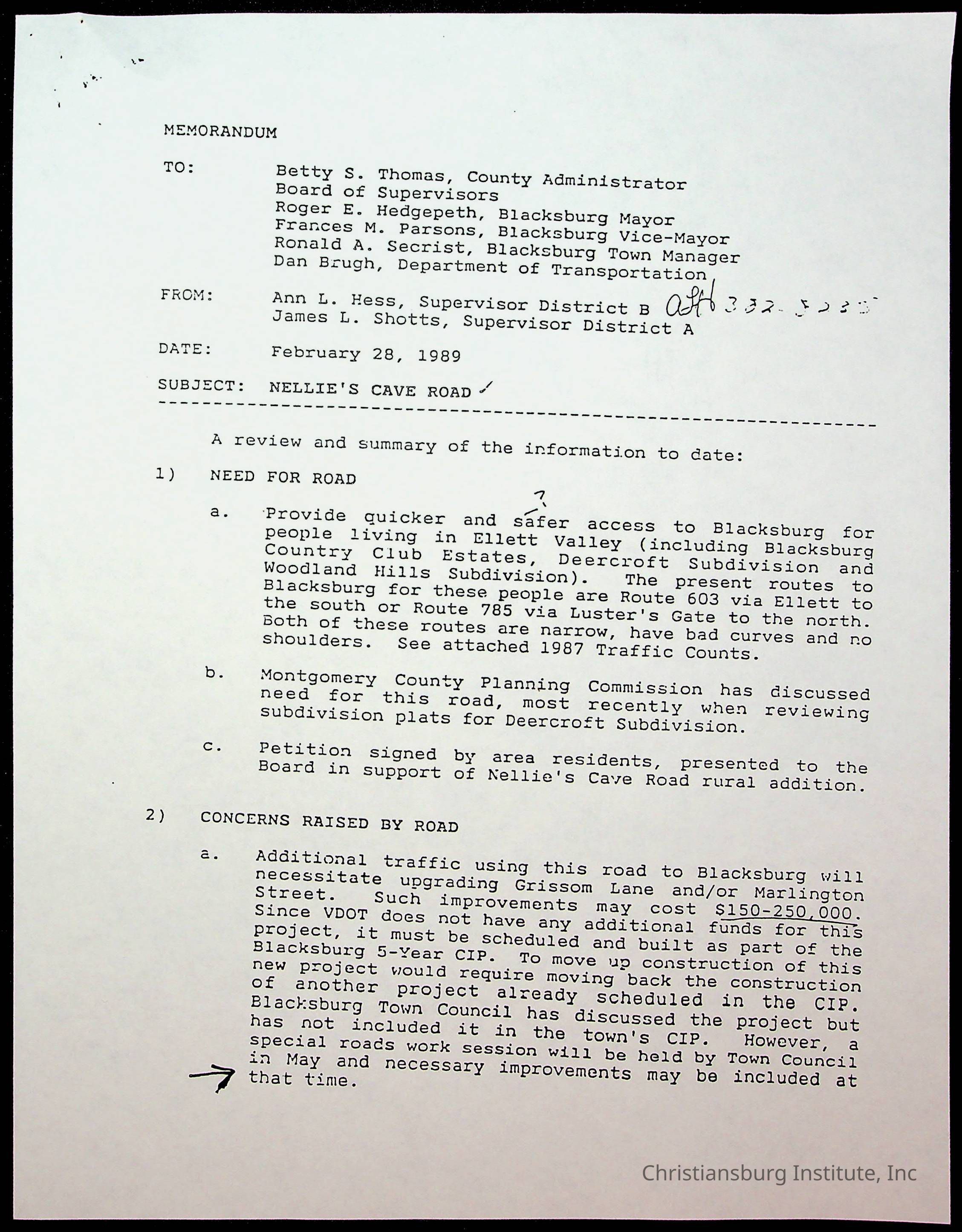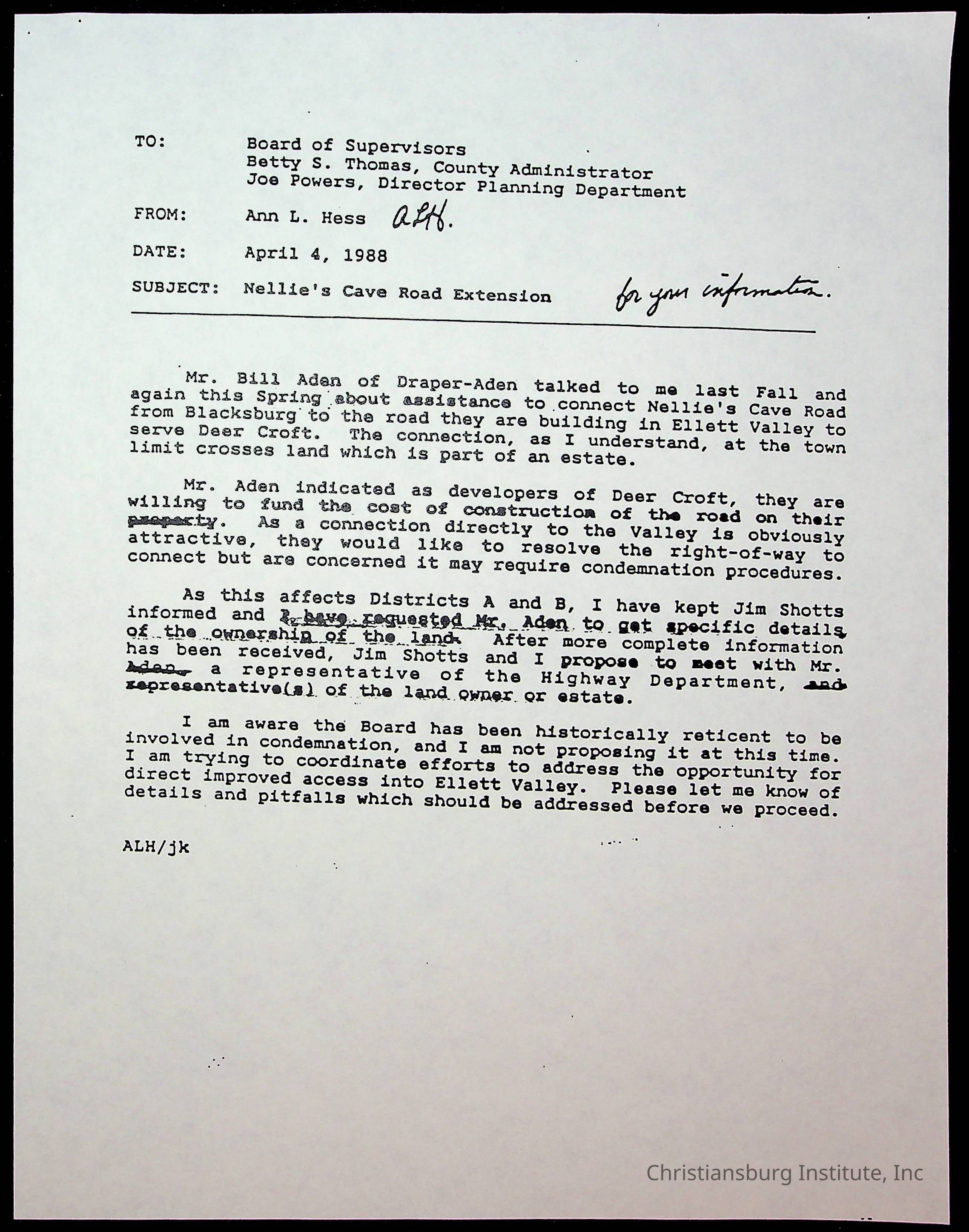 An archive of memos that are about Nellies Cave and the road project, dated 1980s and complied by Elizabeth Fine.