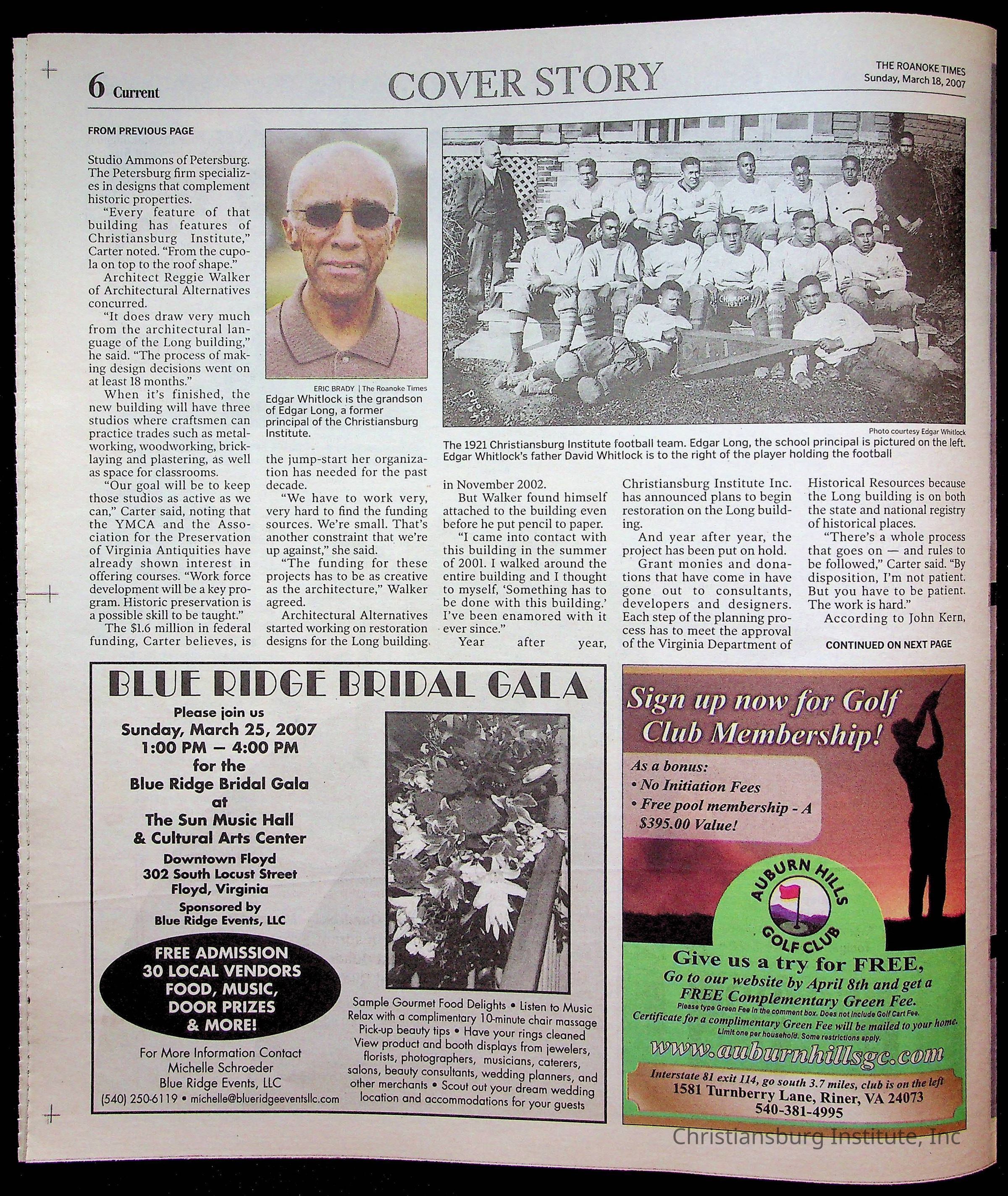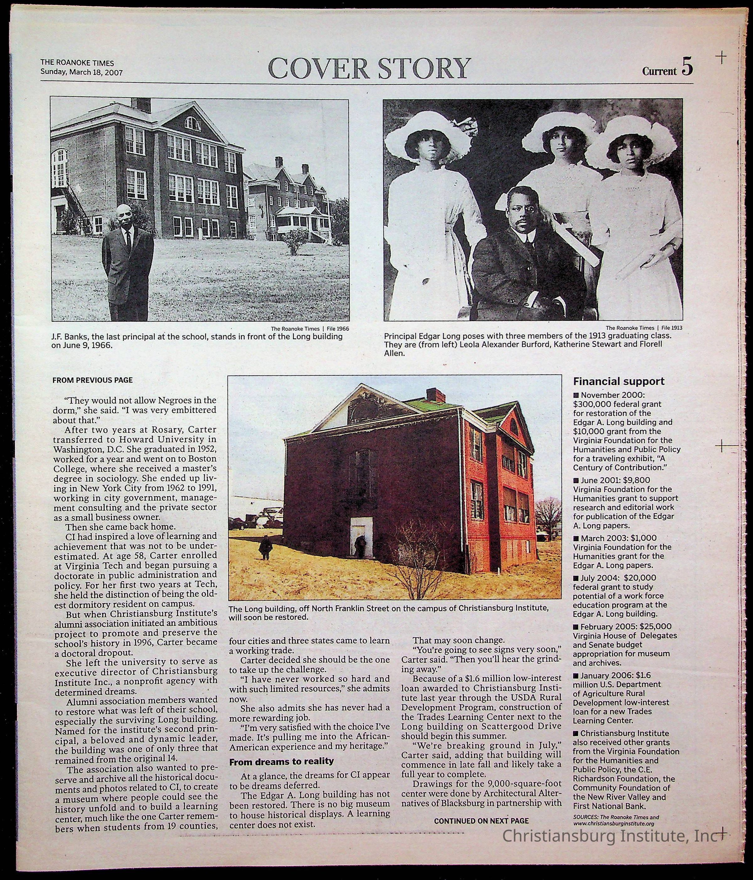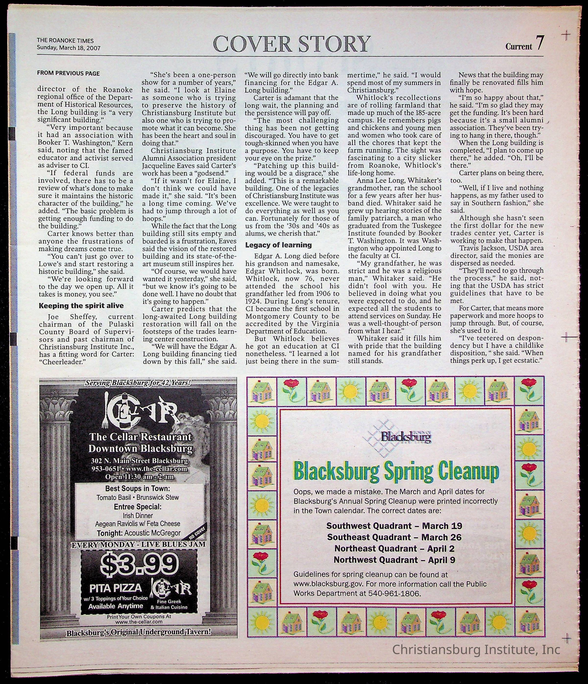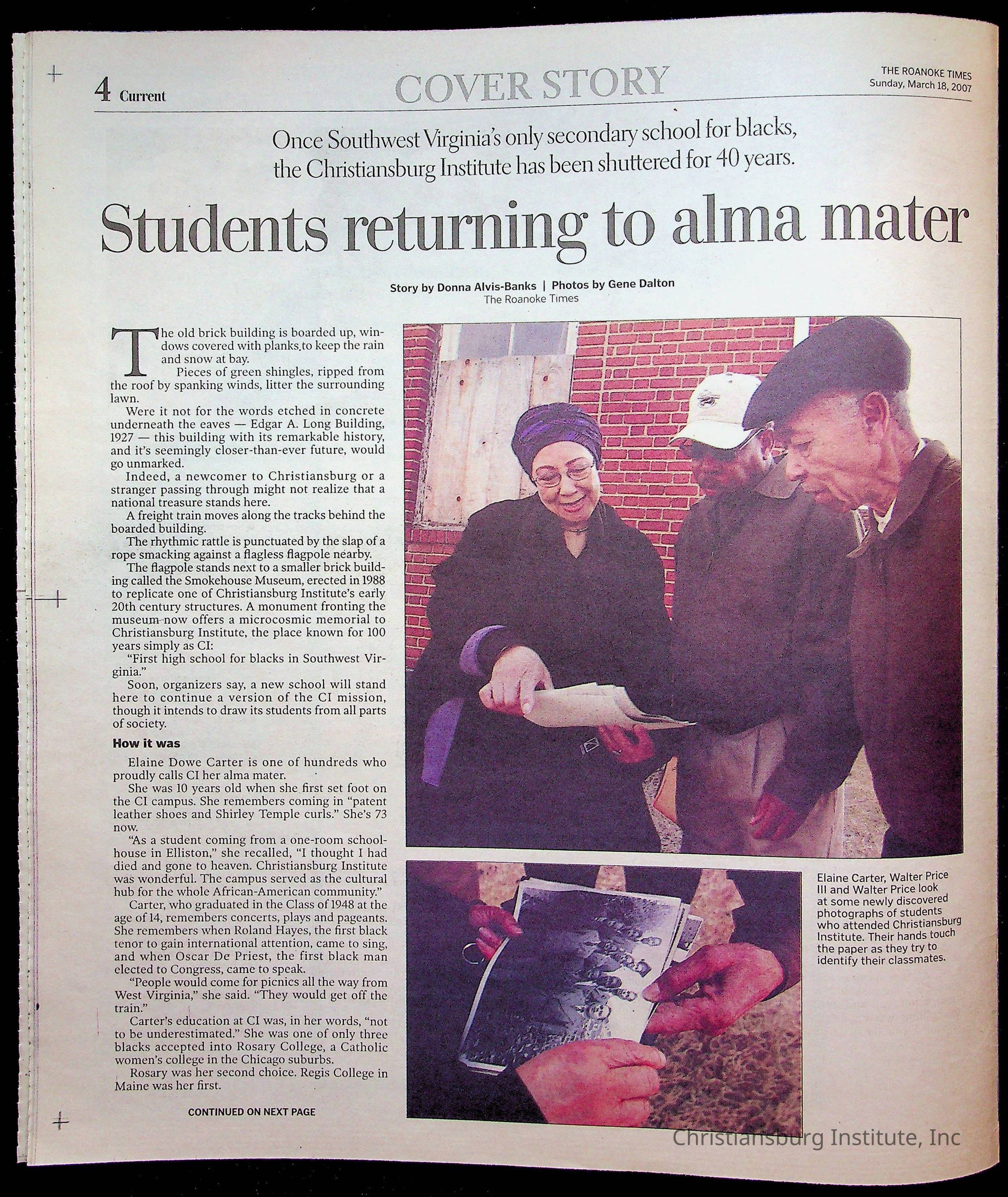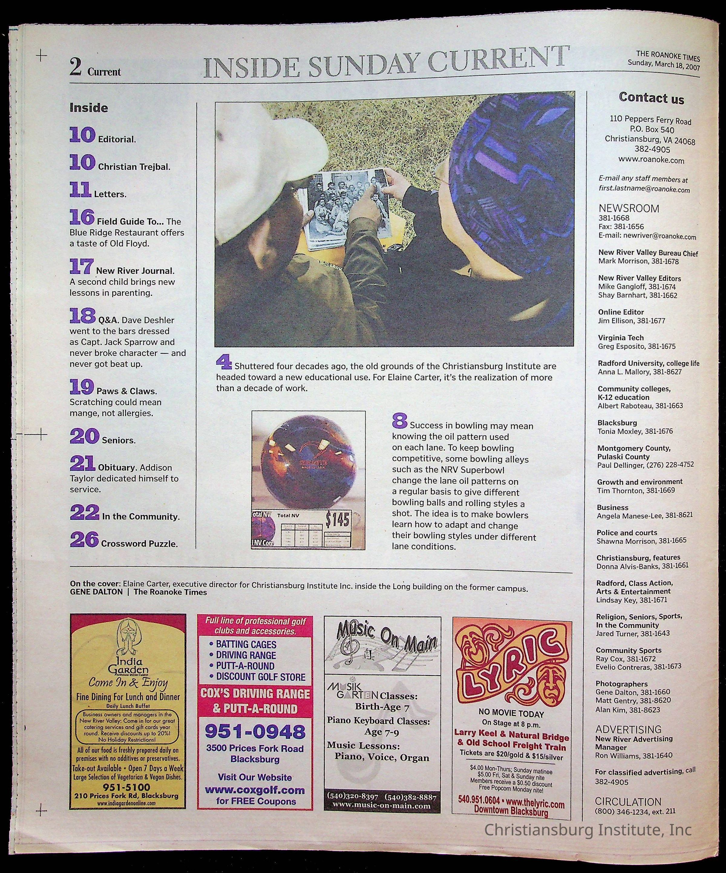 A copy of the New River Valley Current Sunday published by The Roanoke Times that covers Christiansburg Institute, dated March 18th, 2007.Collection