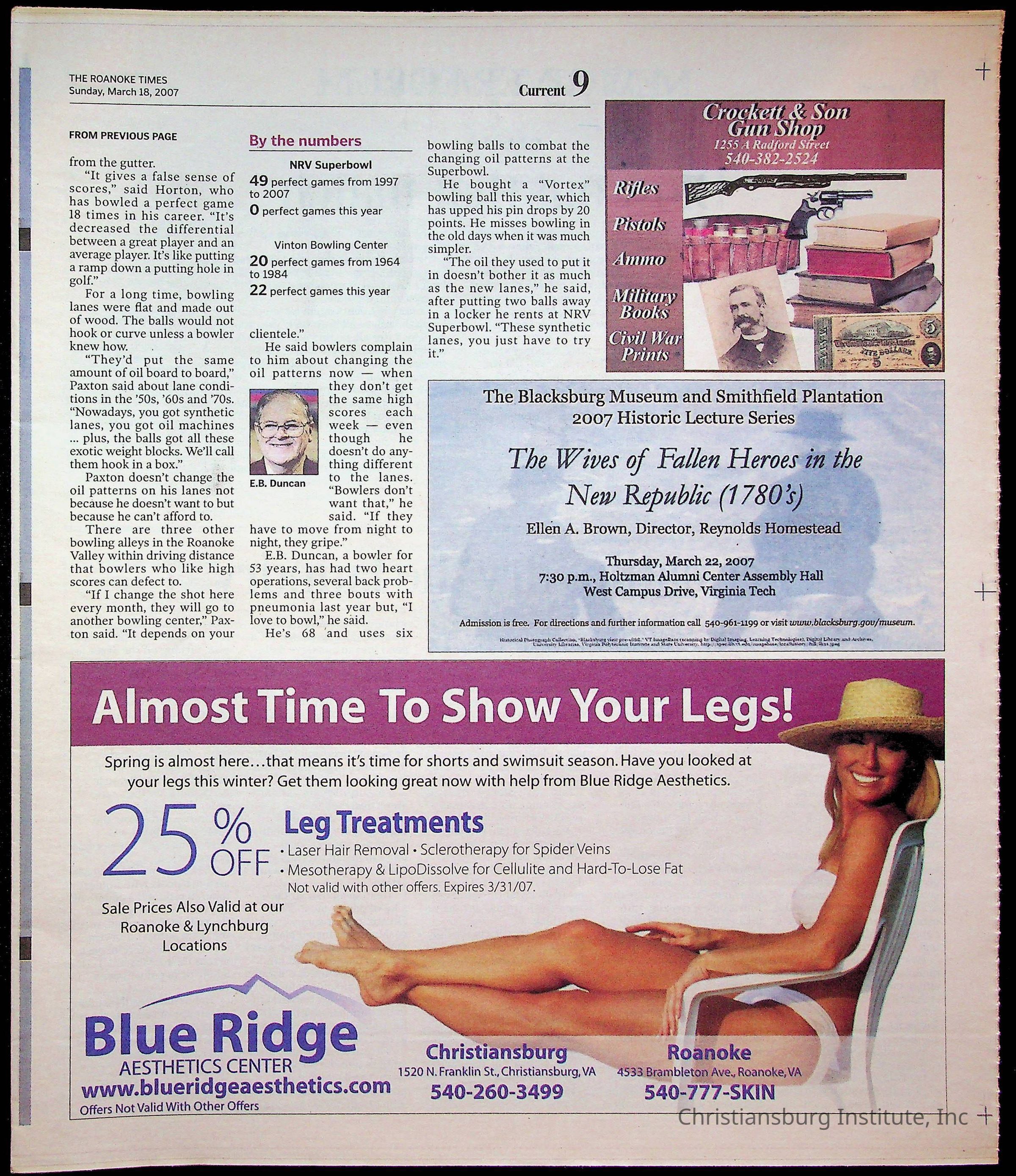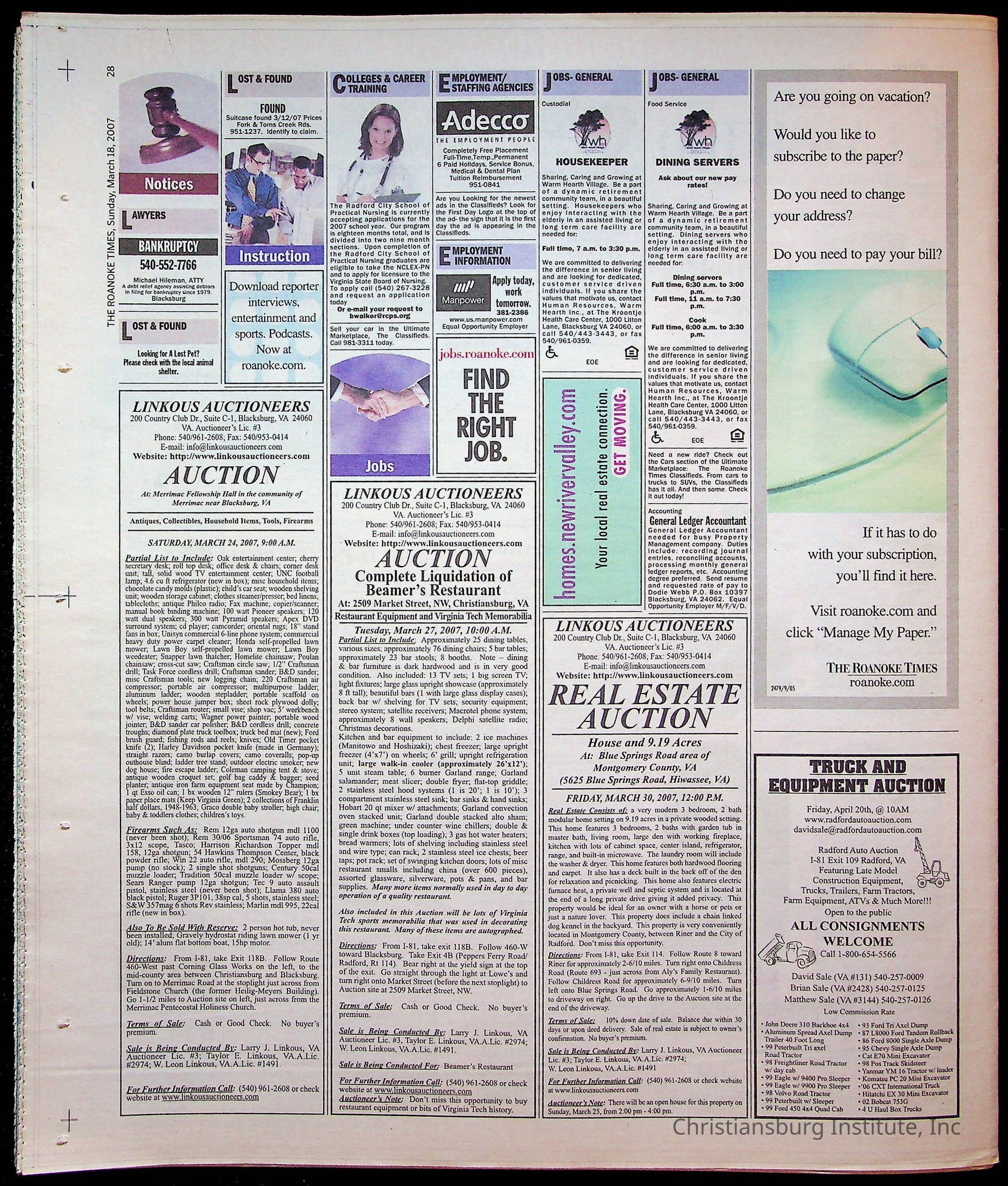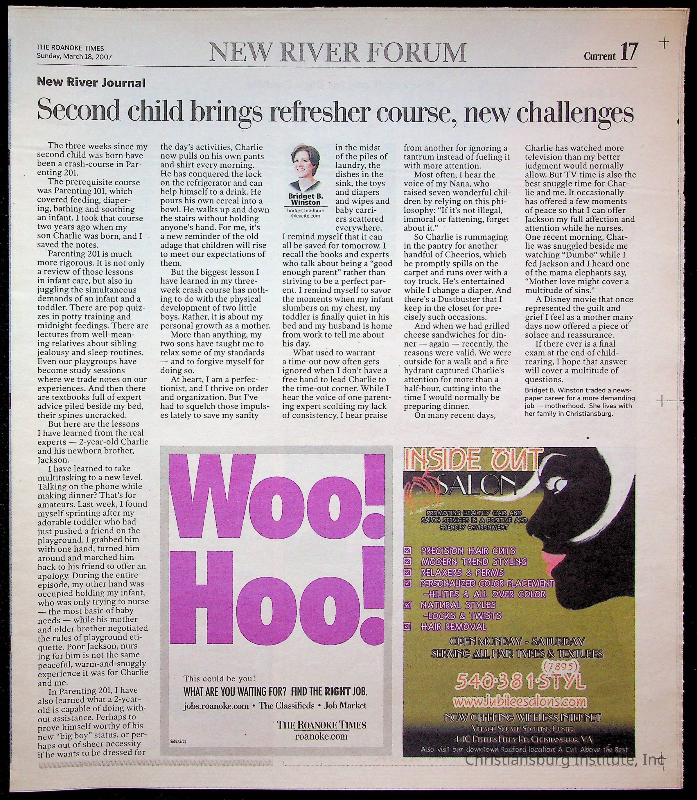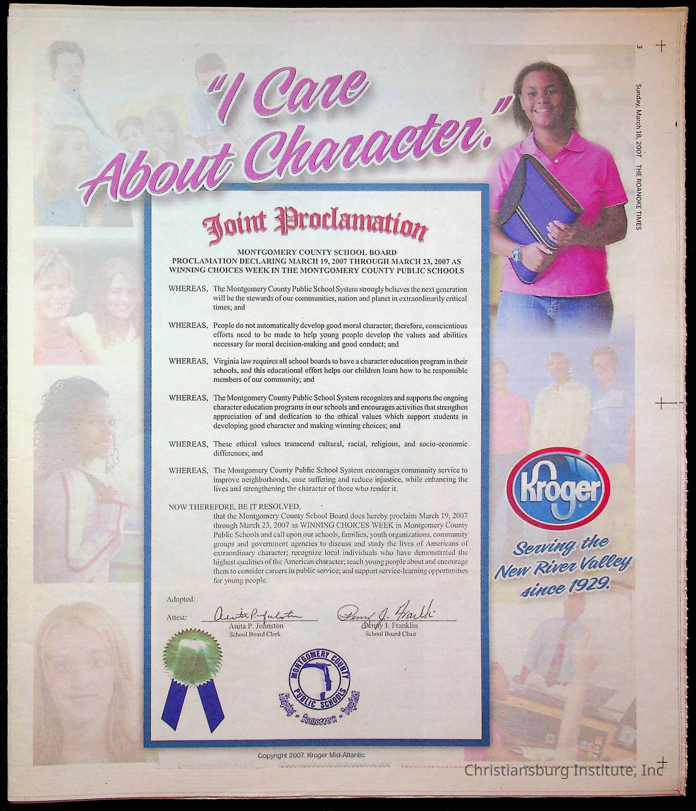 A copy of the New River Valley Current Sunday published by The Roanoke Times that covers Christiansburg Institute, dated March 18th, 2007.Collection