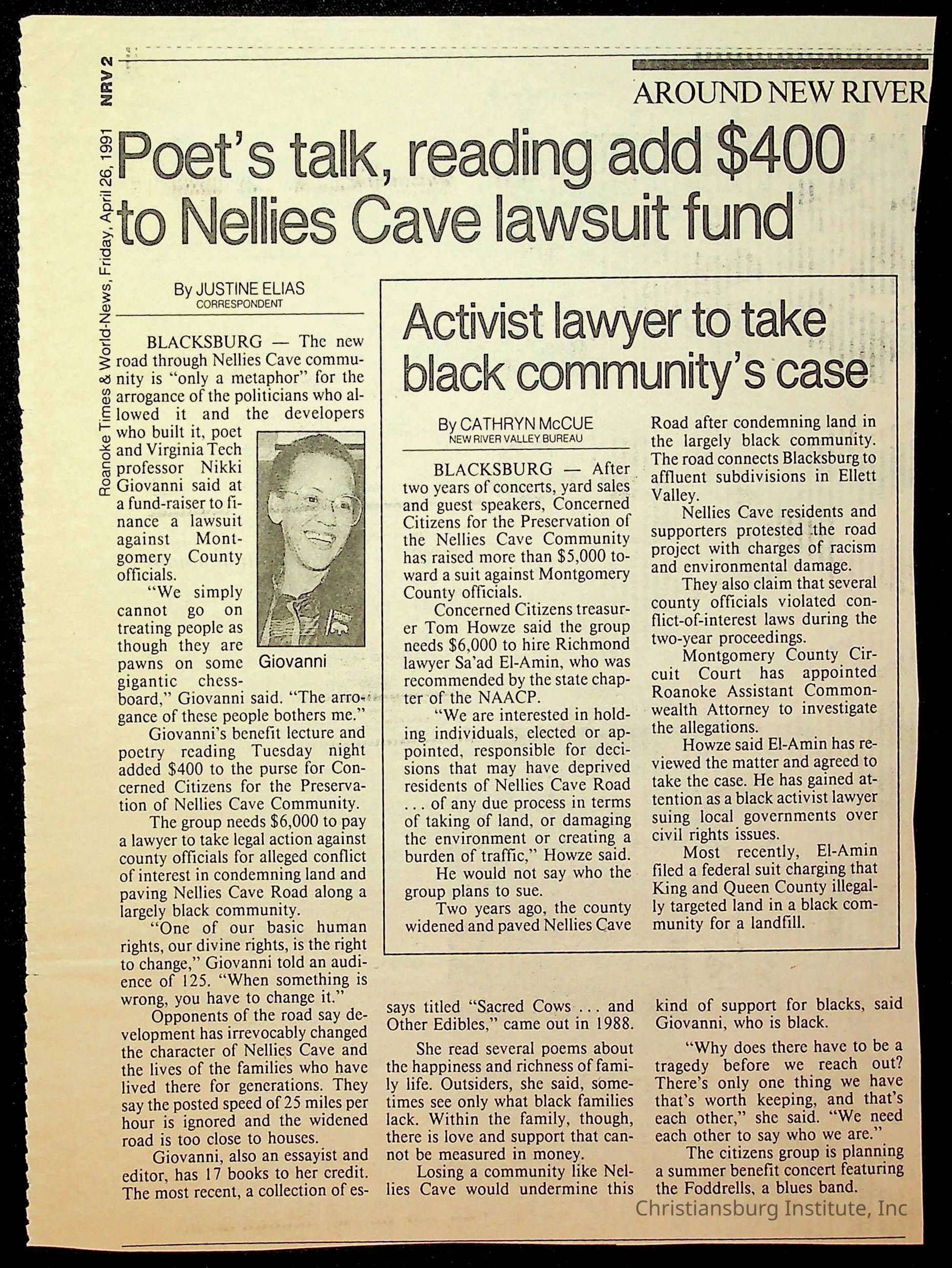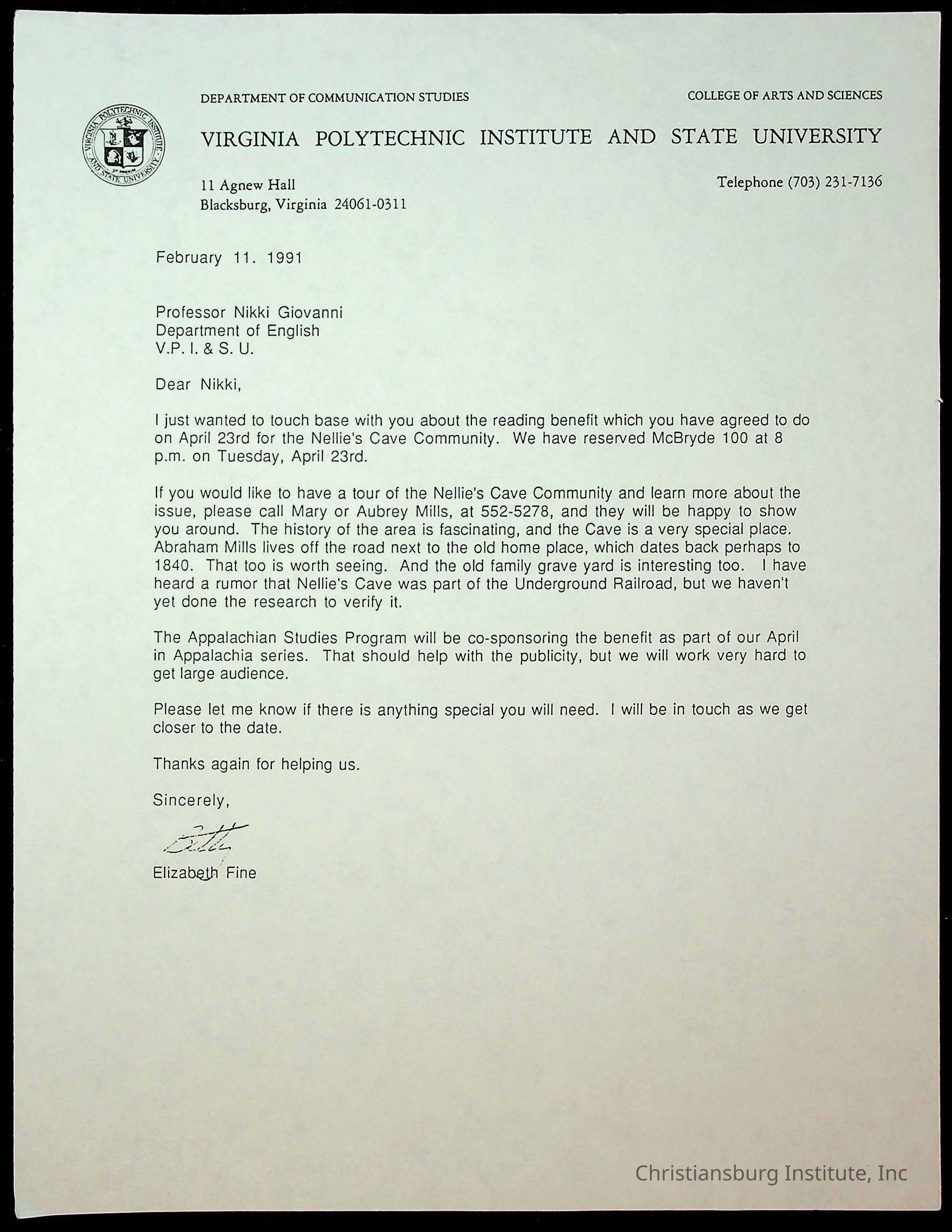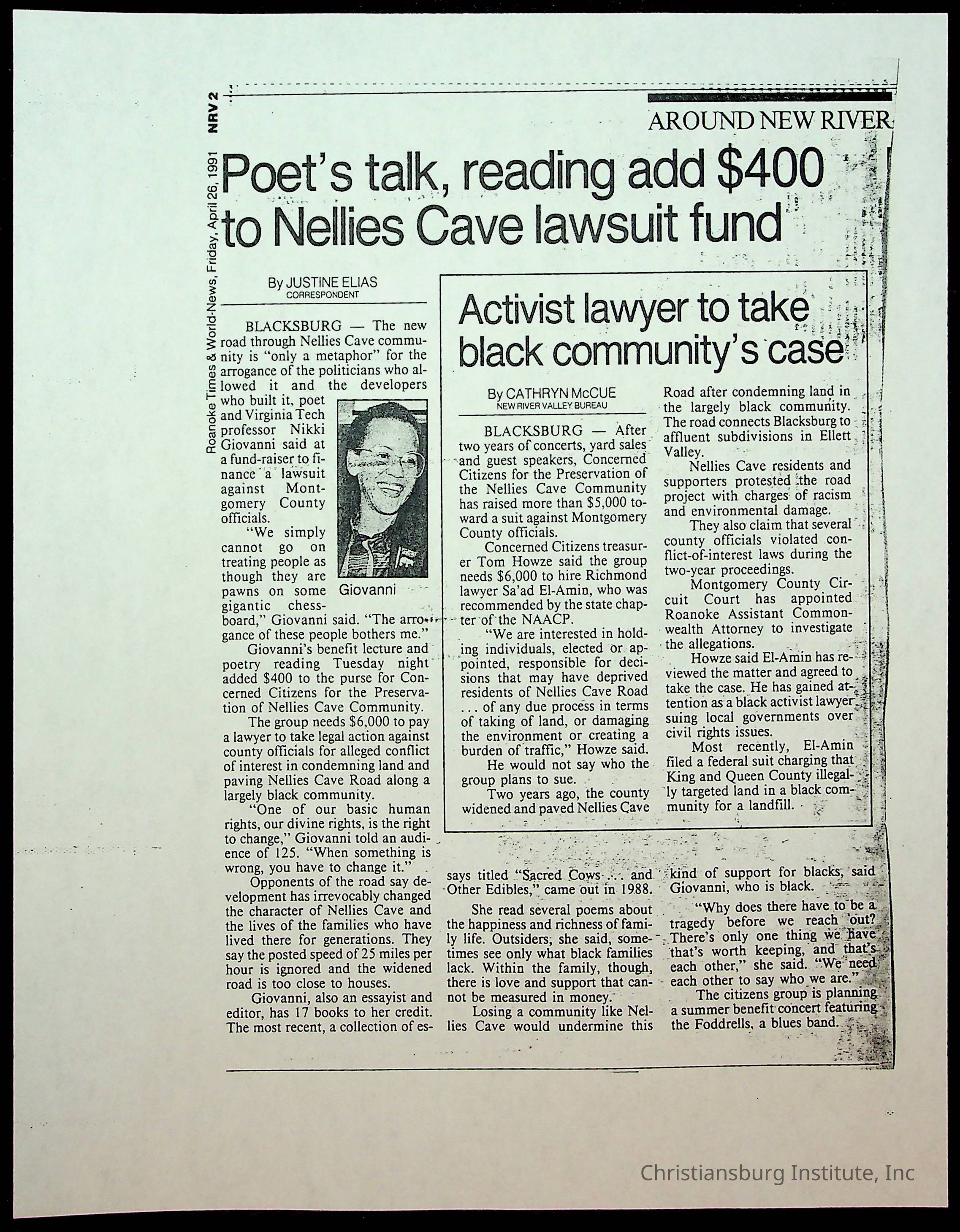 An archive of materials related to the Nikki Giovanni Benefit that raised $400 for the Nellies Cave lawsuit, compiled by Elizabeth Fine.