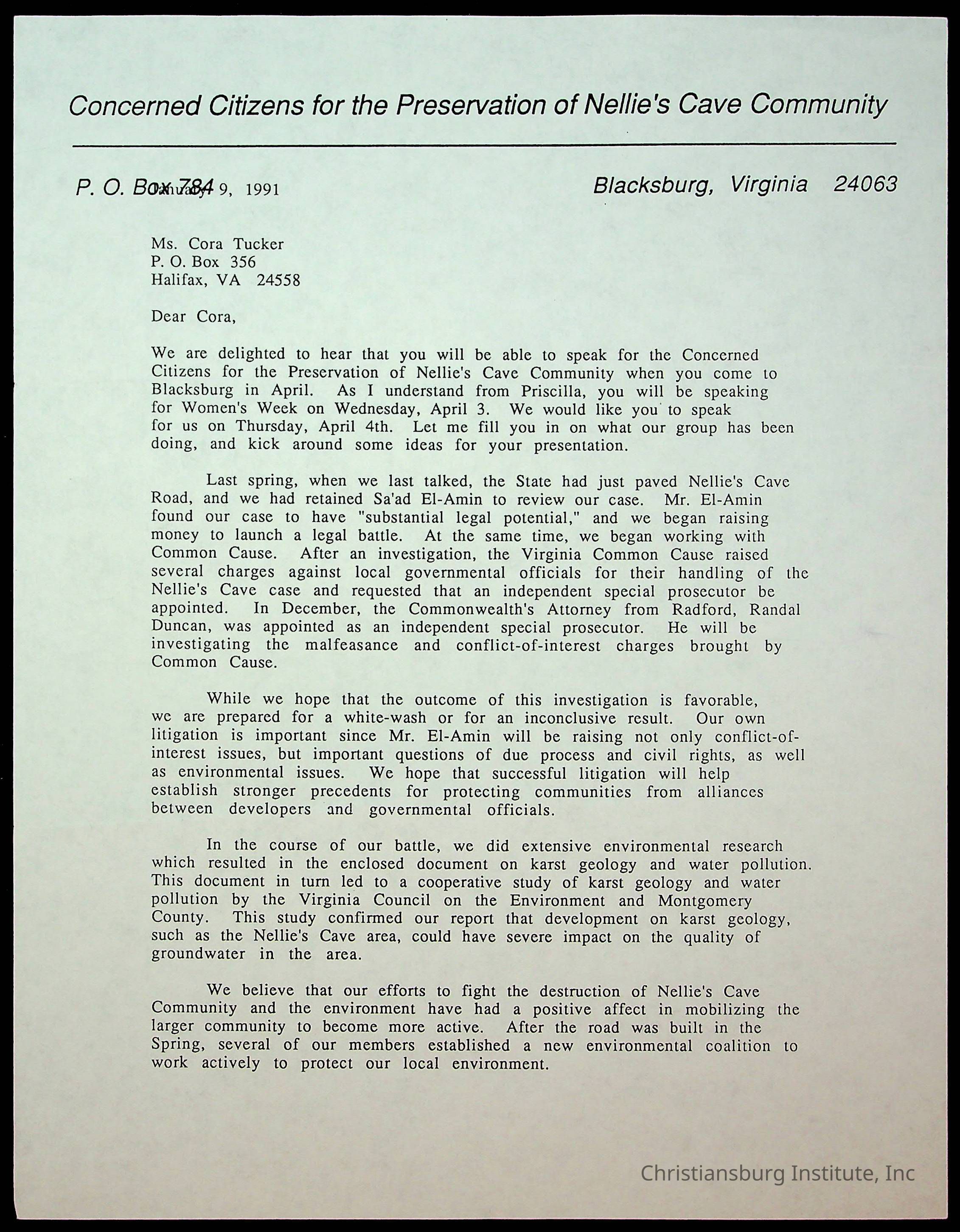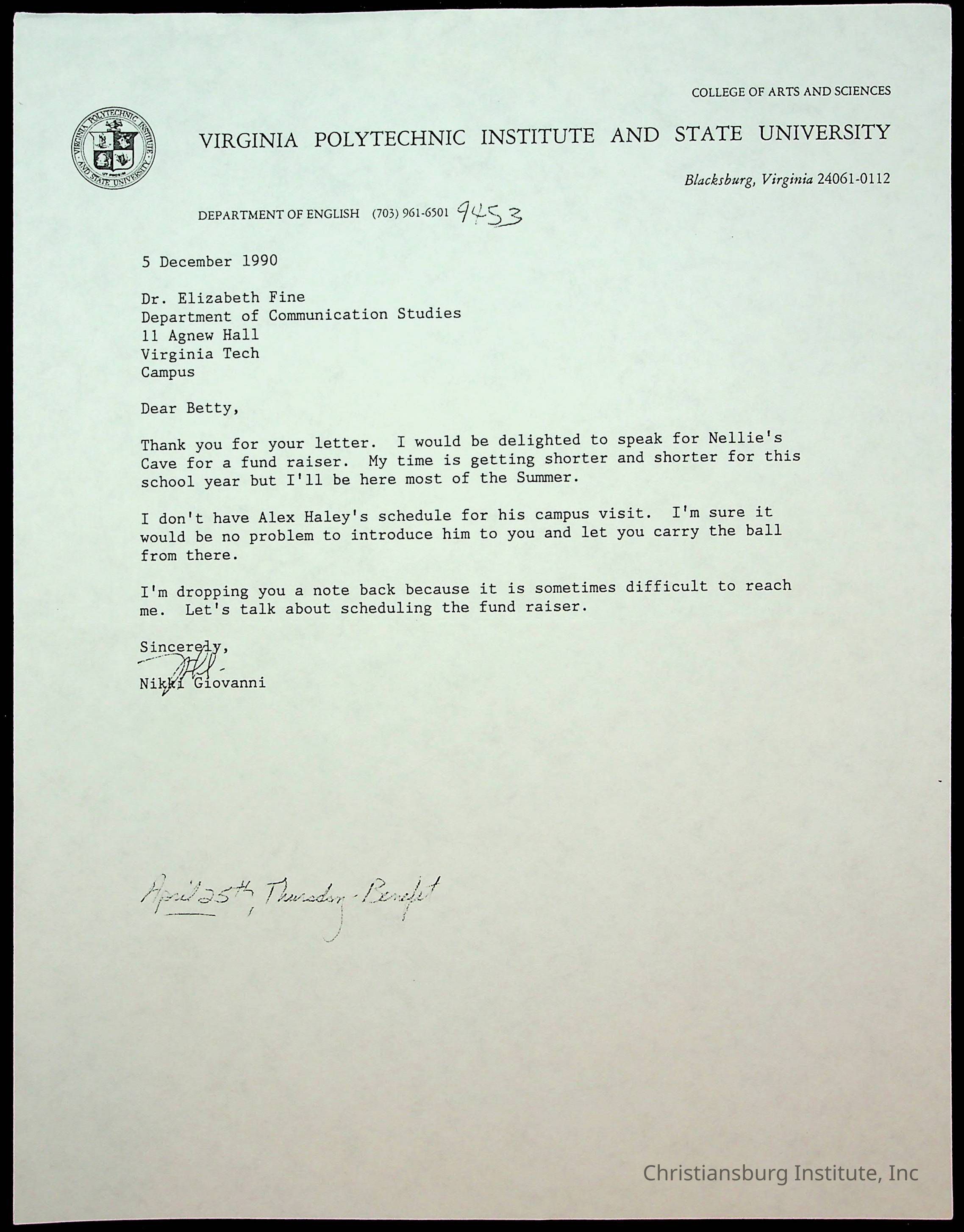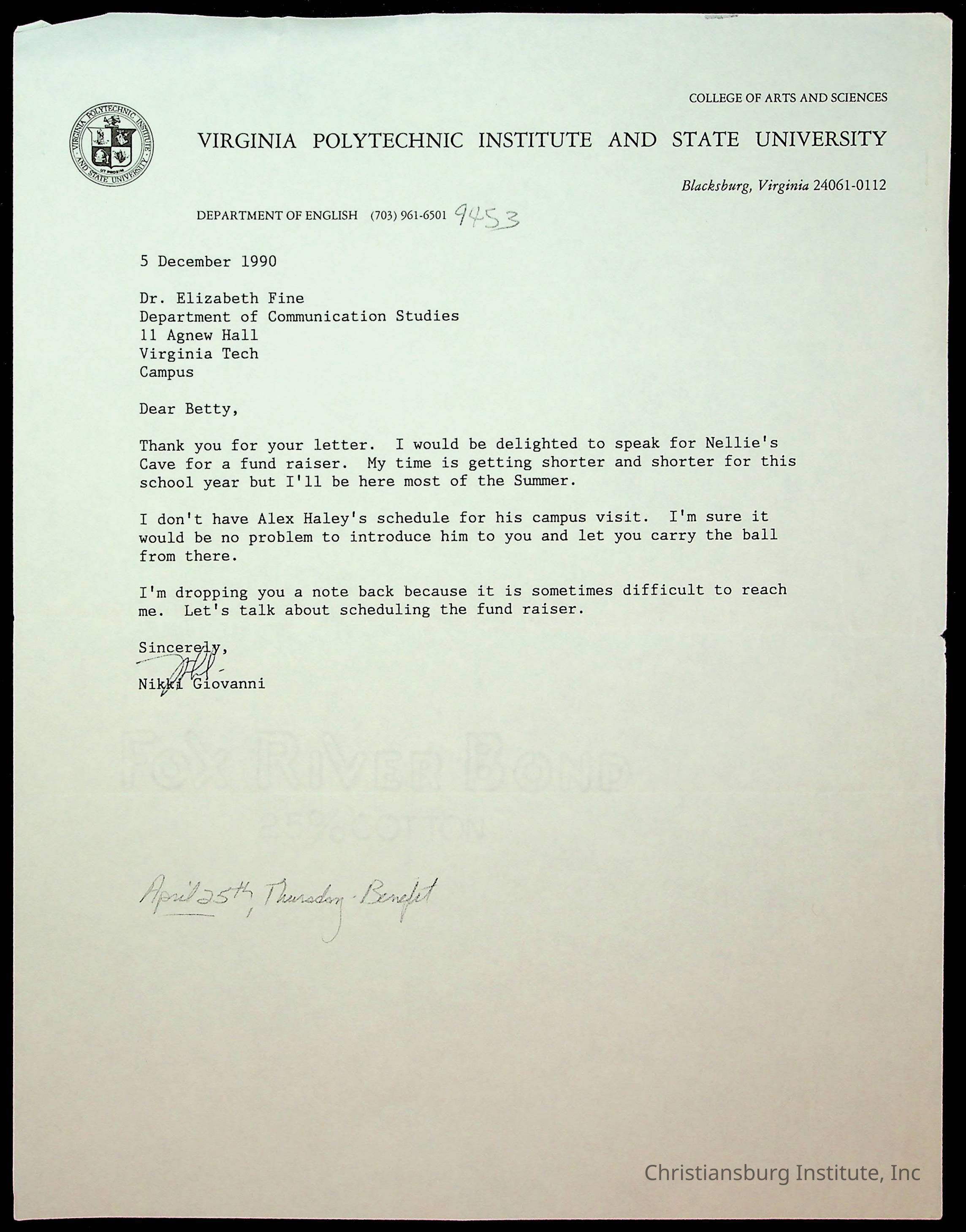 An archive of materials related to the Nikki Giovanni Benefit that raised $400 for the Nellies Cave lawsuit, compiled by Elizabeth Fine.