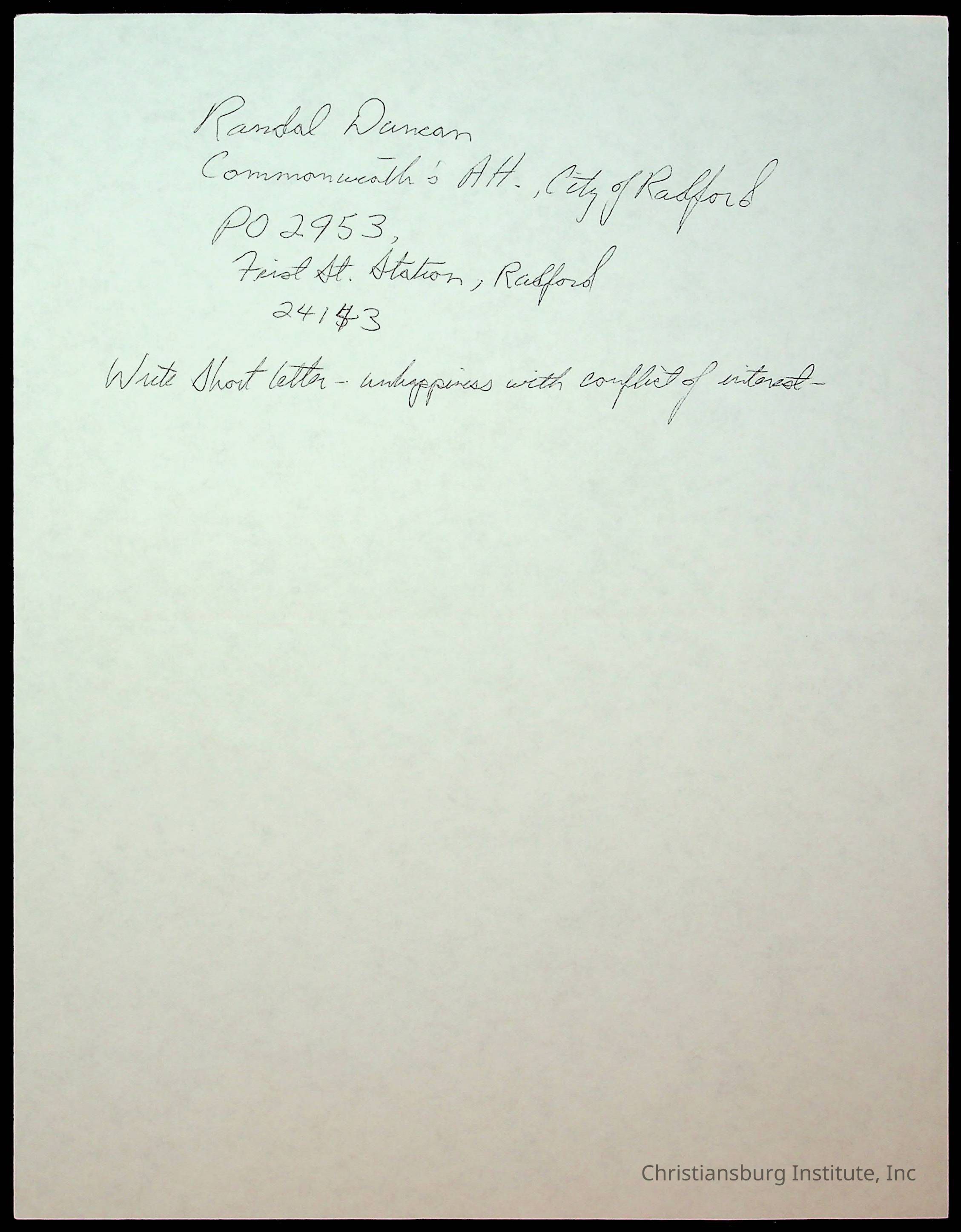 Copyright has been assigned to Christiansburg Institute Museum & Archives by Elizabeth Fine. For permission to publish materials created by the donor, contact CIMA@christiansburginstitute.com. Materials not created by Elizabeth Fine may still be under copyright.