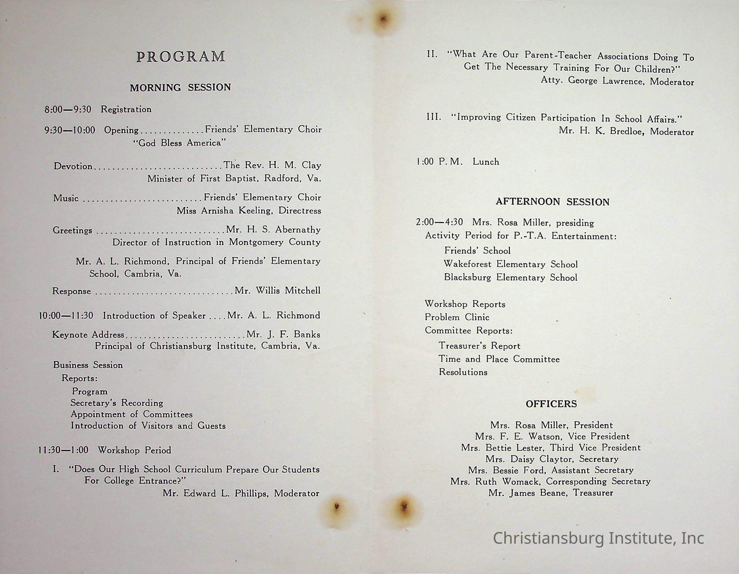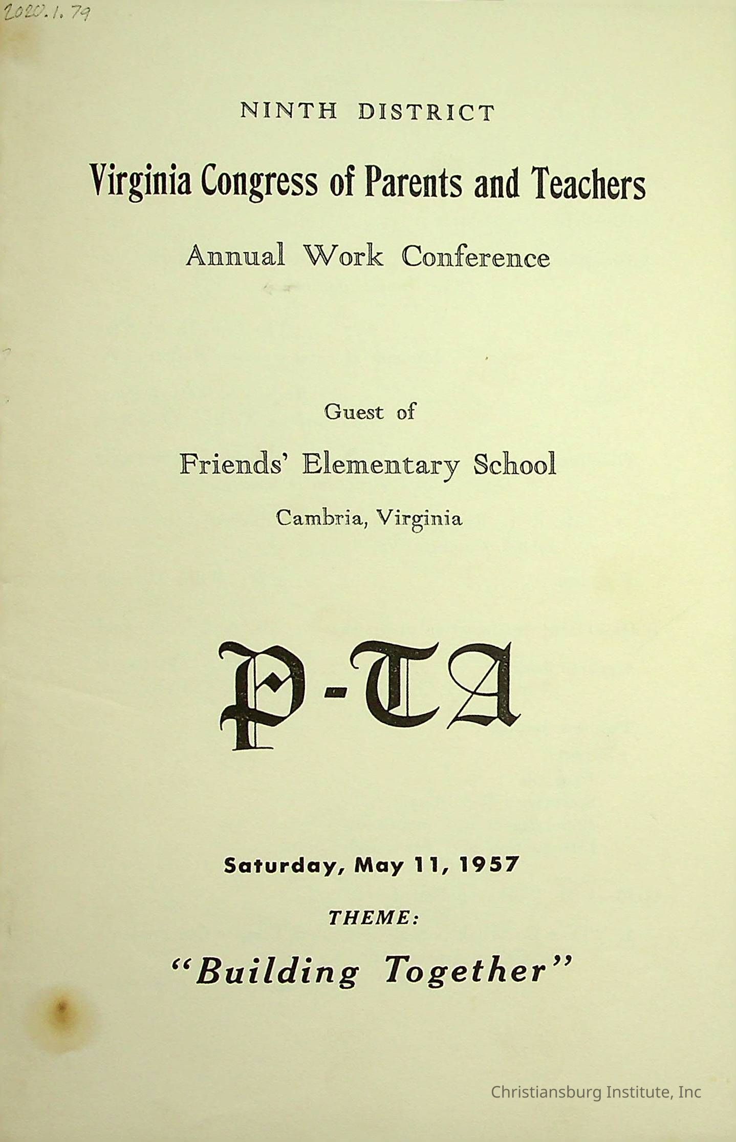 An event program for the Ninth District Virginia Congress of Parents and Teachers Annual Work Conference held at Friends Elementary School in Cambria, Virginia on May 11th, 1957.Creator