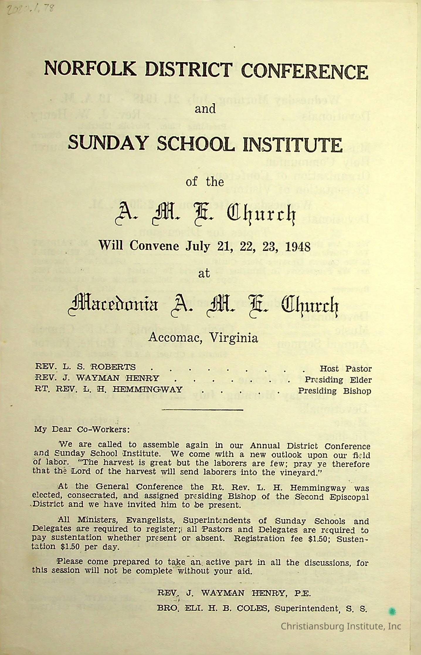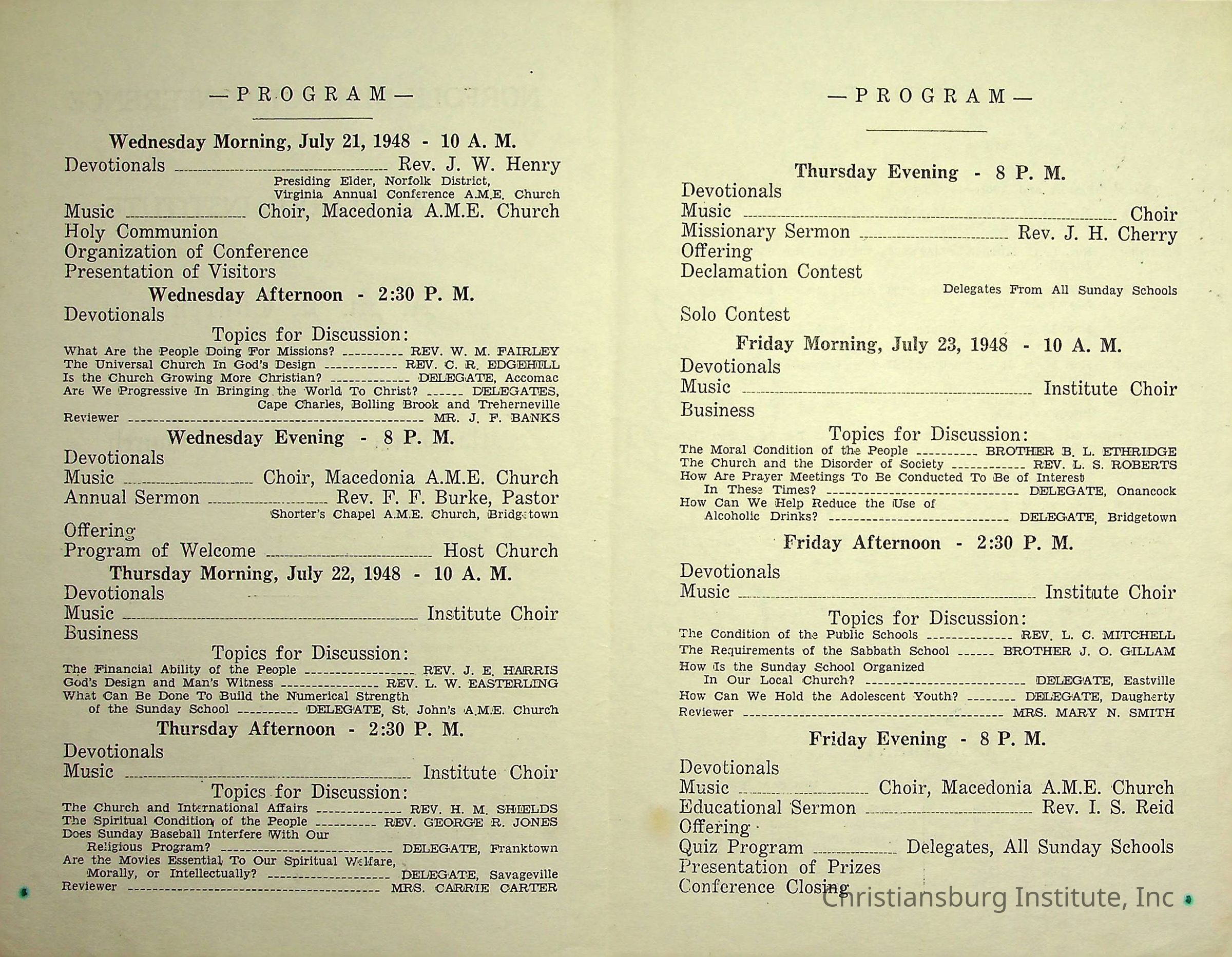 An event program for the Norfolk District Conference and Sunday School Institute of the A.M.E Church in Accomac, Virginia from July 21st through July 23rd 1948.Creator