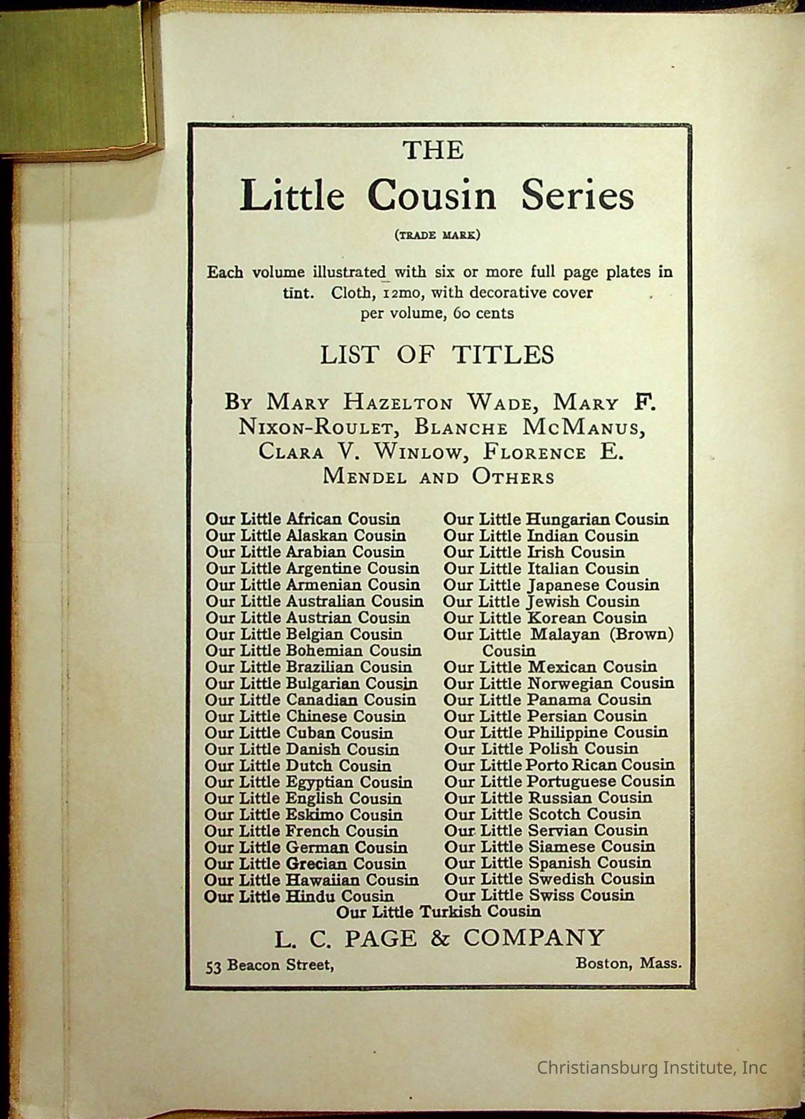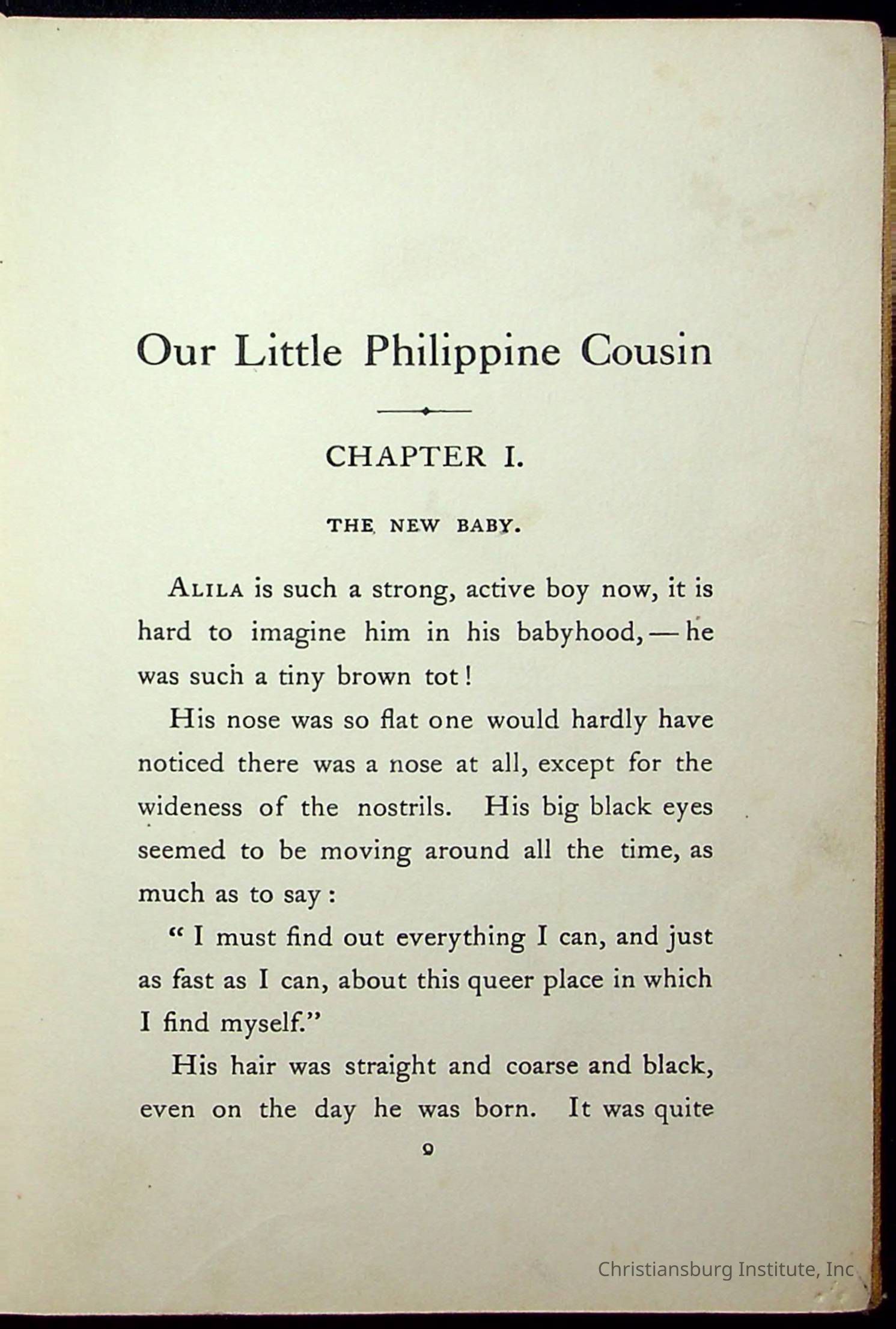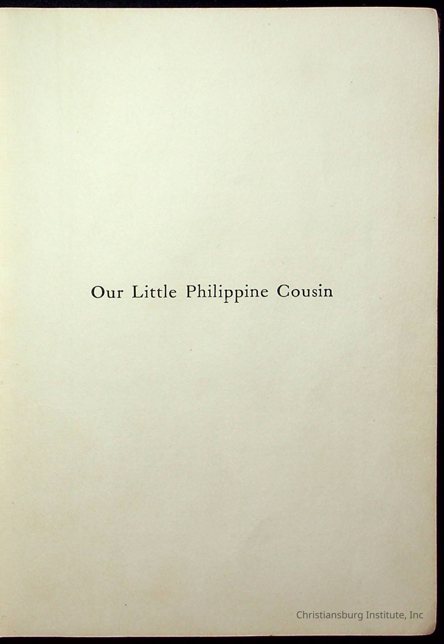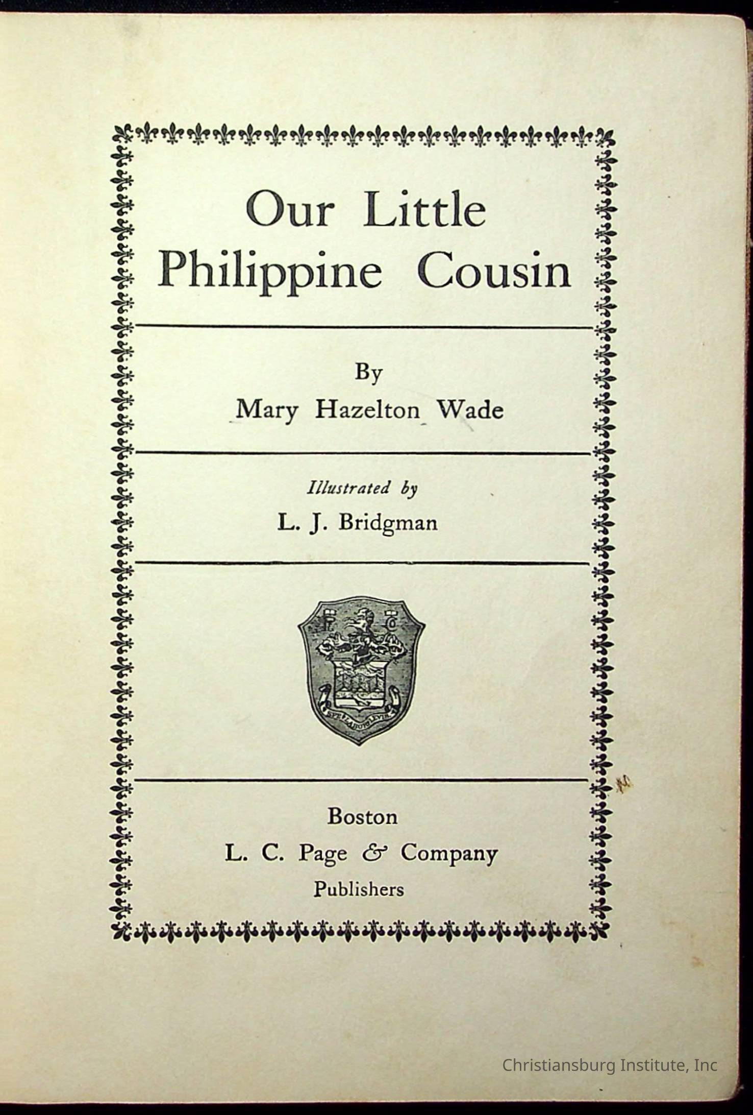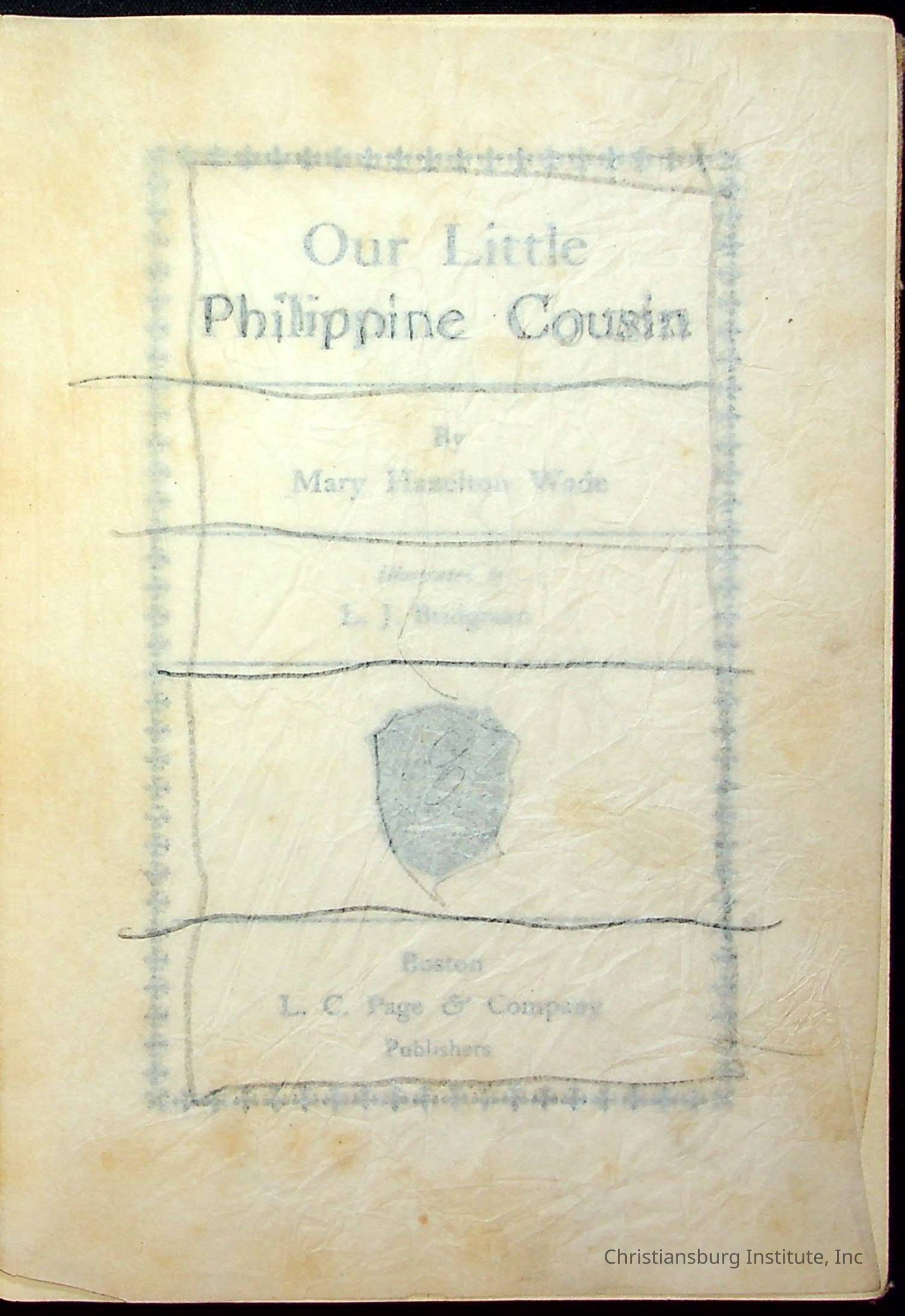 "Our Little Philippine Cousin" written by Mary Hazelton Wade and the 13th edition was published by the L. C. Page & Company in the year 1913. This book was part of Friends Elementary School's library.