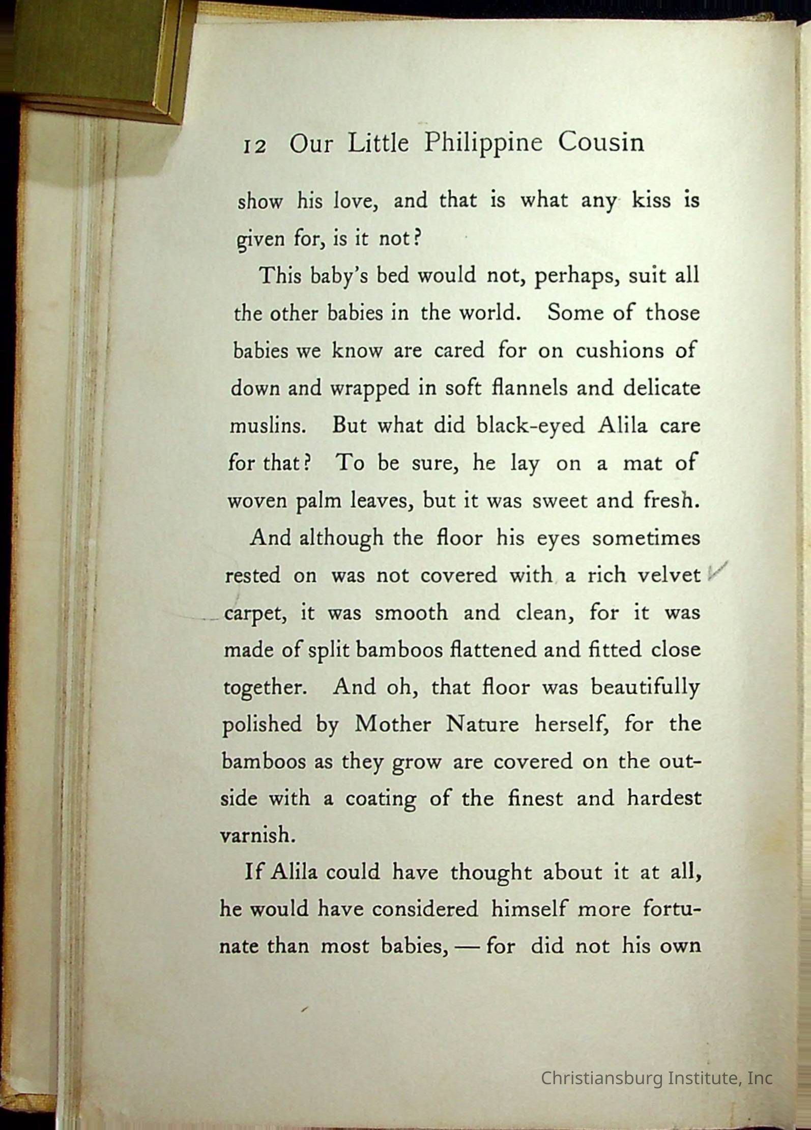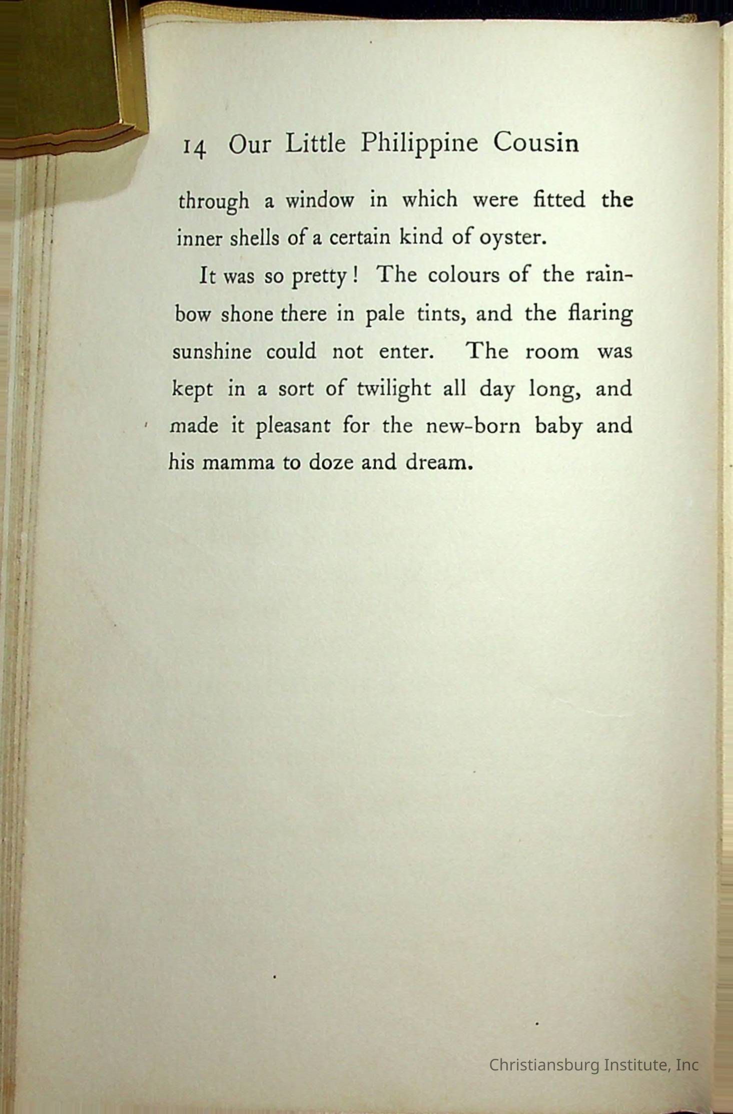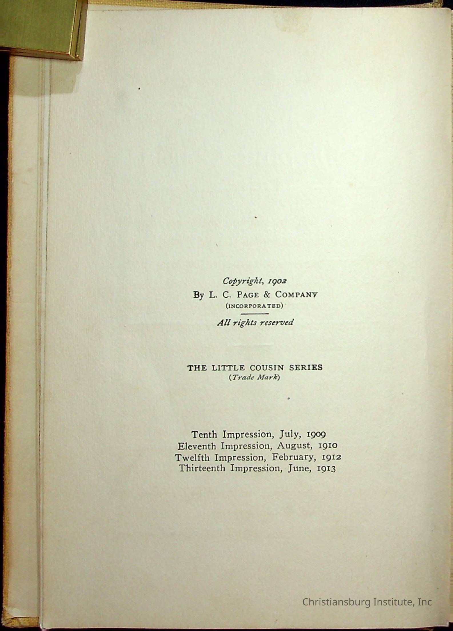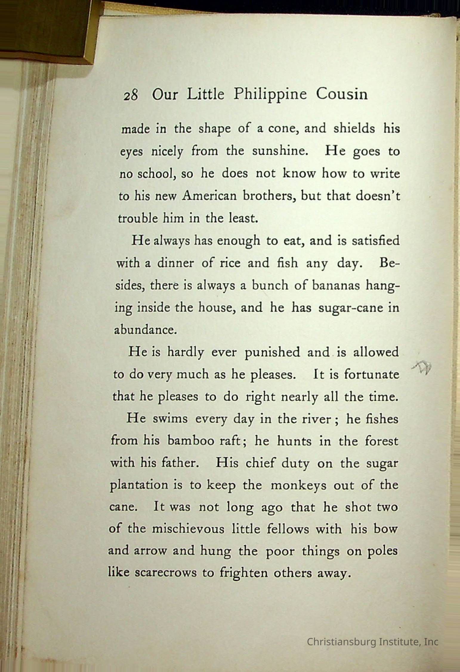 "Our Little Philippine Cousin" written by Mary Hazelton Wade and the 13th edition was published by the L. C. Page & Company in the year 1913. This book was part of Friends Elementary School's library.
