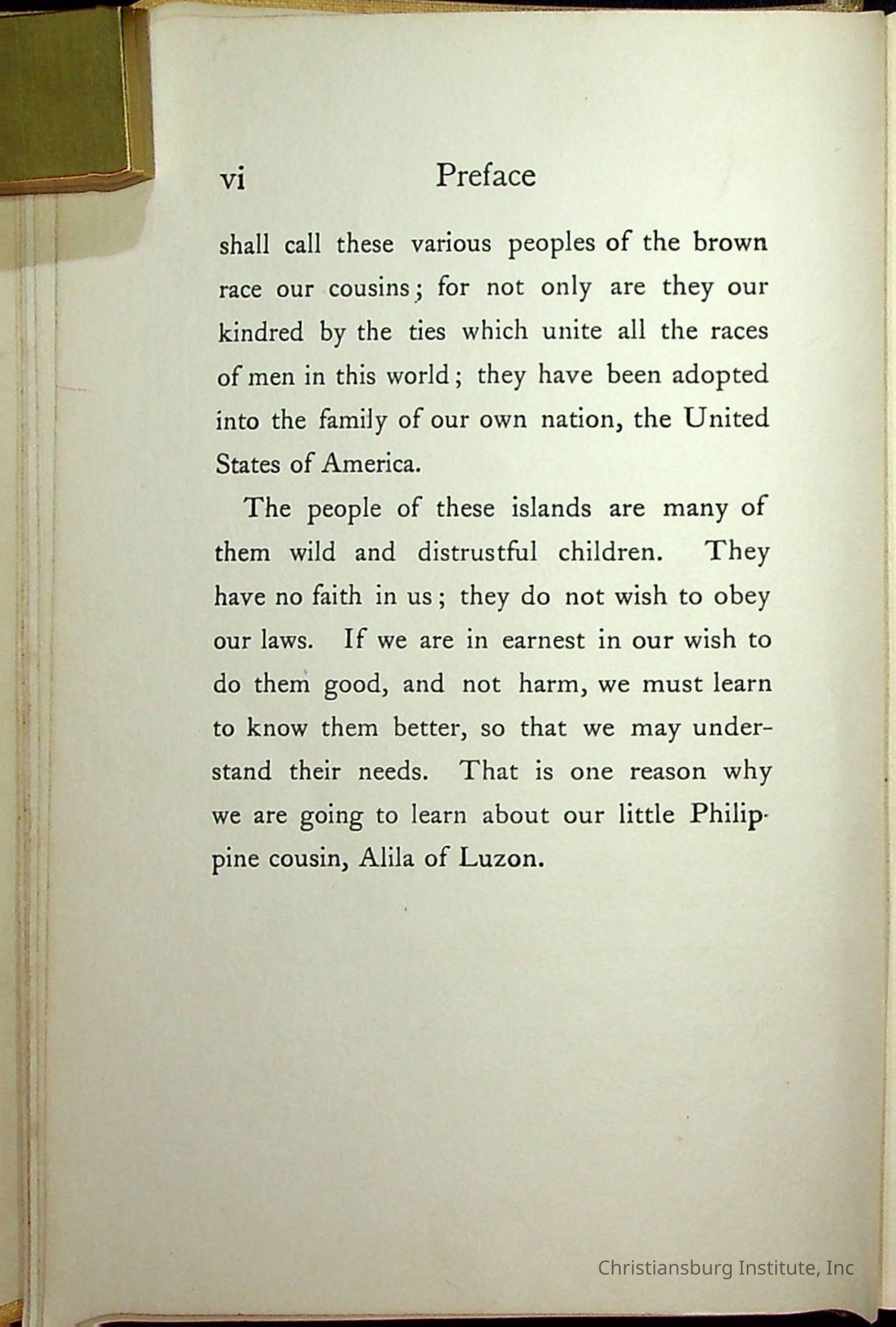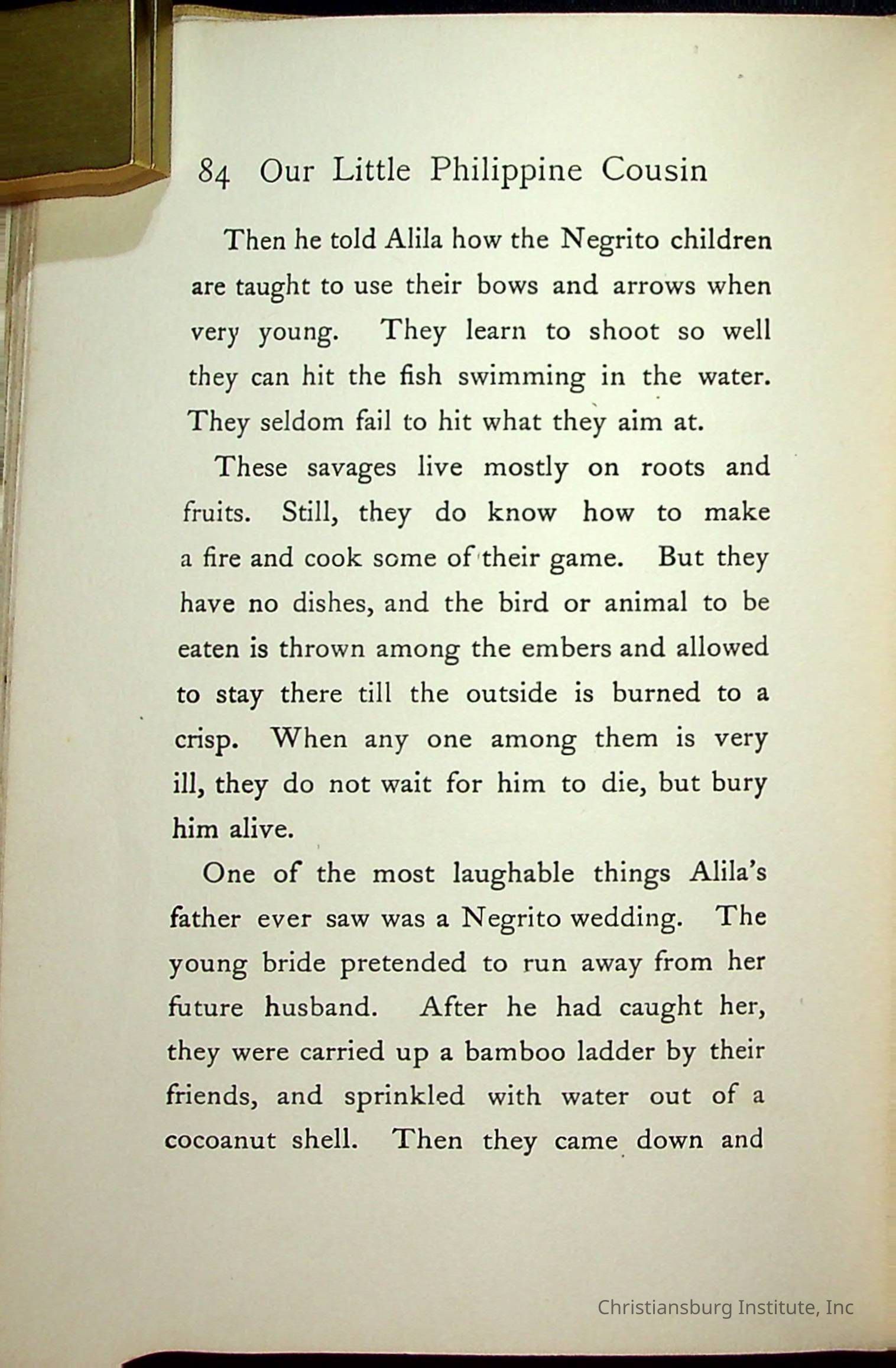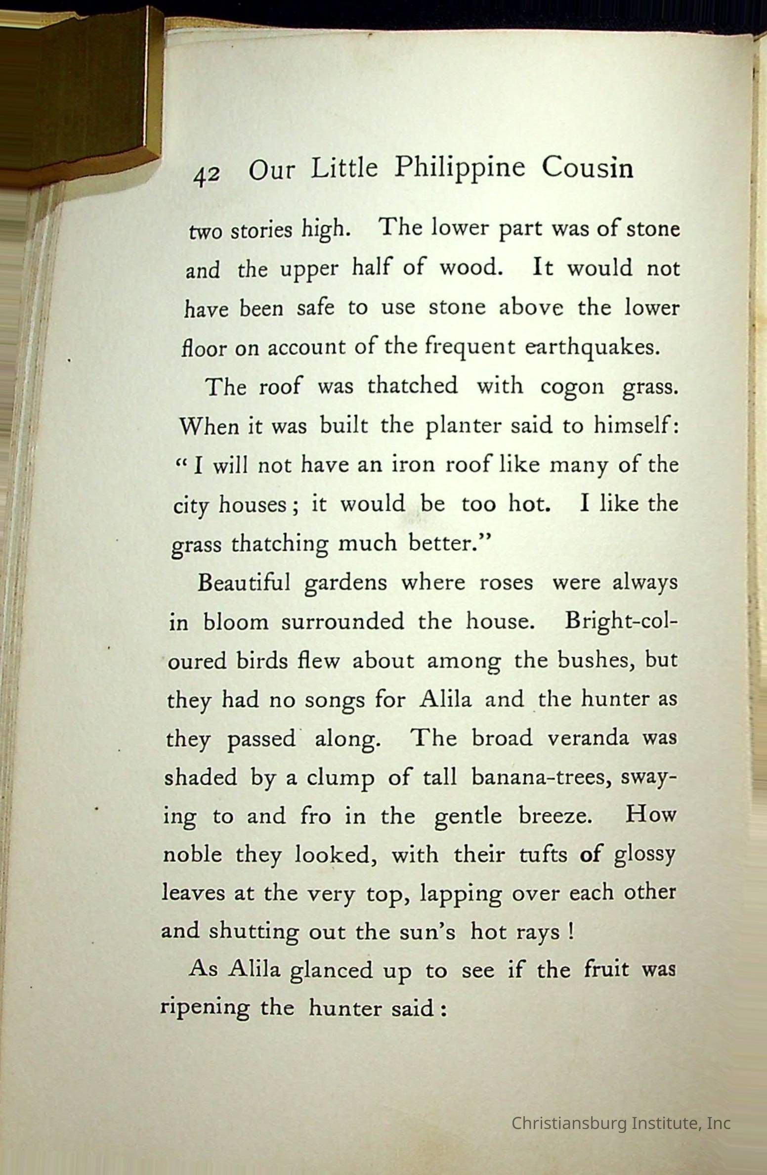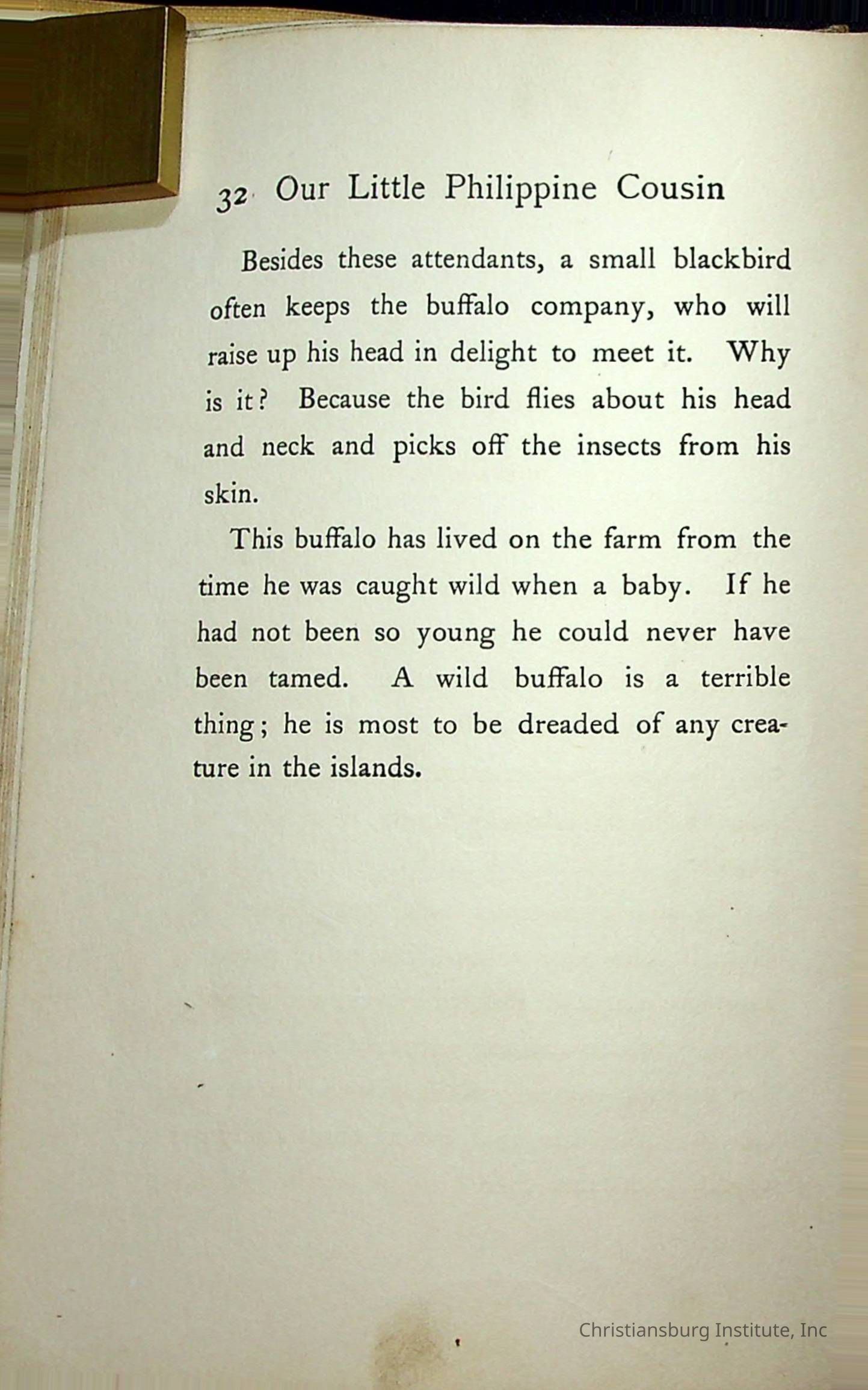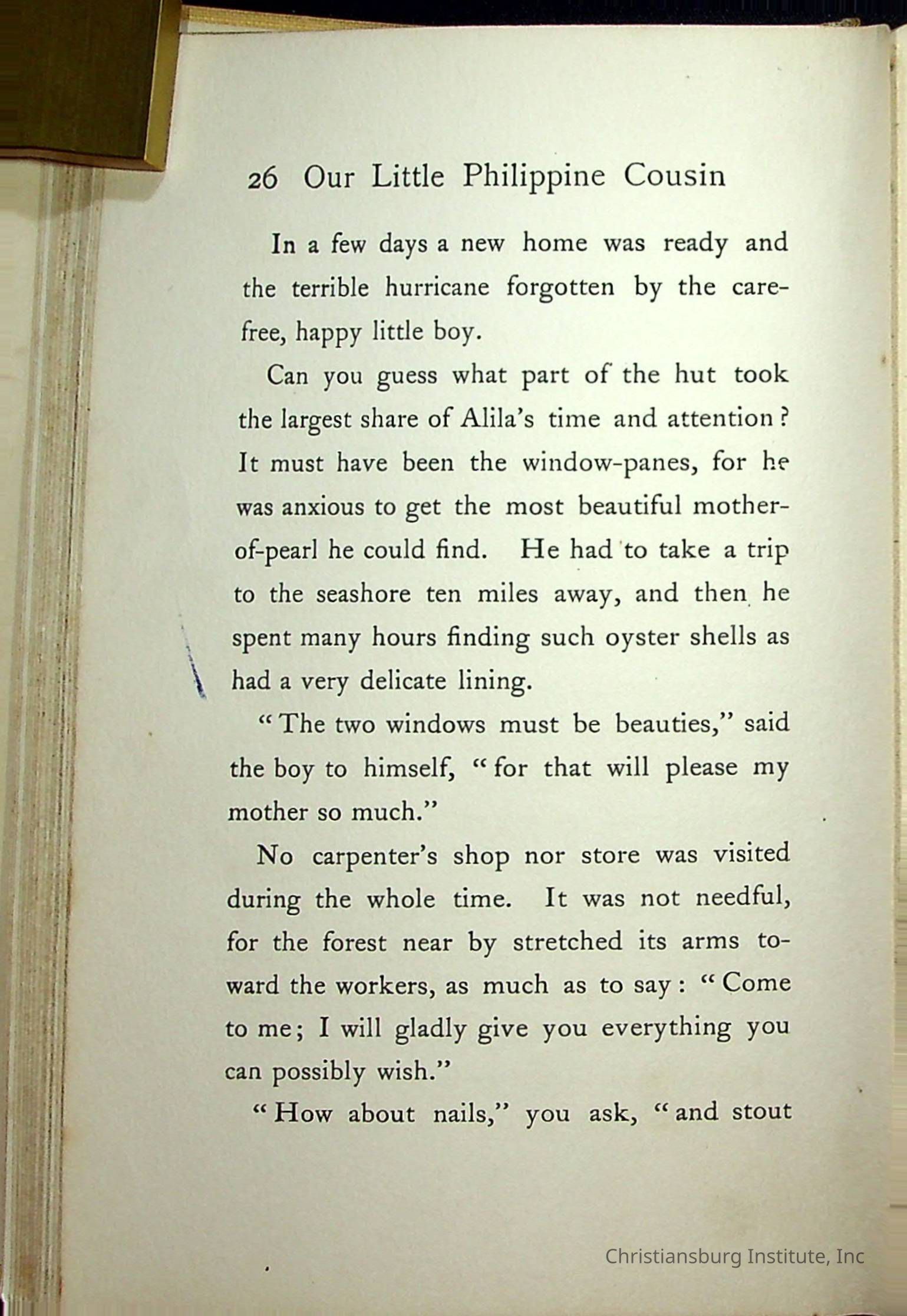 "Our Little Philippine Cousin" written by Mary Hazelton Wade and the 13th edition was published by the L. C. Page & Company in the year 1913. This book was part of Friends Elementary School's library.