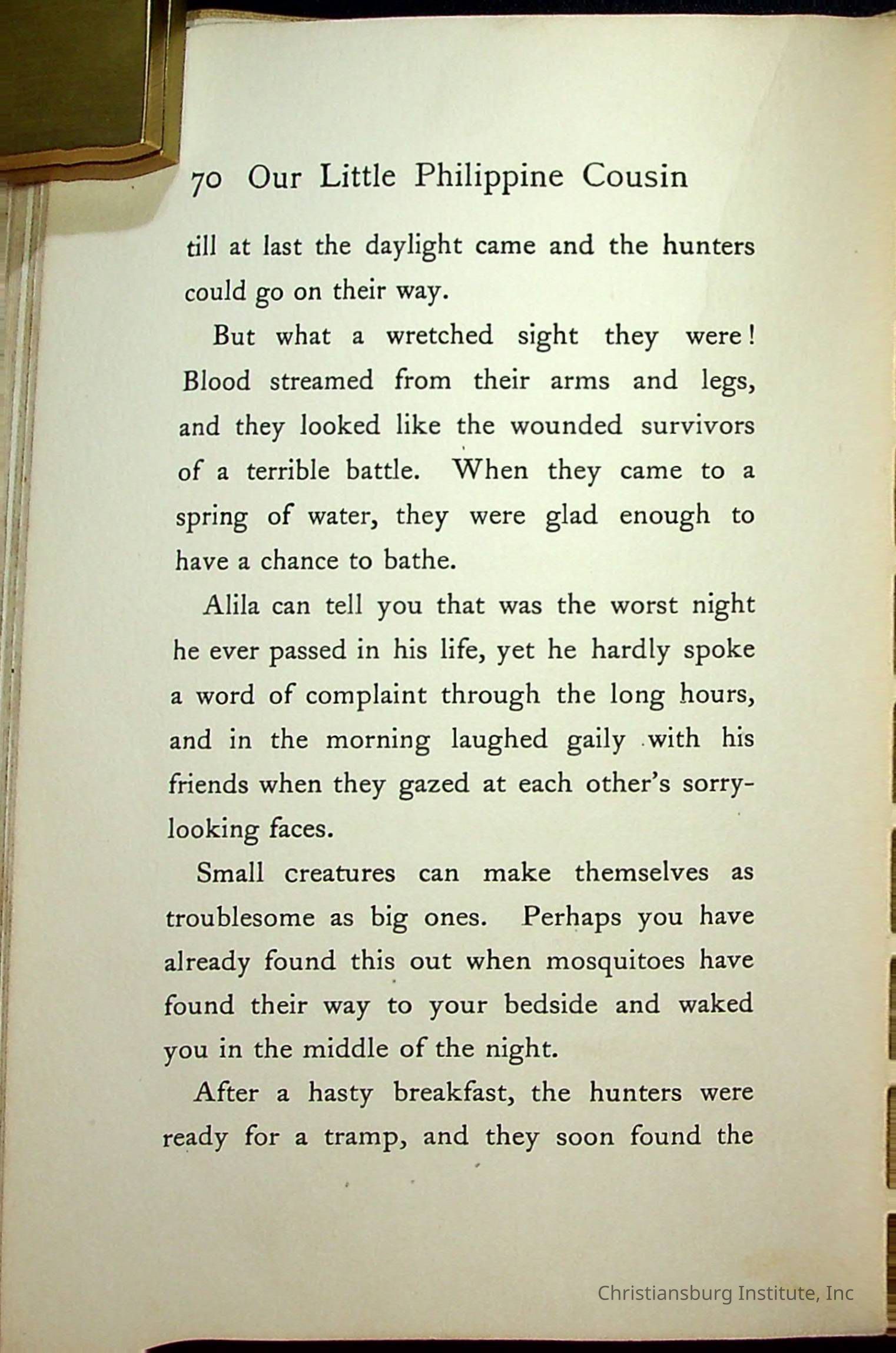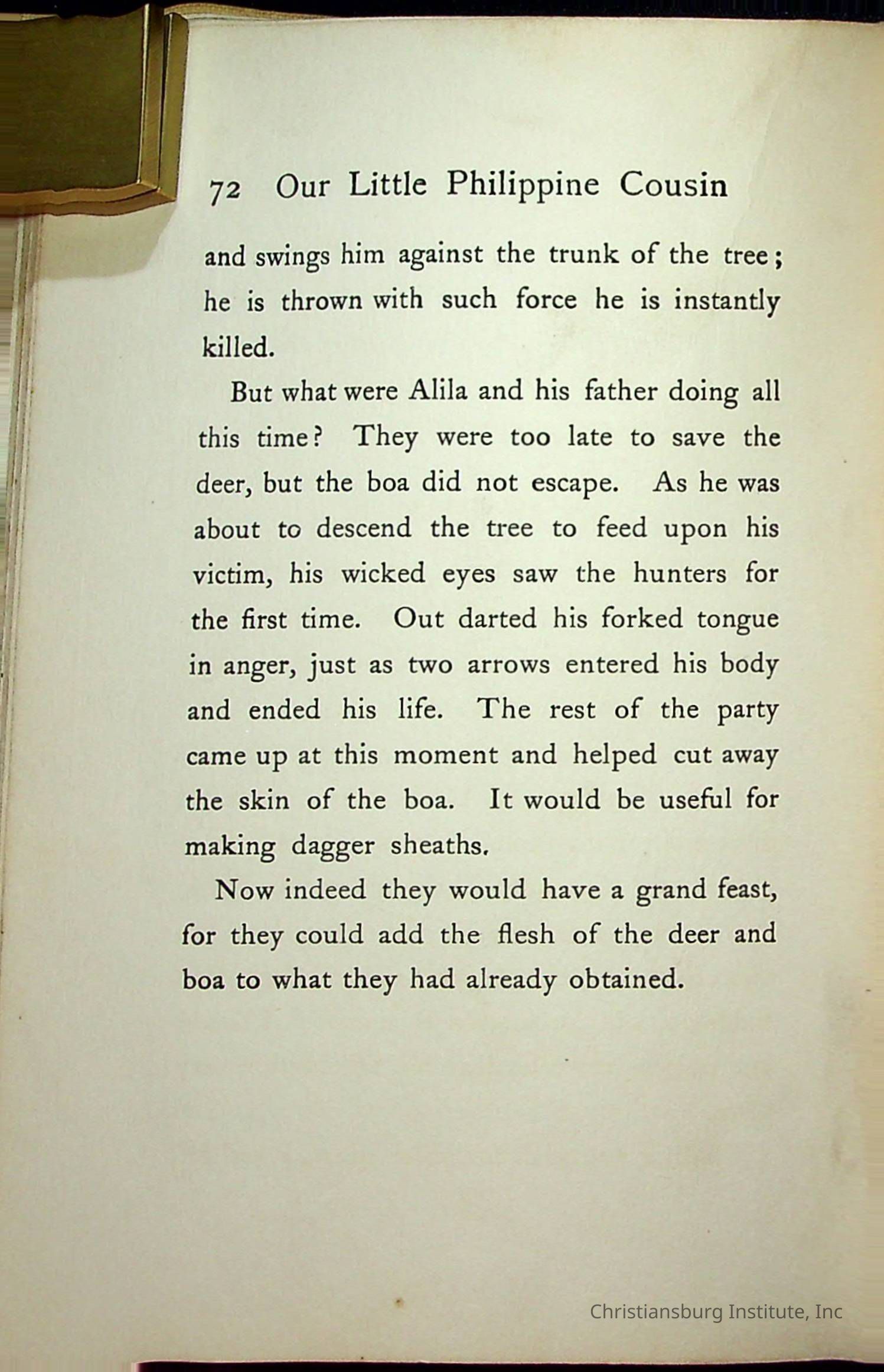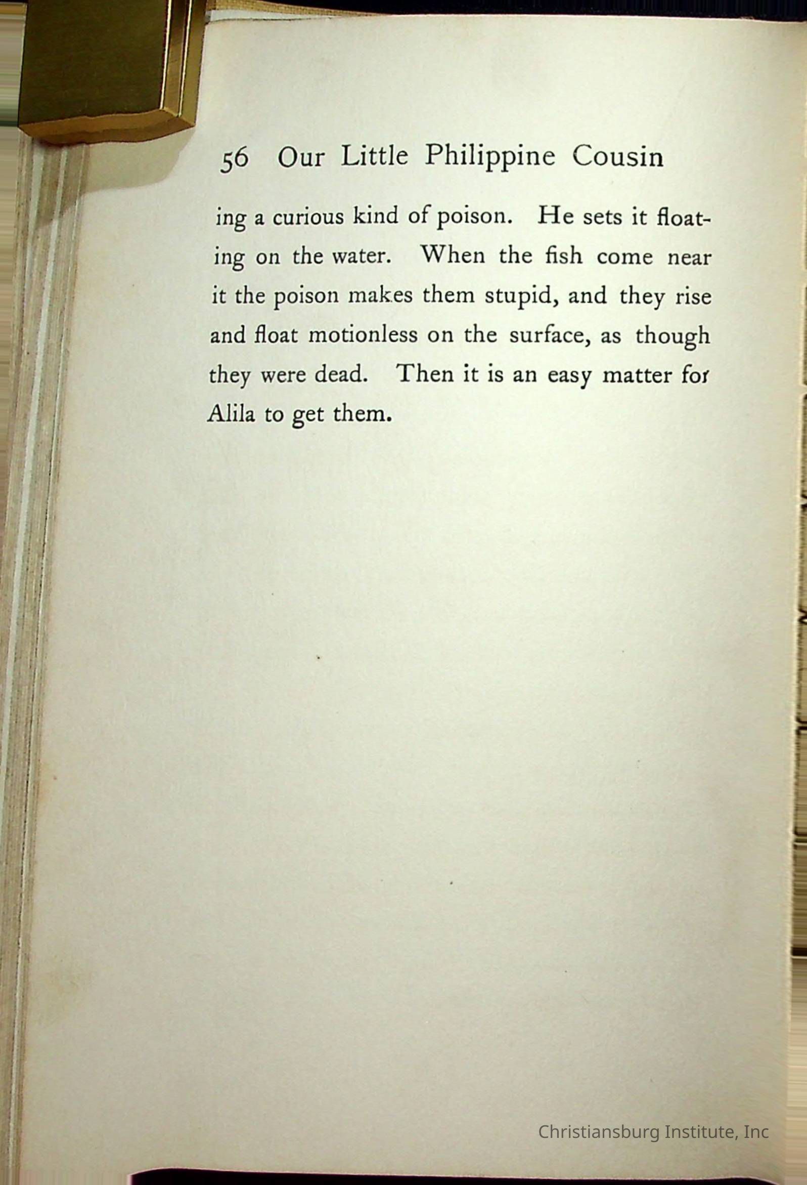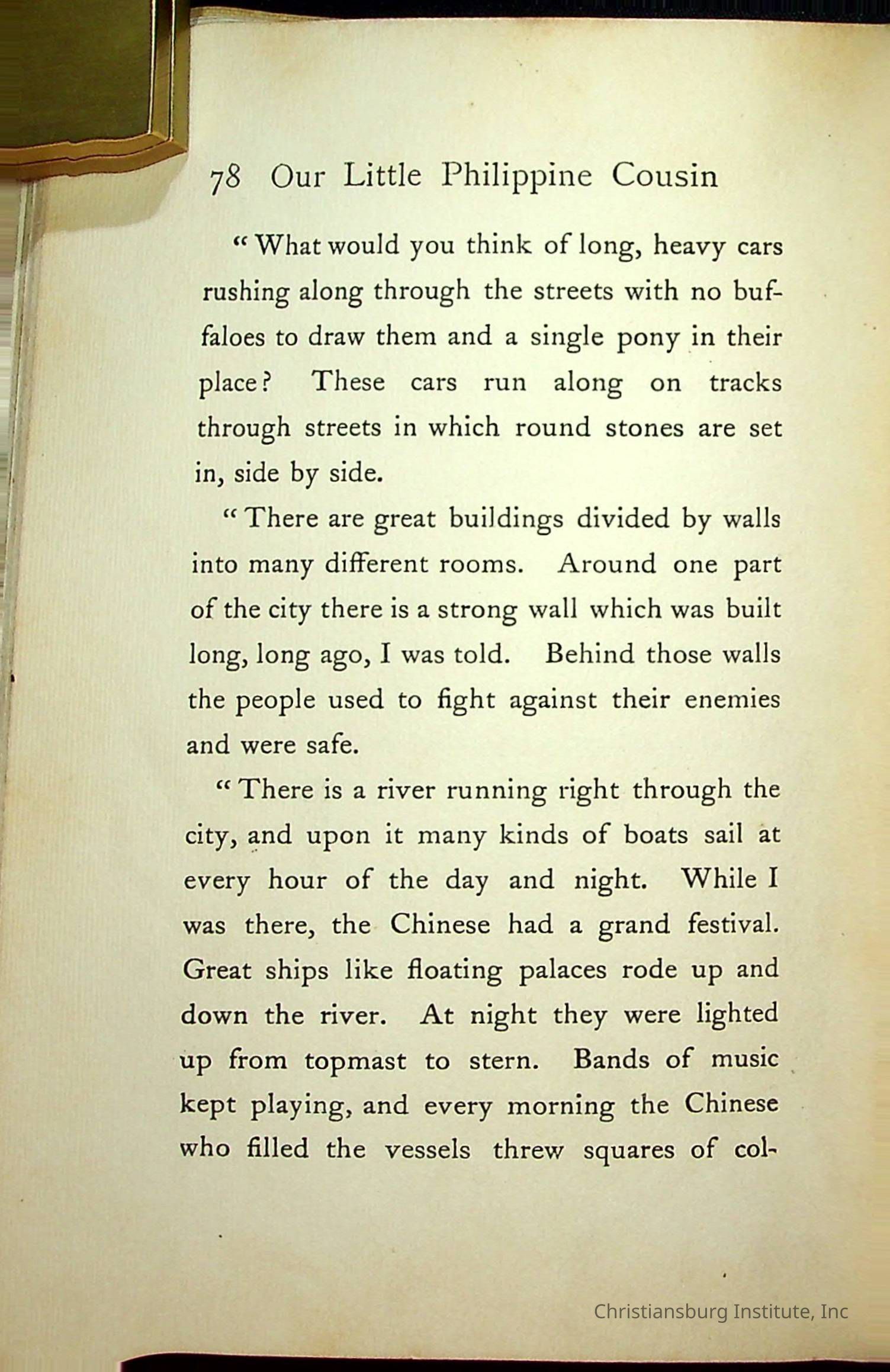 "Our Little Philippine Cousin" written by Mary Hazelton Wade and the 13th edition was published by the L. C. Page & Company in the year 1913. This book was part of Friends Elementary School's library.