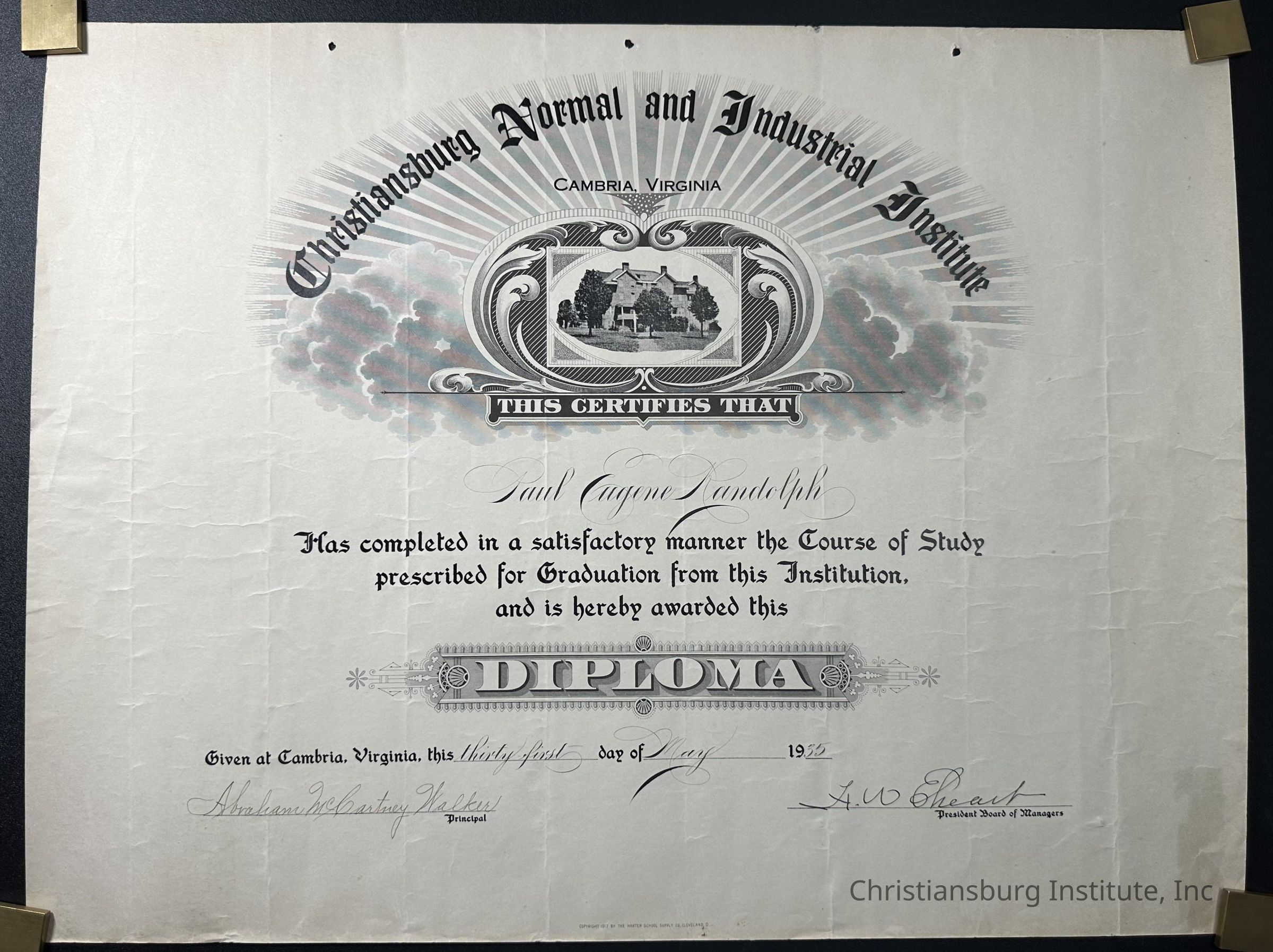 A high school diploma issued to Paul Eugene Randolph on May 31st, 1935 for completing their course of study at Christiansburg Normal and Industrial Institute.Collection