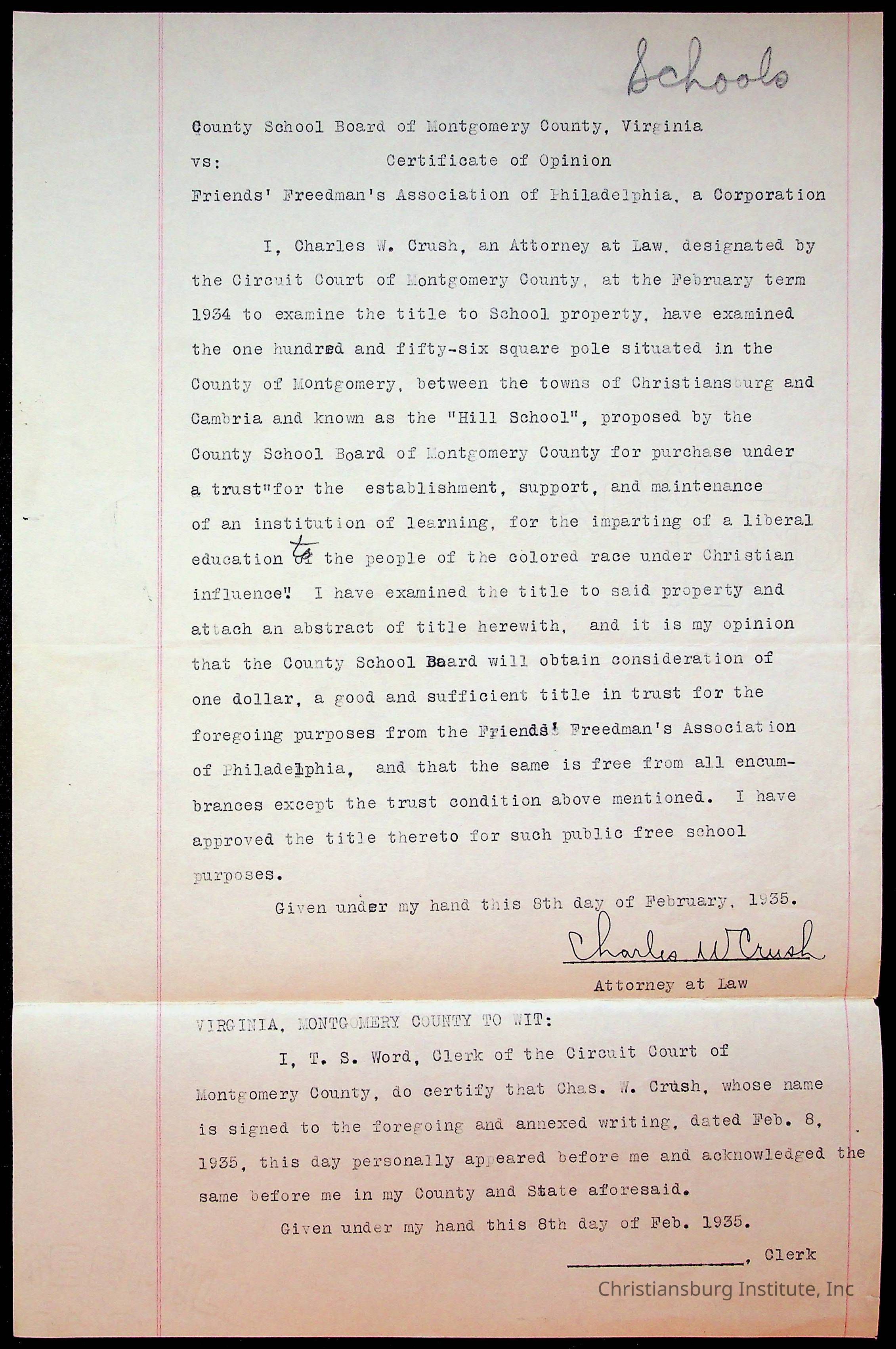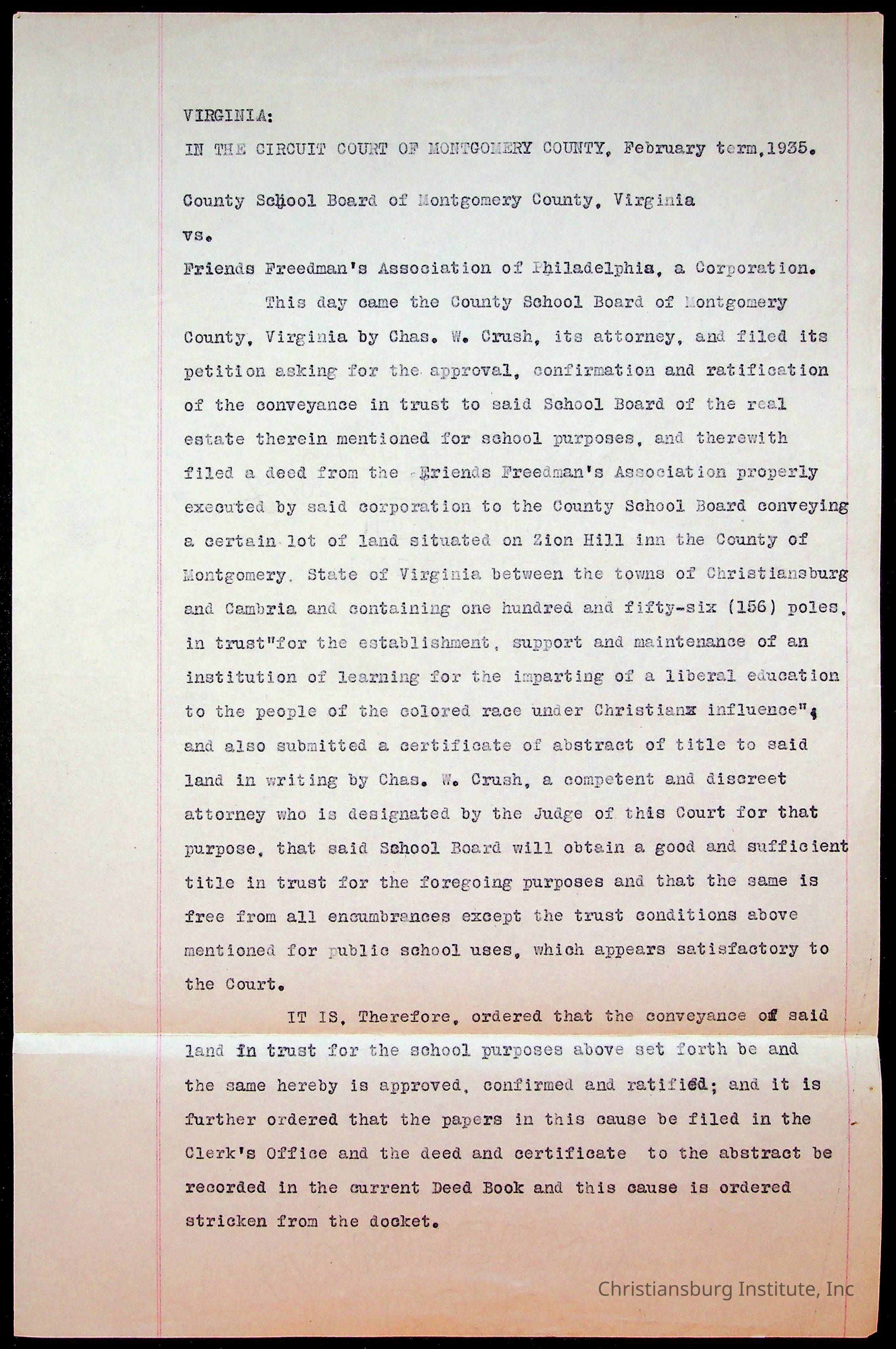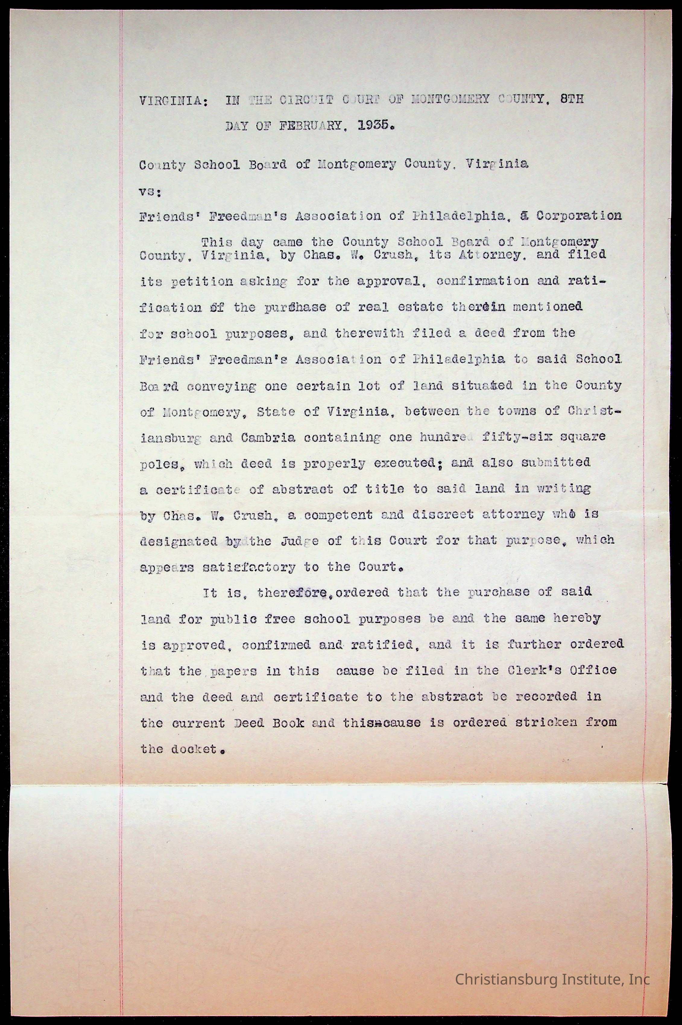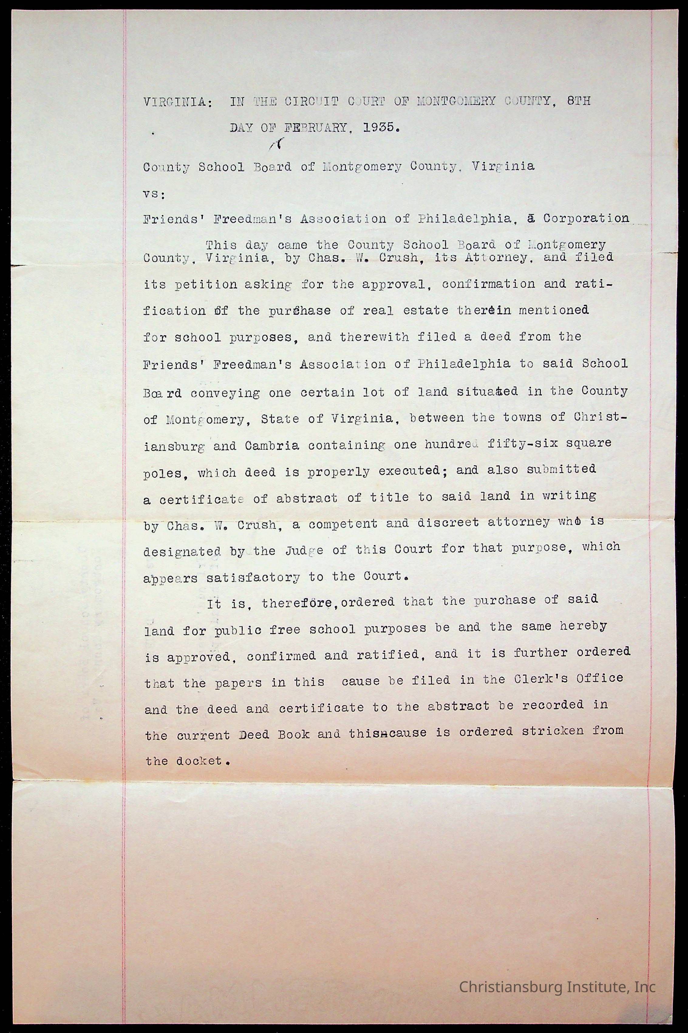 The petition for the Montgomery County School Board to take over control of Christiansburg Industrial Institute from the Friends' Freedmen's Association, dated 1935.