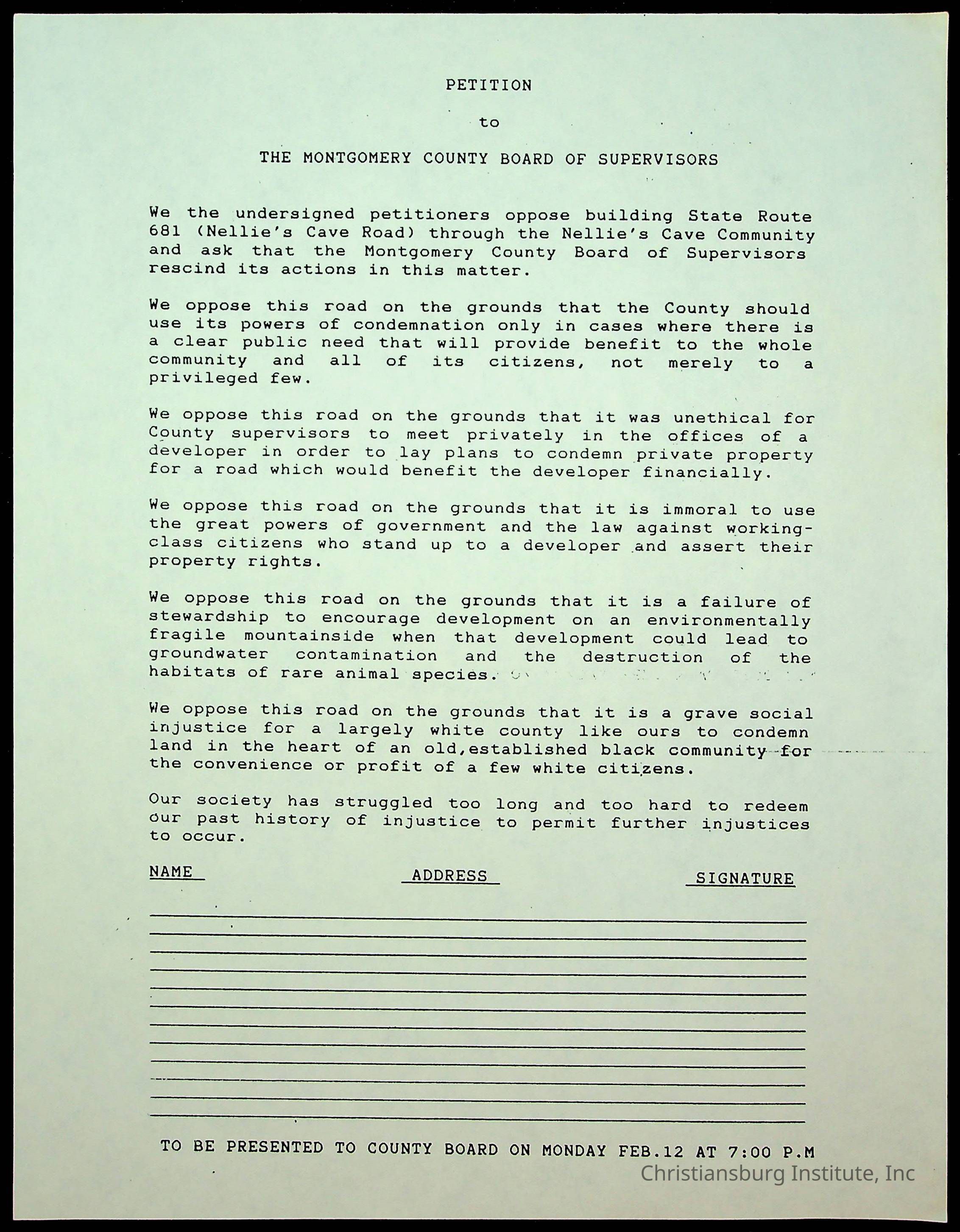 Petition to Board of Supervisors for Feb 12 Meeting