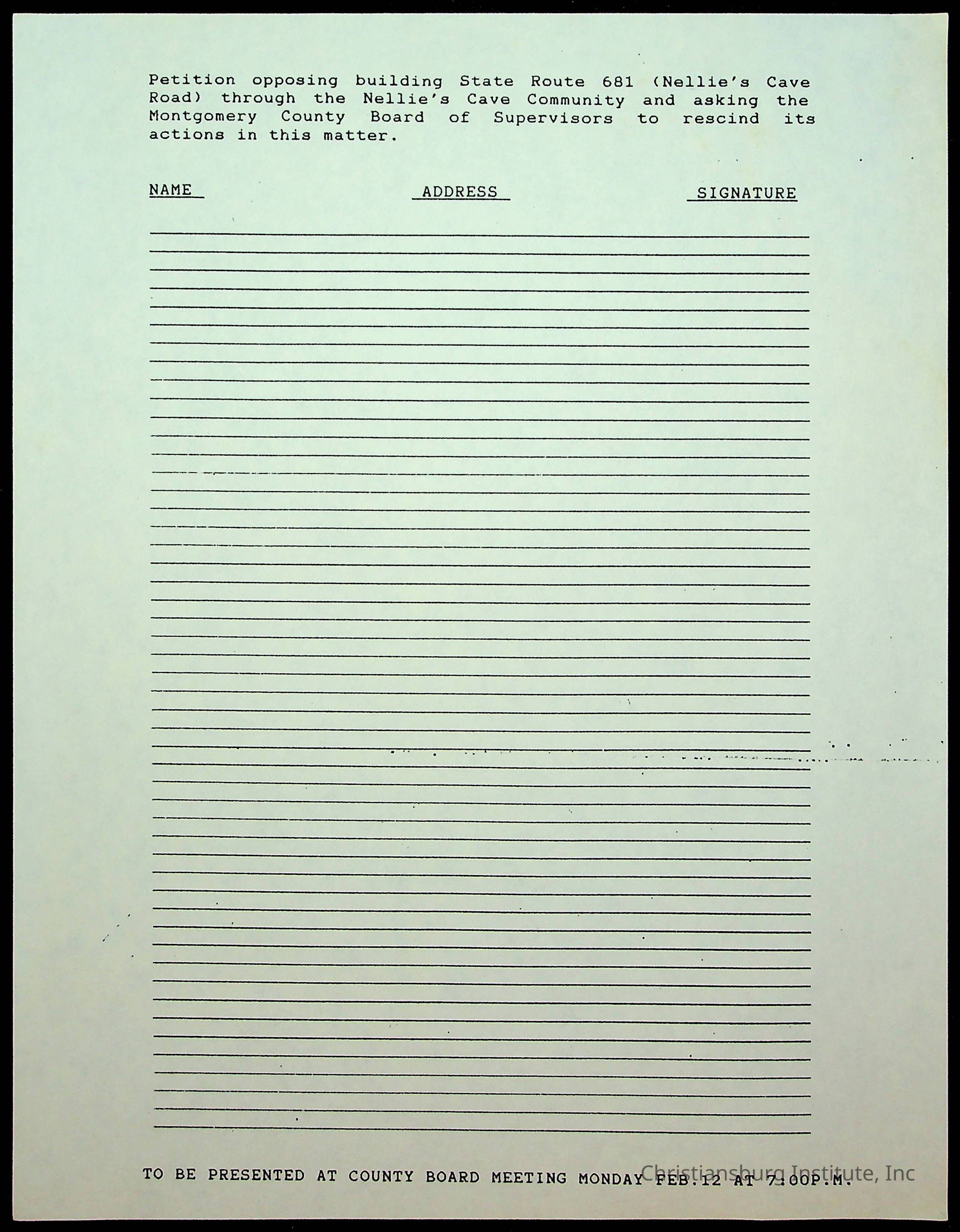 A petition opposing building State Route 681 through Nellies Cave Community to be presented at a county board meeting.