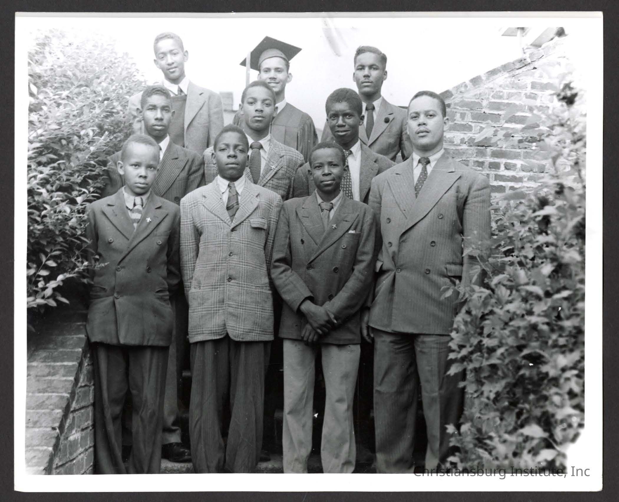 A photograph of unknown male Christiansburg Institute students and graduates posed on stairs, dated 1945.