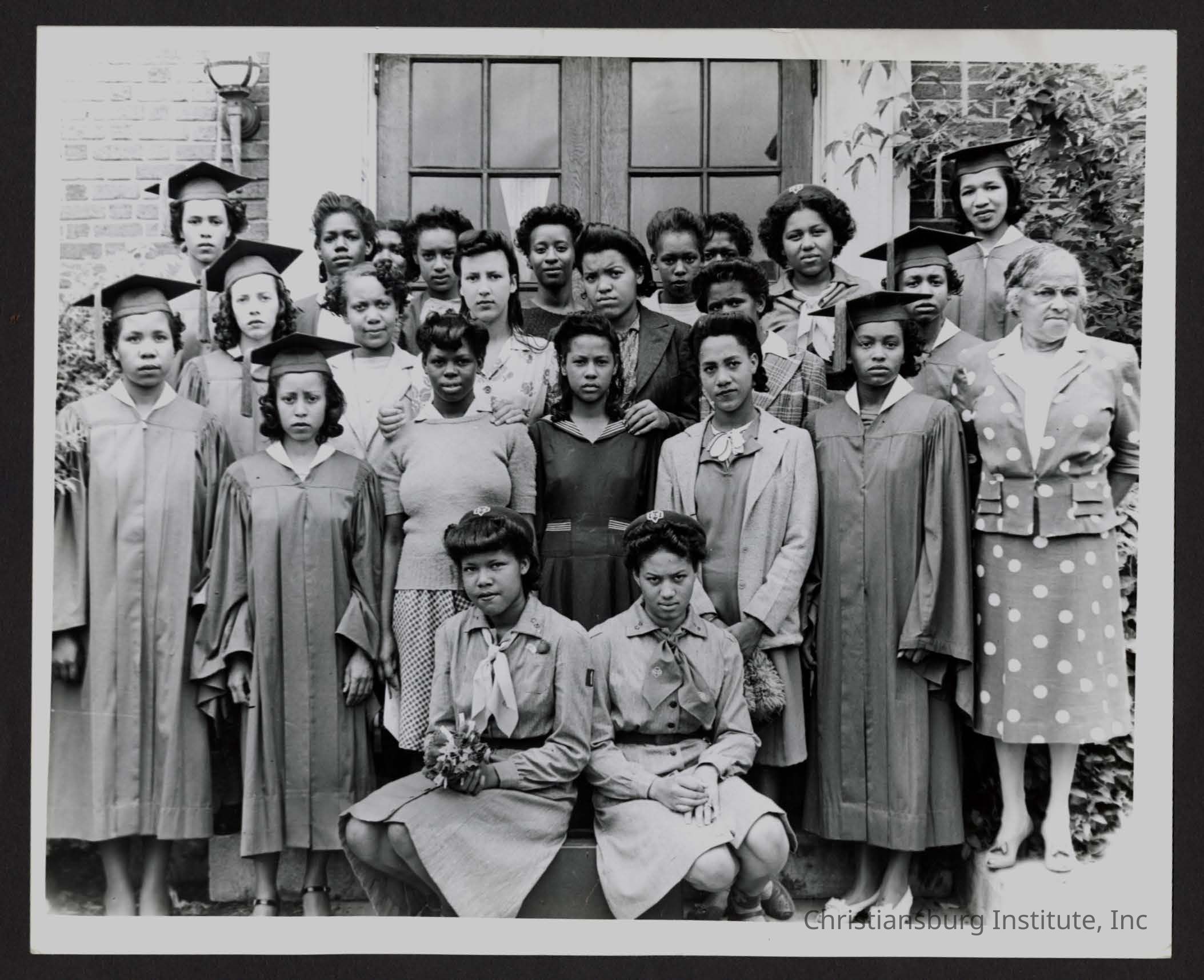 A photograph of unknown female Christiansburg Institute students and graduates posed with Anna Long, dated 1940.