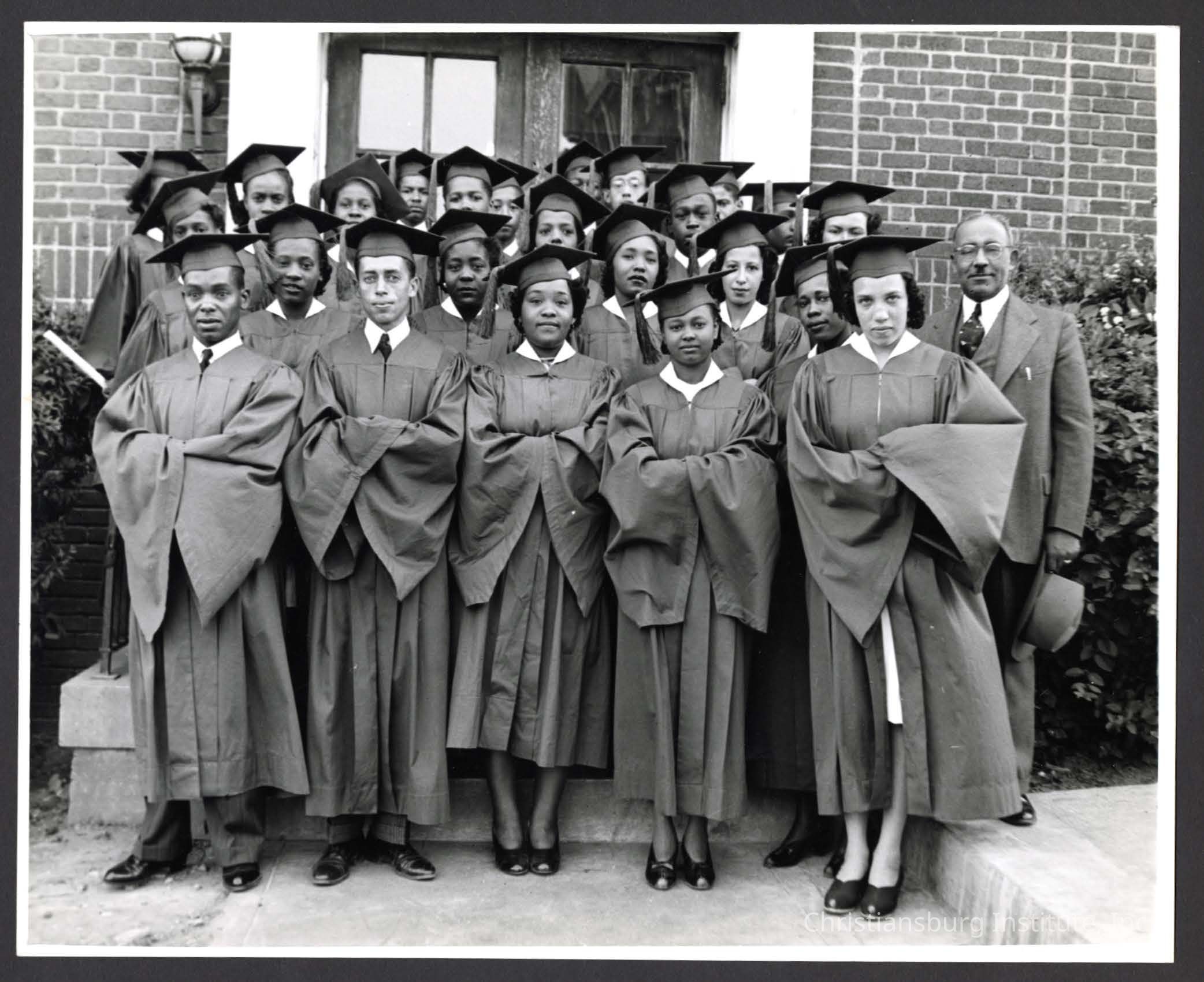 A photograph of the Christiansburg Institute graduating class of 1945 posed with principal, Abraham Walker dated 1945.