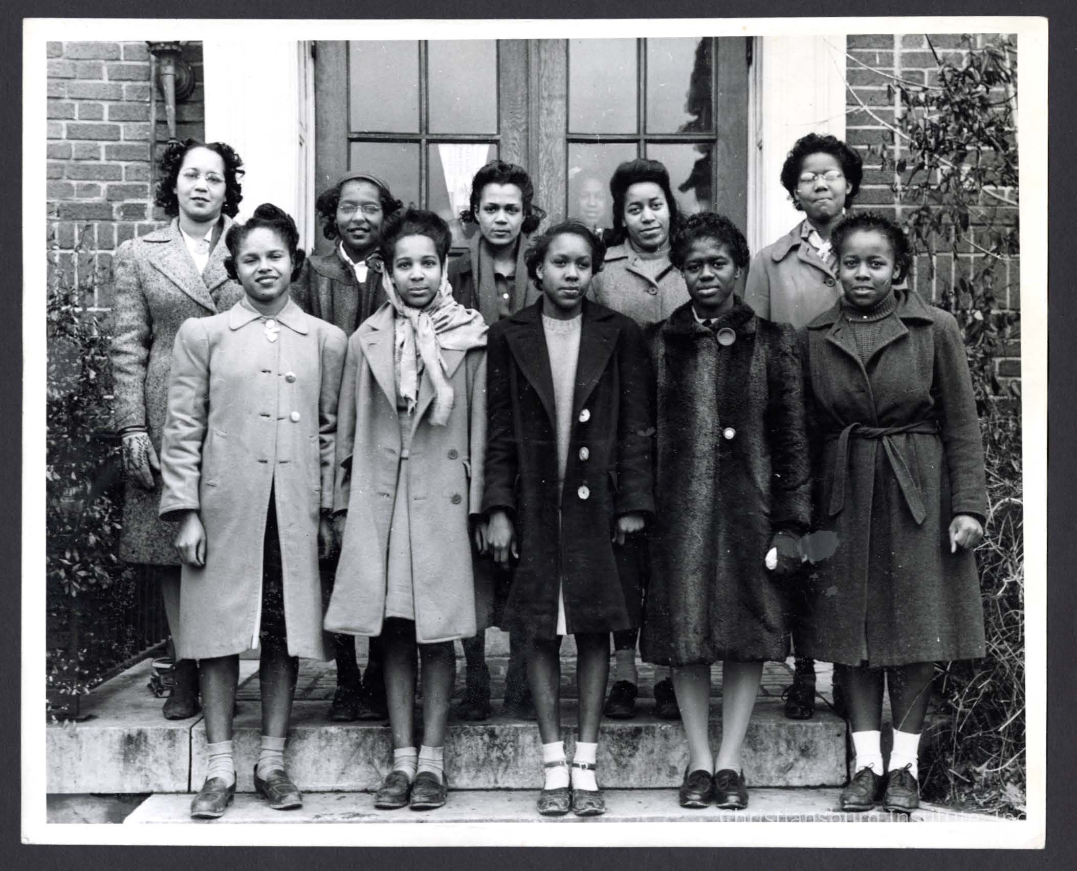 A photograph of several women posed in front of a set of double doors on the Christiansburg Institute campus, dated 1940.