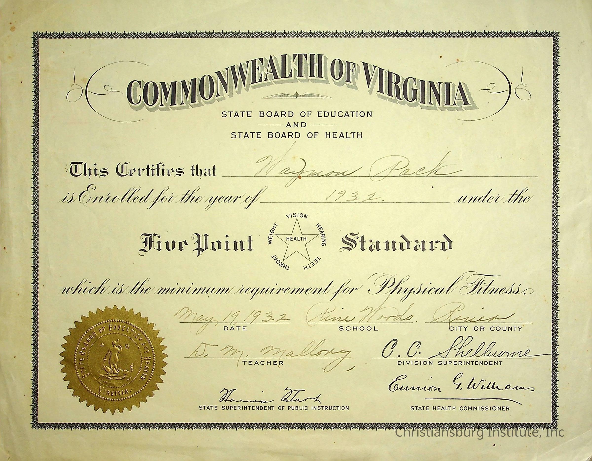 A five point standard certificate issued to Waymon Pack on May 19th, 1932 from Pine Woods Elementary School.Creator