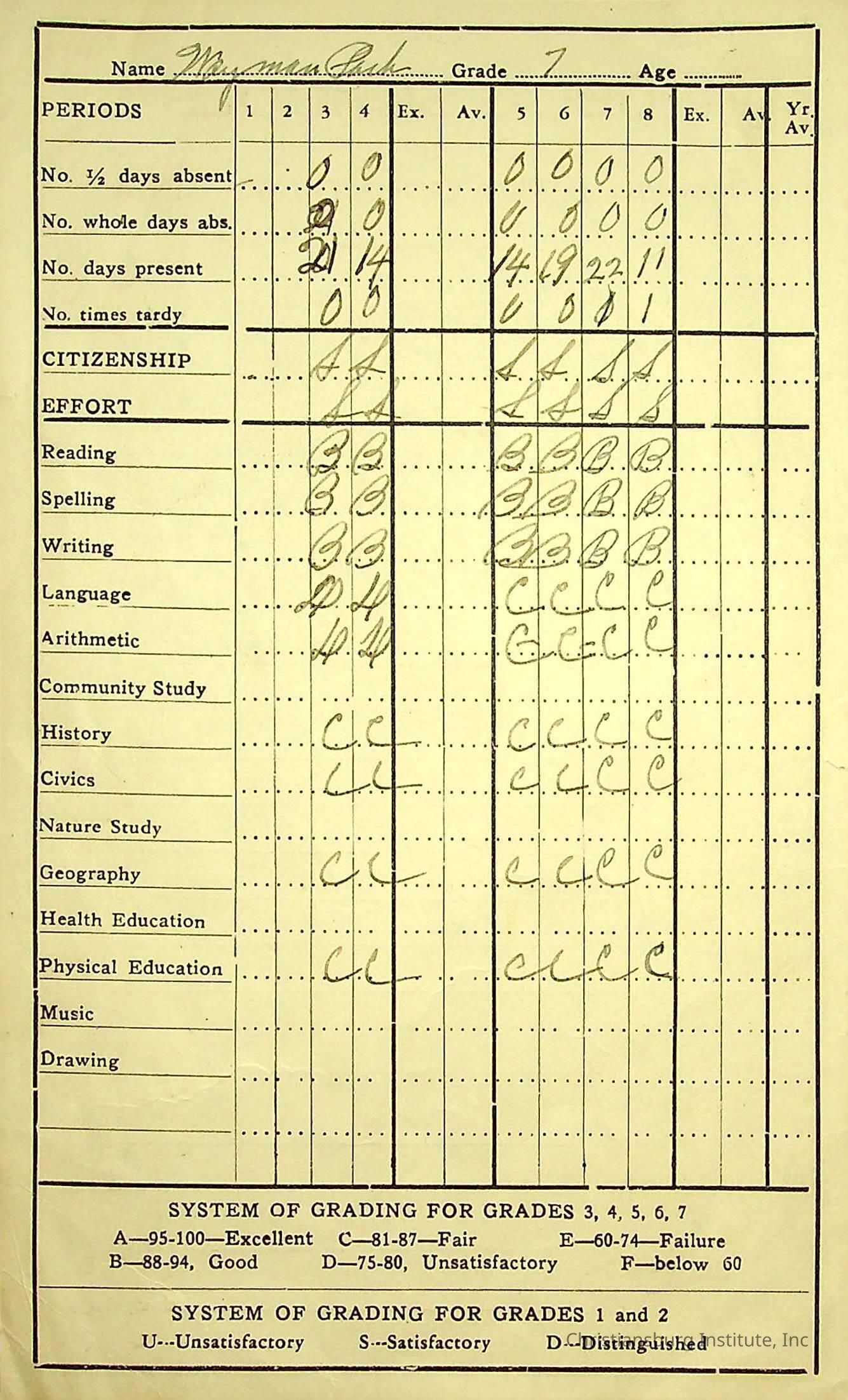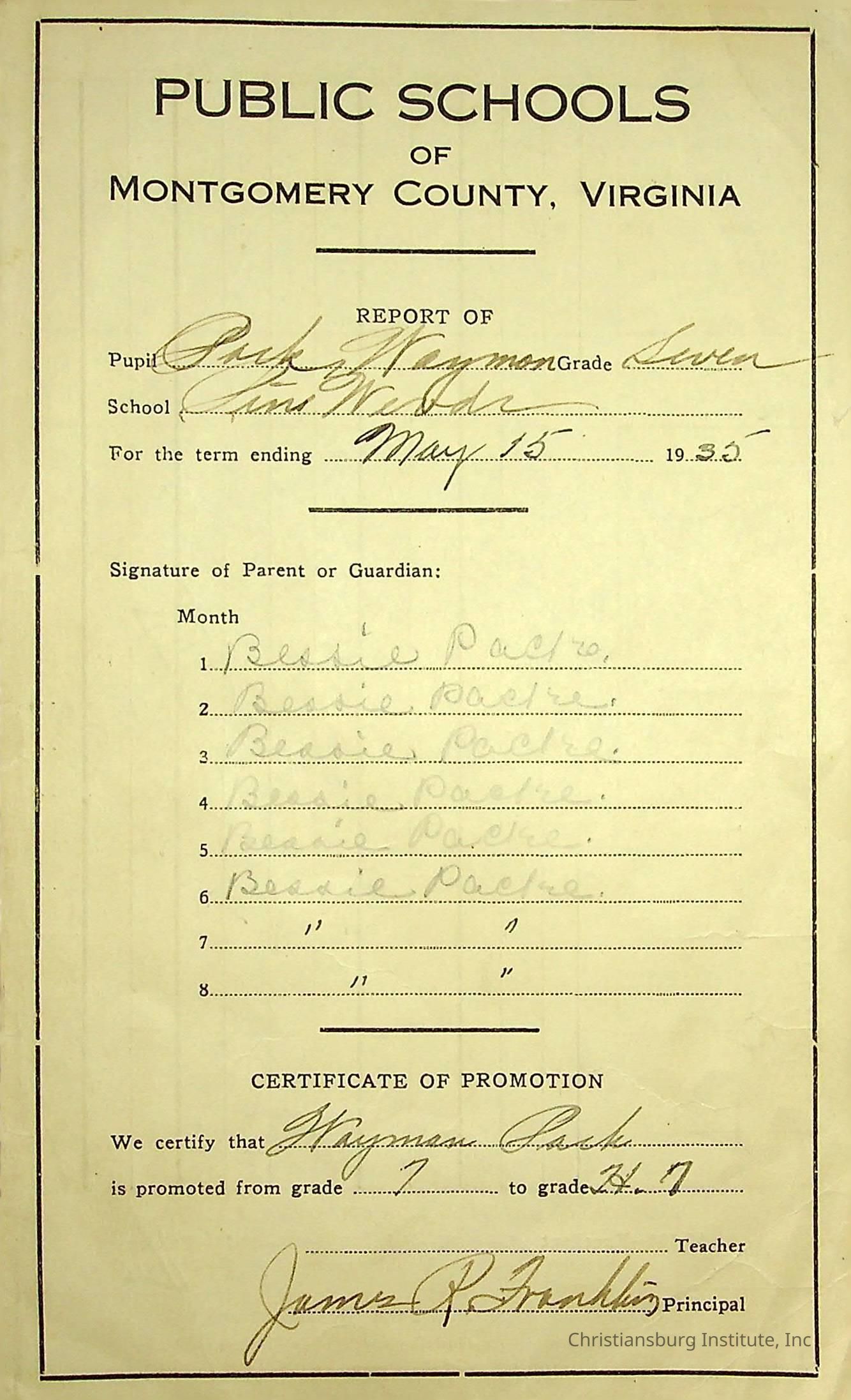 Pine[y] Woods, Report Card, 1935 Waymon Pack