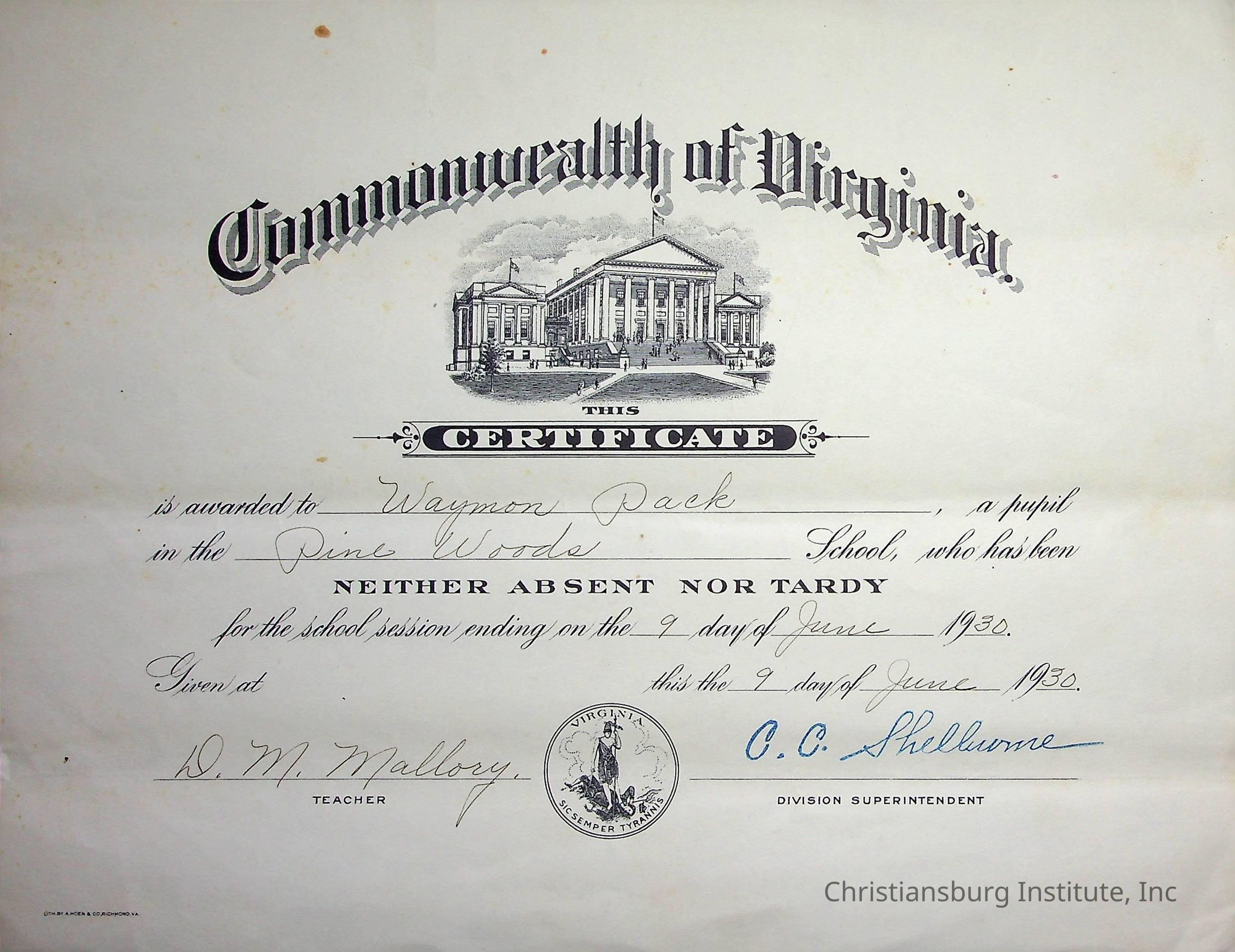 A perfect attendance certificate issued to Waymon Pack on June 9th, 1930 from Pine Woods Elementary School.Creator