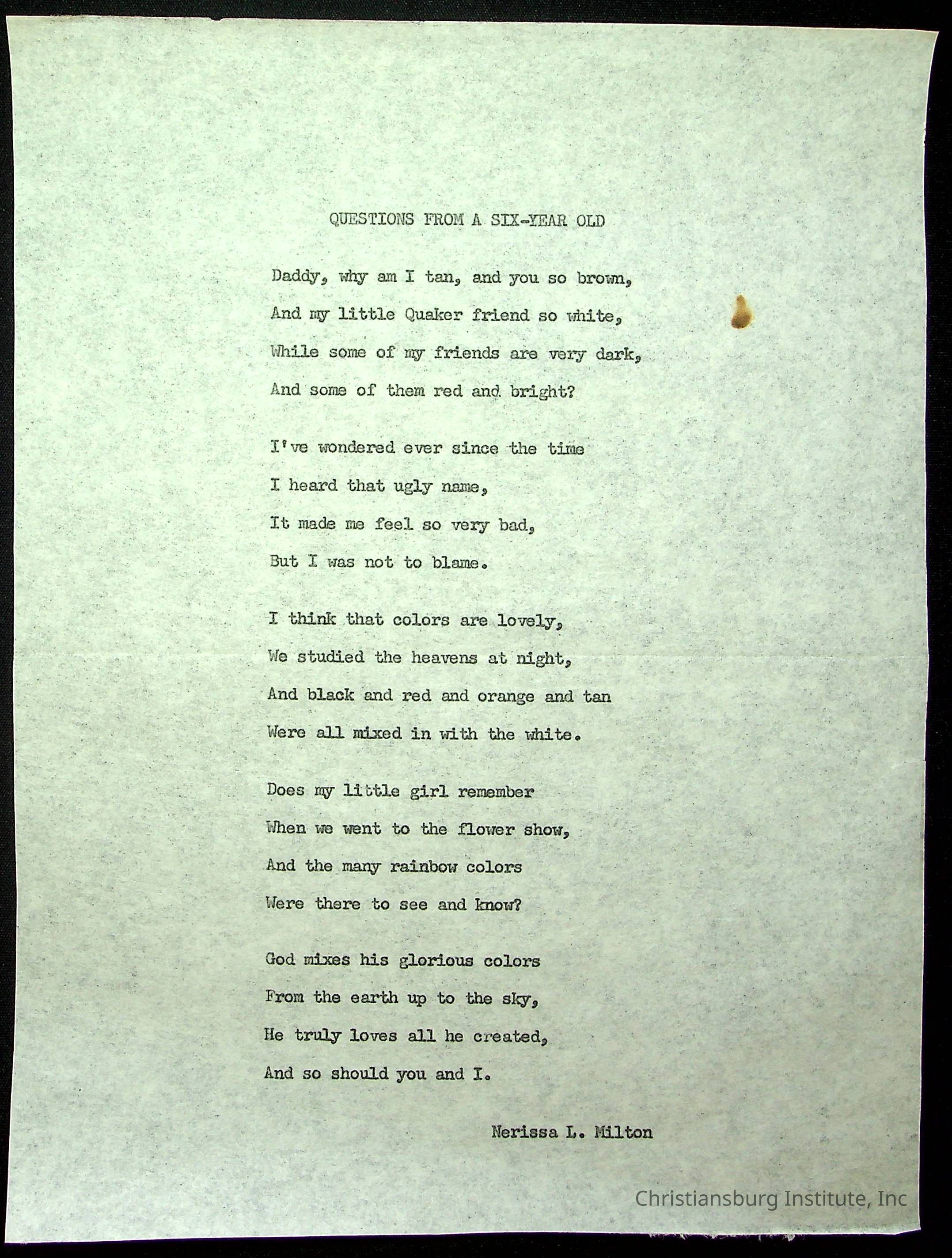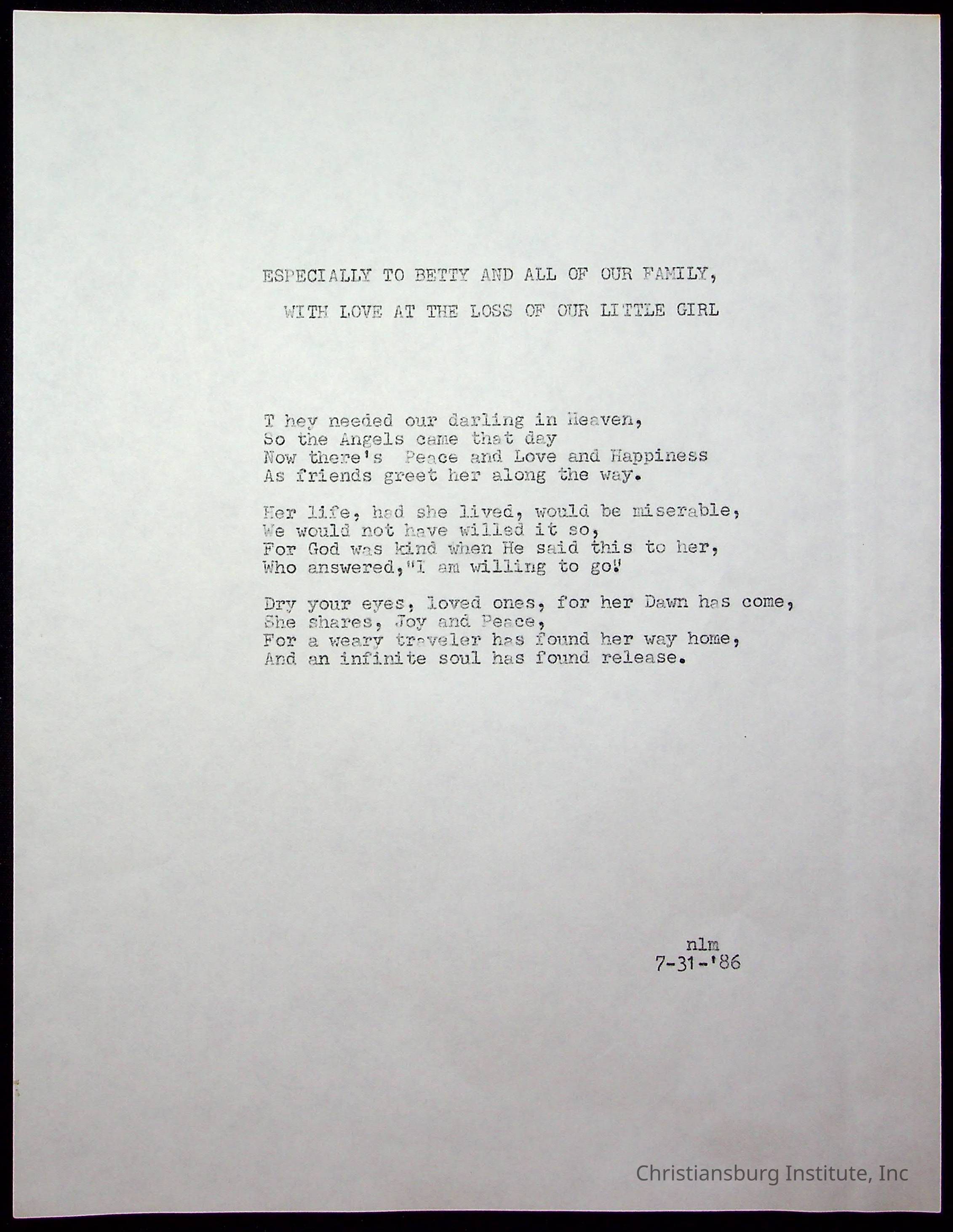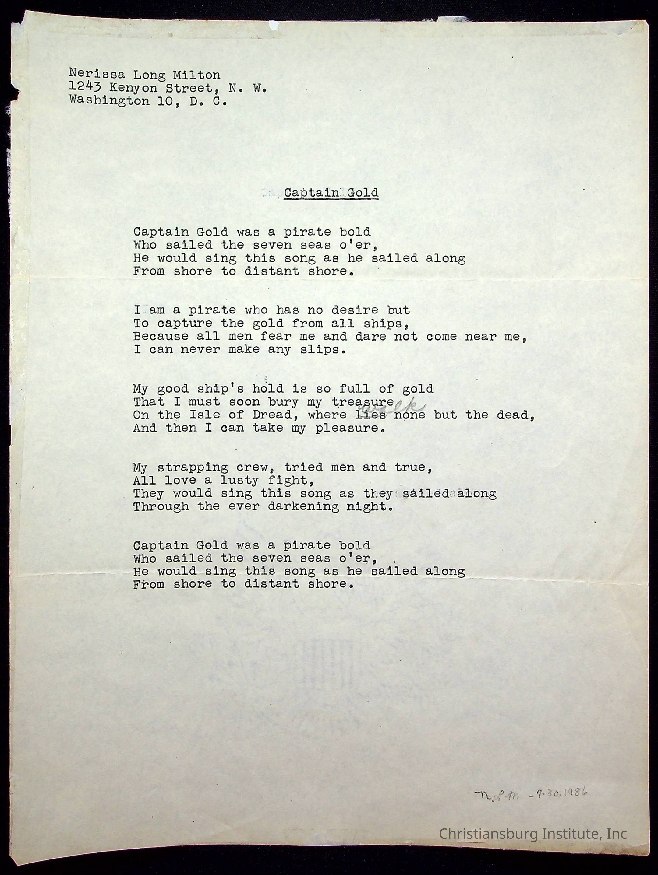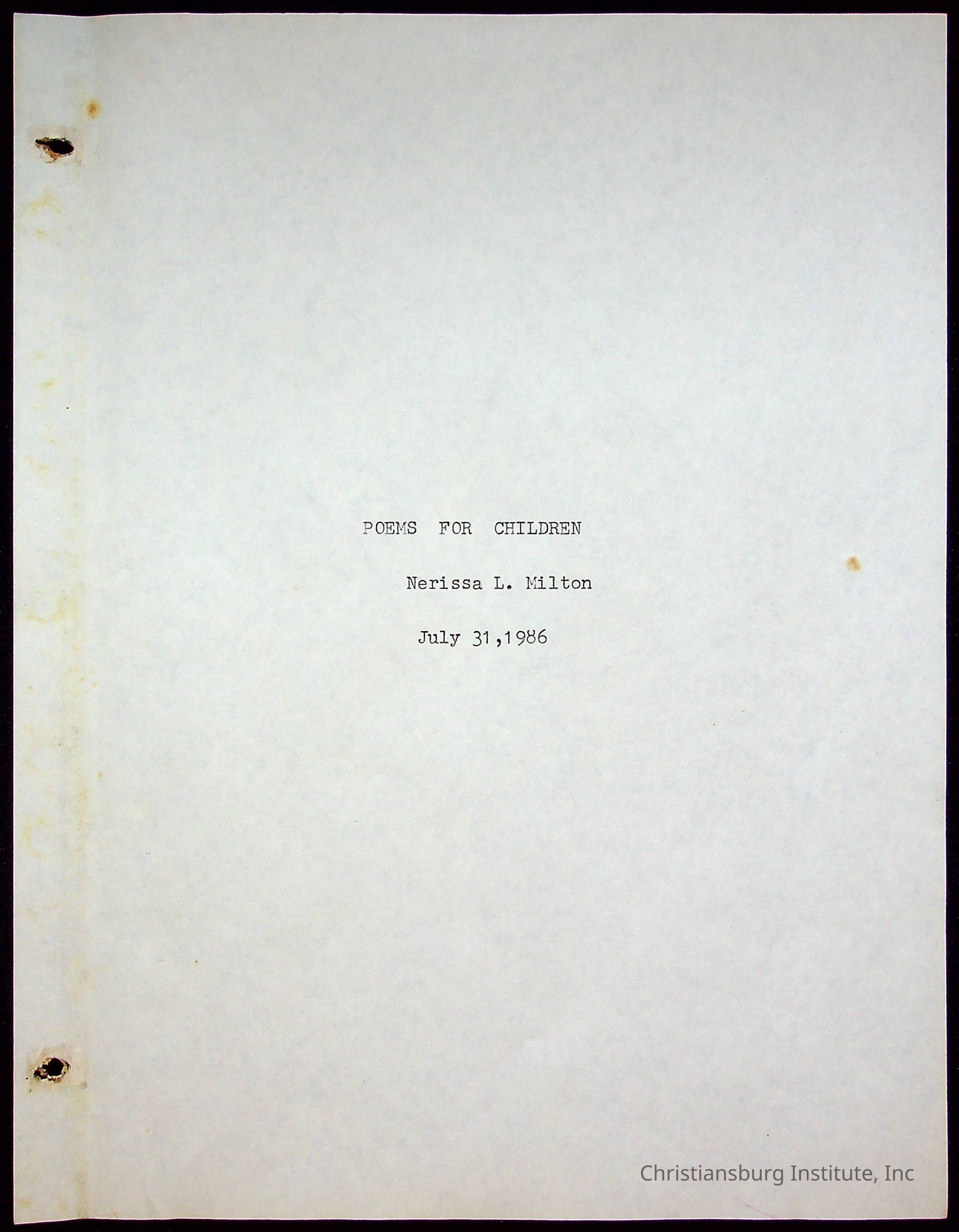 A copy of the "Poems for Children" written by Nerissa Long Milton dated July 31st, 1986.
