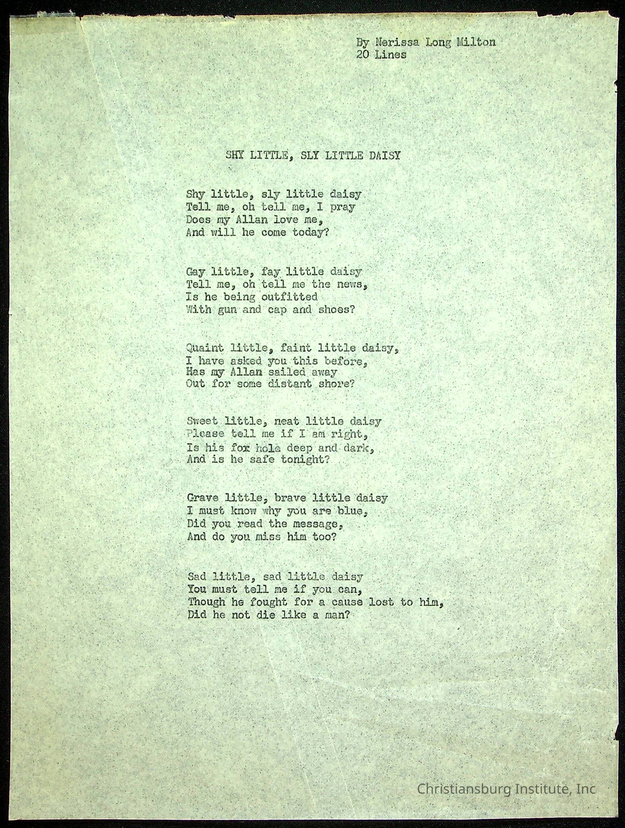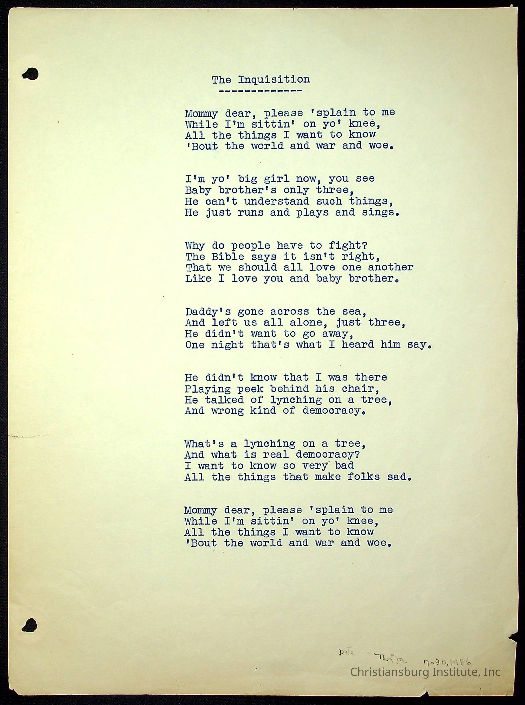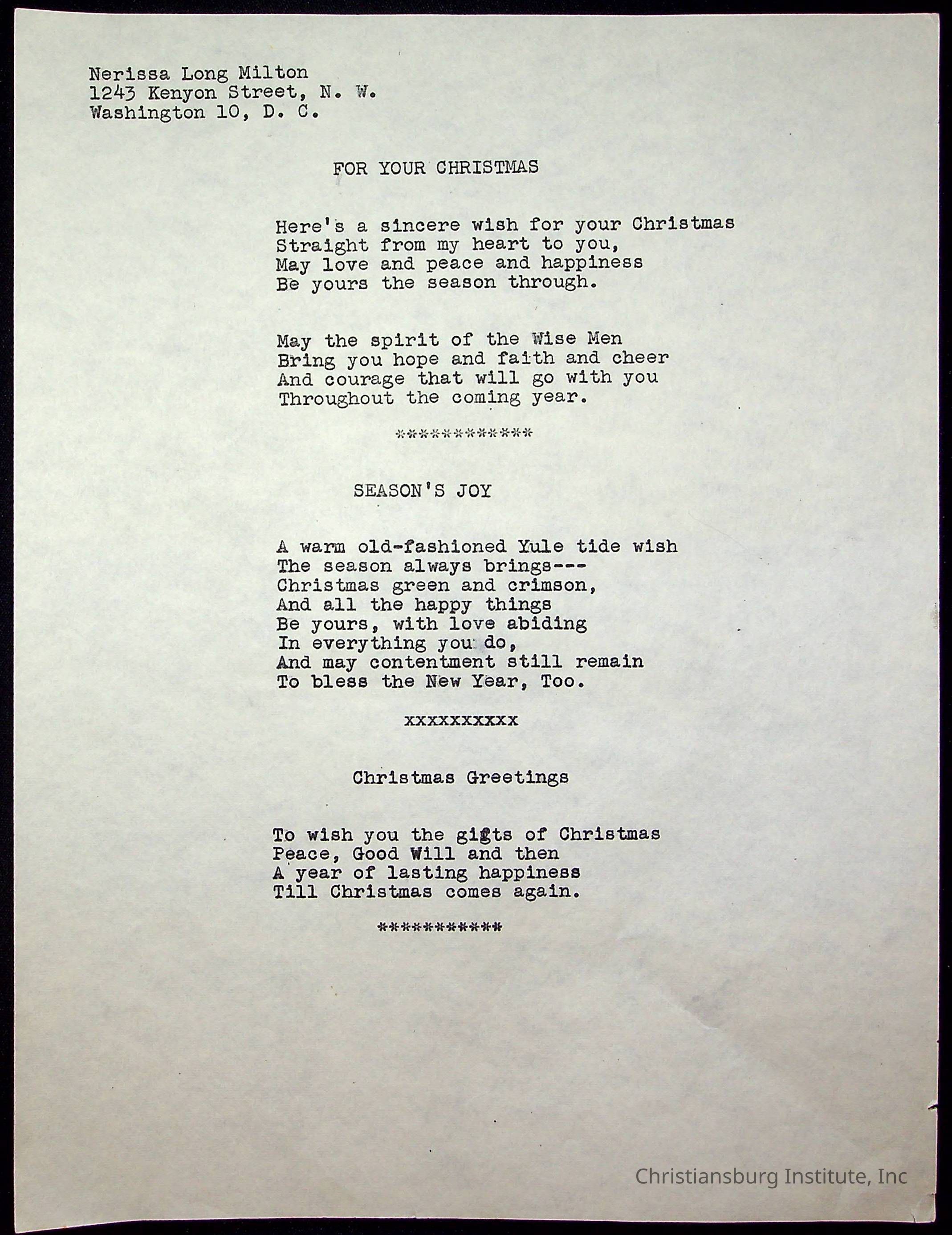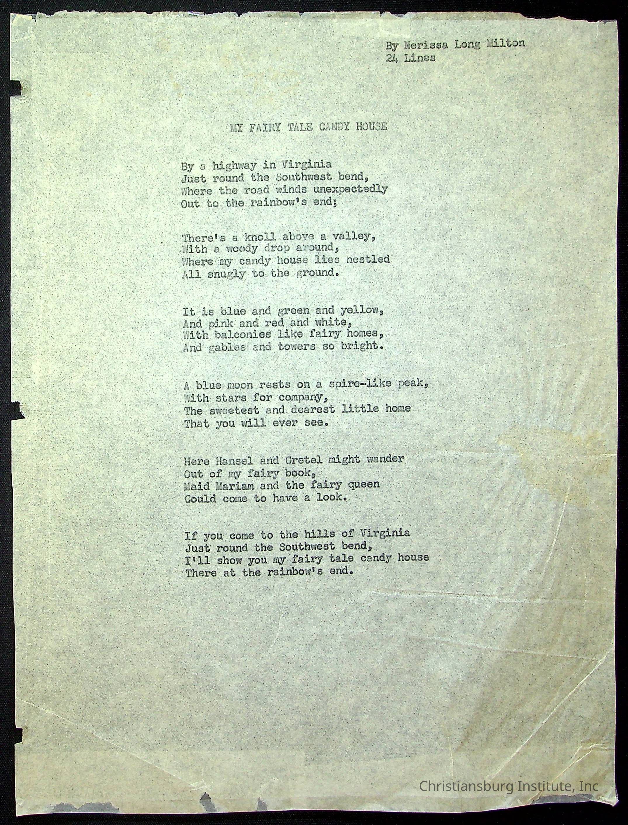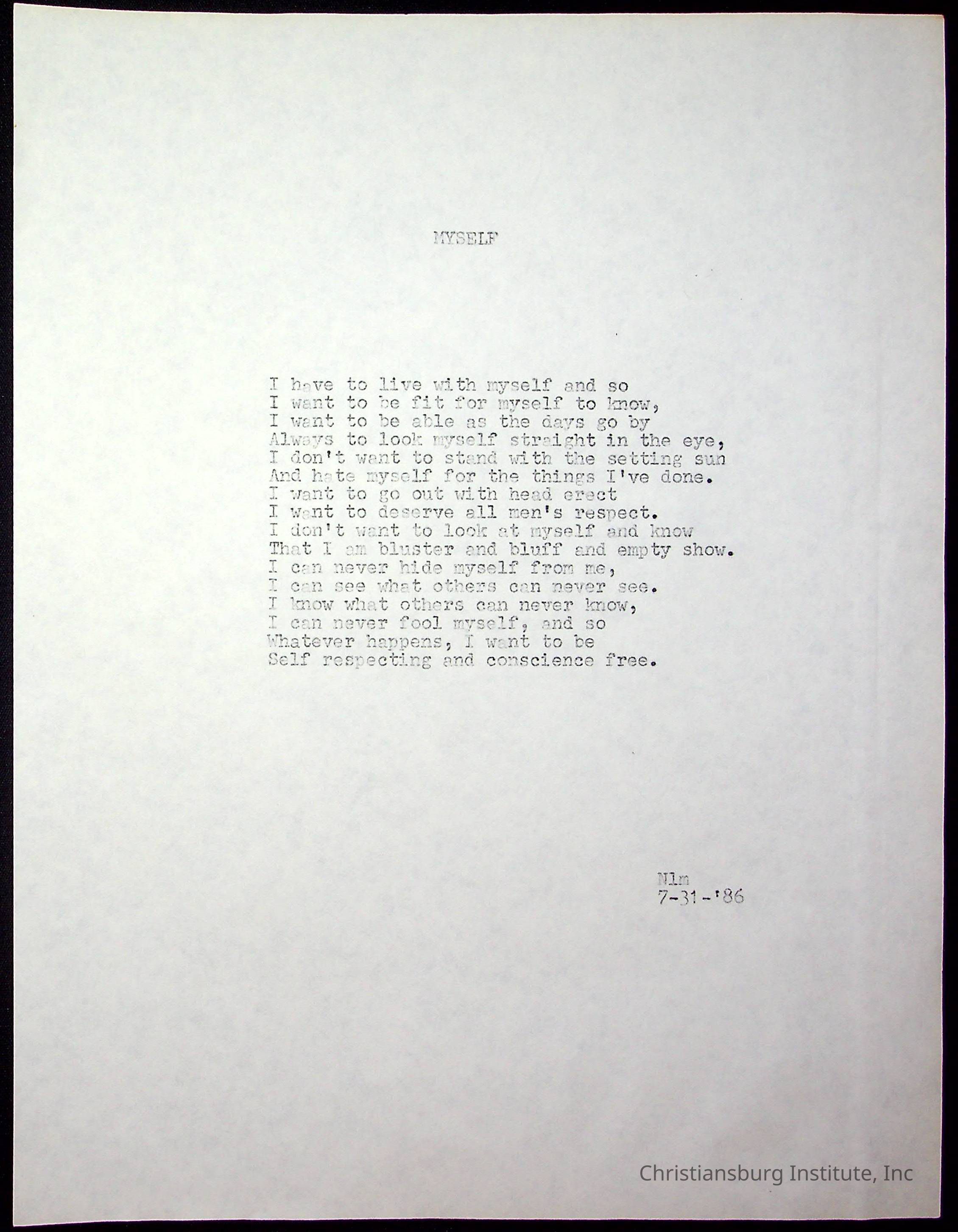 A copy of the "Poems for Children" written by Nerissa Long Milton dated July 31st, 1986.