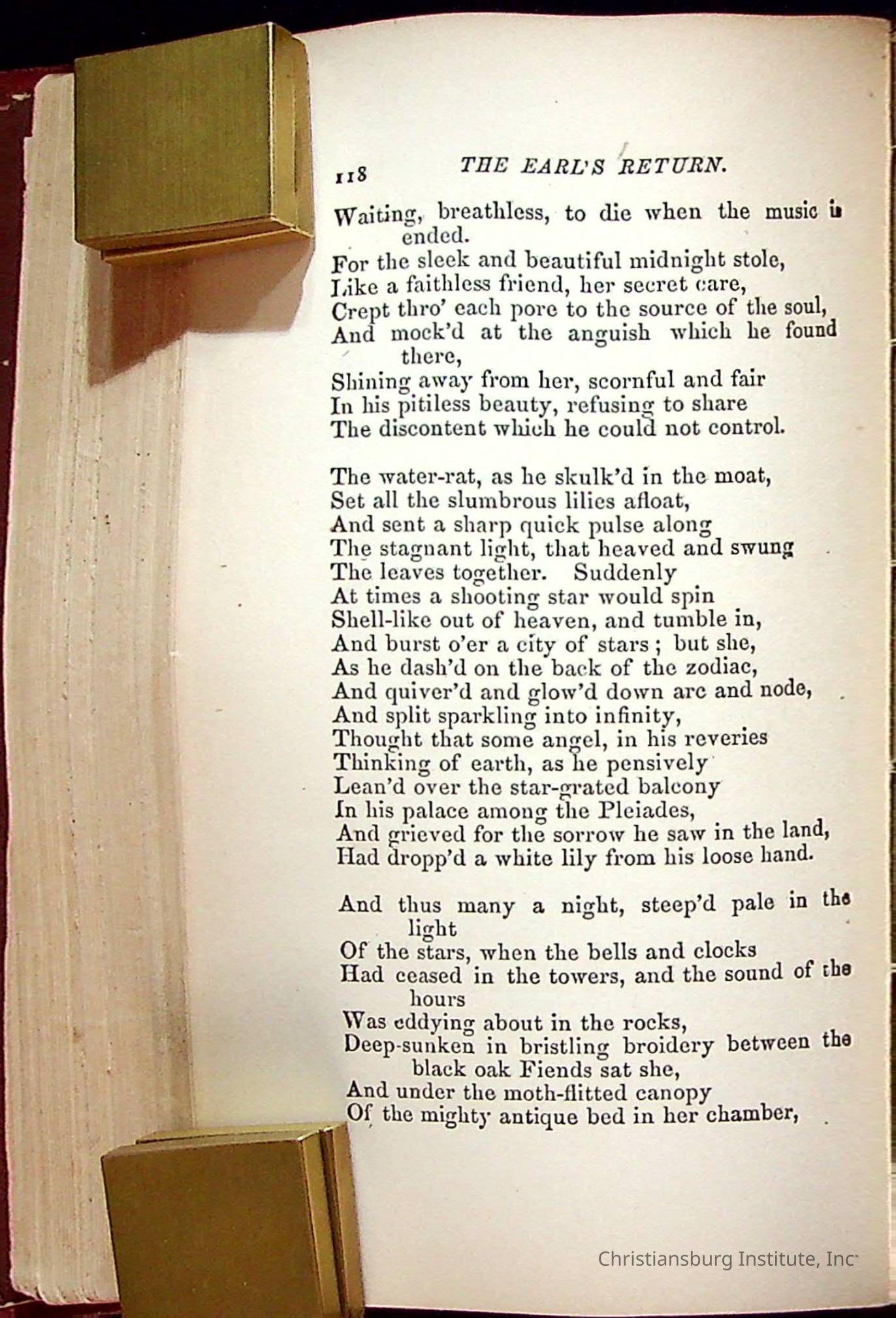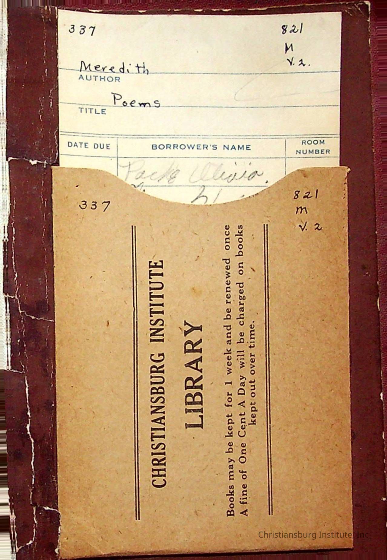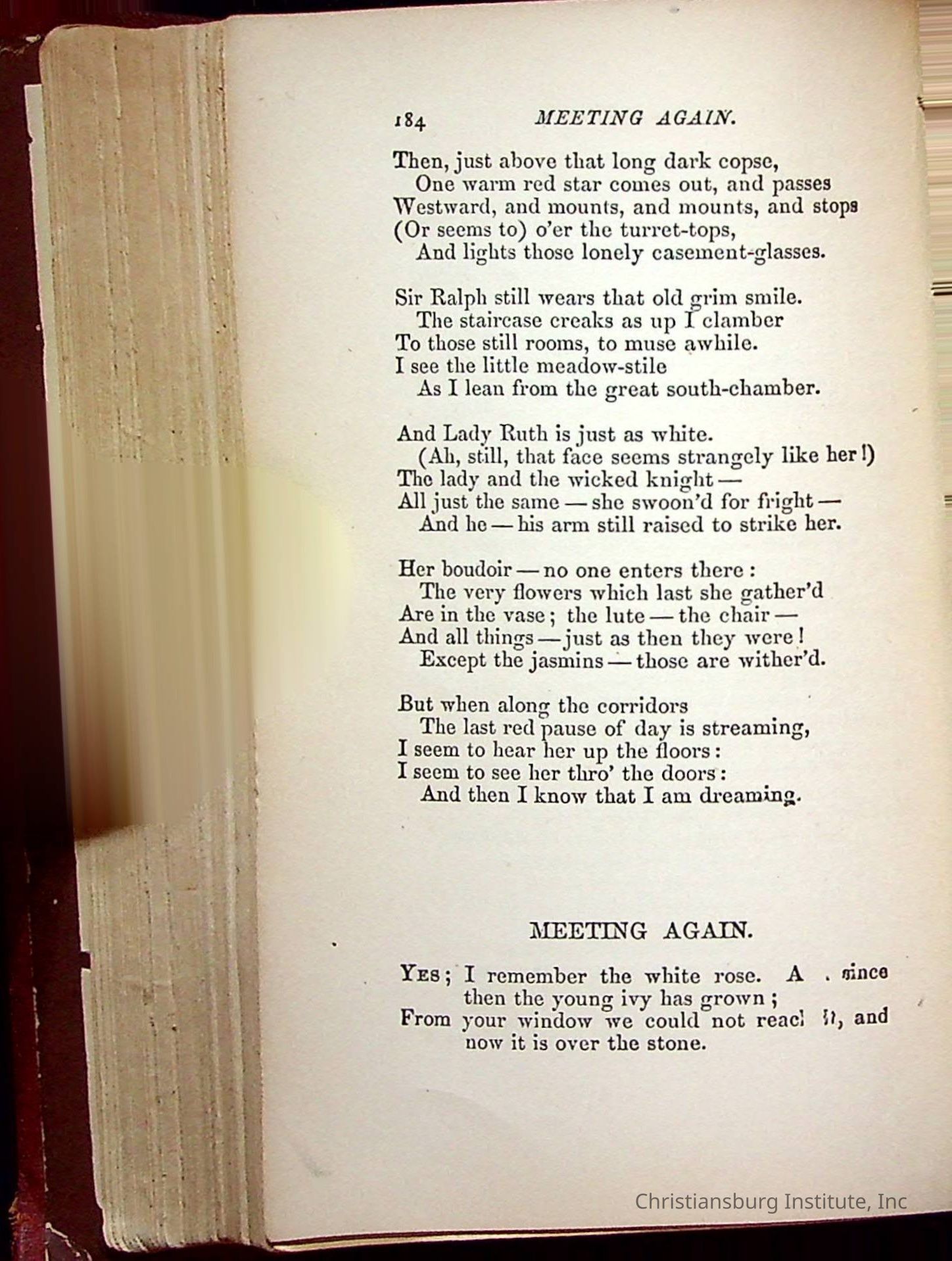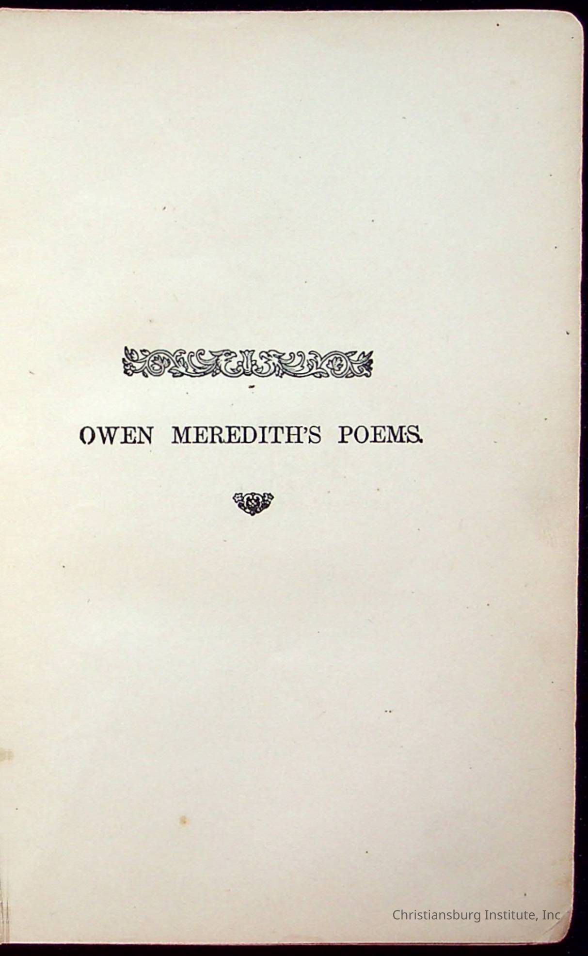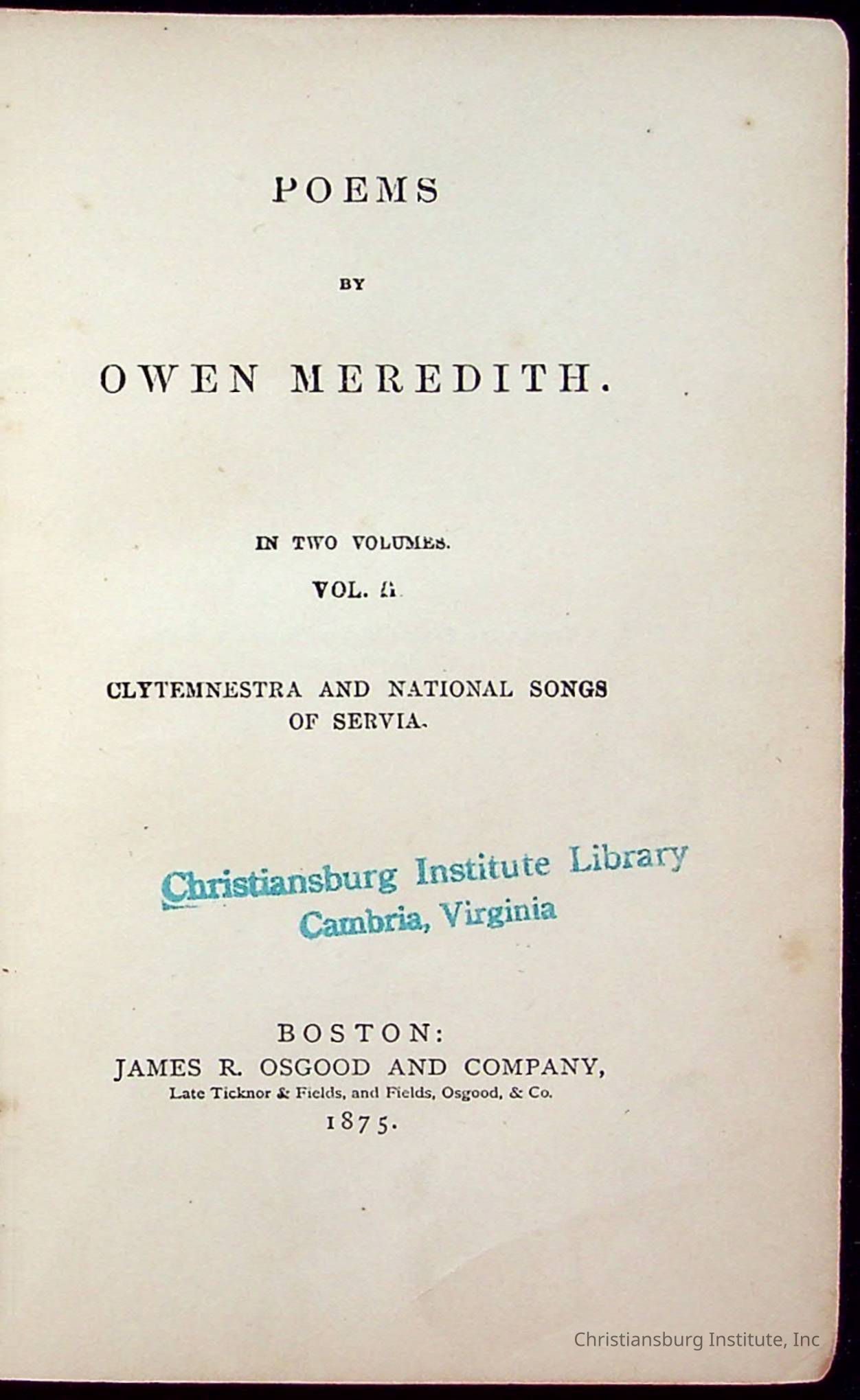 "Poems" written by Owen Meredith and published by James R. Osgood and Company in the year 1875. This book was in the Christiansburg Institute library.