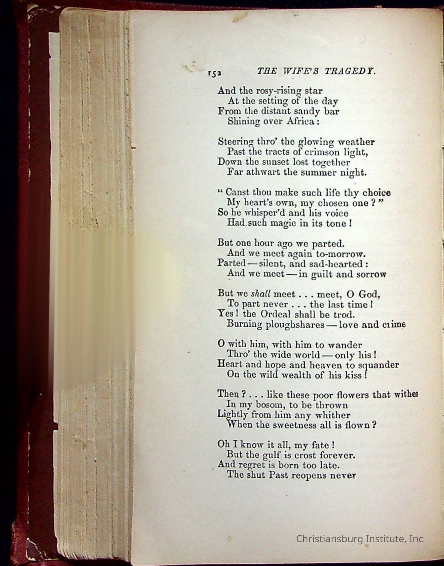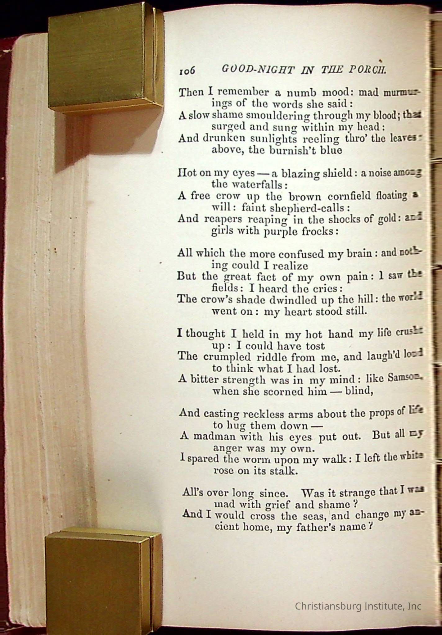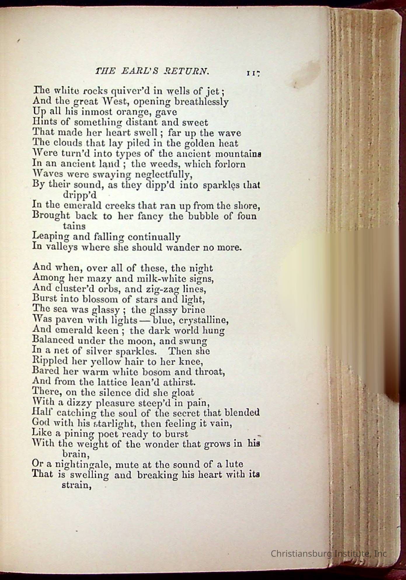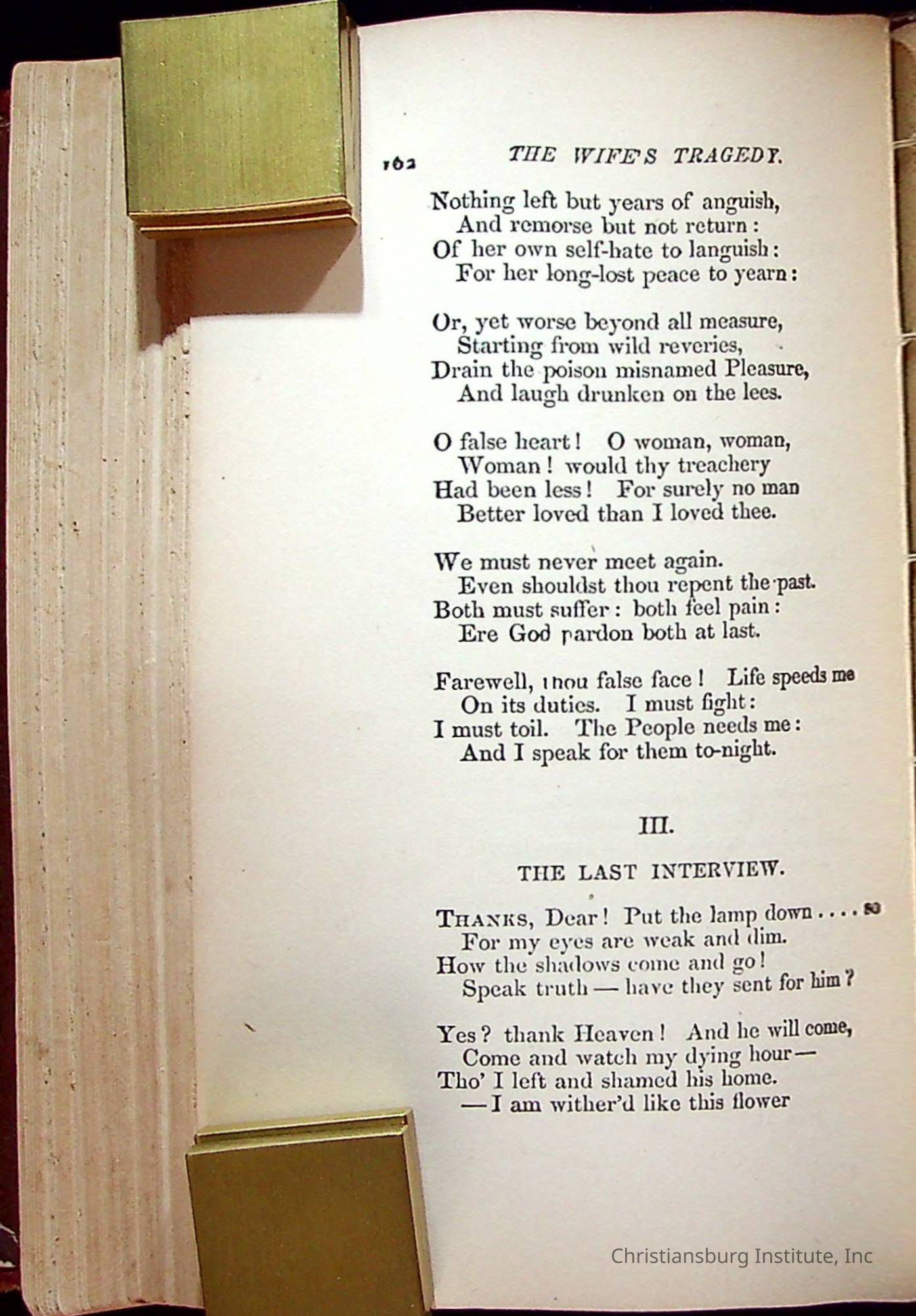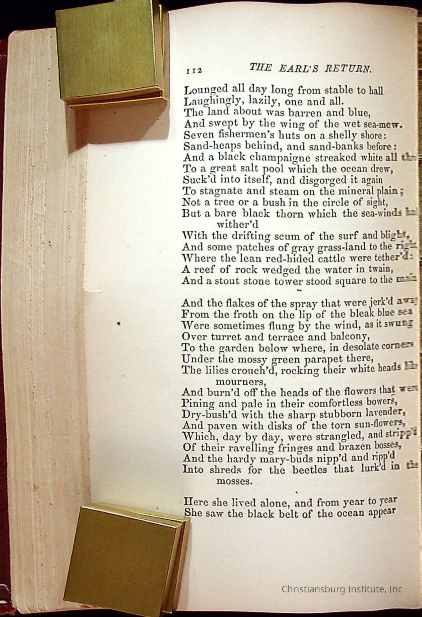 "Poems" written by Owen Meredith and published by James R. Osgood and Company in the year 1875. This book was in the Christiansburg Institute library.