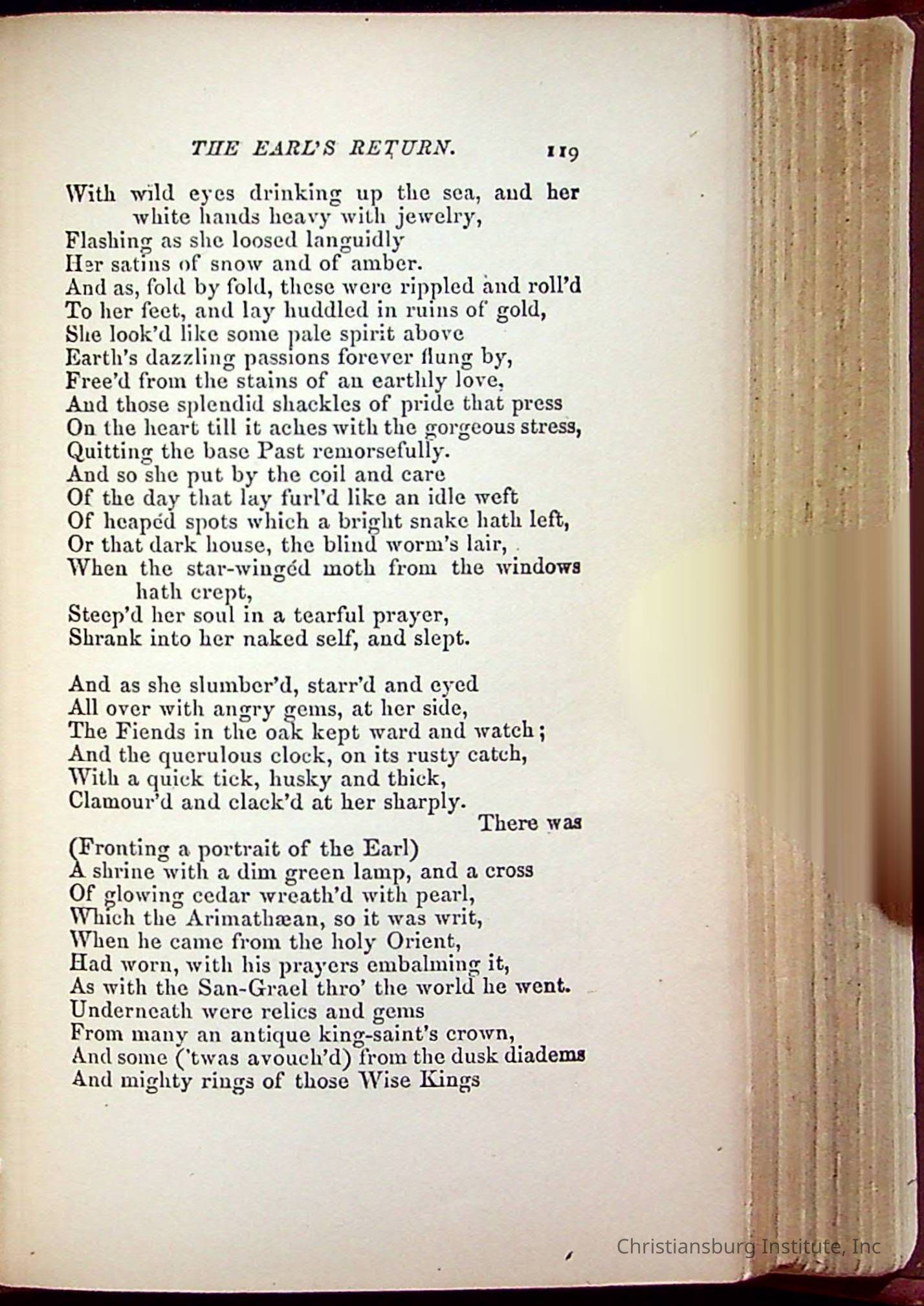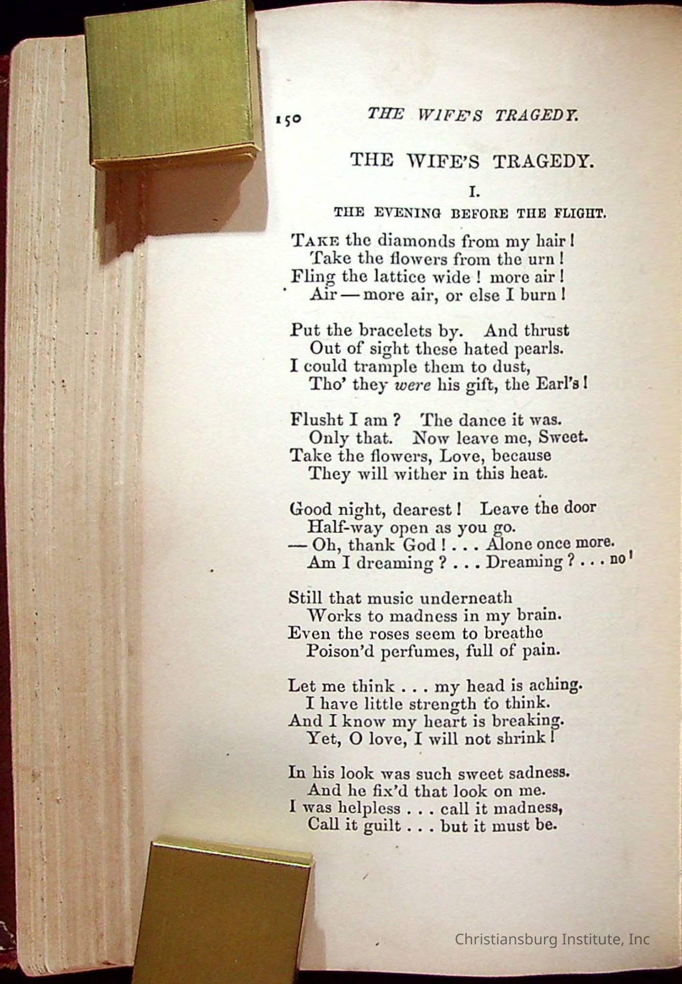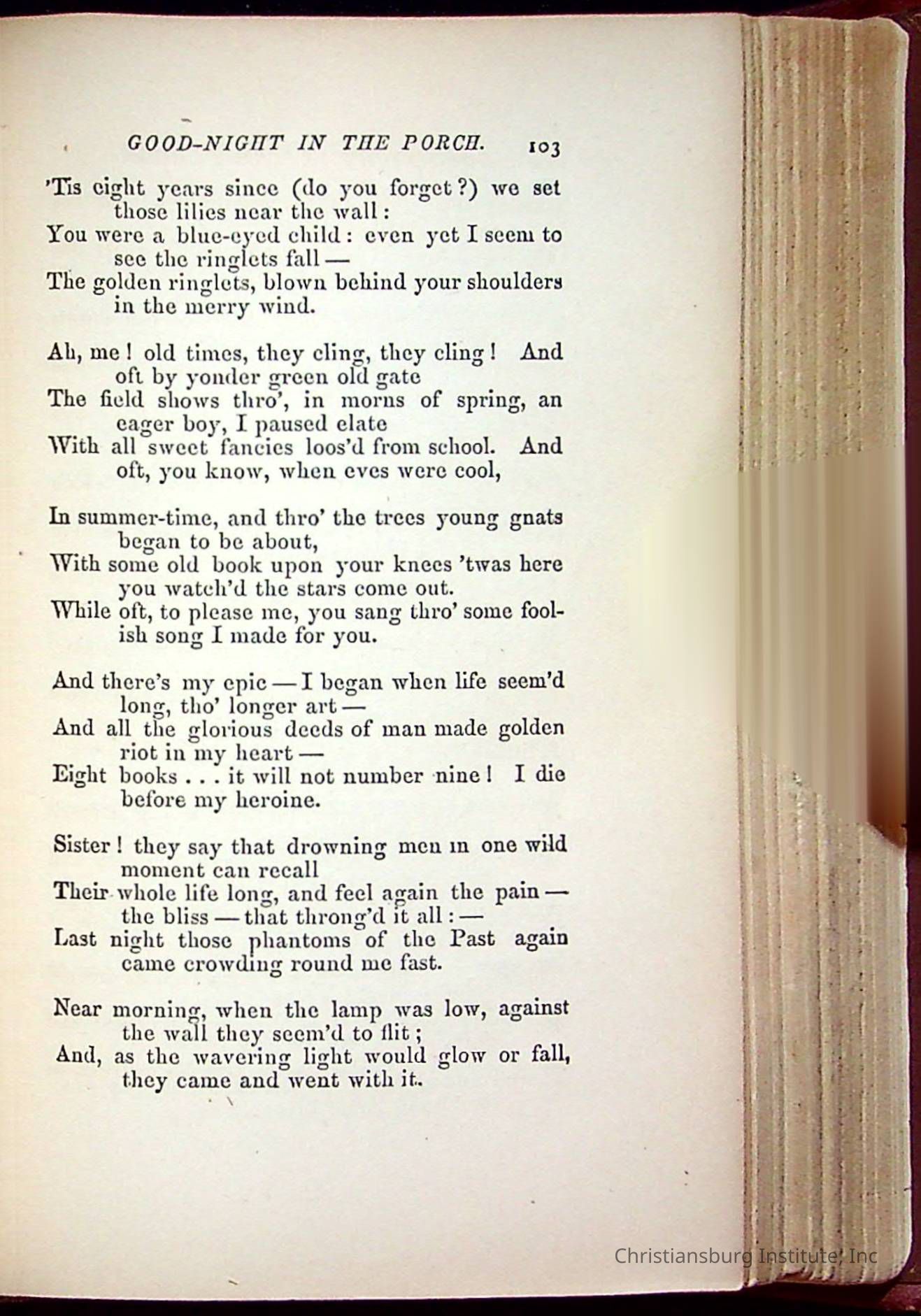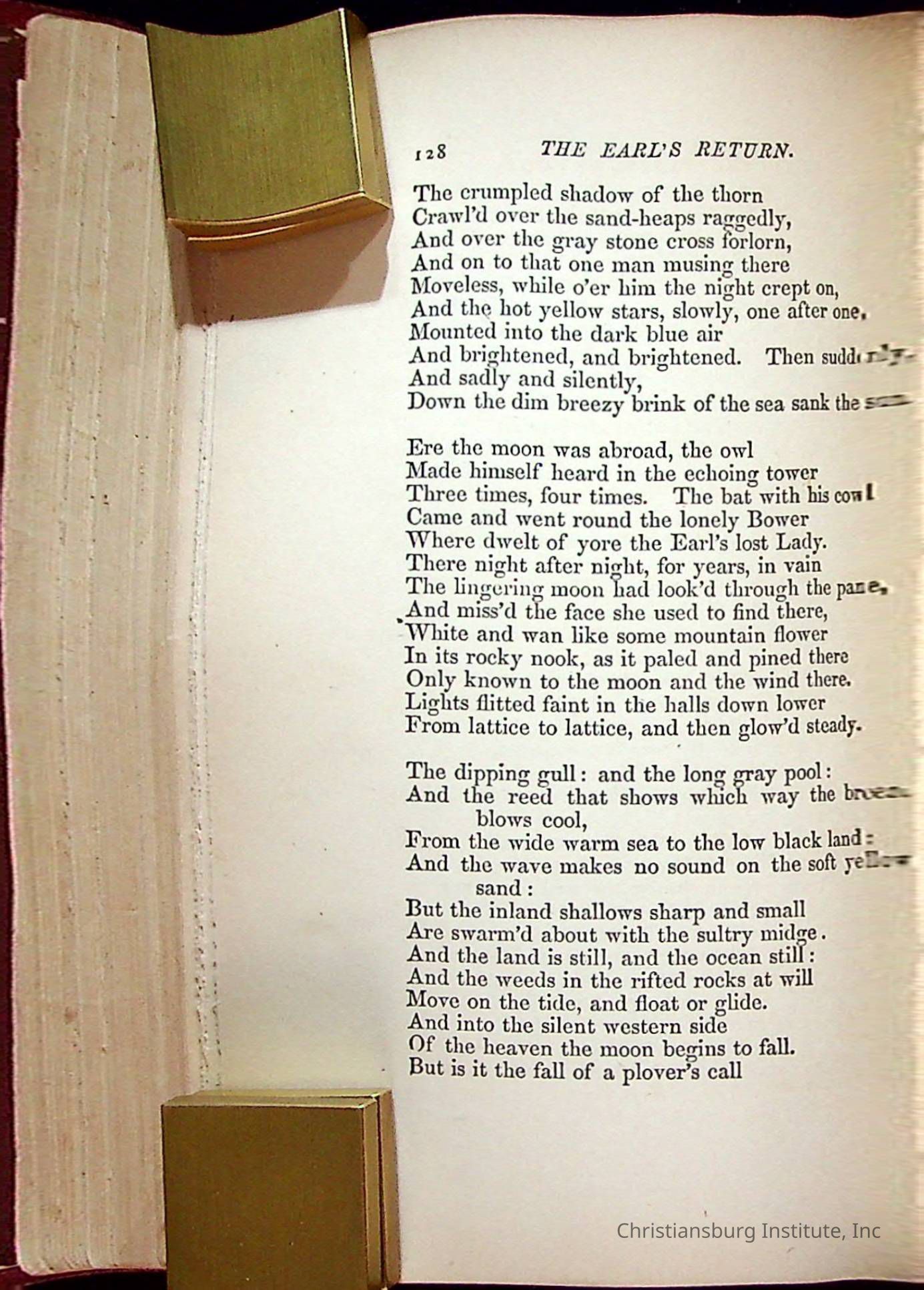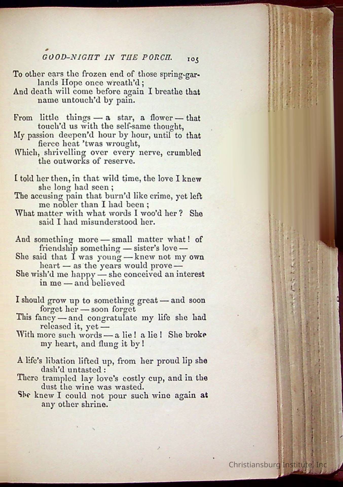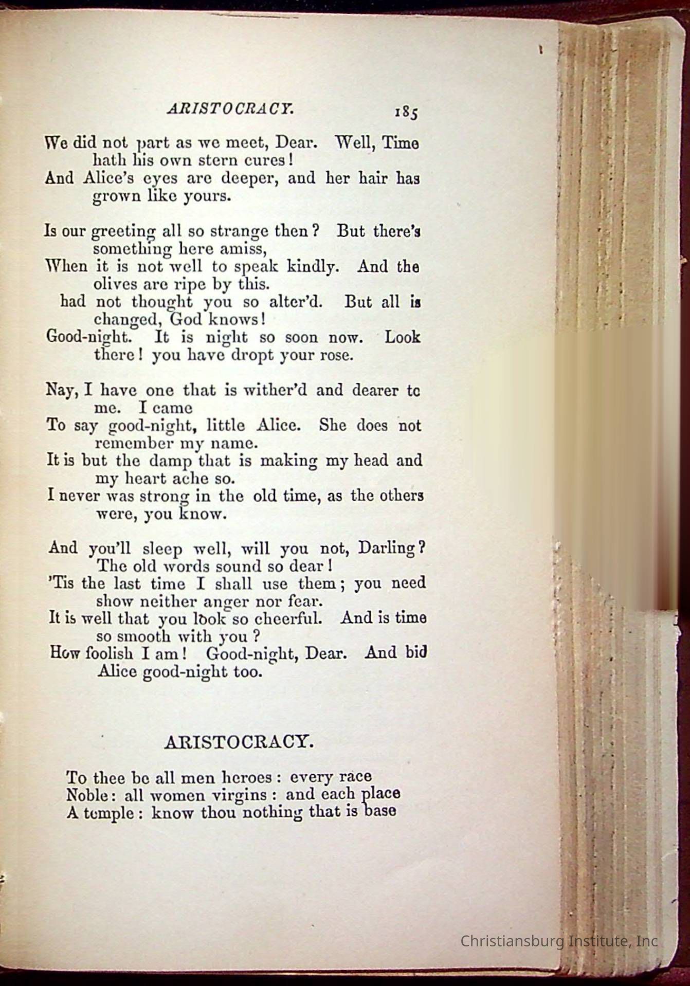 "Poems" written by Owen Meredith and published by James R. Osgood and Company in the year 1875. This book was in the Christiansburg Institute library.