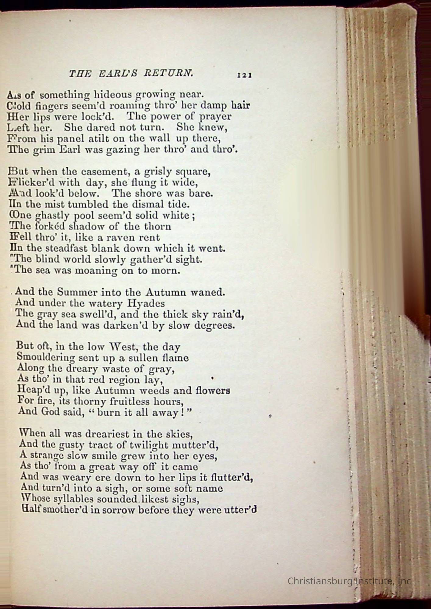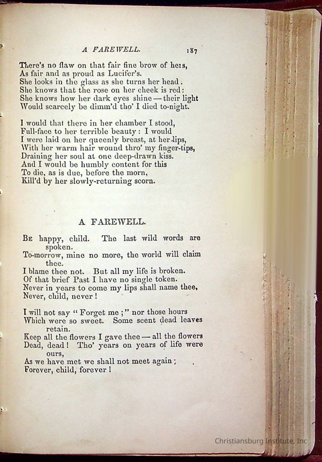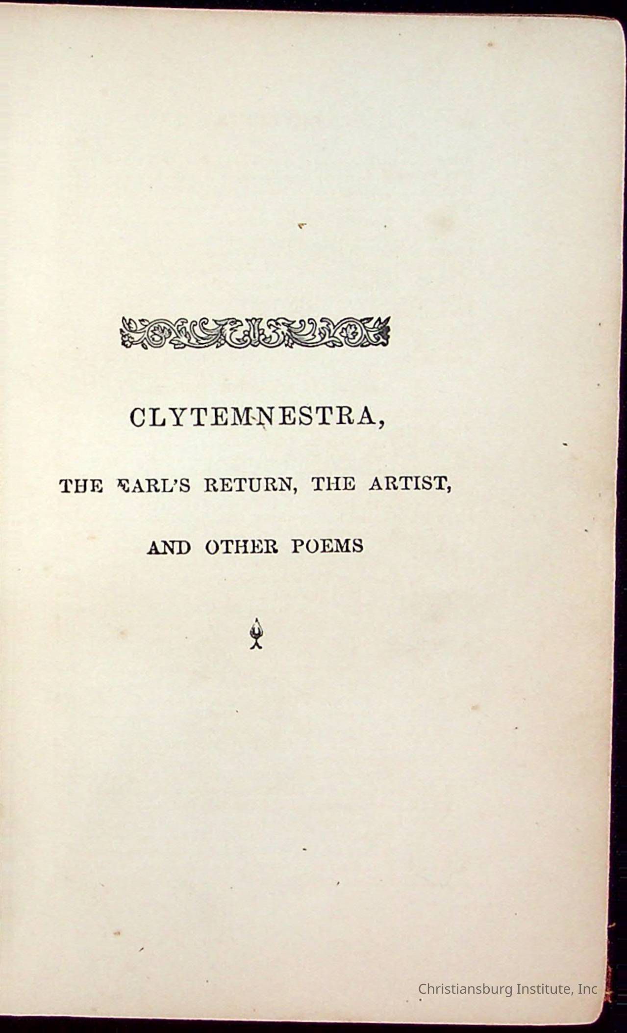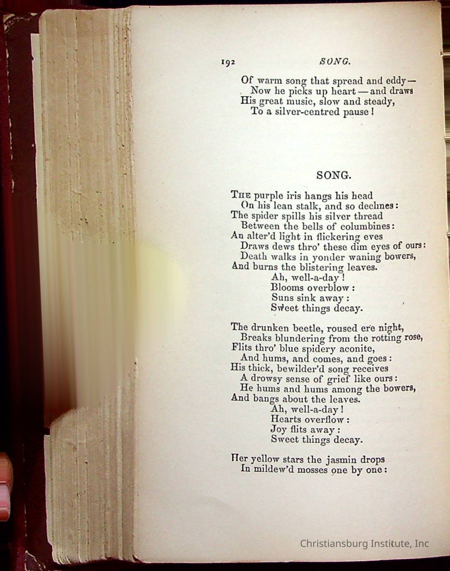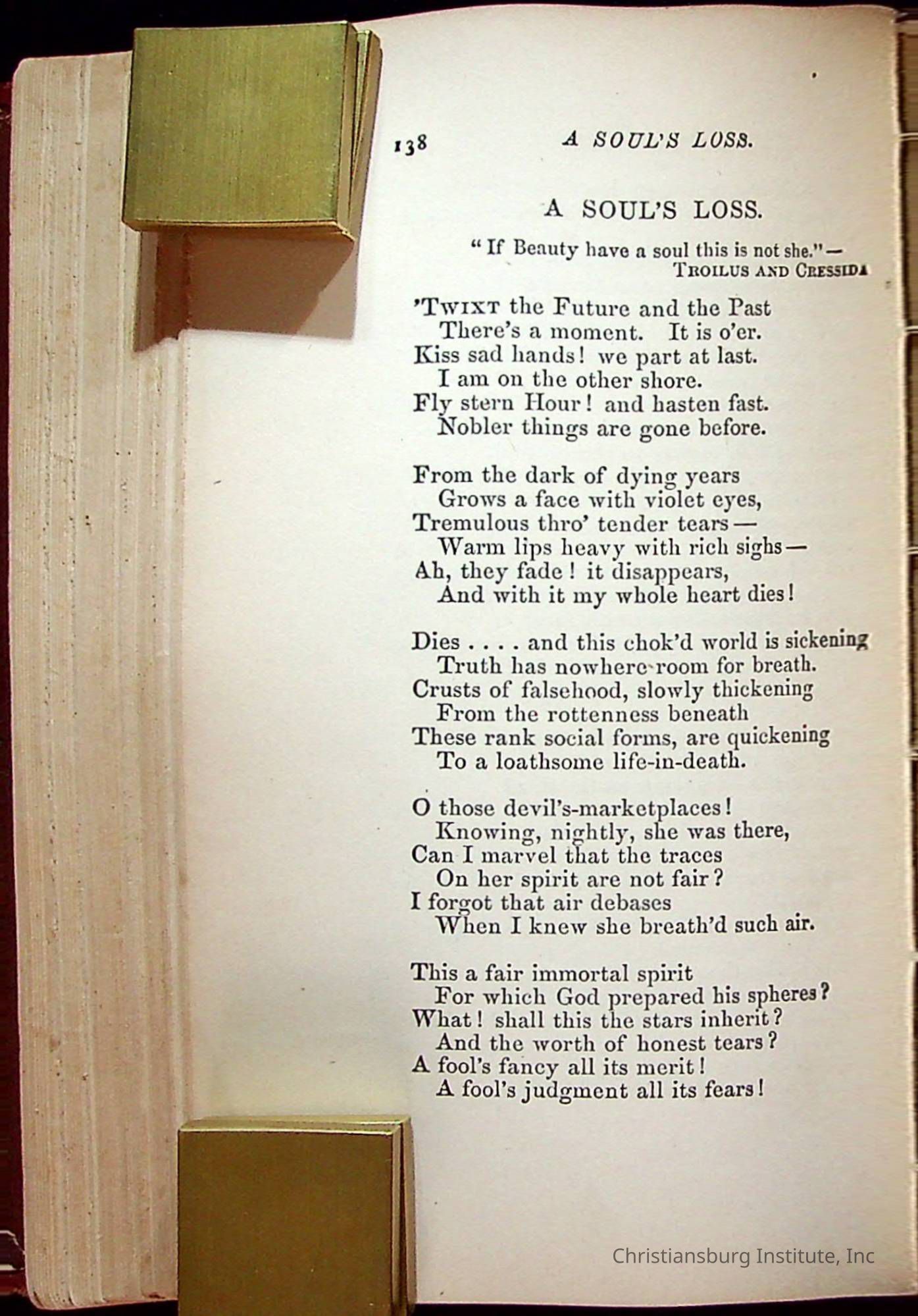 "Poems" written by Owen Meredith and published by James R. Osgood and Company in the year 1875. This book was in the Christiansburg Institute library.