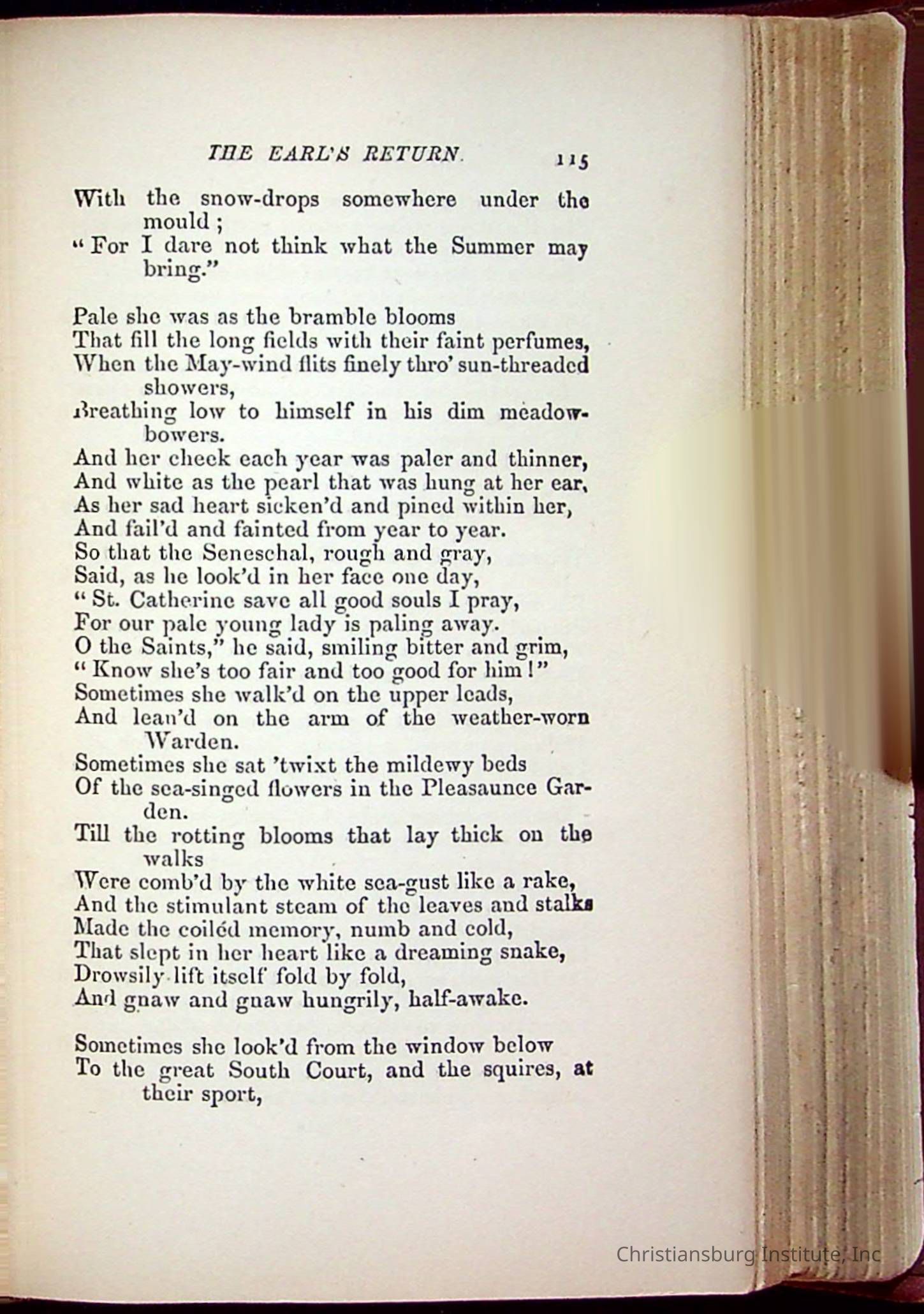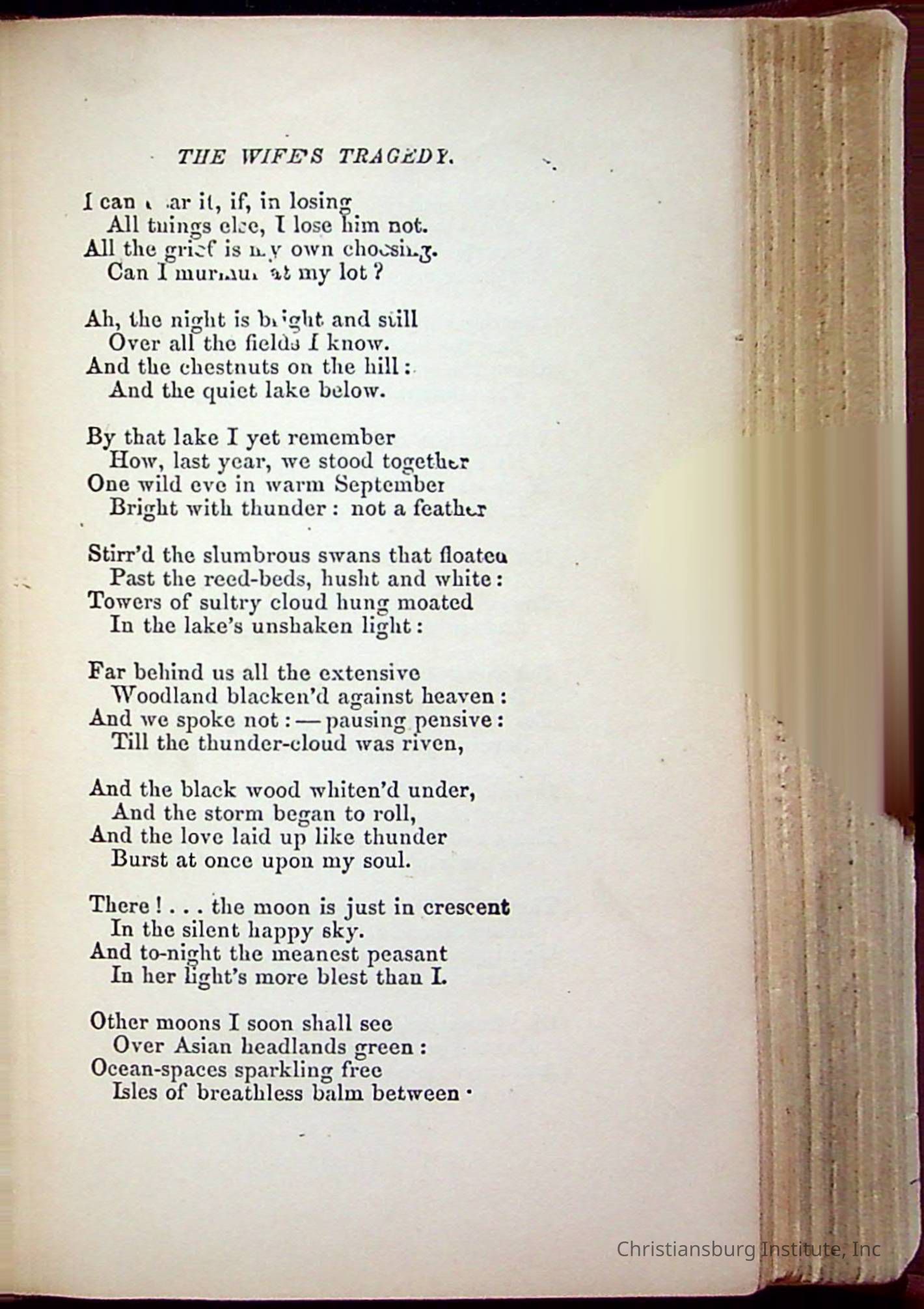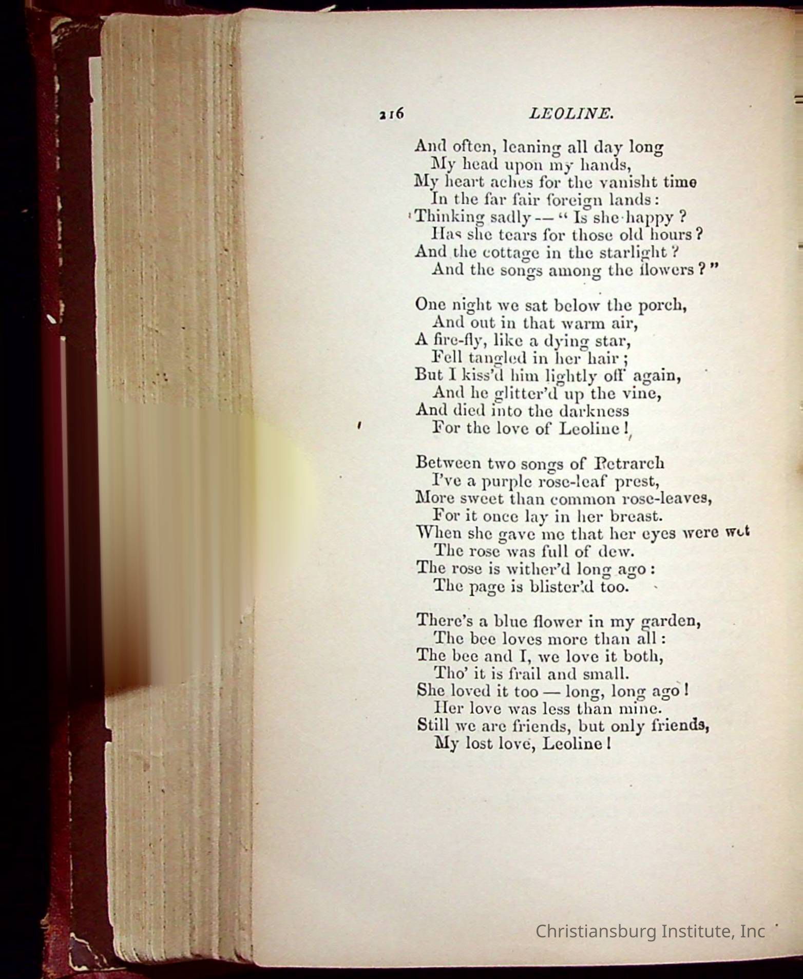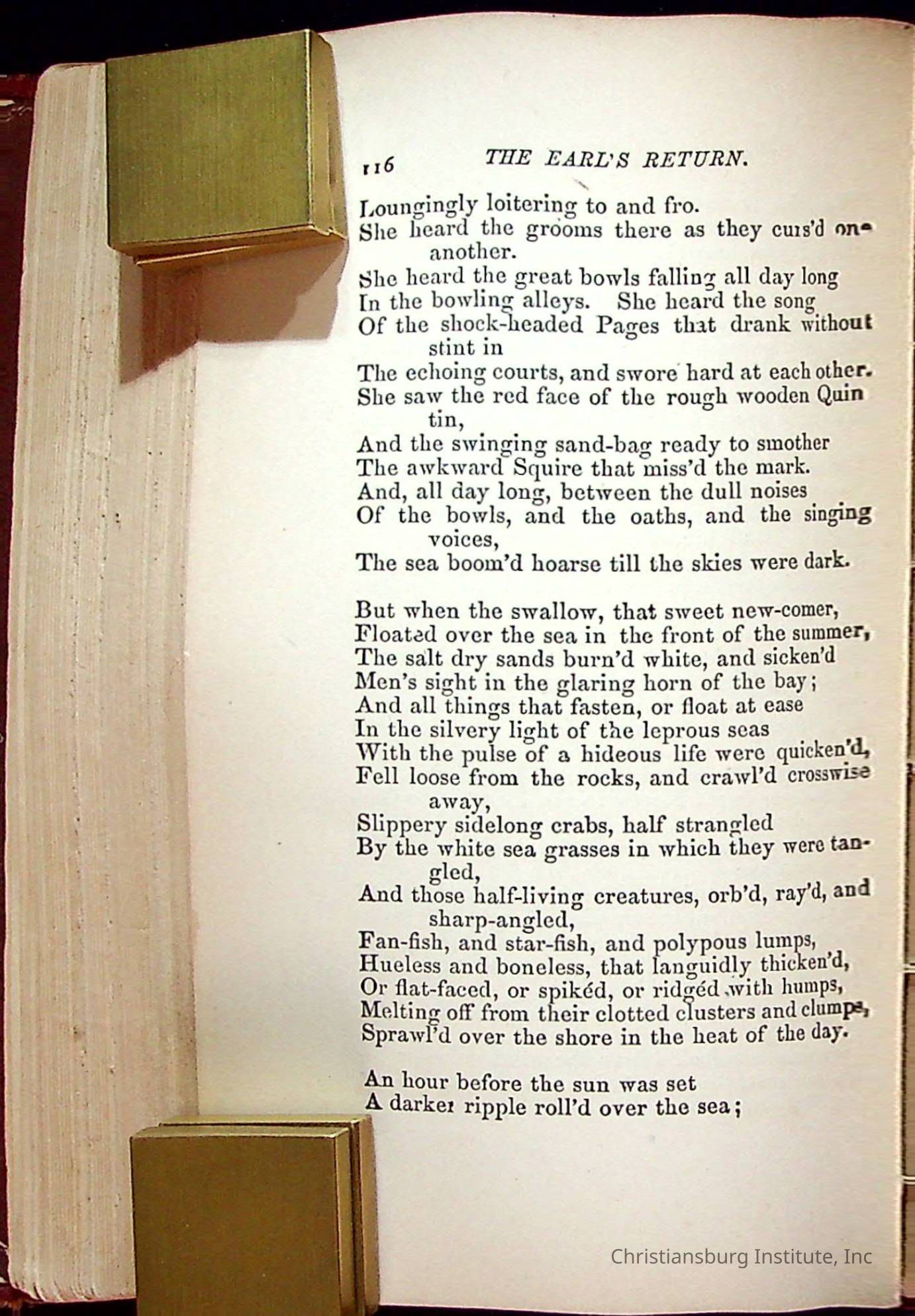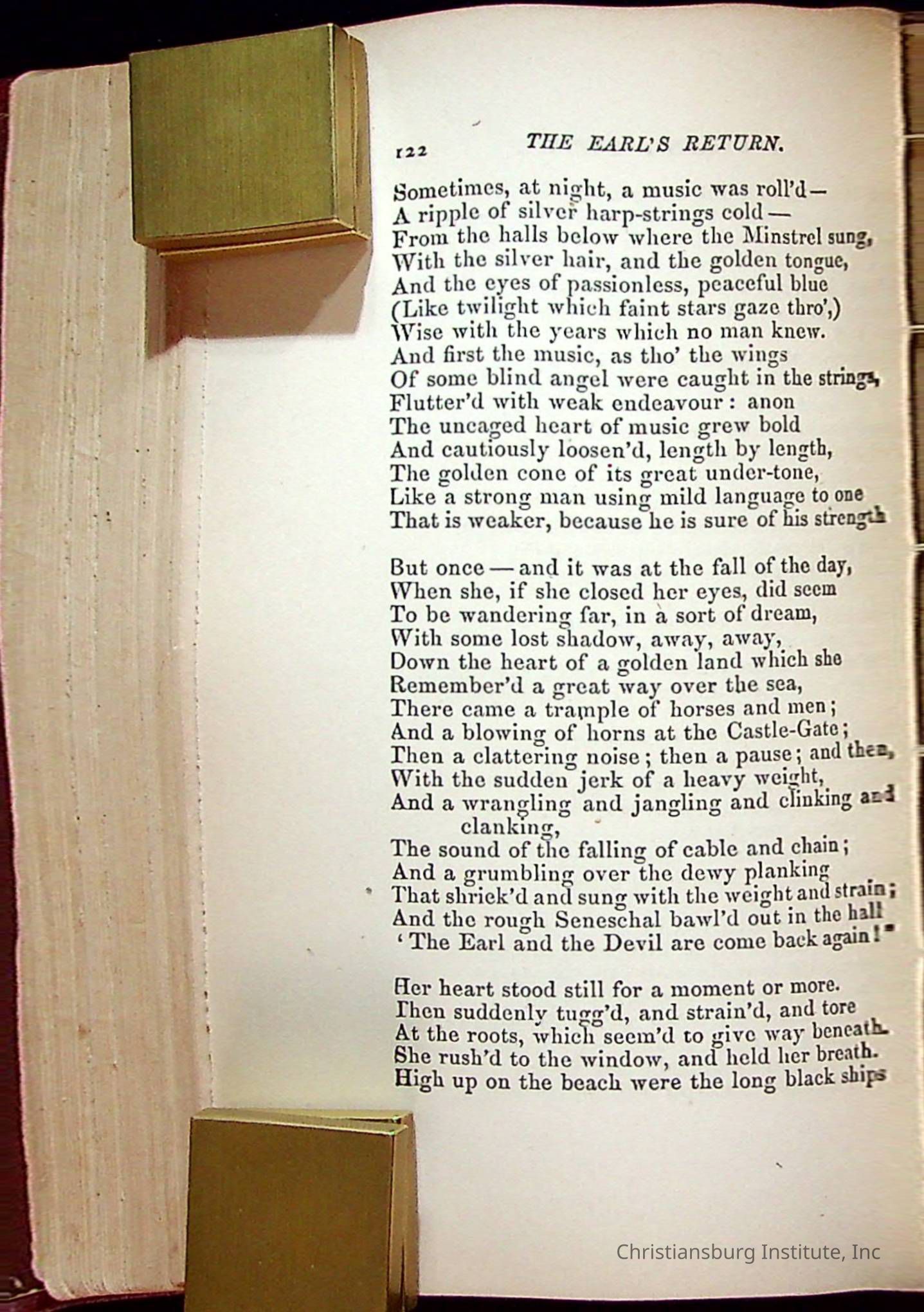 "Poems" written by Owen Meredith and published by James R. Osgood and Company in the year 1875. This book was in the Christiansburg Institute library.