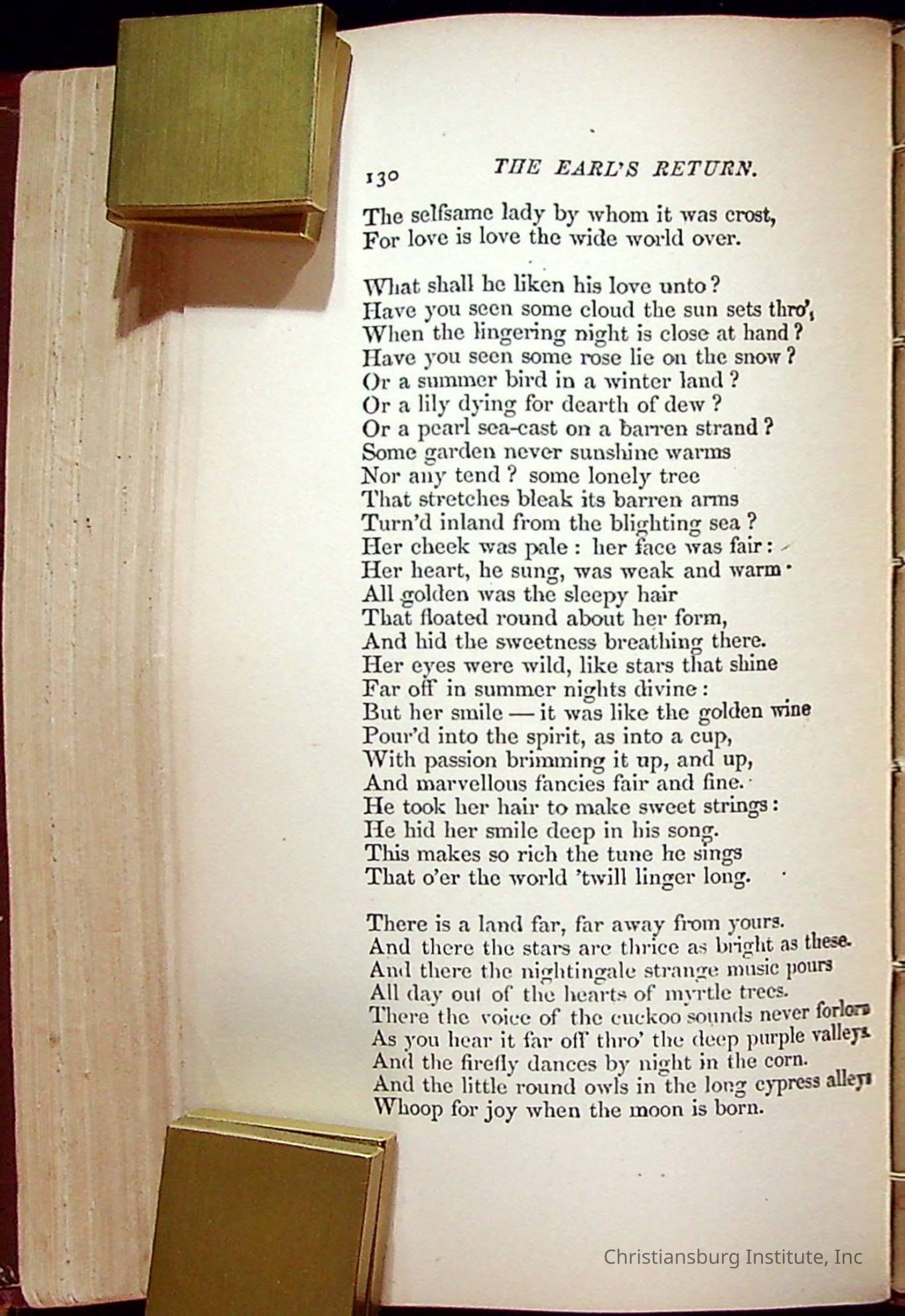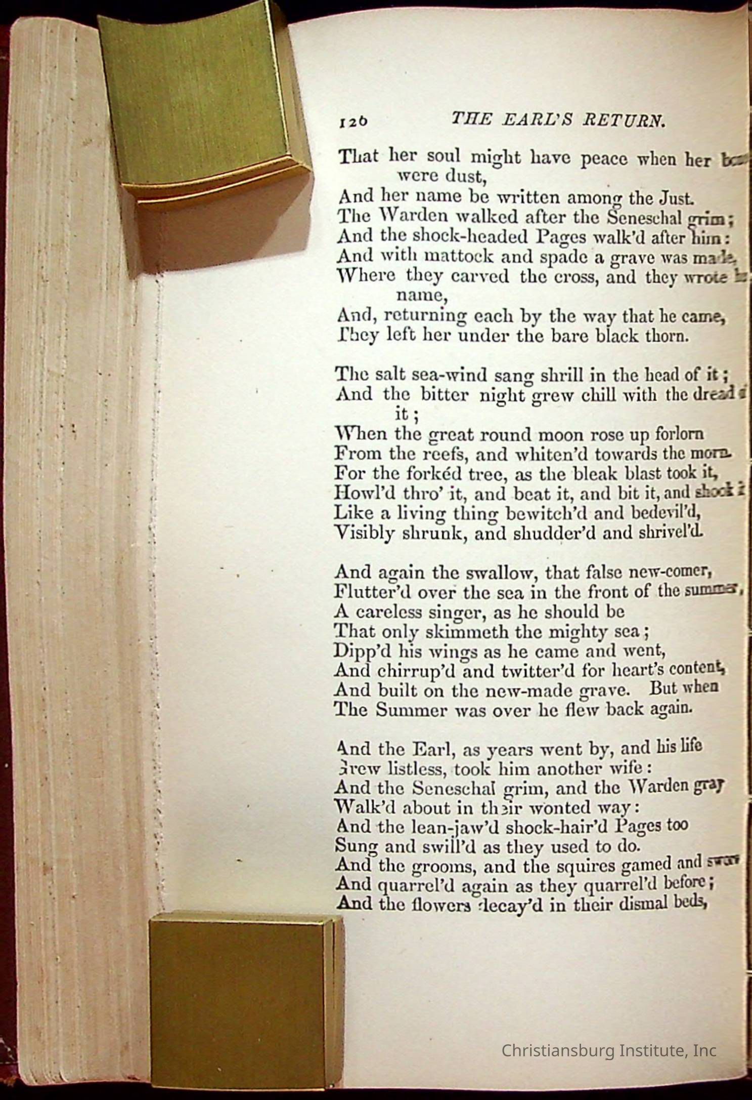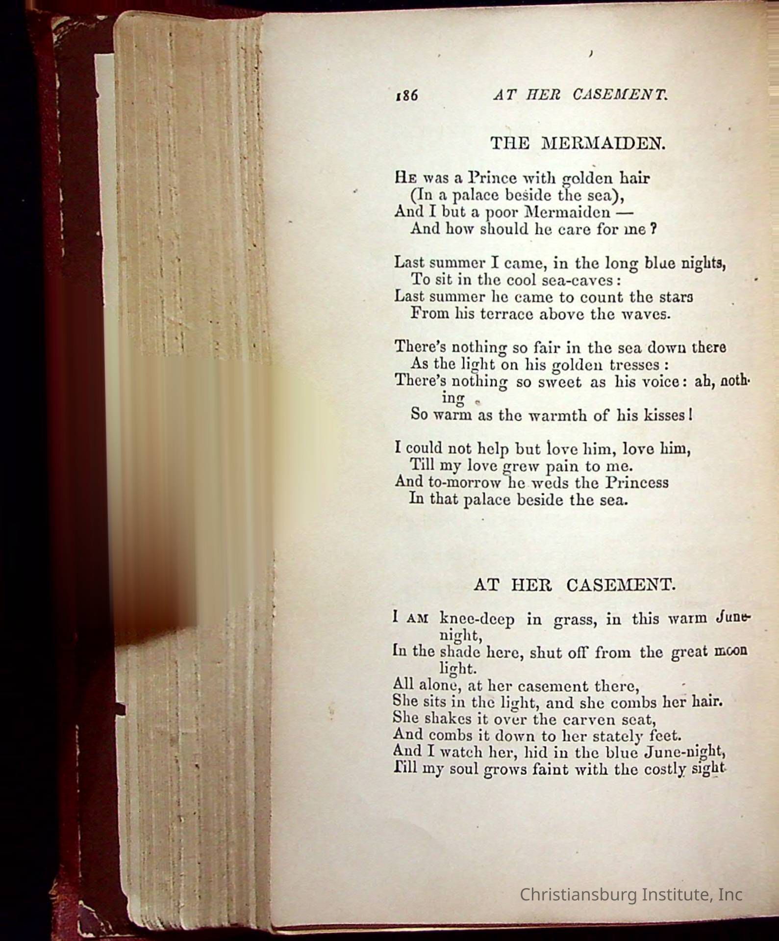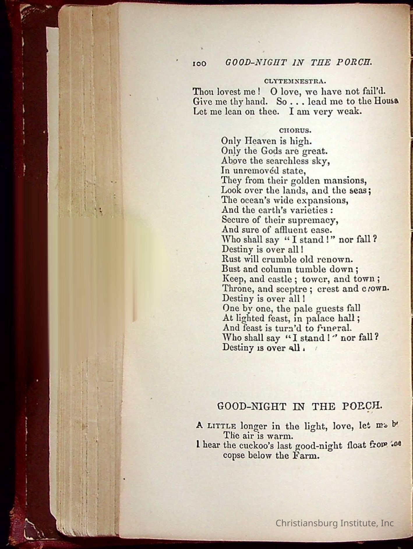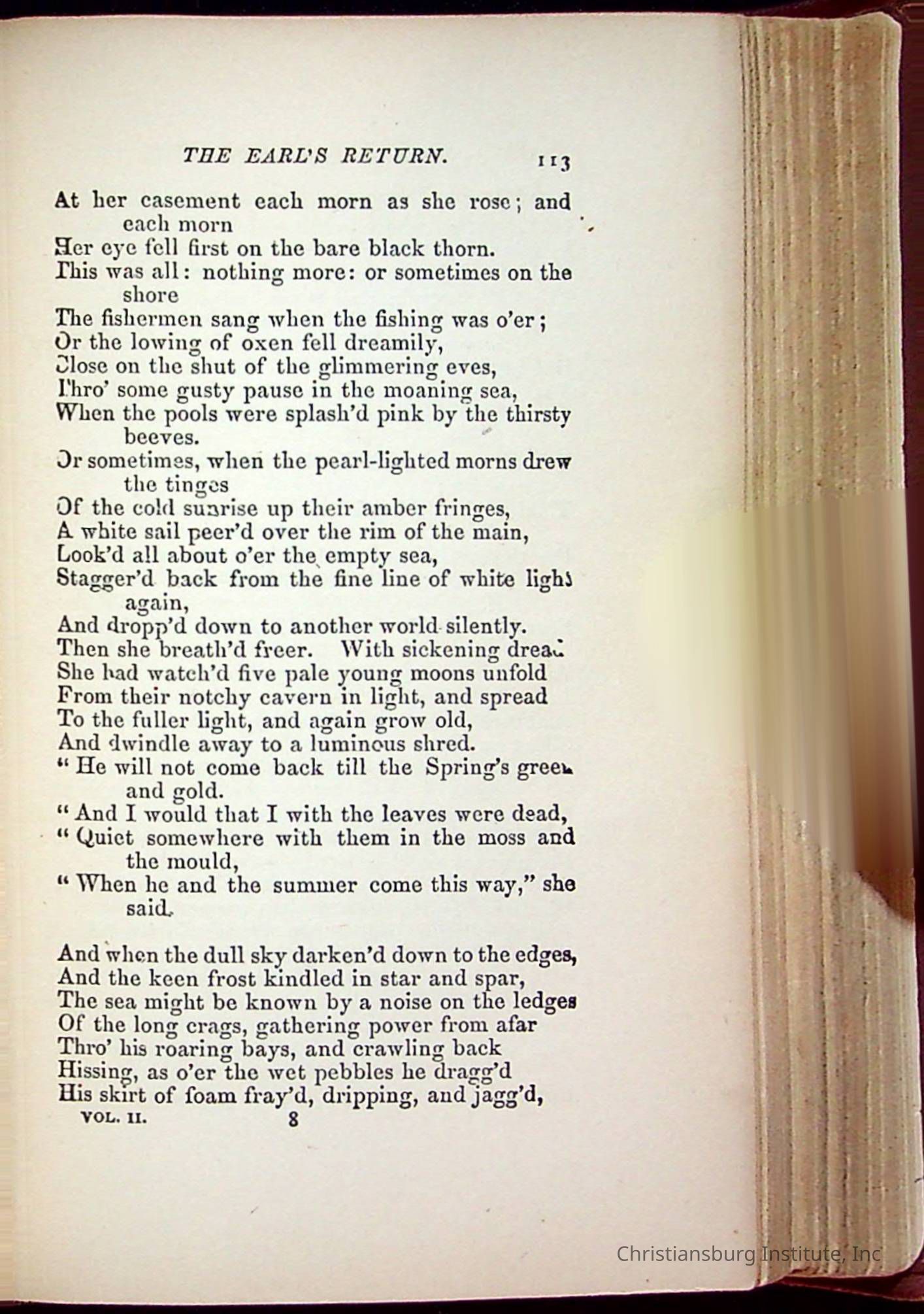 "Poems" written by Owen Meredith and published by James R. Osgood and Company in the year 1875. This book was in the Christiansburg Institute library.