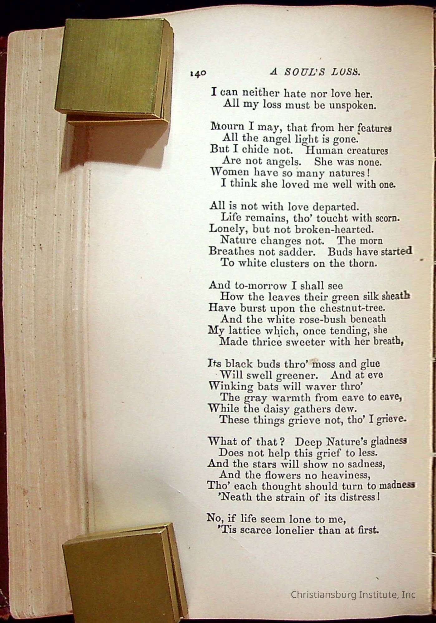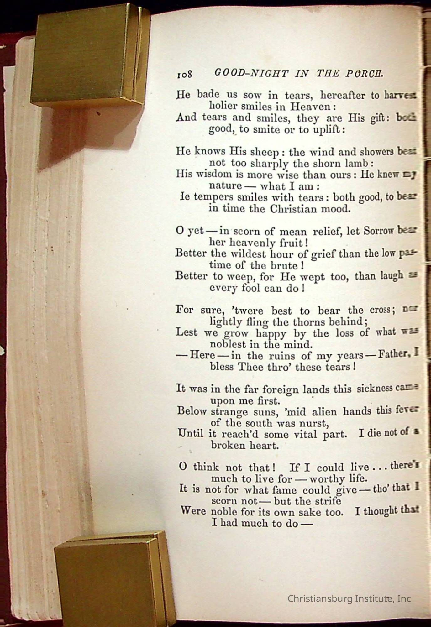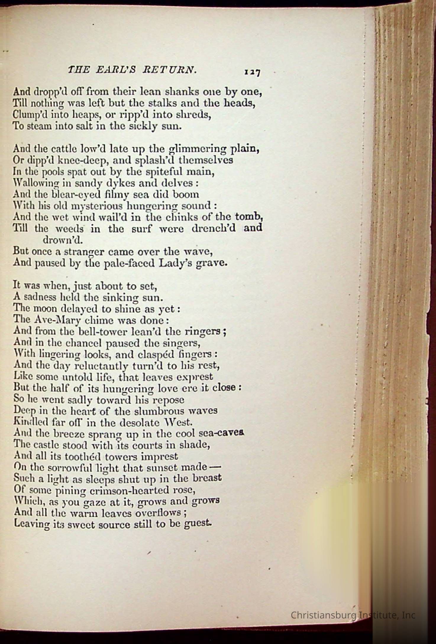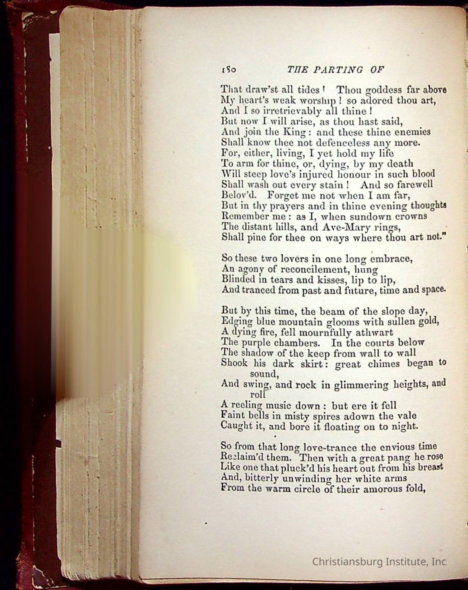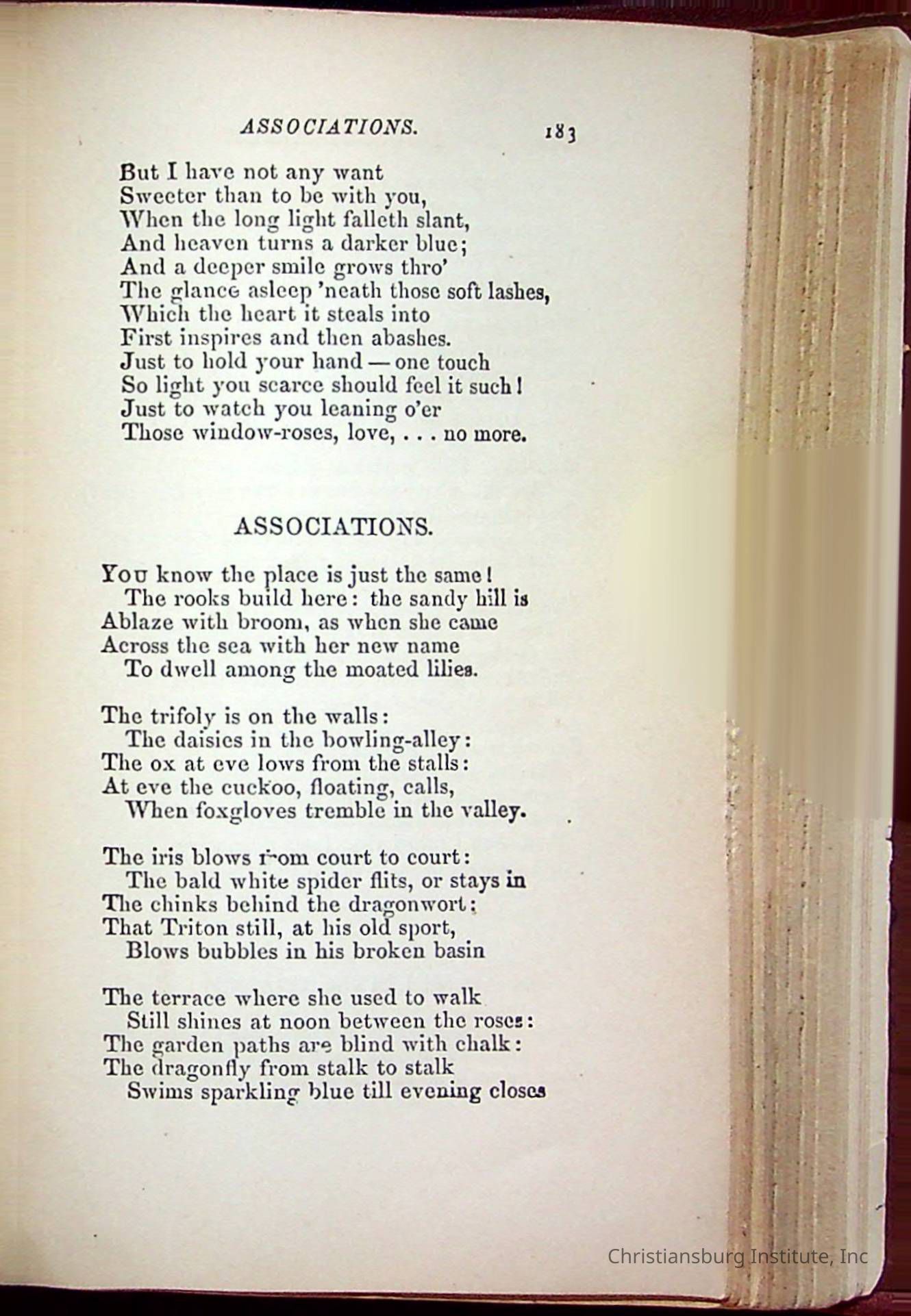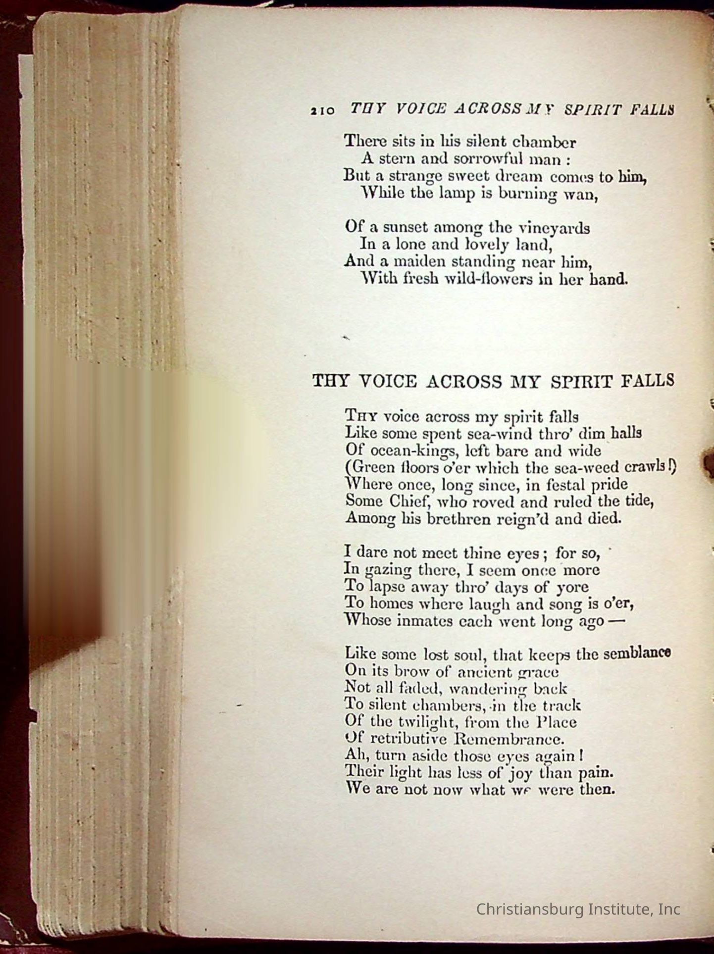 "Poems" written by Owen Meredith and published by James R. Osgood and Company in the year 1875. This book was in the Christiansburg Institute library.