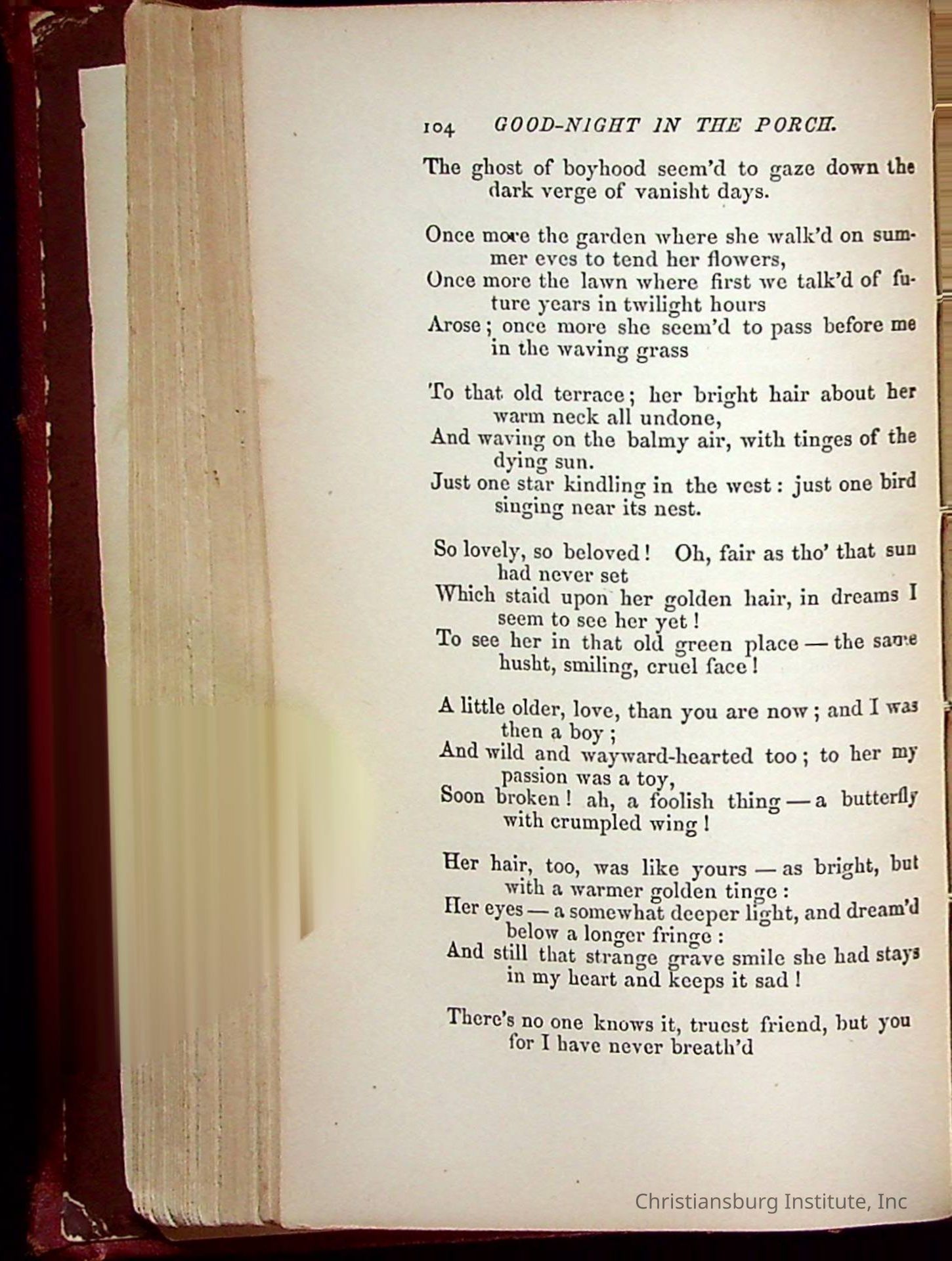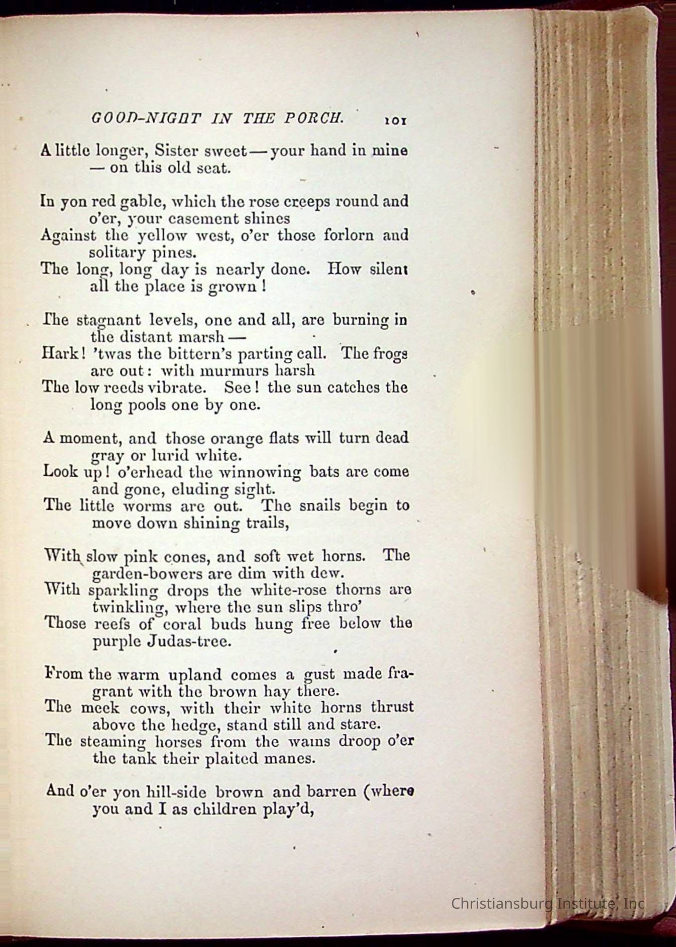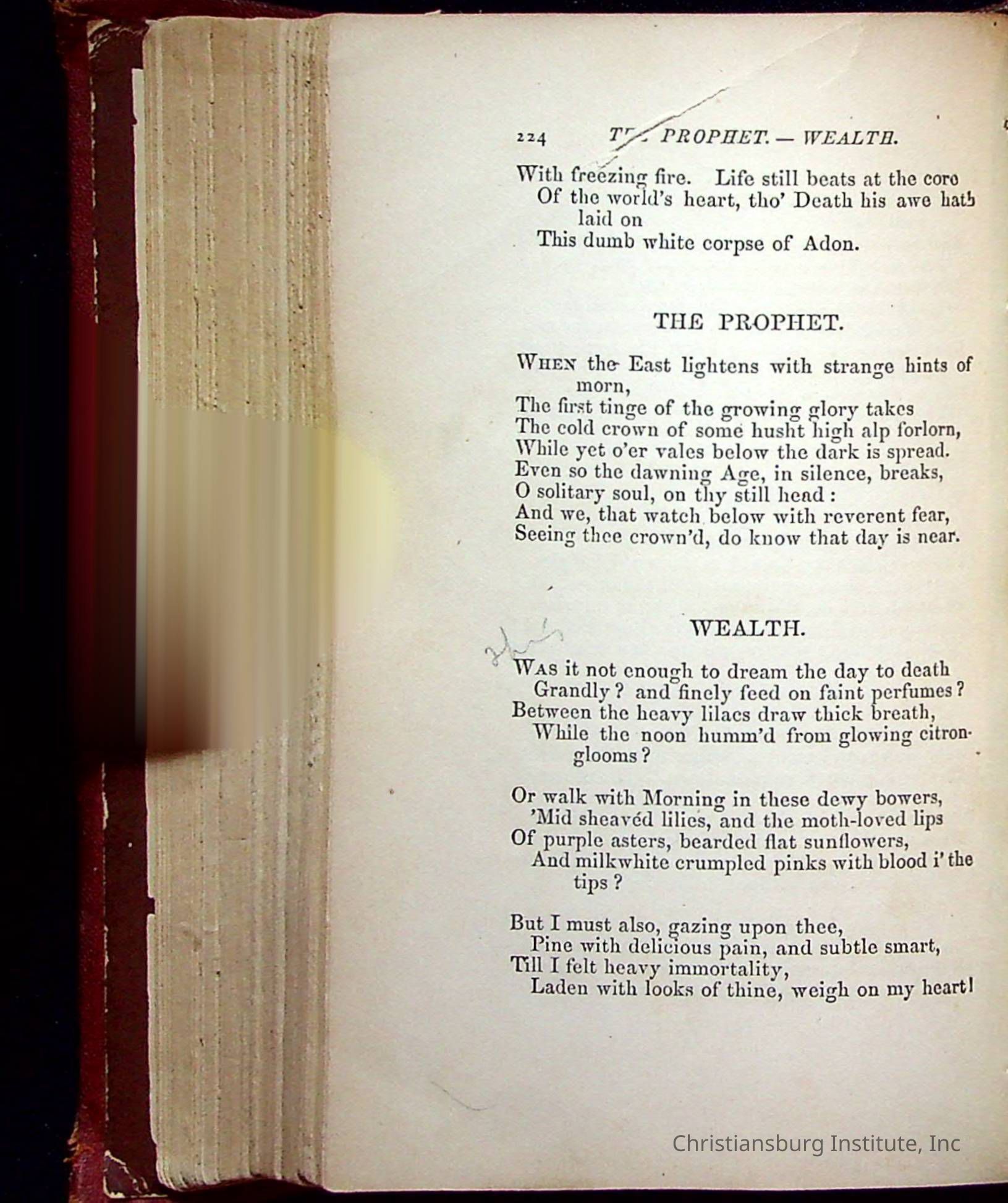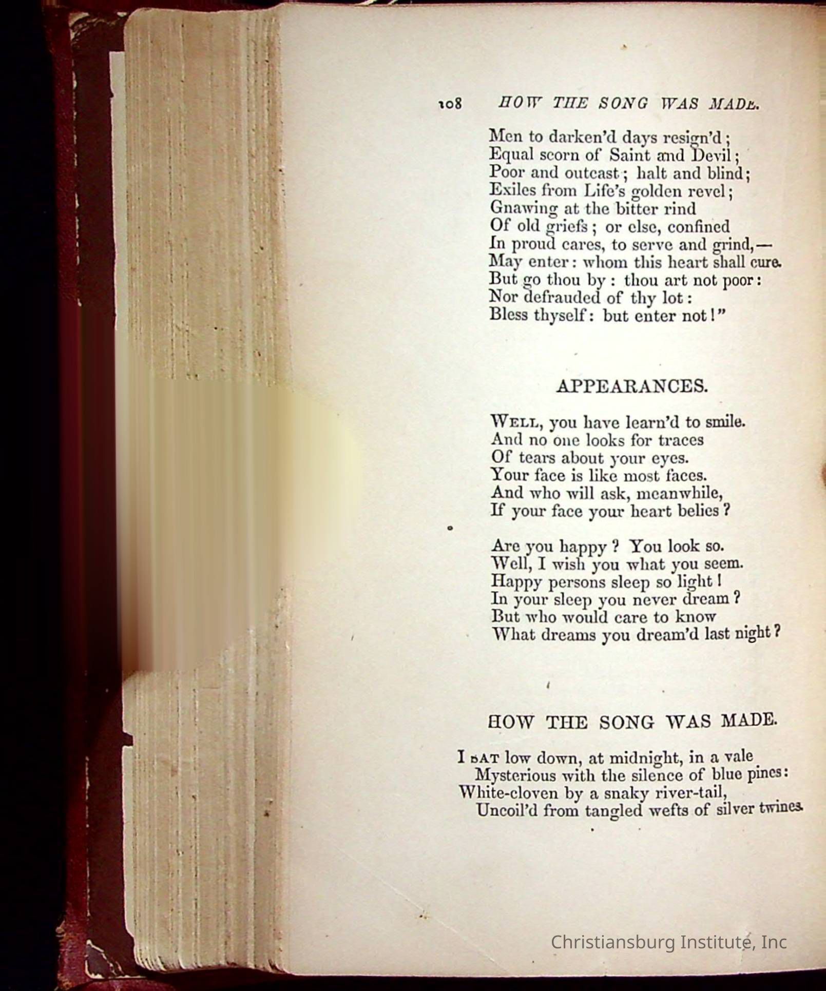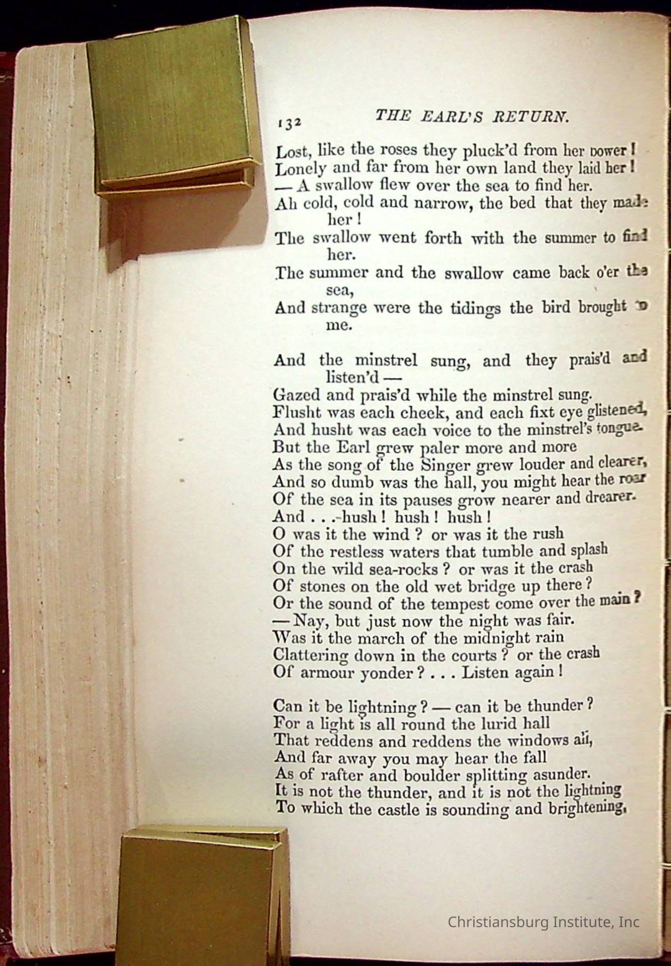 "Poems" written by Owen Meredith and published by James R. Osgood and Company in the year 1875. This book was in the Christiansburg Institute library.
