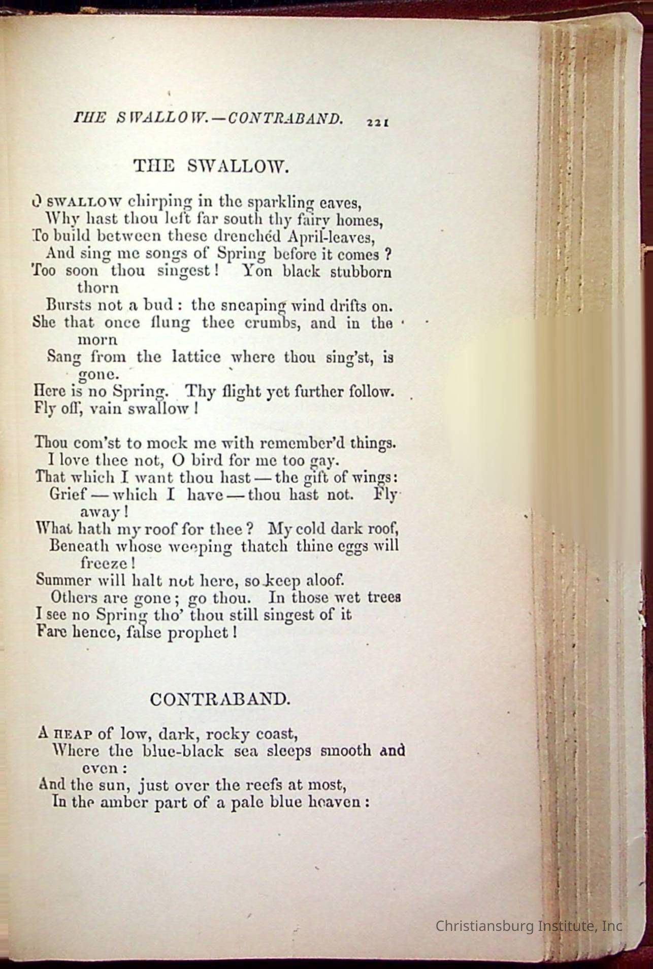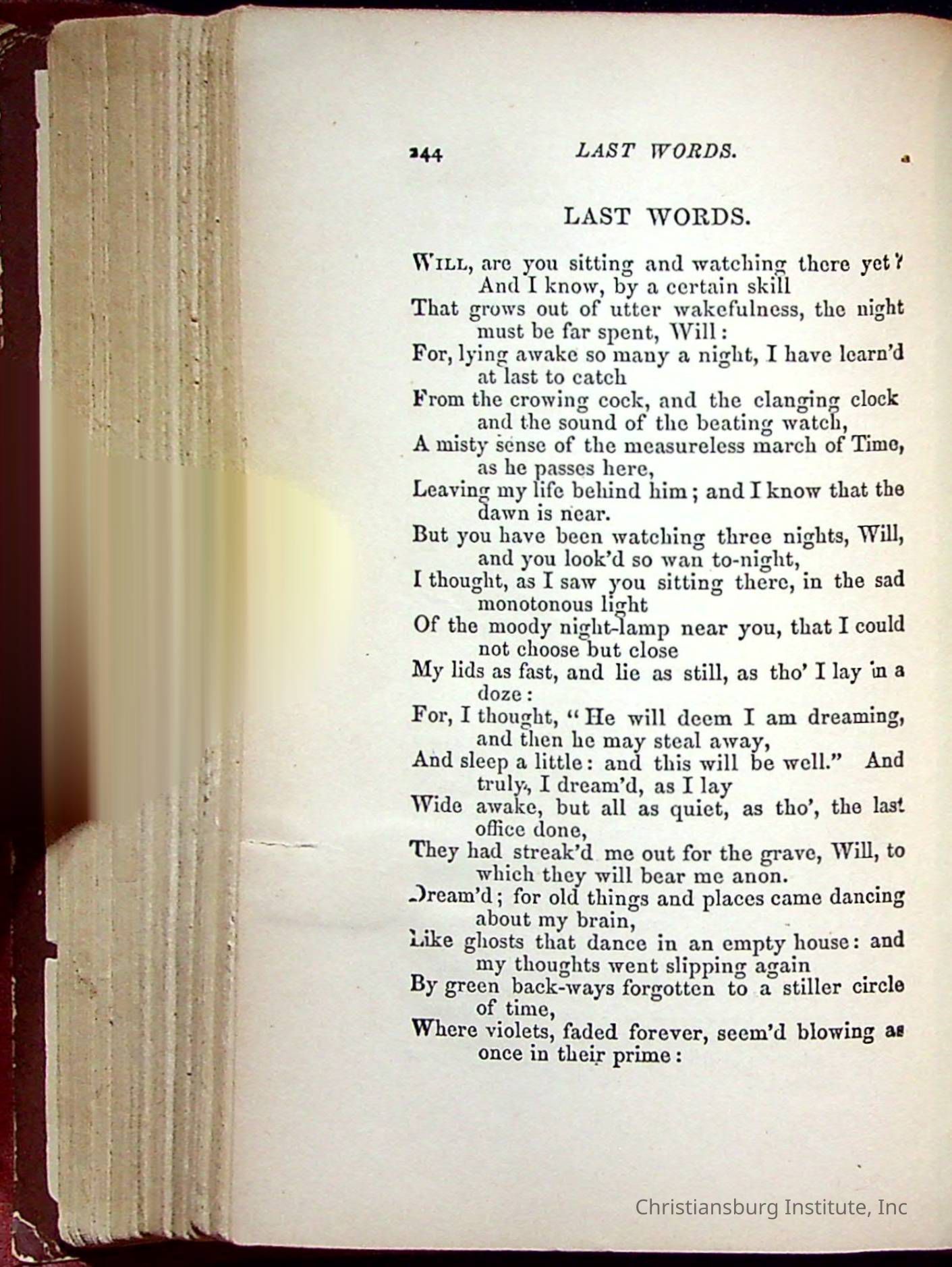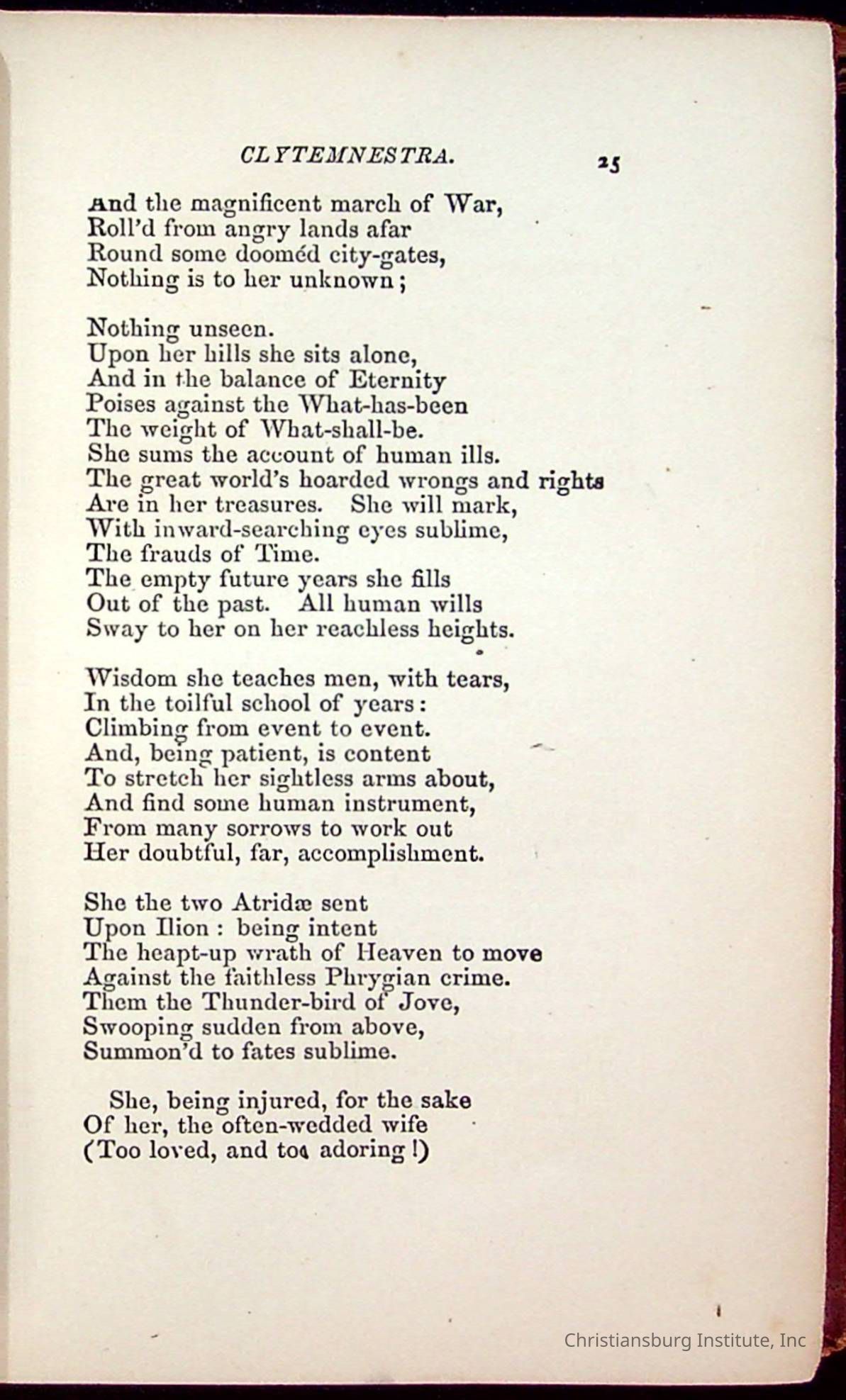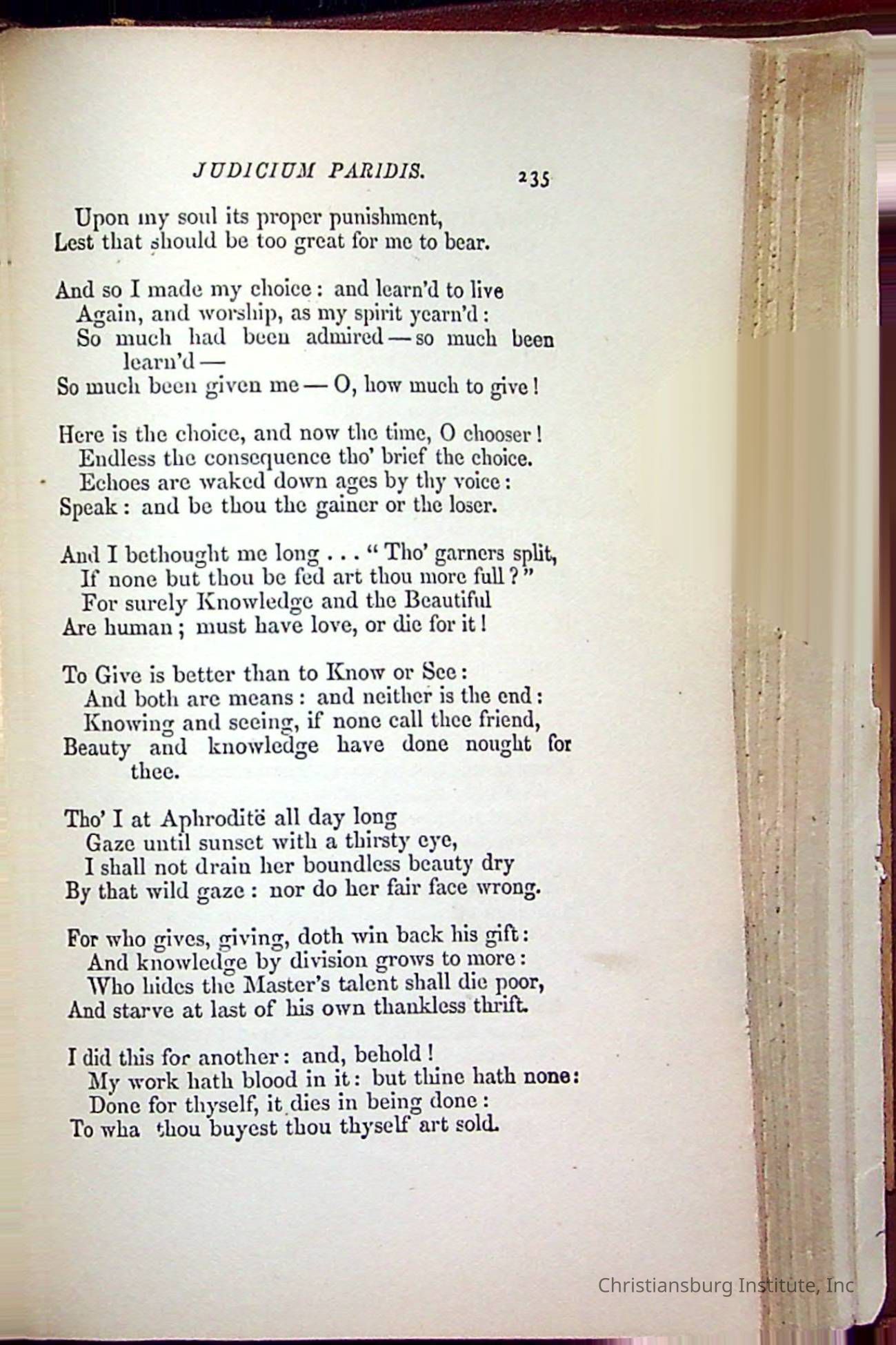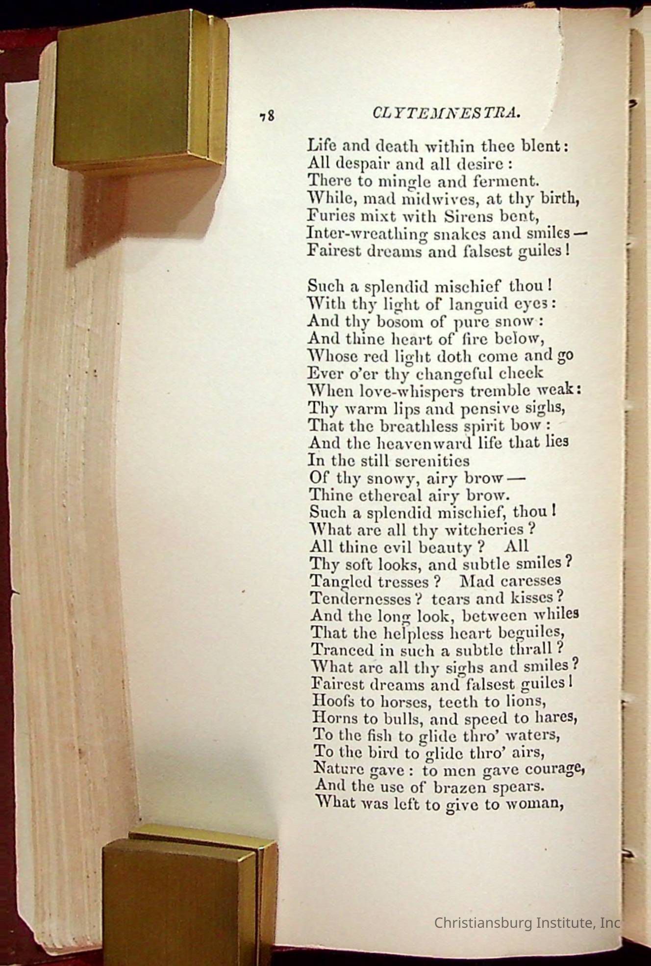 "Poems" written by Owen Meredith and published by James R. Osgood and Company in the year 1875. This book was in the Christiansburg Institute library.