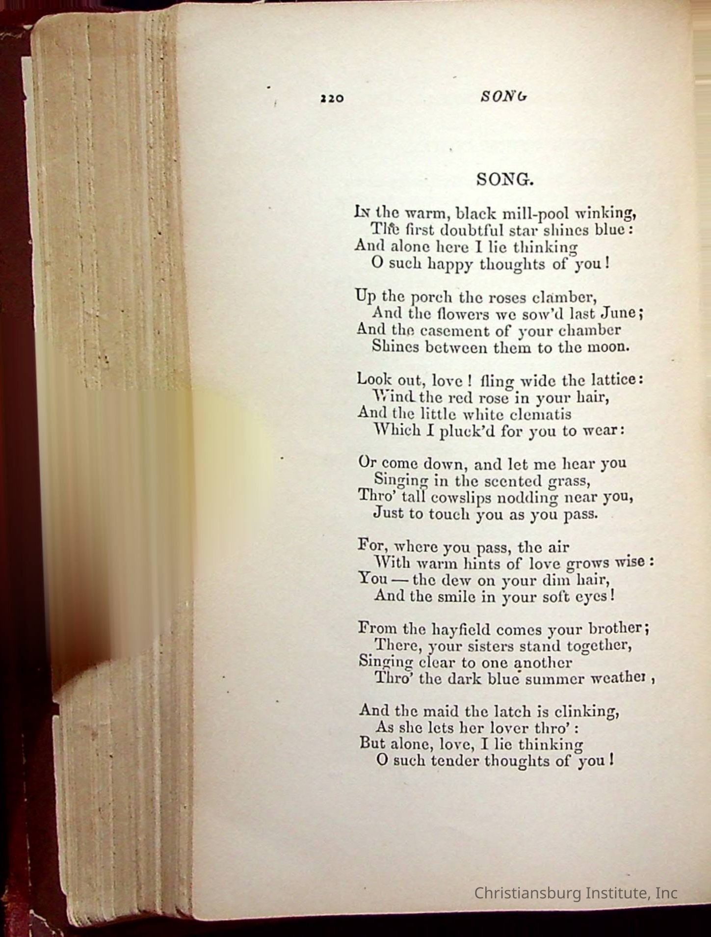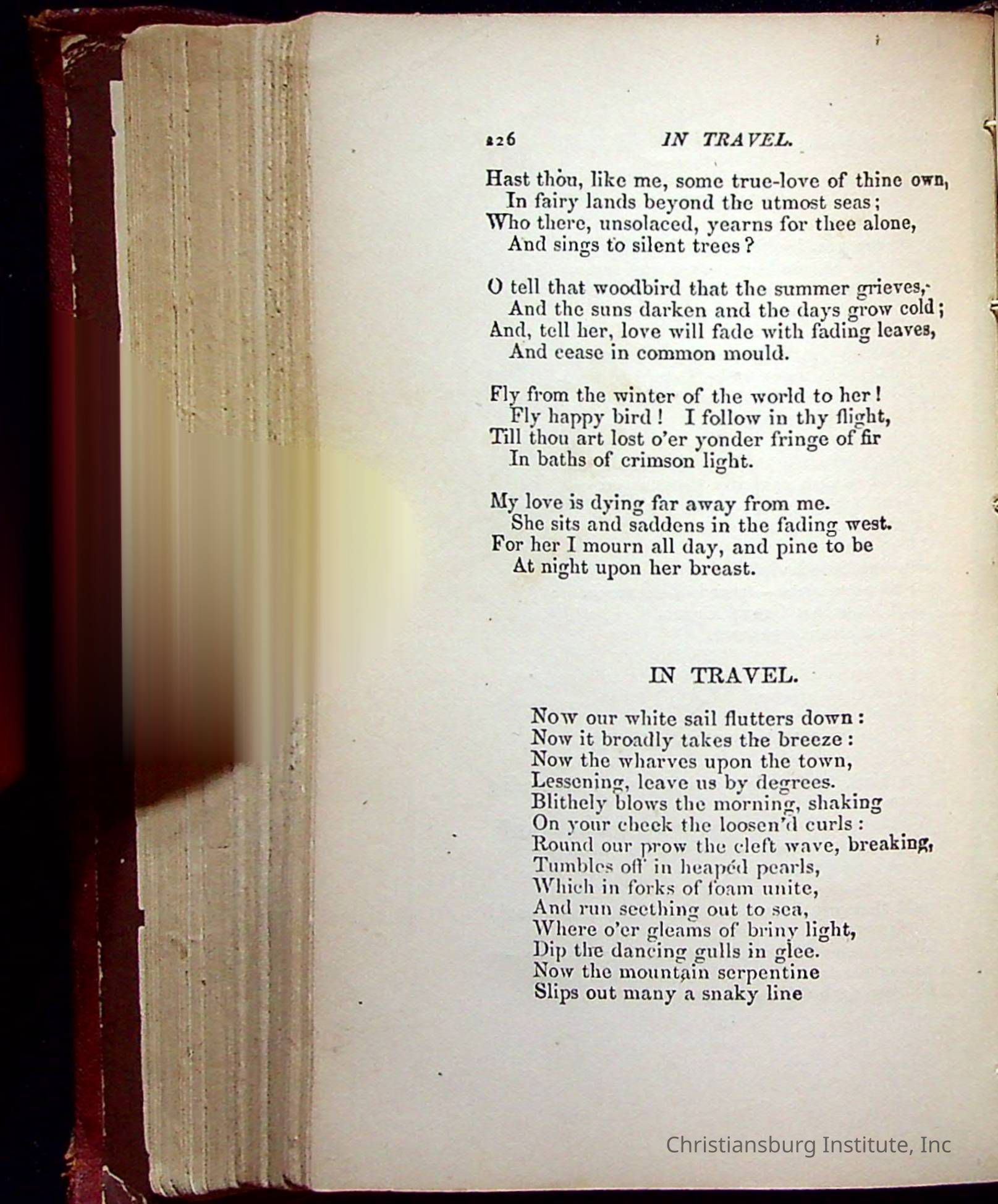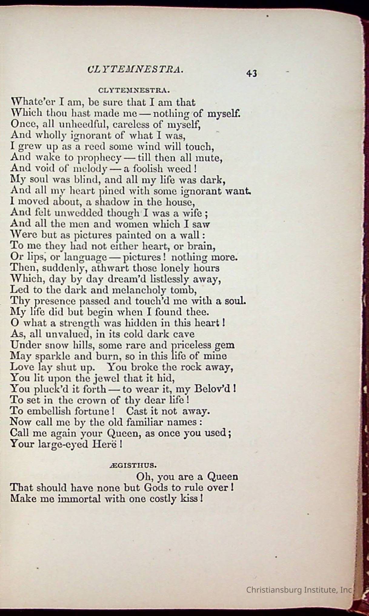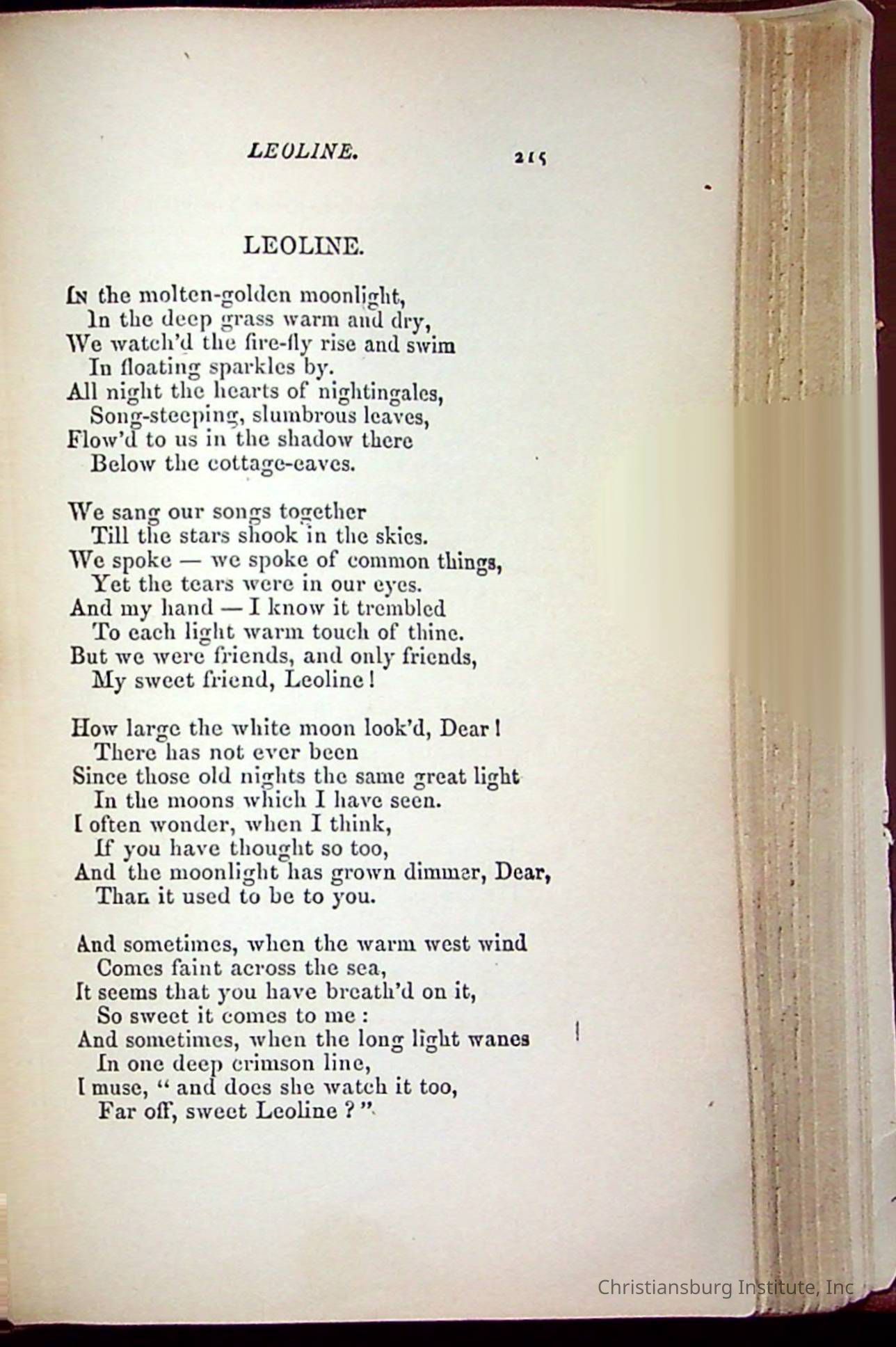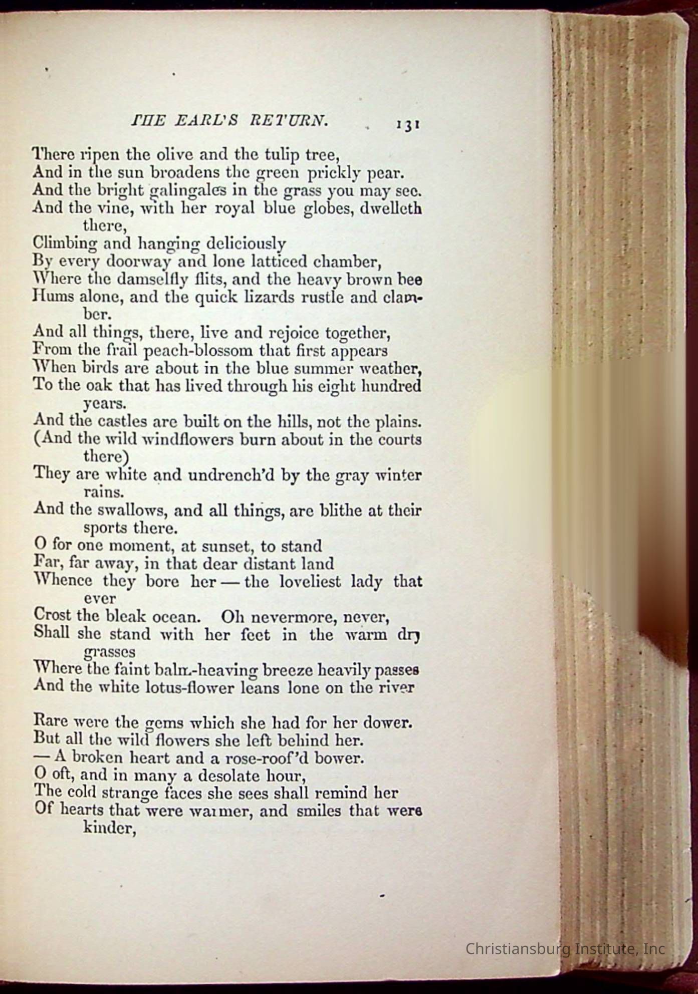 "Poems" written by Owen Meredith and published by James R. Osgood and Company in the year 1875. This book was in the Christiansburg Institute library.