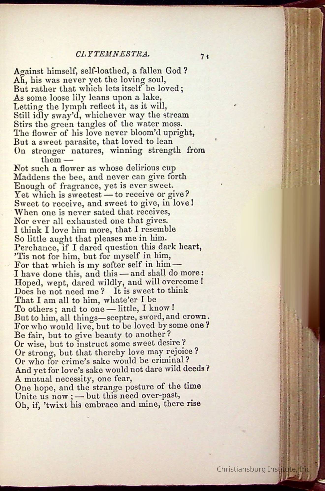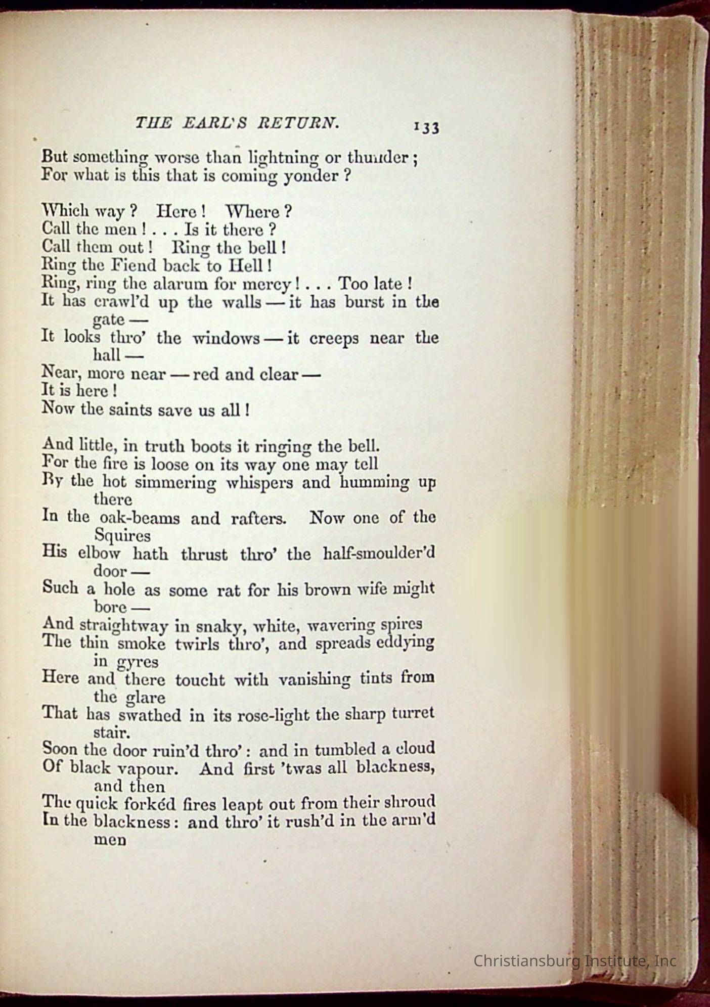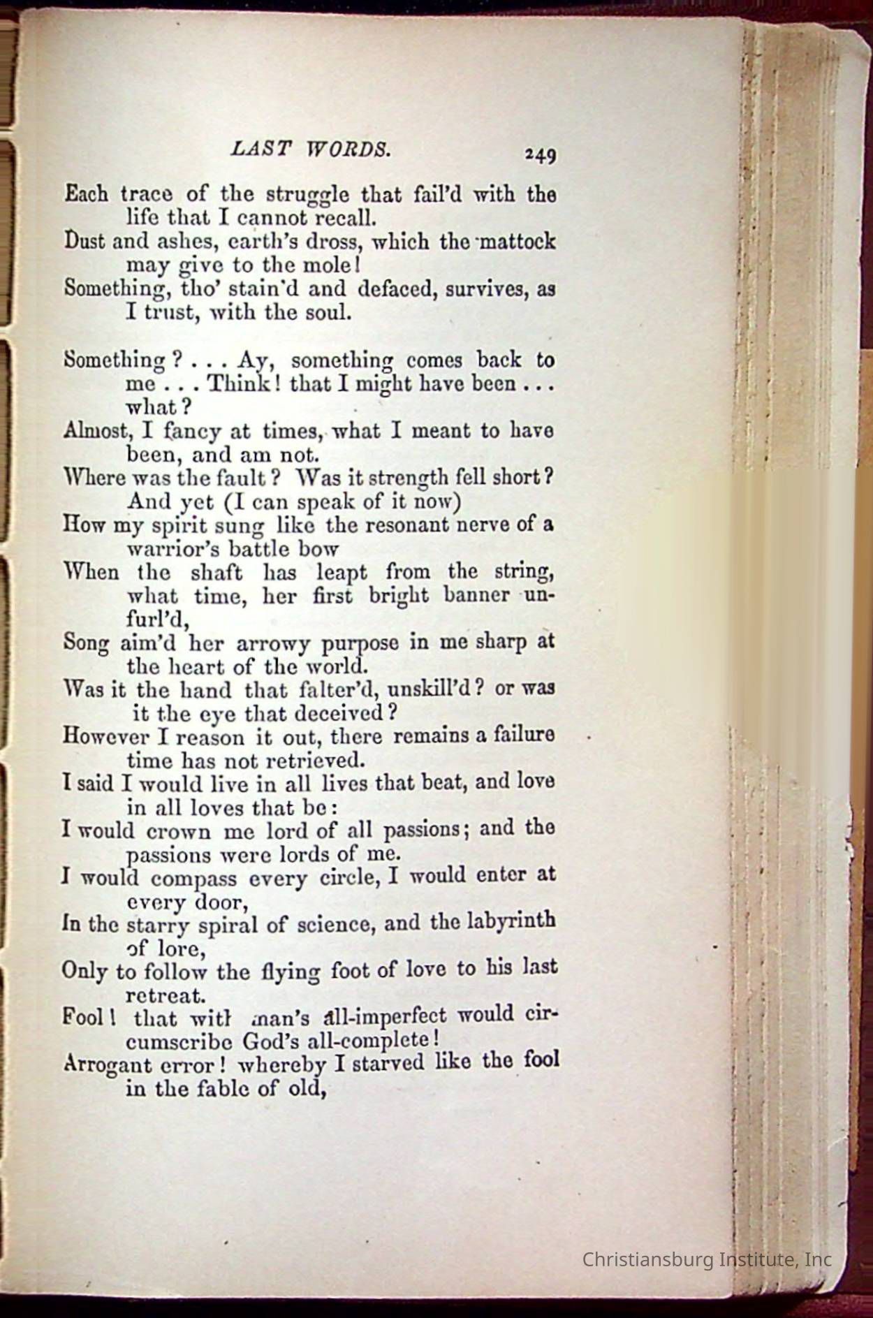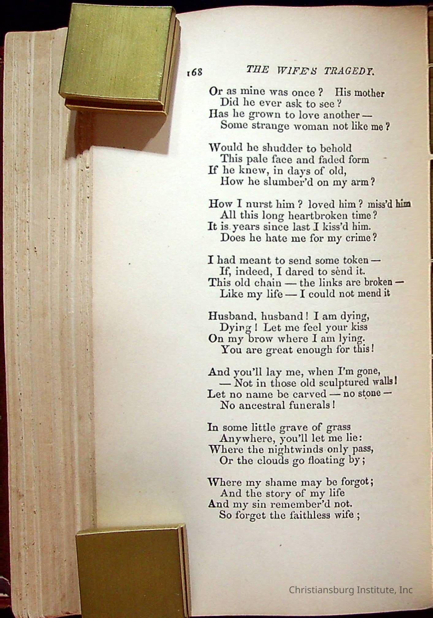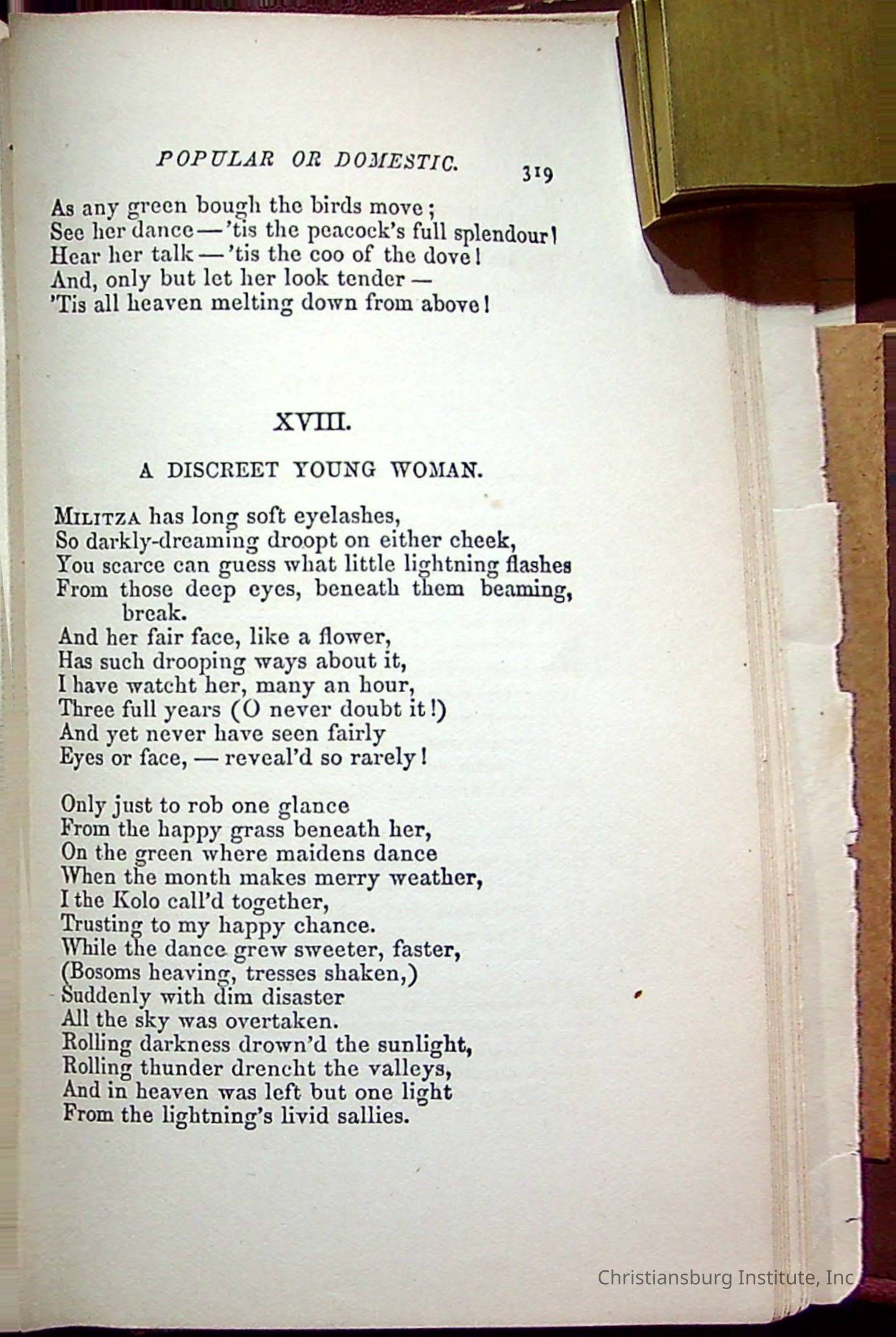"Poems" written by Owen Meredith and published by James R. Osgood and Company in the year 1875. This book was in the Christiansburg Institute library.