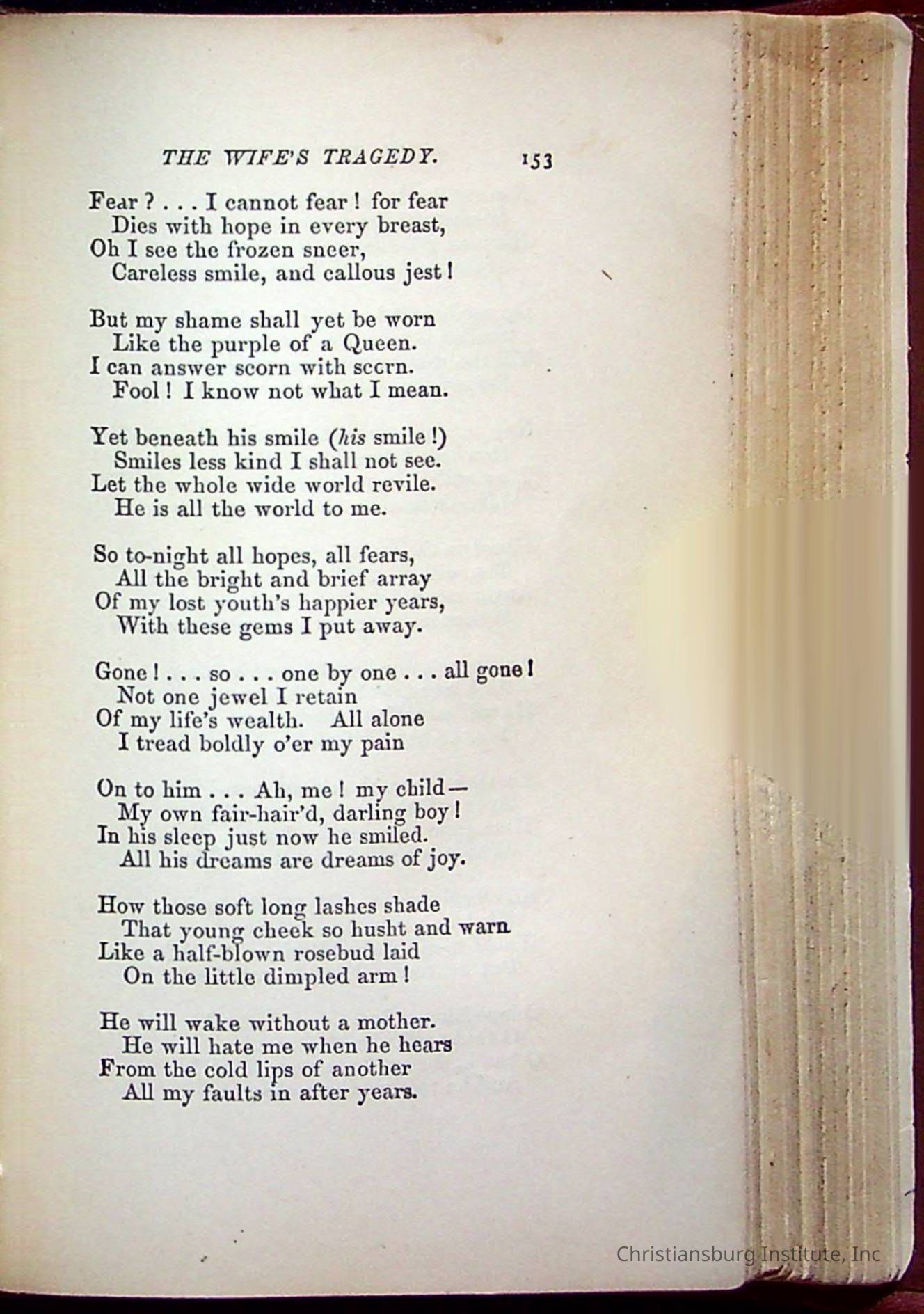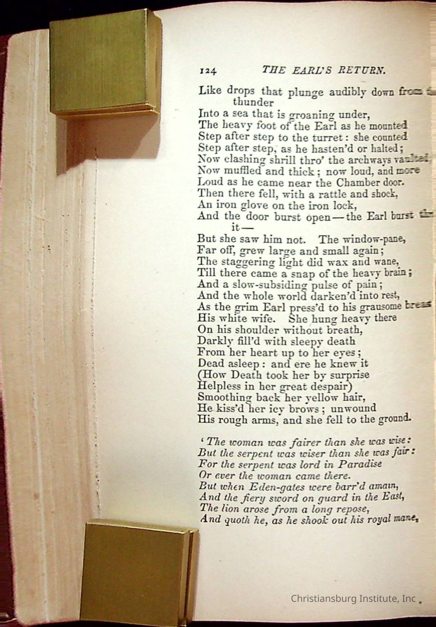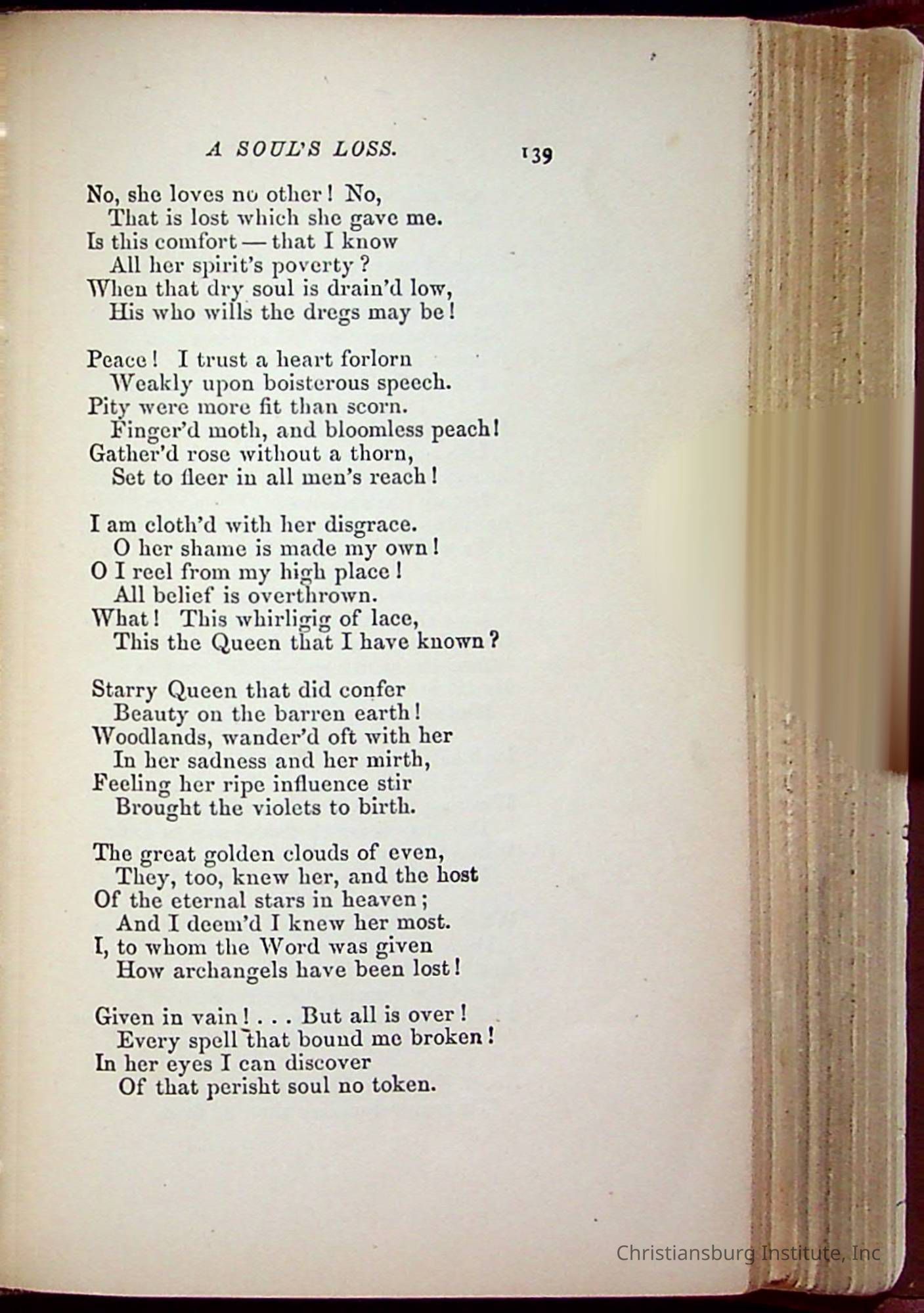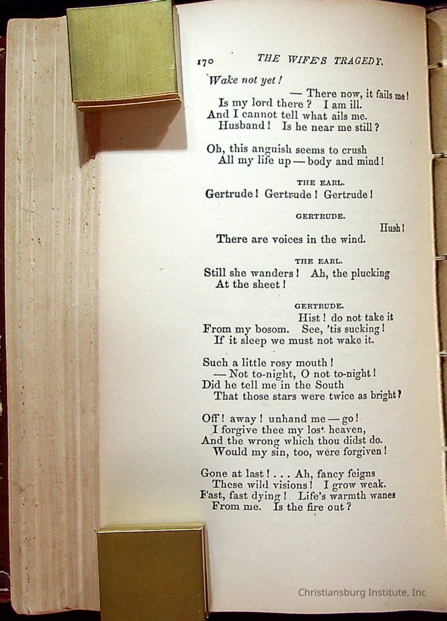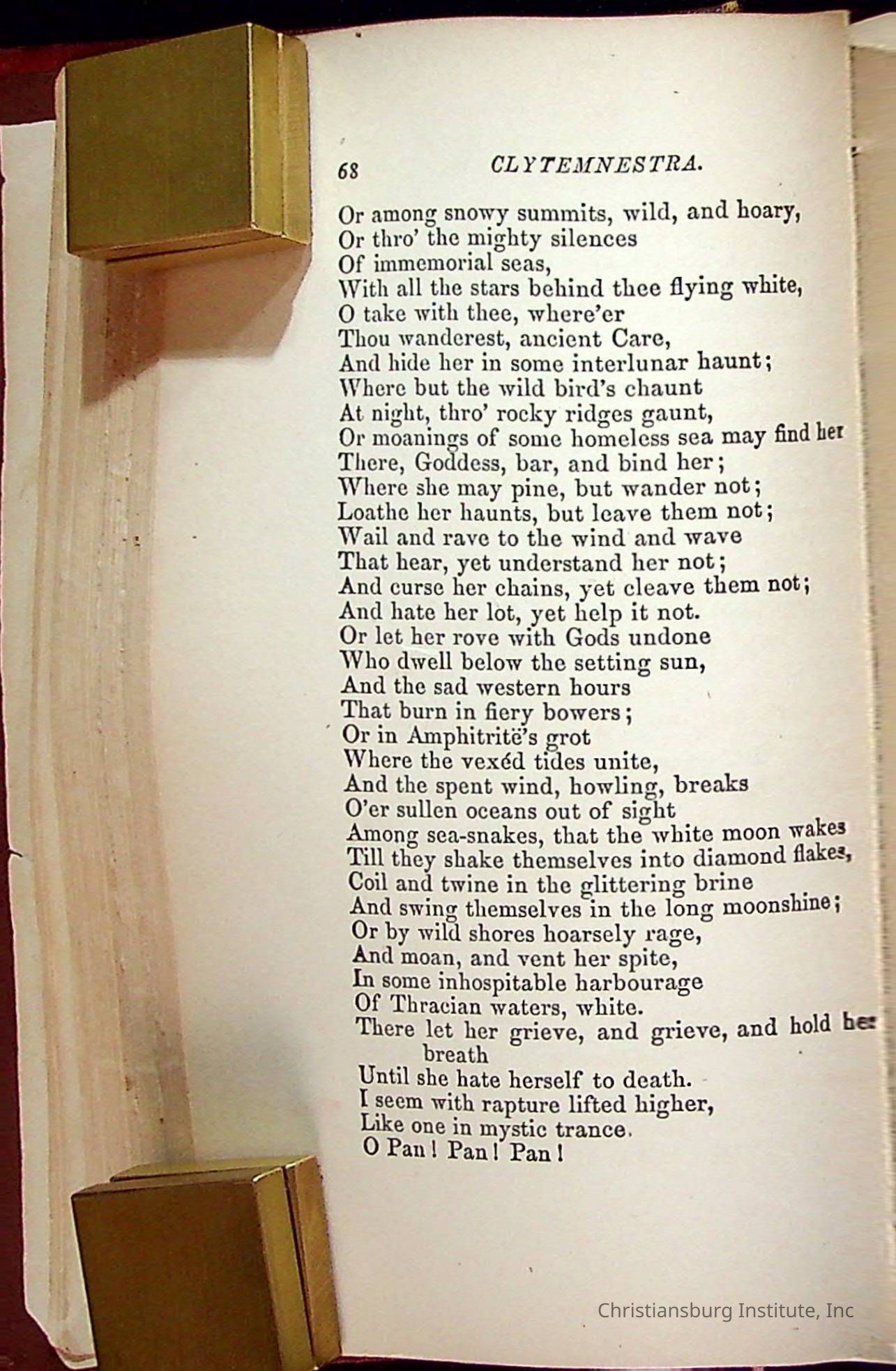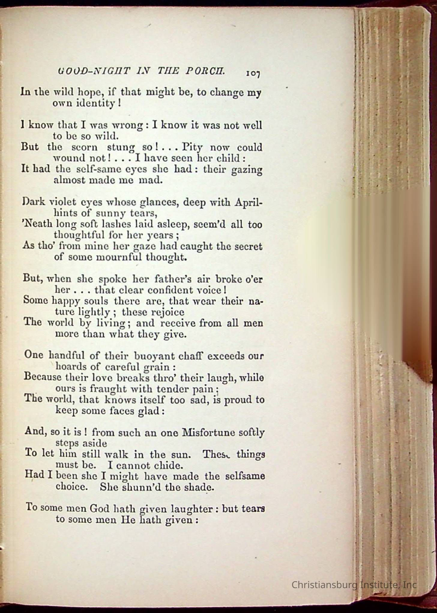 "Poems" written by Owen Meredith and published by James R. Osgood and Company in the year 1875. This book was in the Christiansburg Institute library.