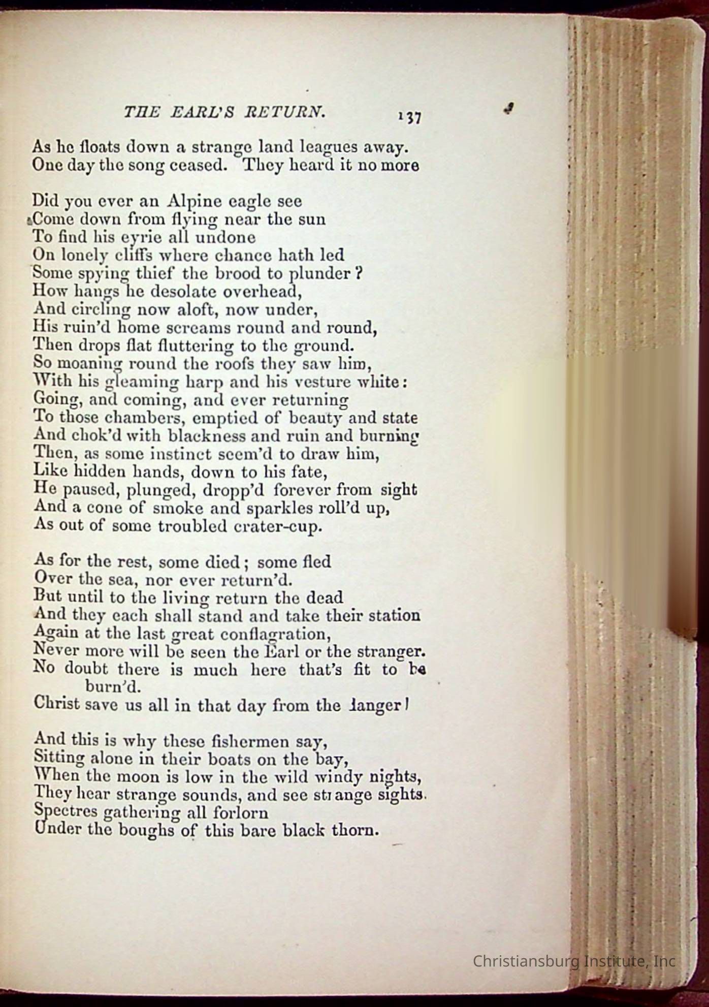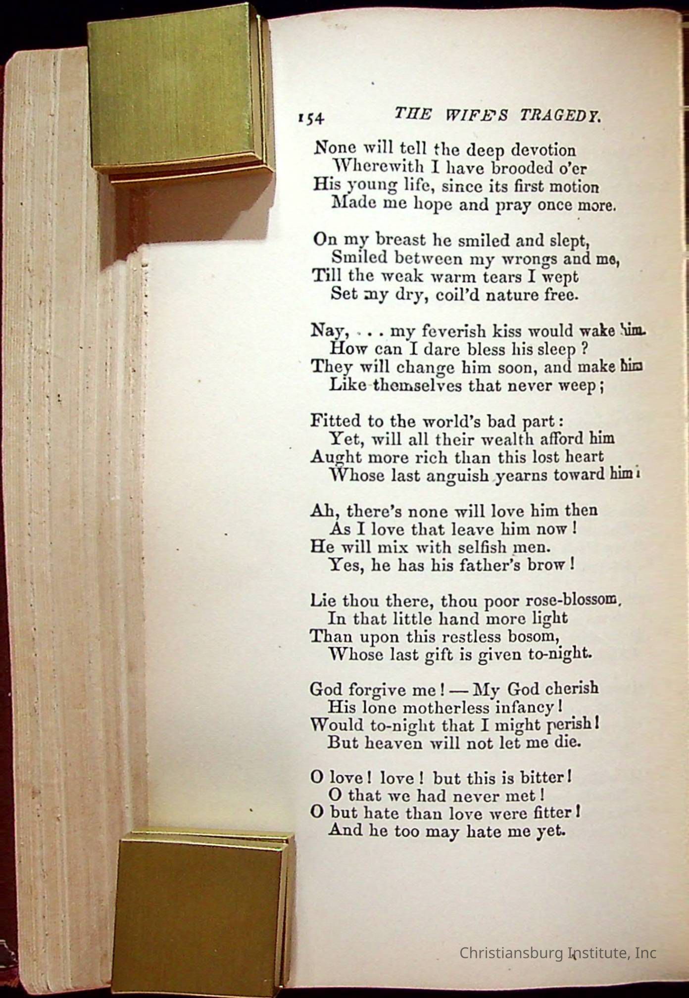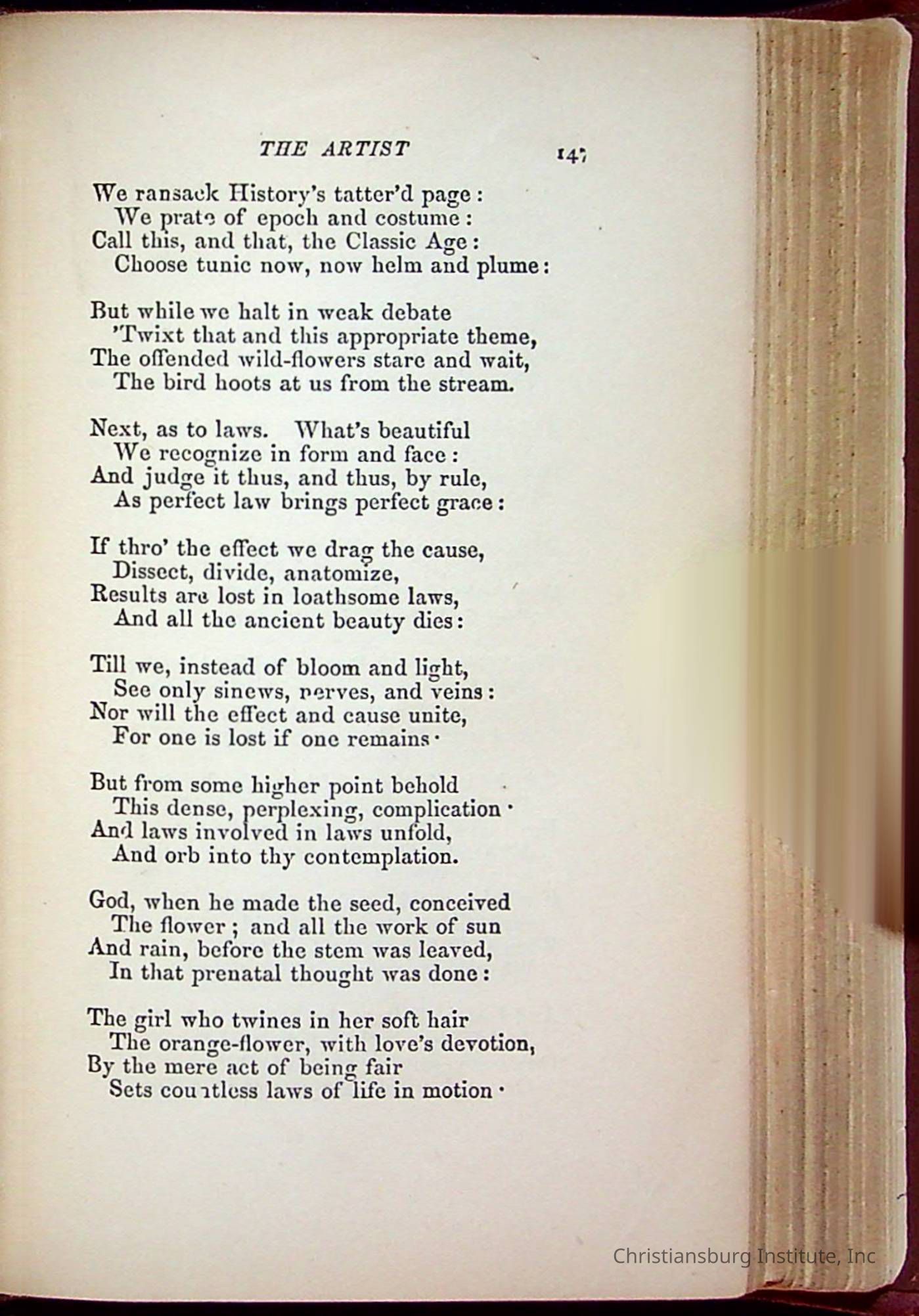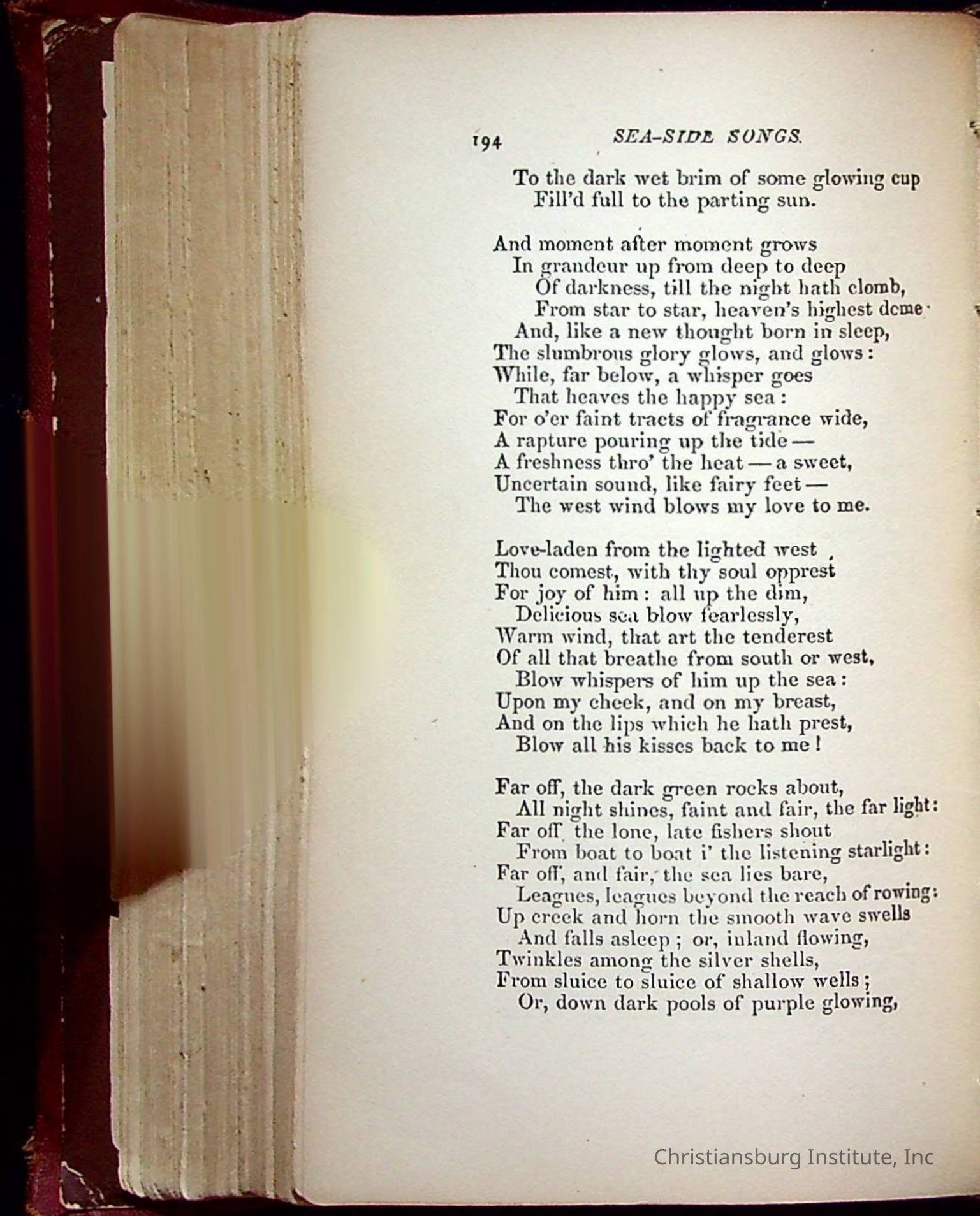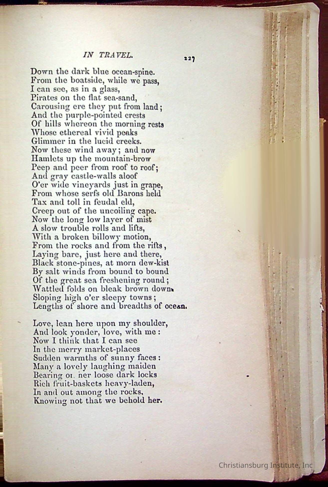 "Poems" written by Owen Meredith and published by James R. Osgood and Company in the year 1875. This book was in the Christiansburg Institute library.
