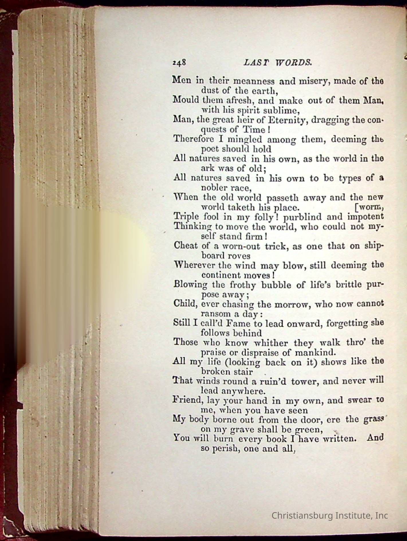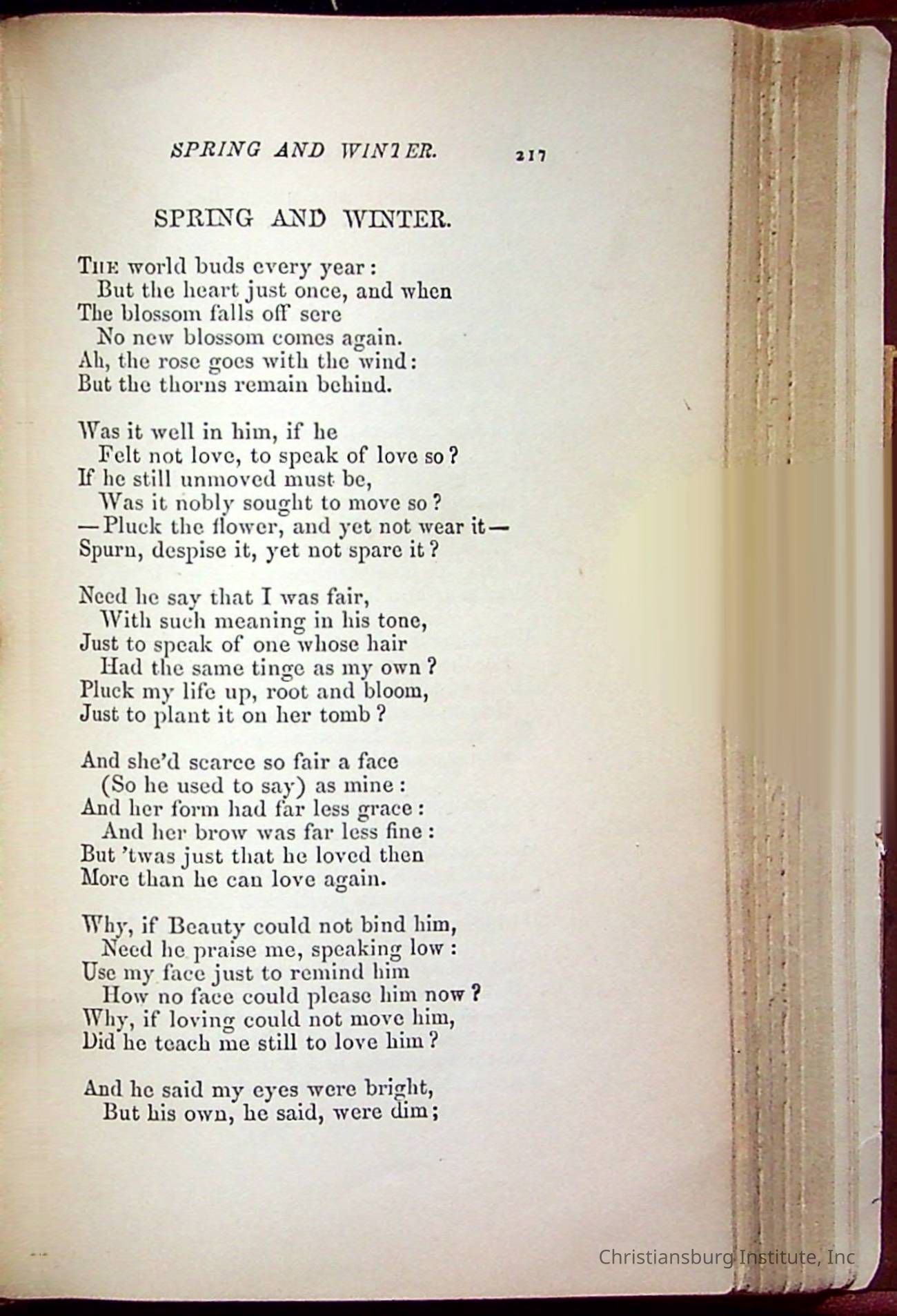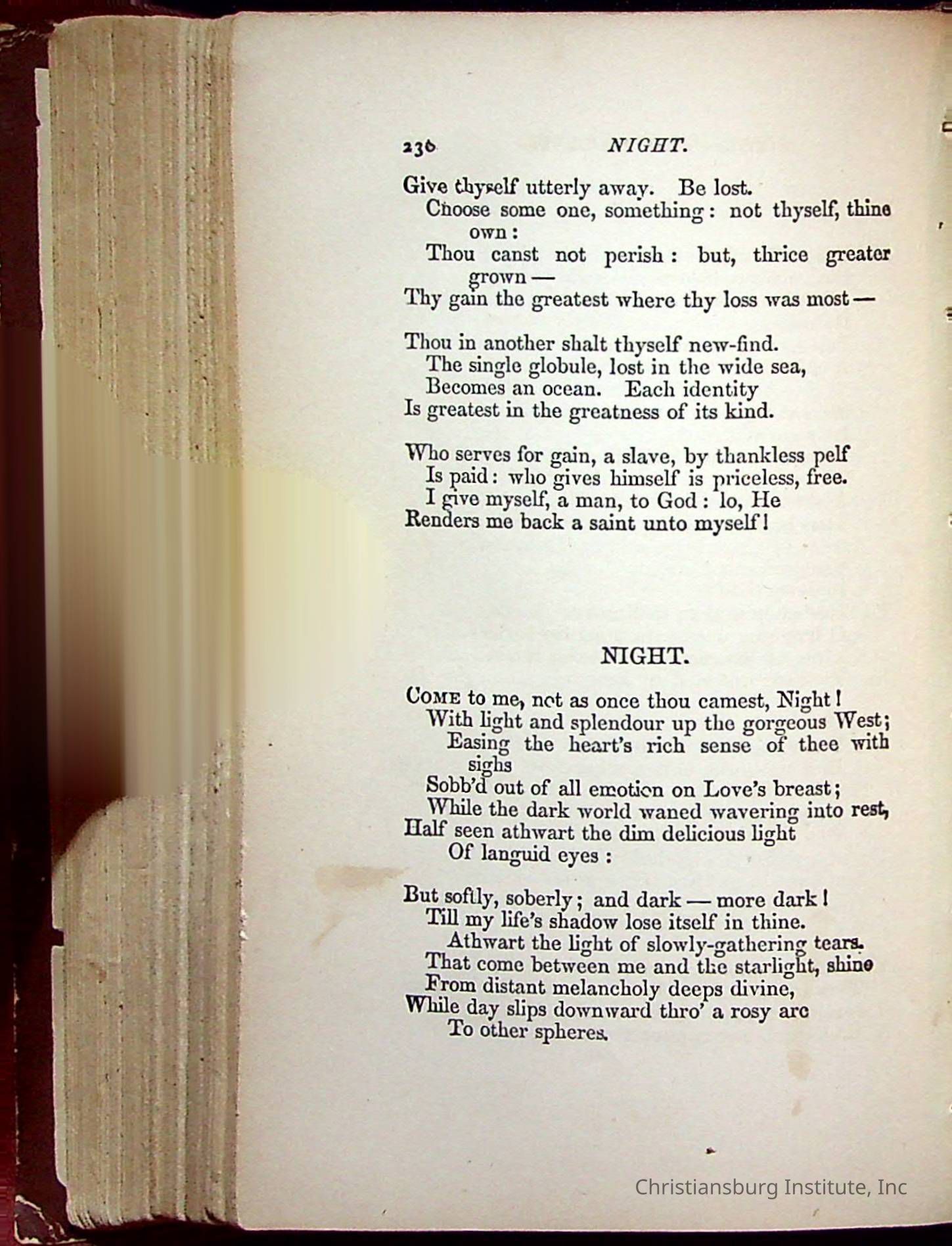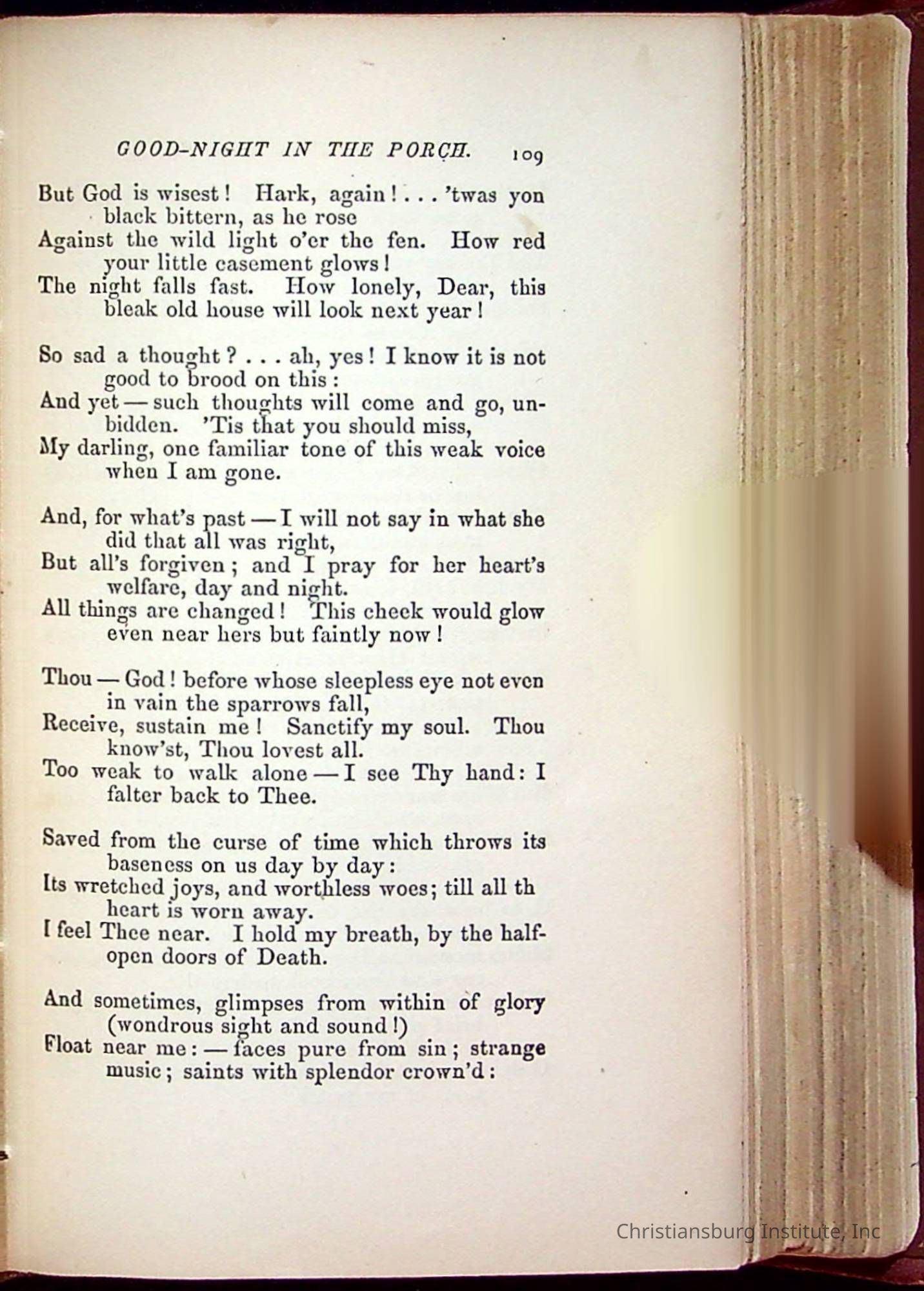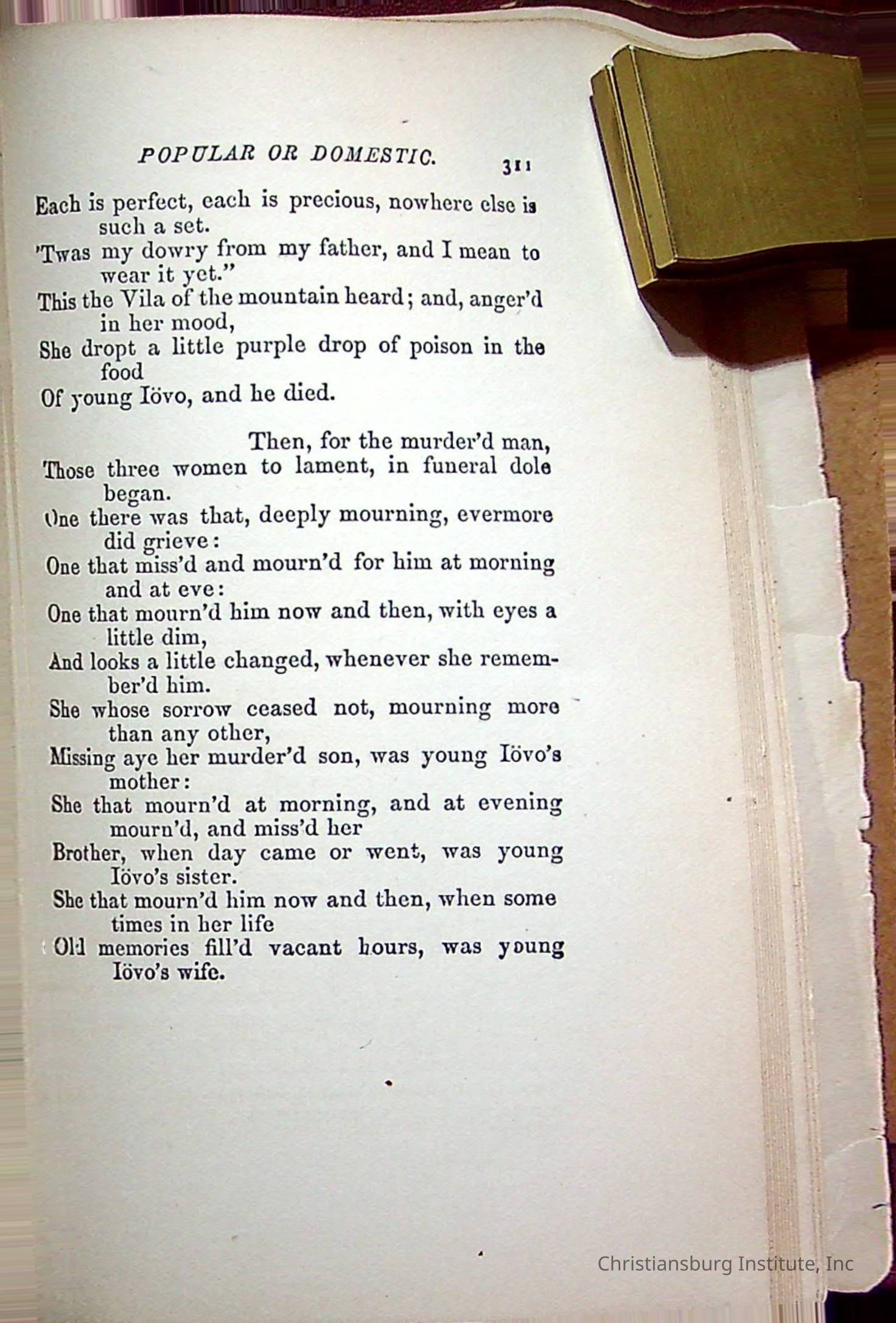 "Poems" written by Owen Meredith and published by James R. Osgood and Company in the year 1875. This book was in the Christiansburg Institute library.