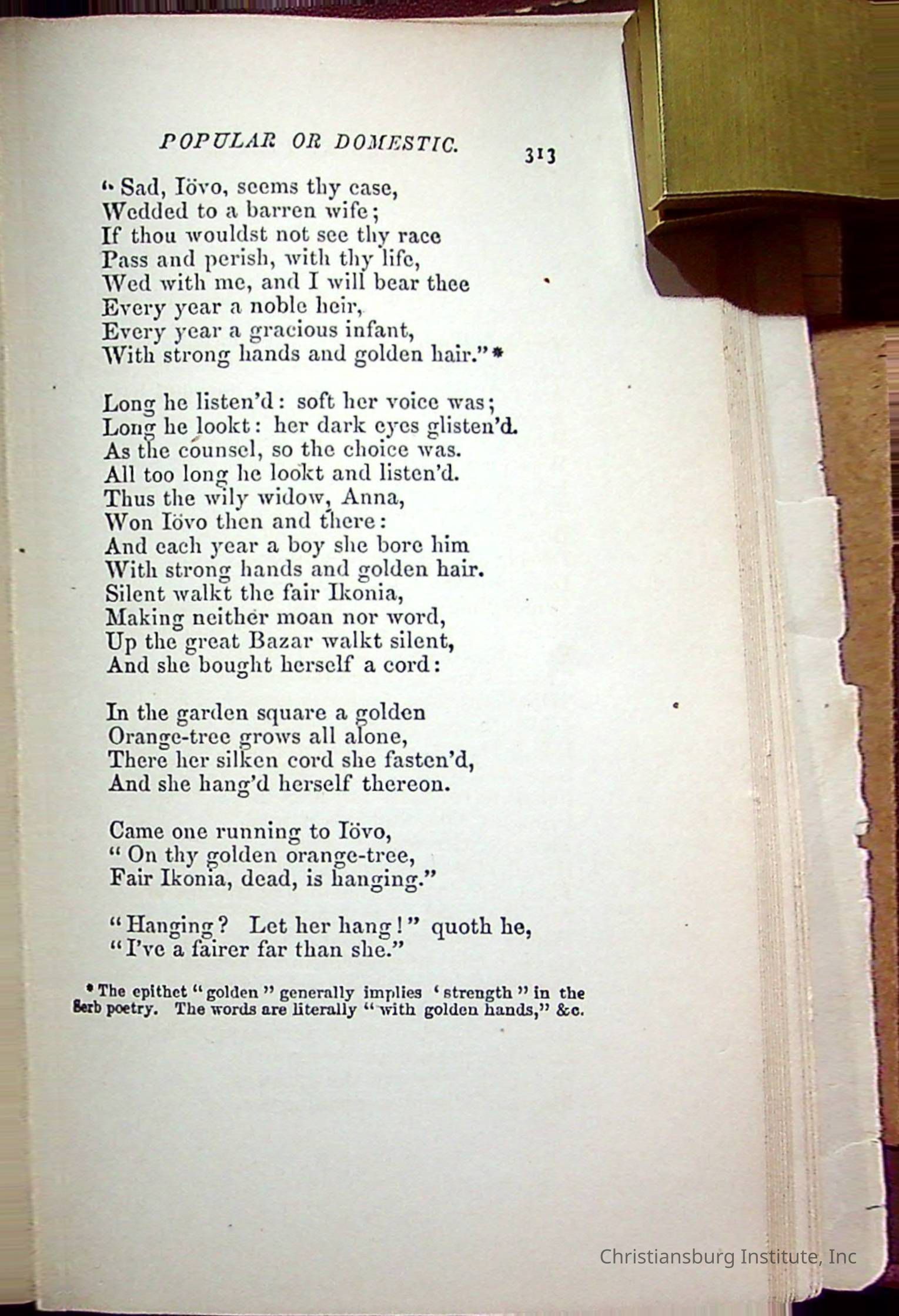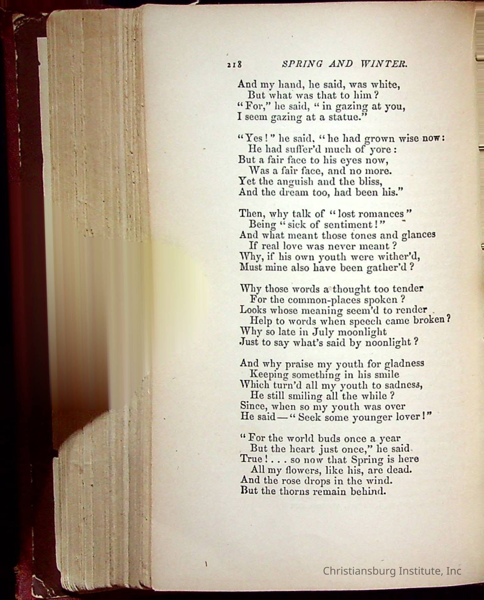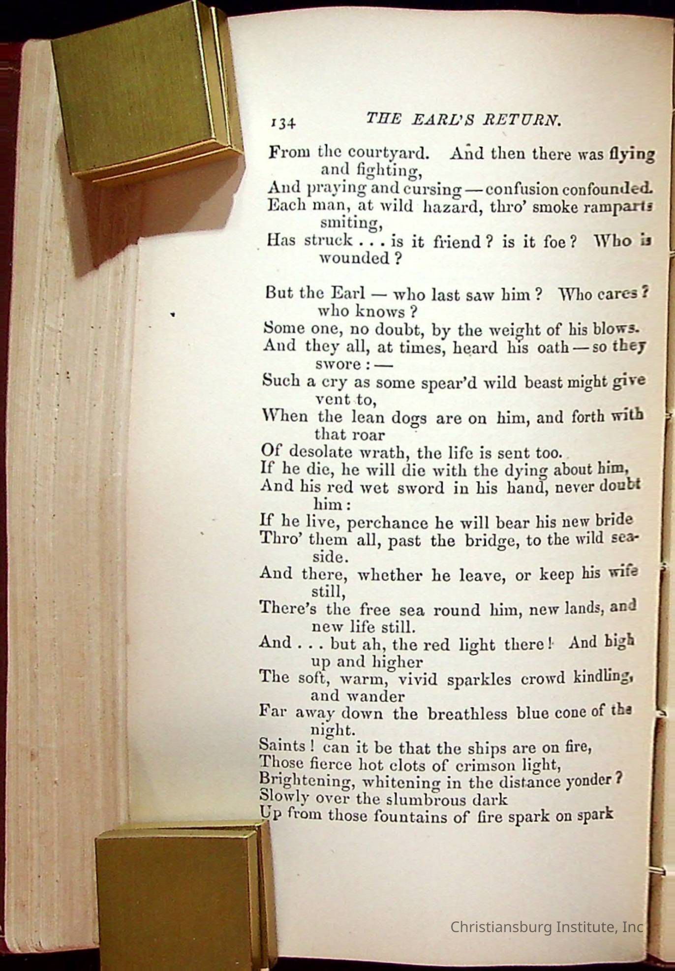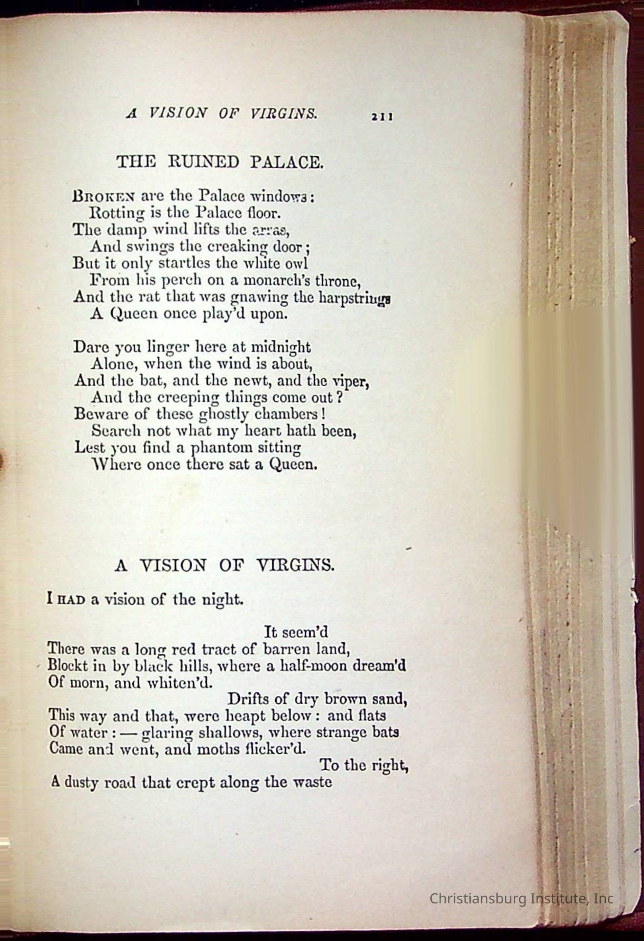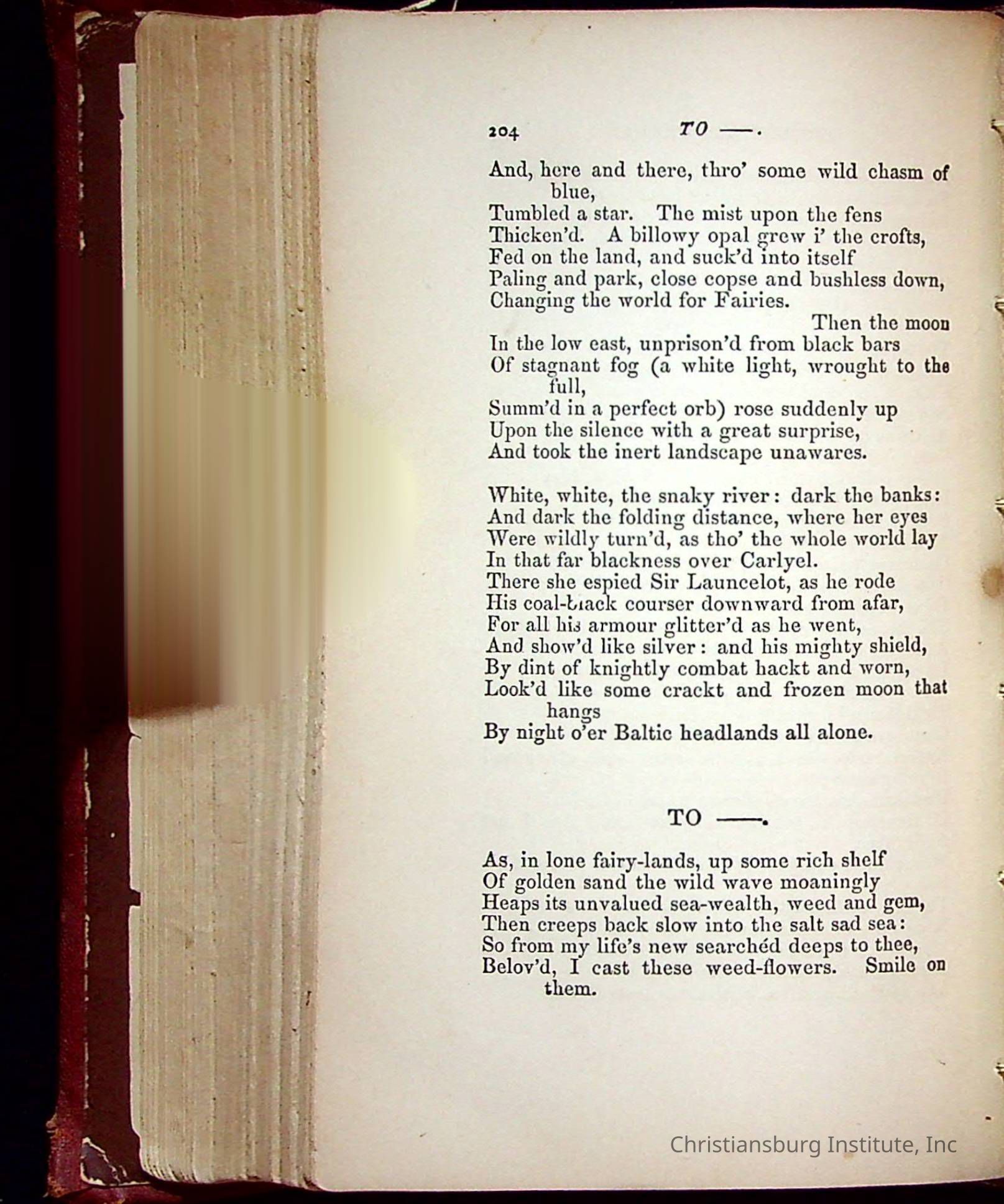 "Poems" written by Owen Meredith and published by James R. Osgood and Company in the year 1875. This book was in the Christiansburg Institute library.