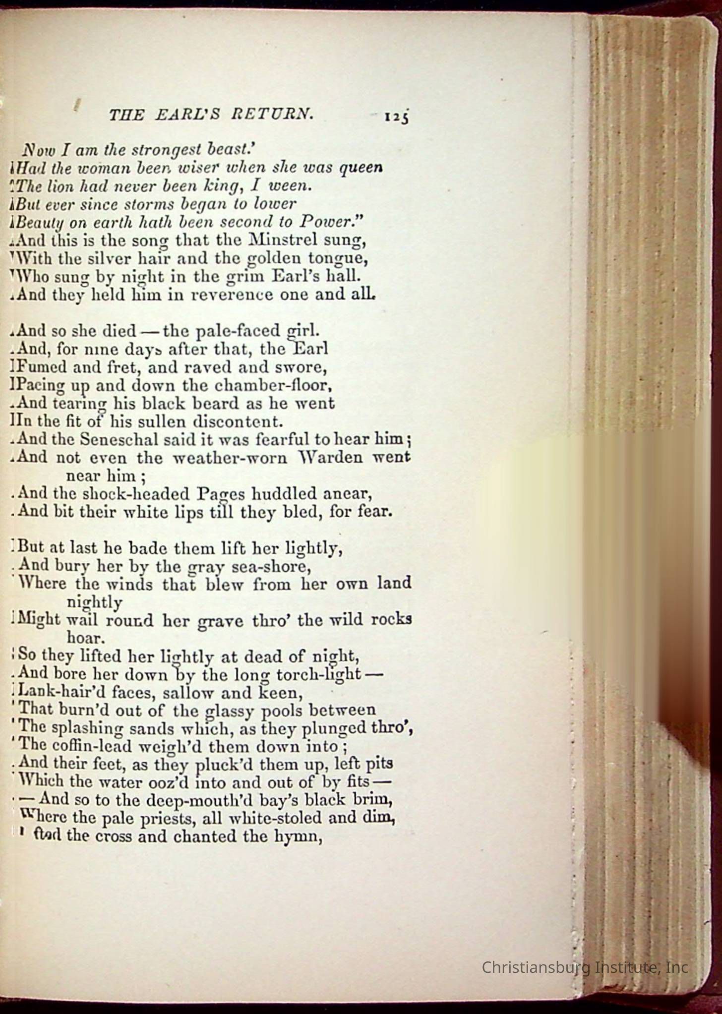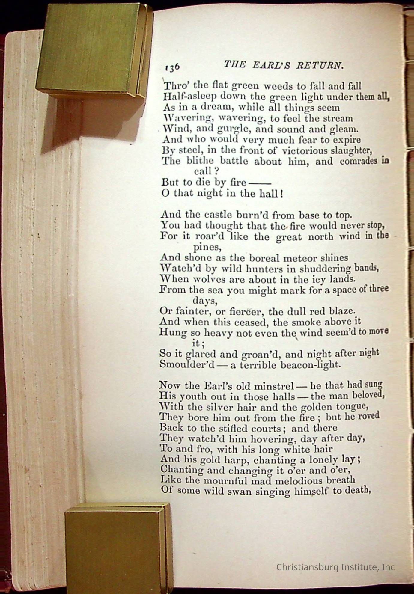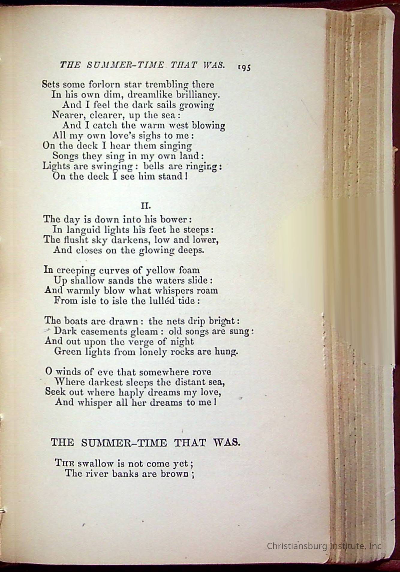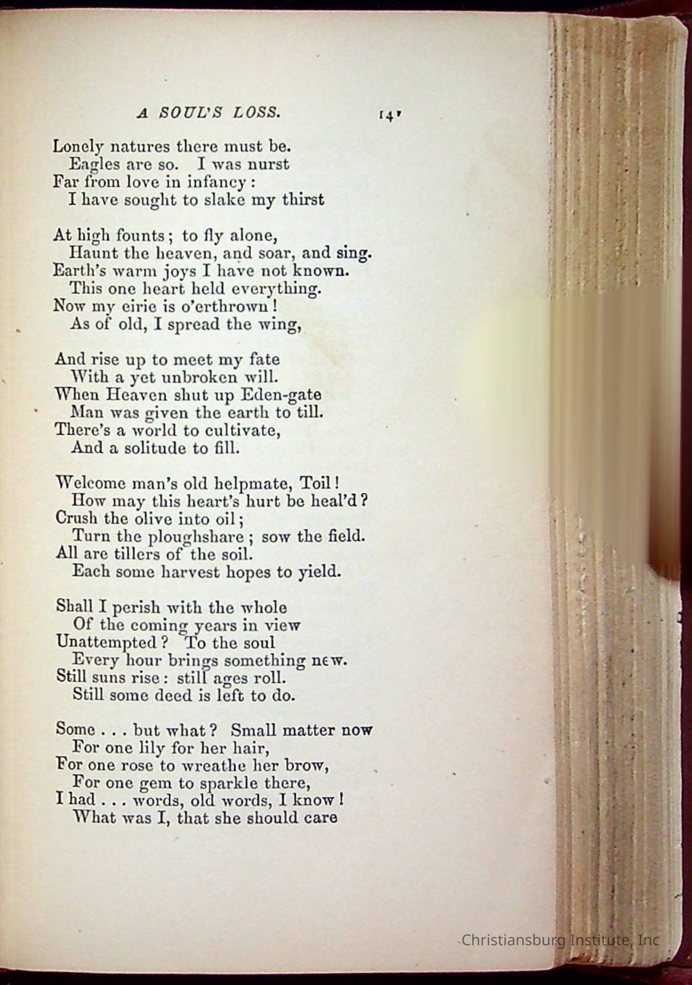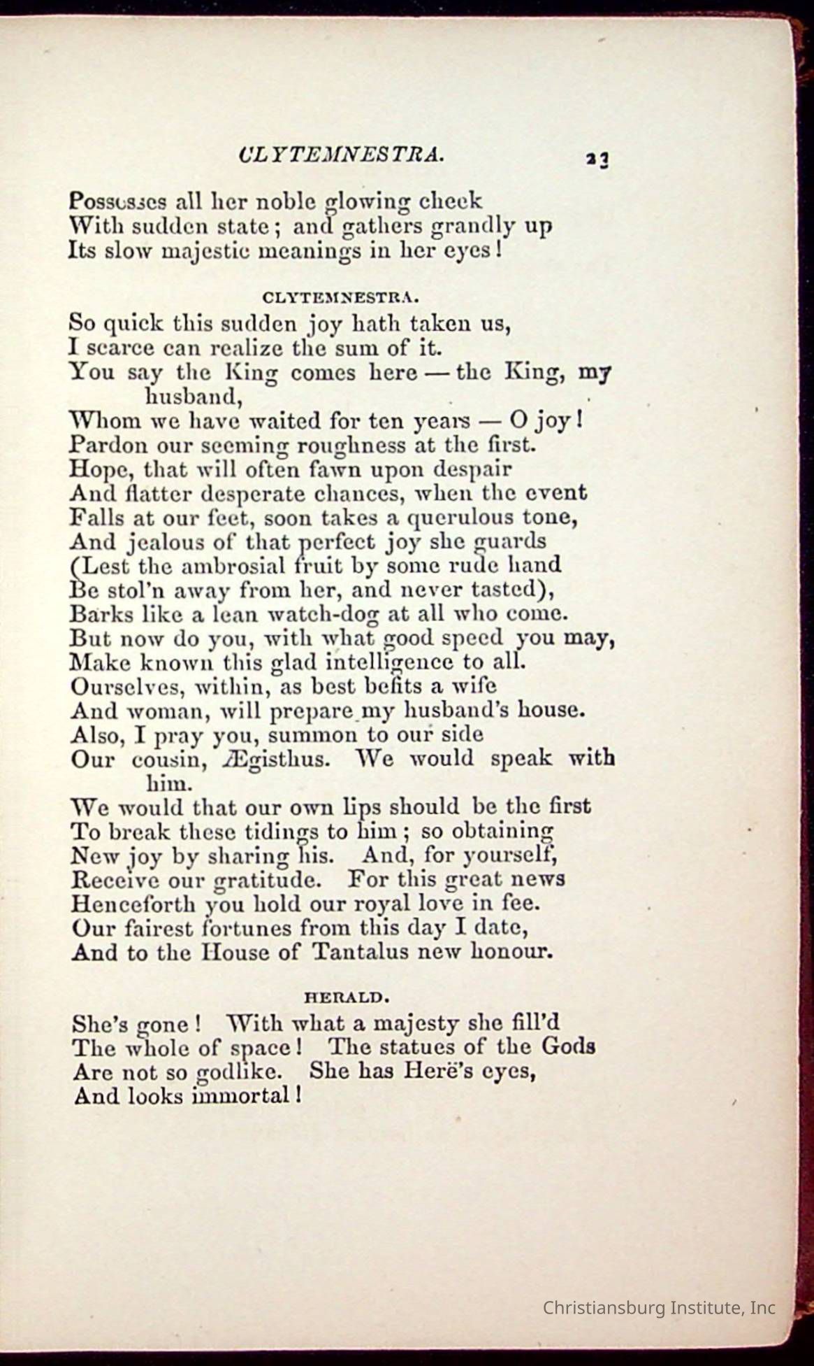 "Poems" written by Owen Meredith and published by James R. Osgood and Company in the year 1875. This book was in the Christiansburg Institute library.