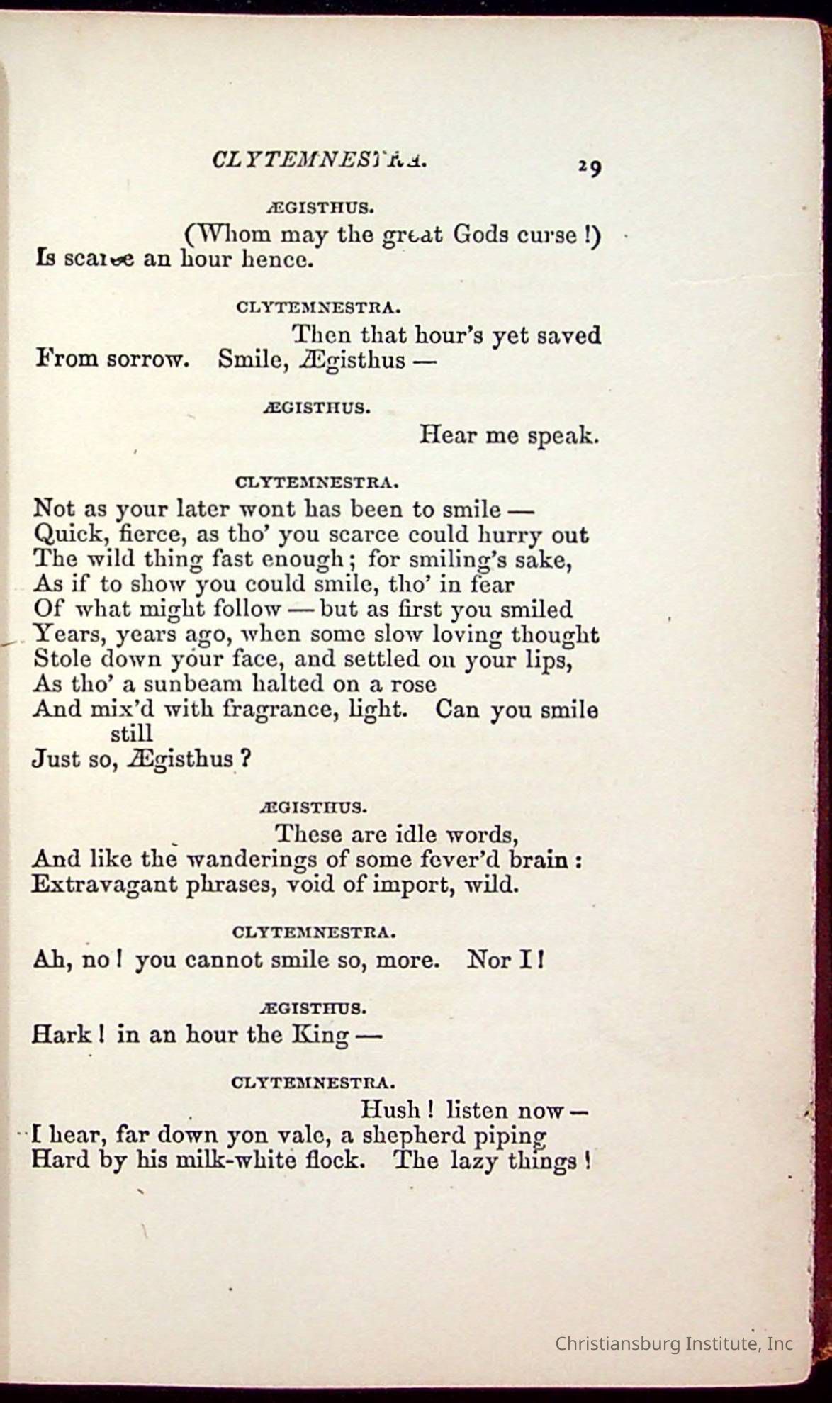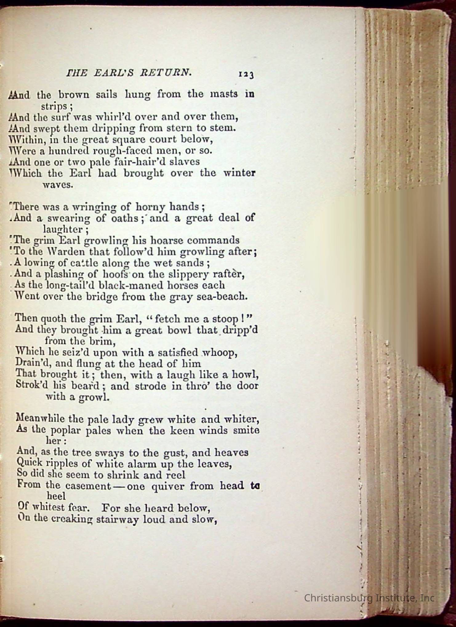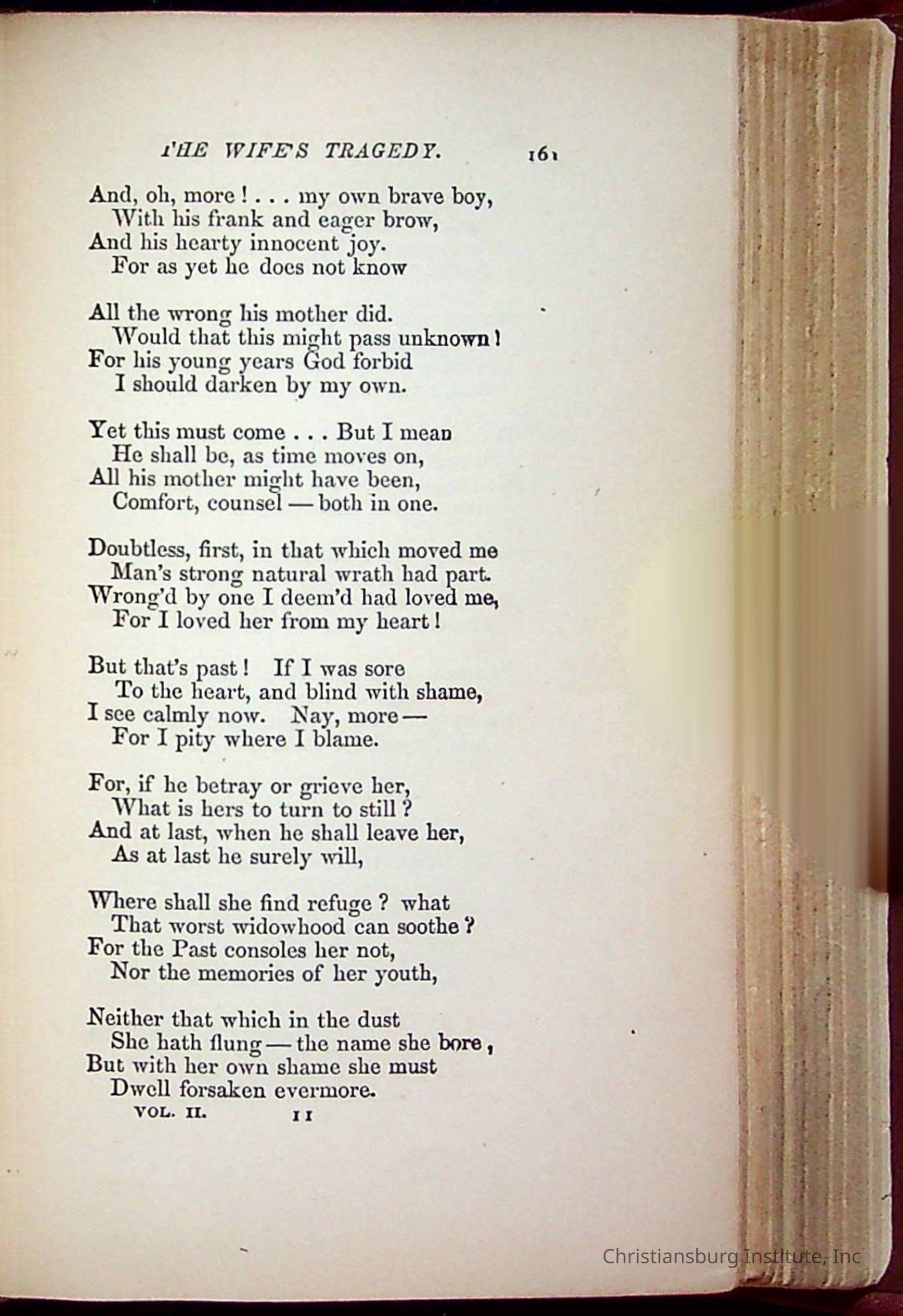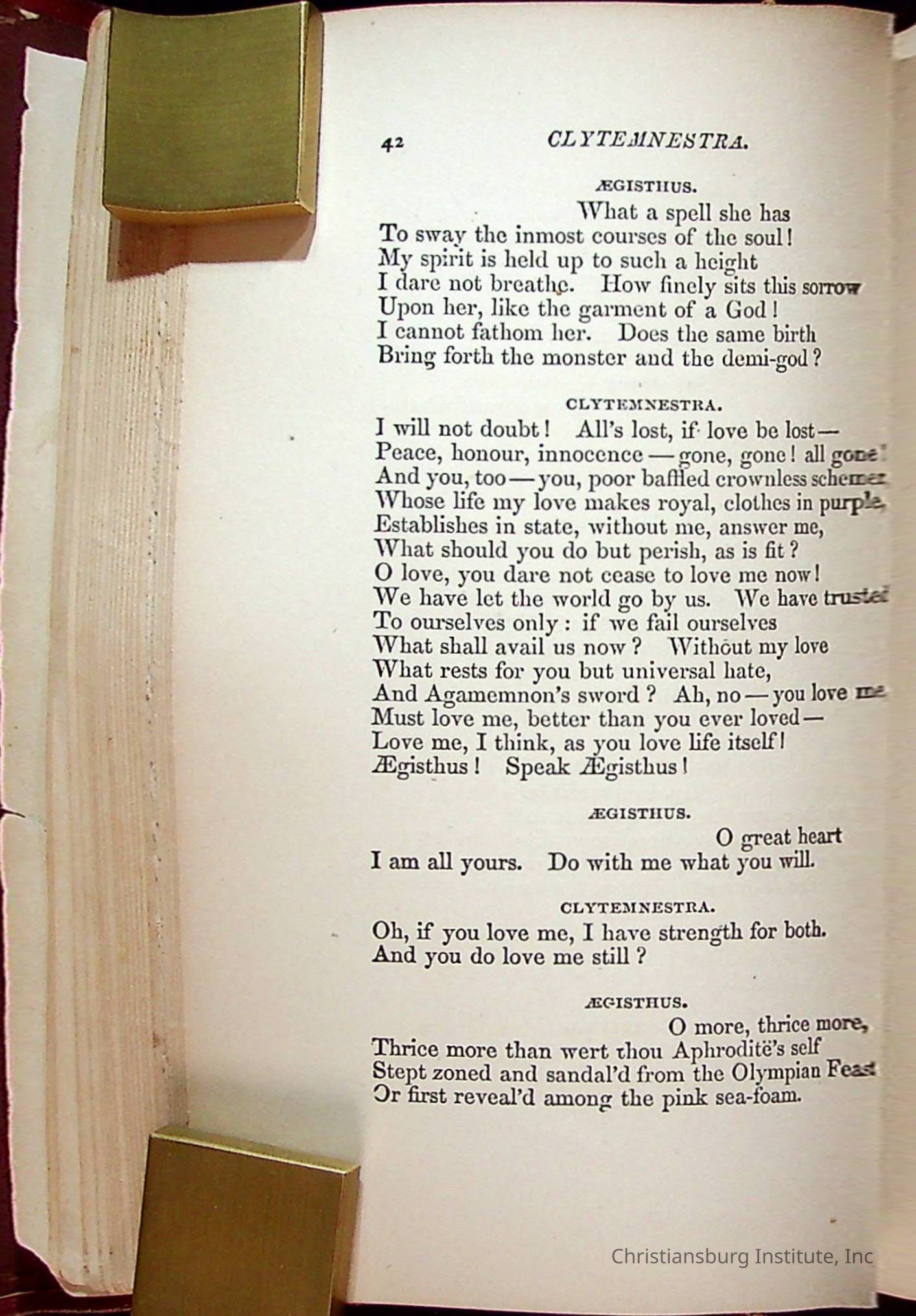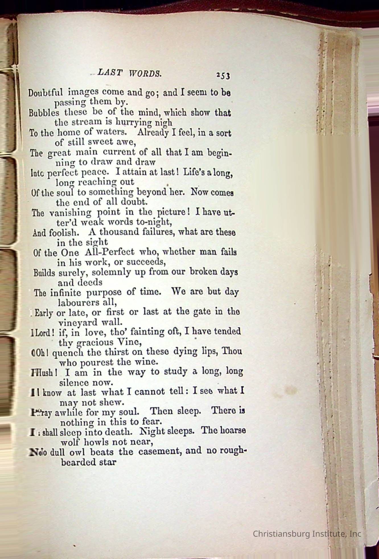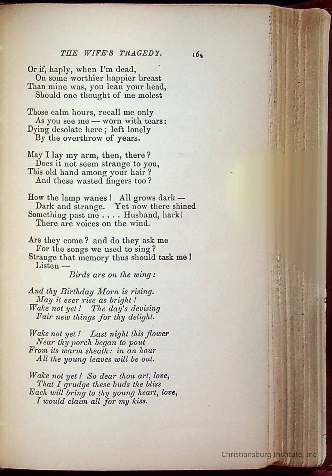 "Poems" written by Owen Meredith and published by James R. Osgood and Company in the year 1875. This book was in the Christiansburg Institute library.